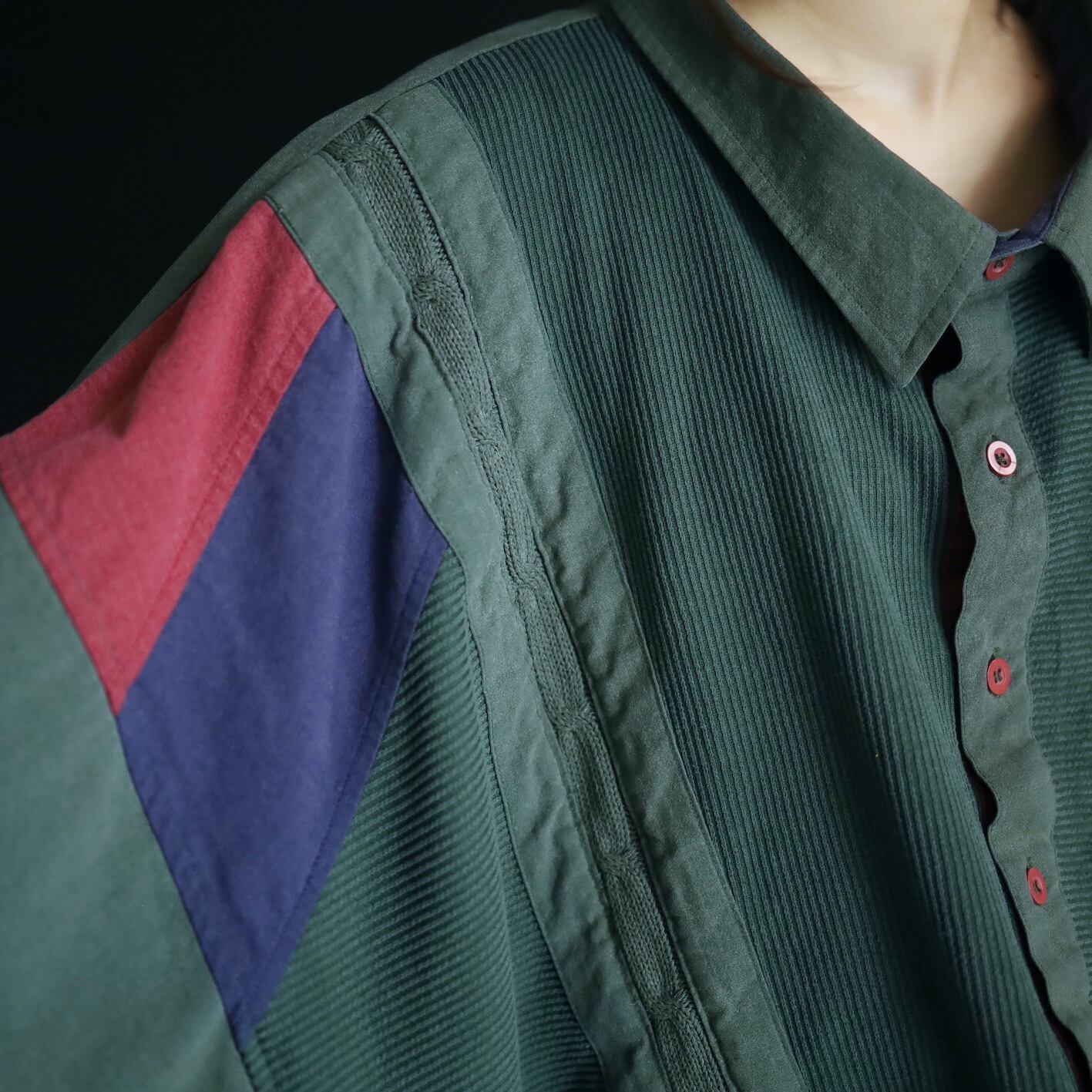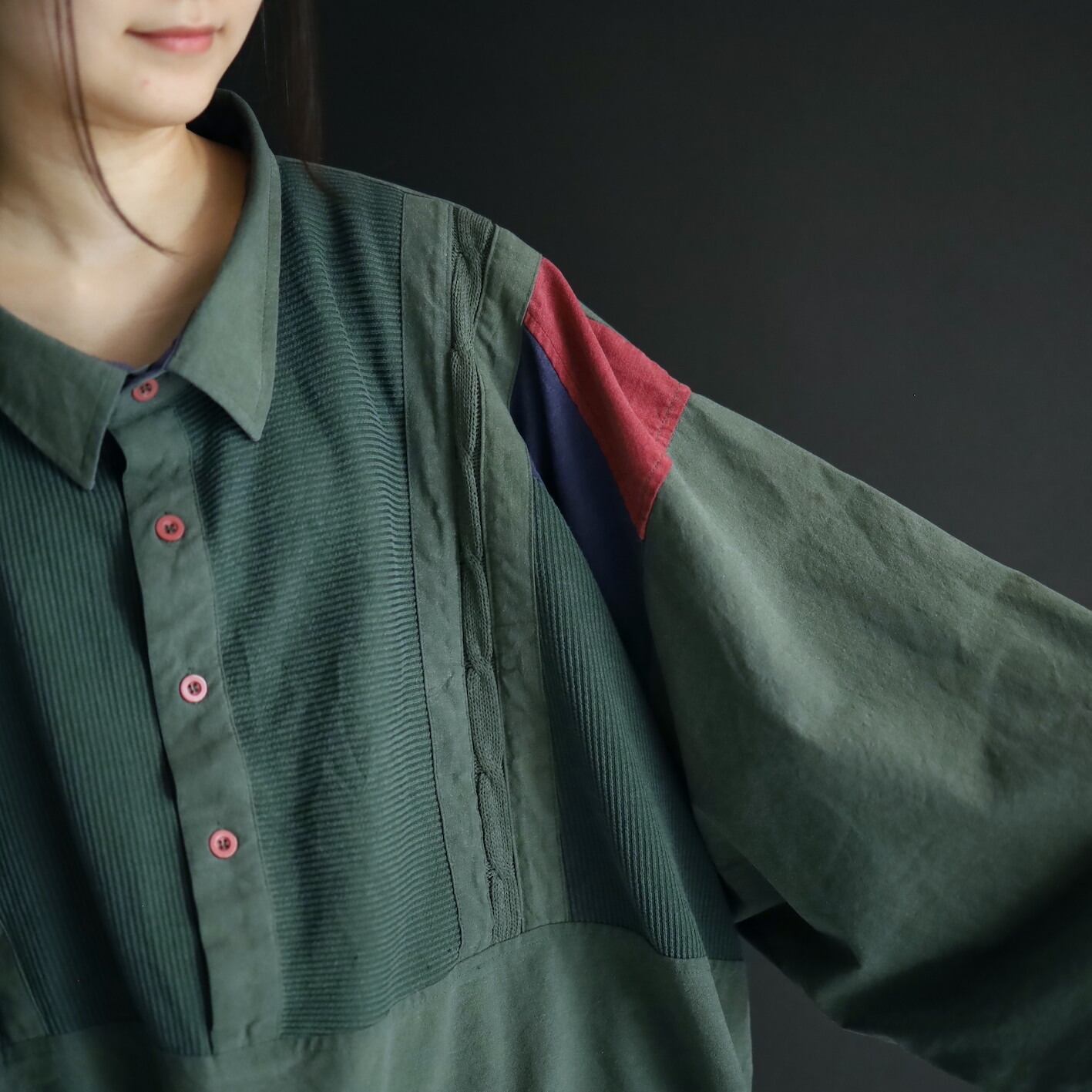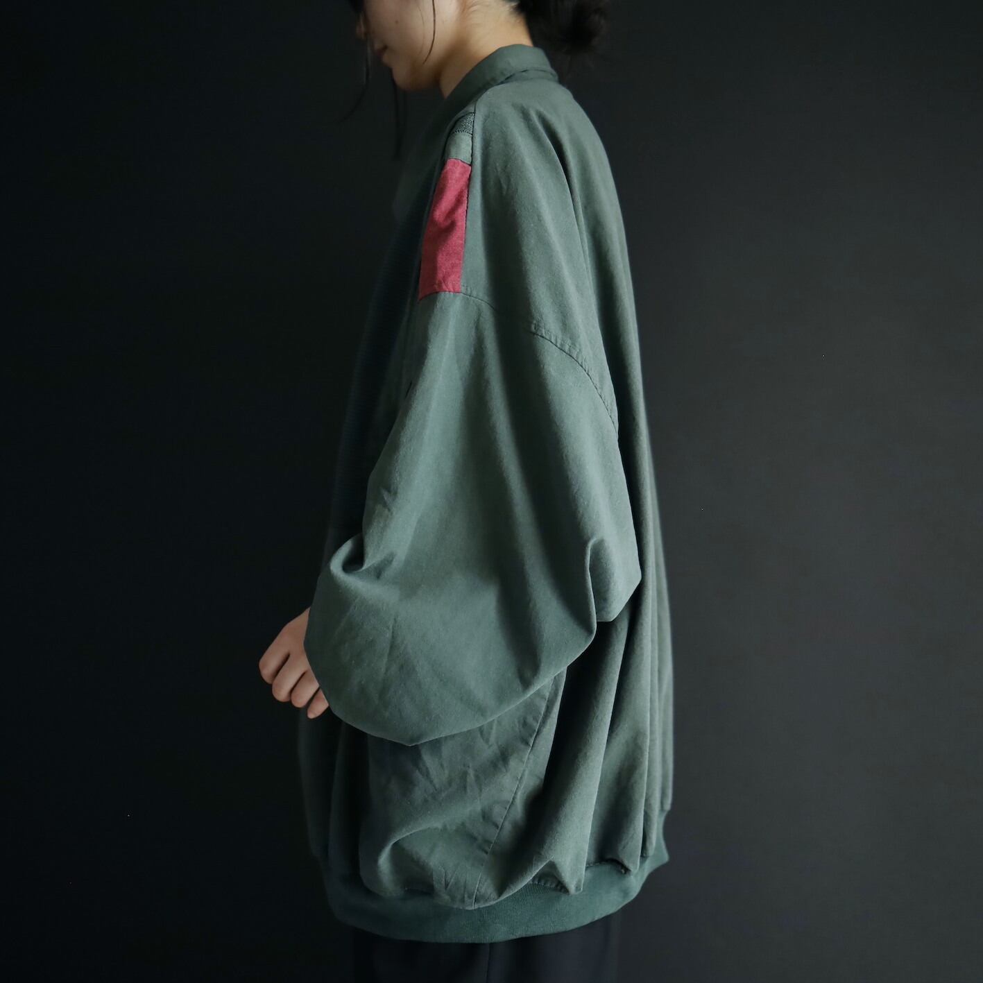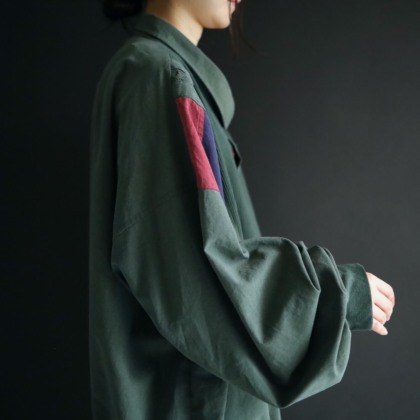 全体的にフェードしたようなグリーンカラーをベースに,肩周囲はワインレッド,ネイビーの切替.