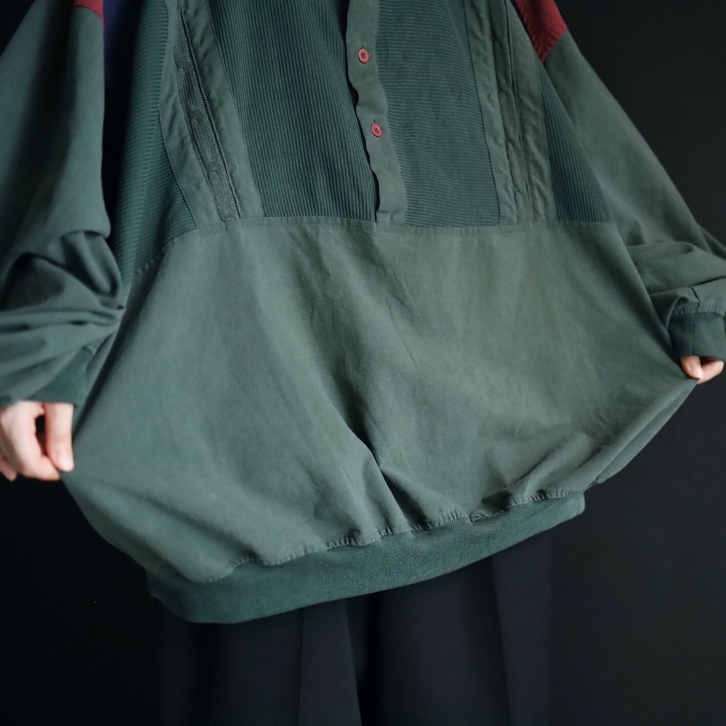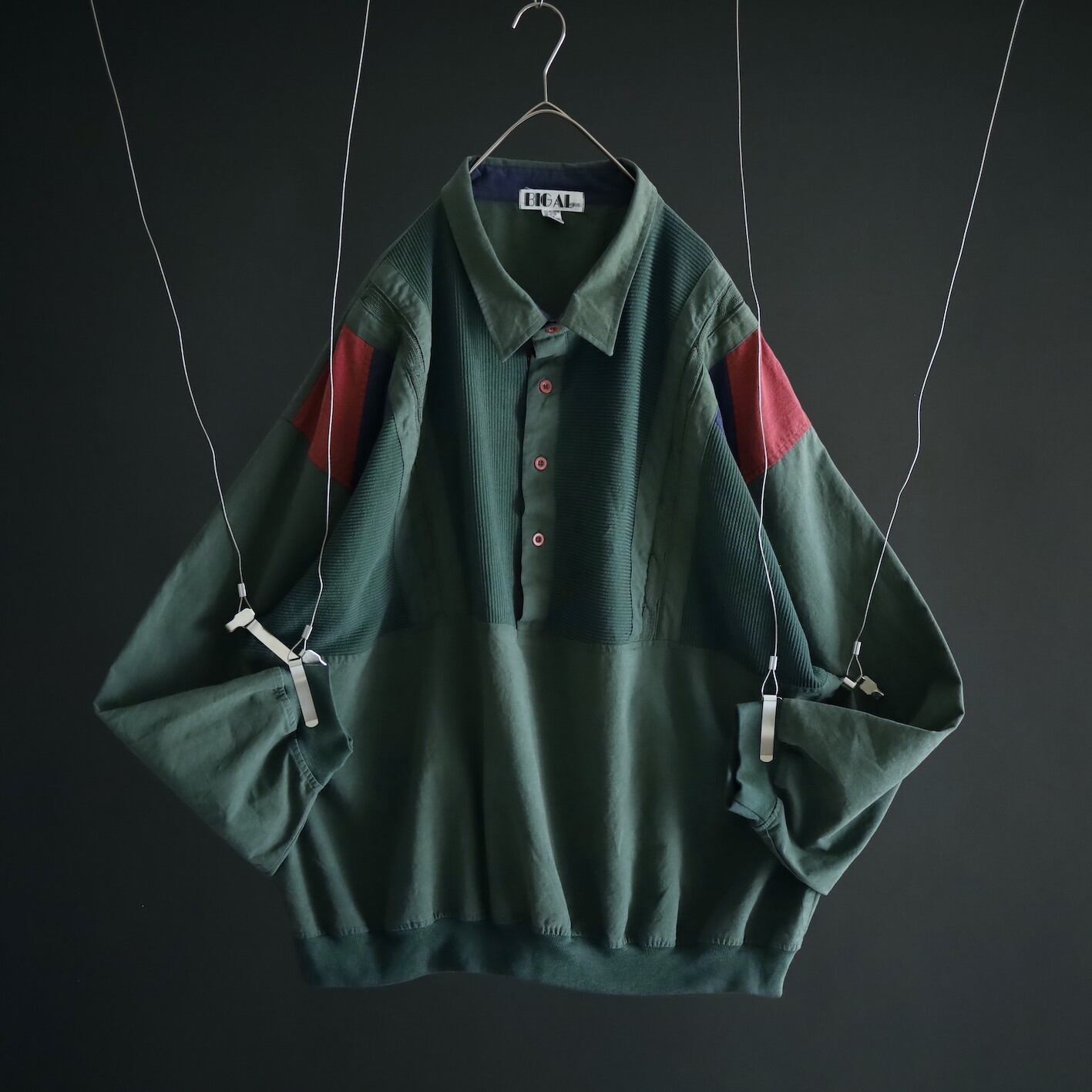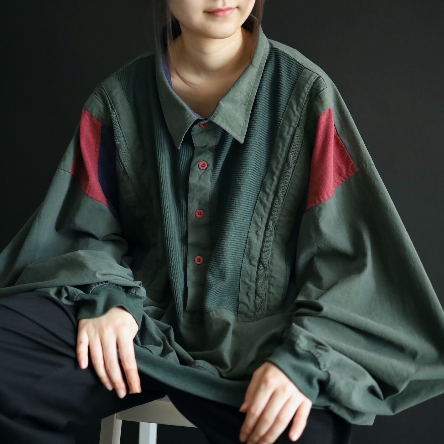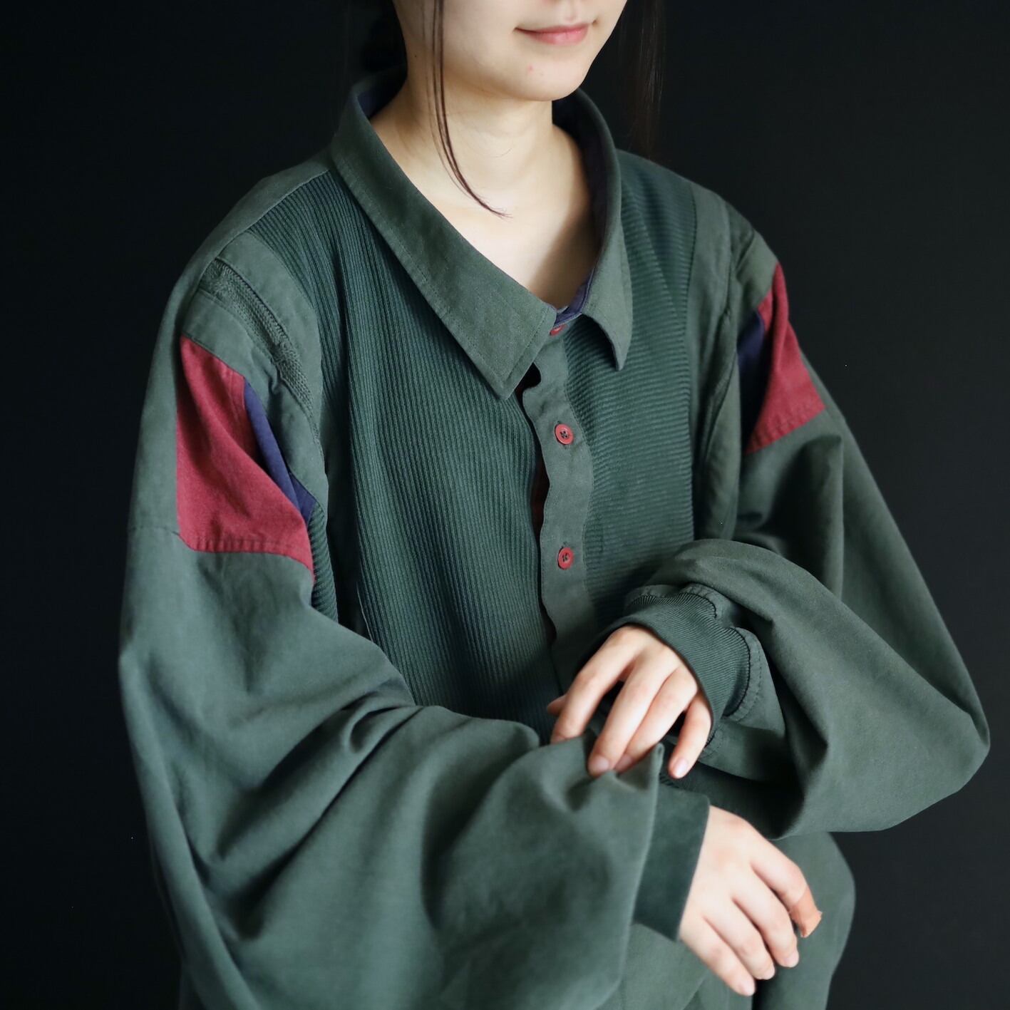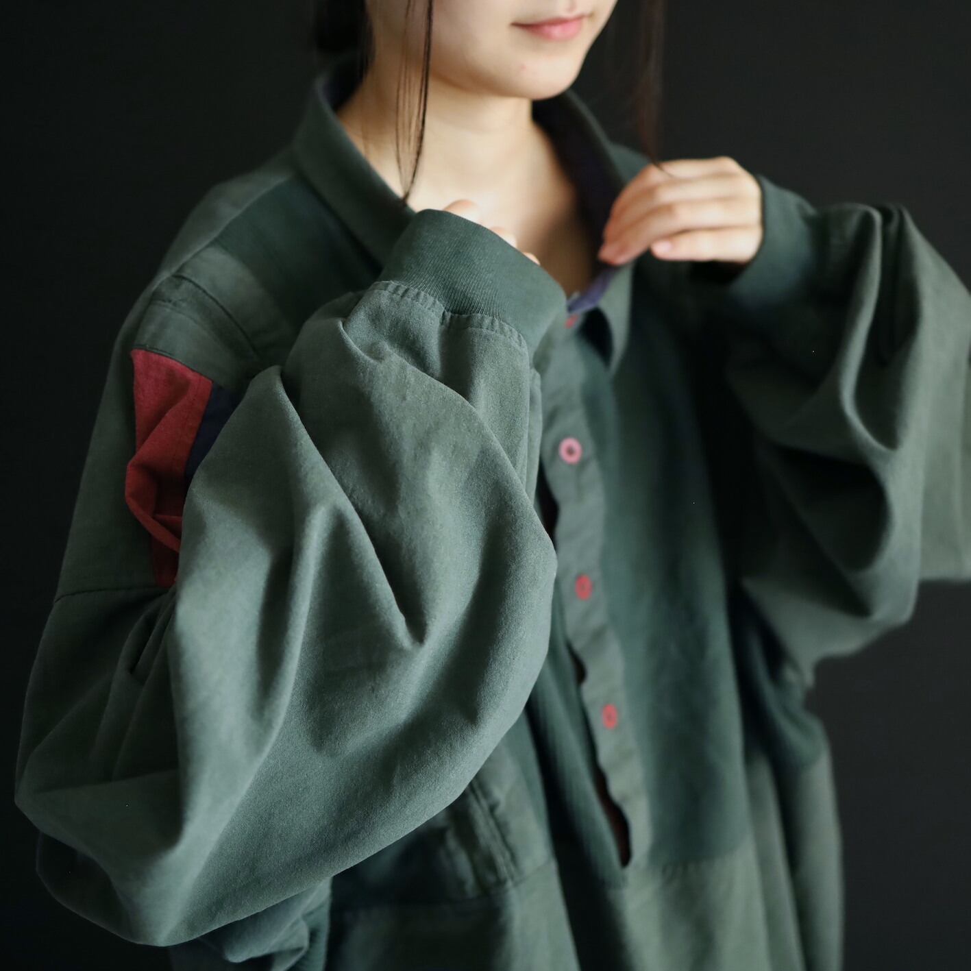 全体的にフェードしたようなグリーンカラーをベースに,肩周囲はワインレッド,ネイビーの切替.