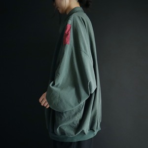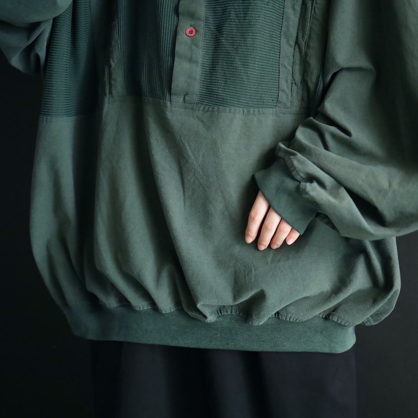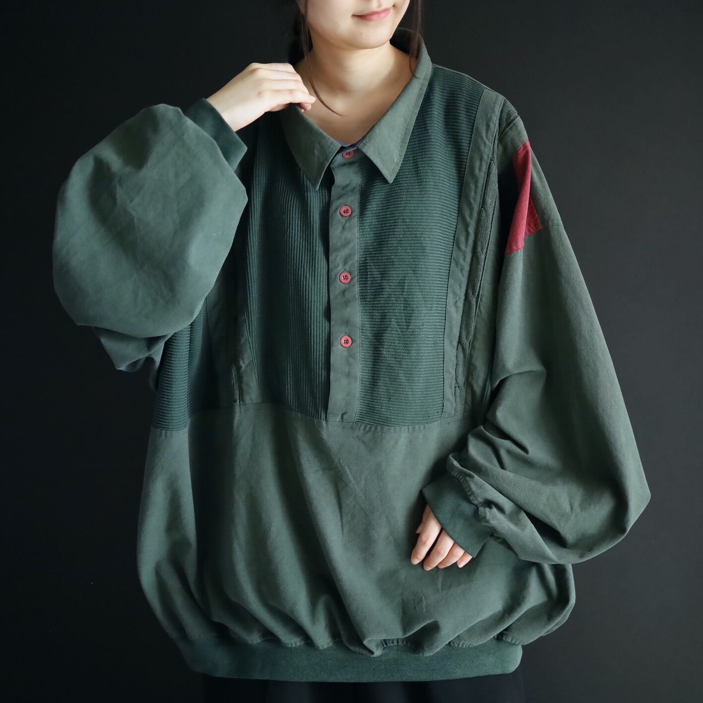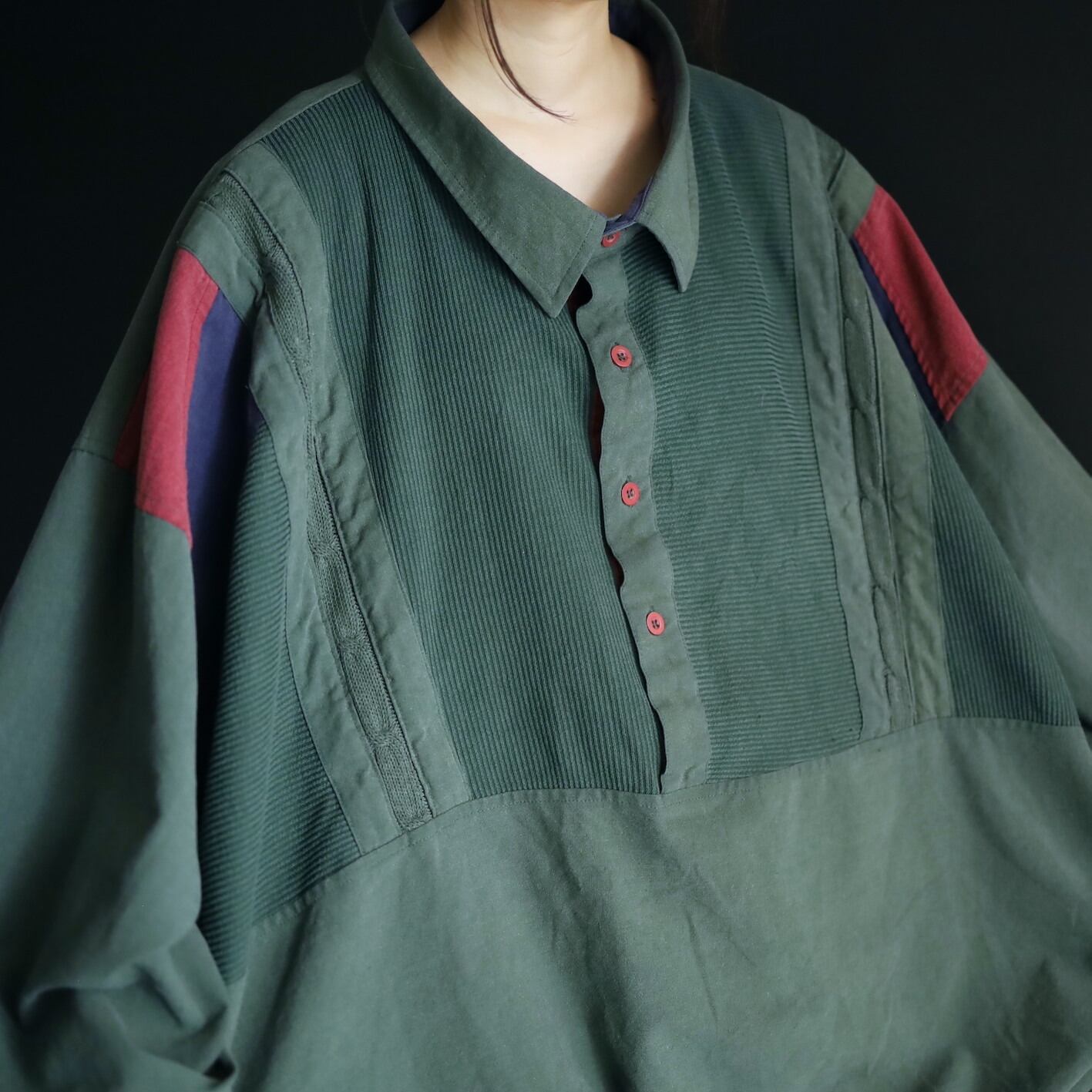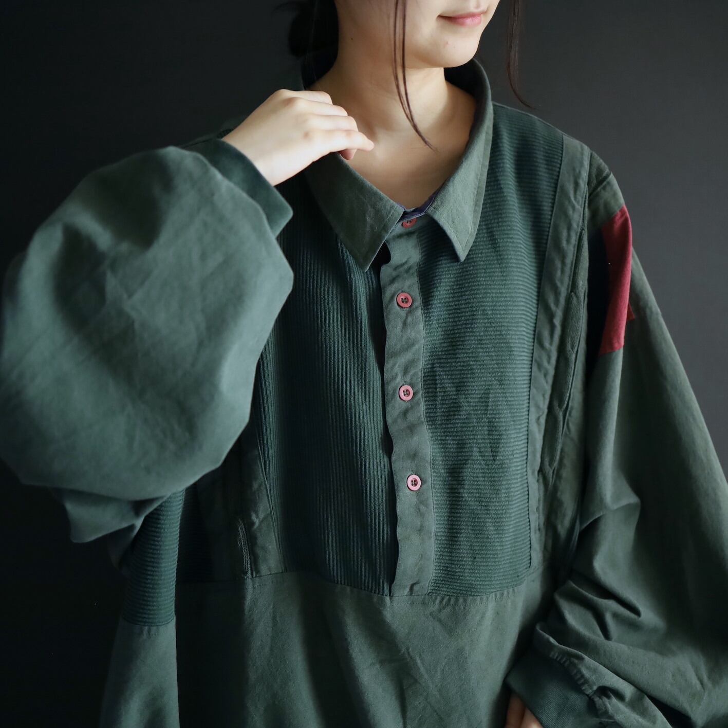 全体的にフェードしたようなグリーンカラーをベースに,肩周囲はワインレッド,ネイビーの切替.