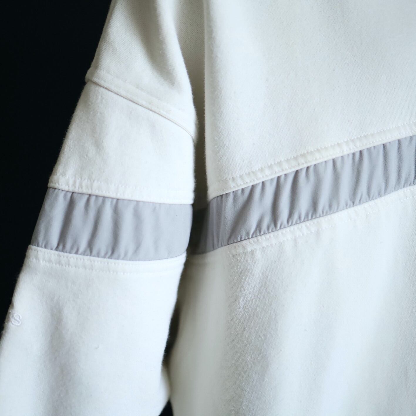 グレー部はスウェット生地ではなく,ややハリツヤのあるサラッとしたポリ生地で,adidasのスウェットでは少々珍しい異素材切替.