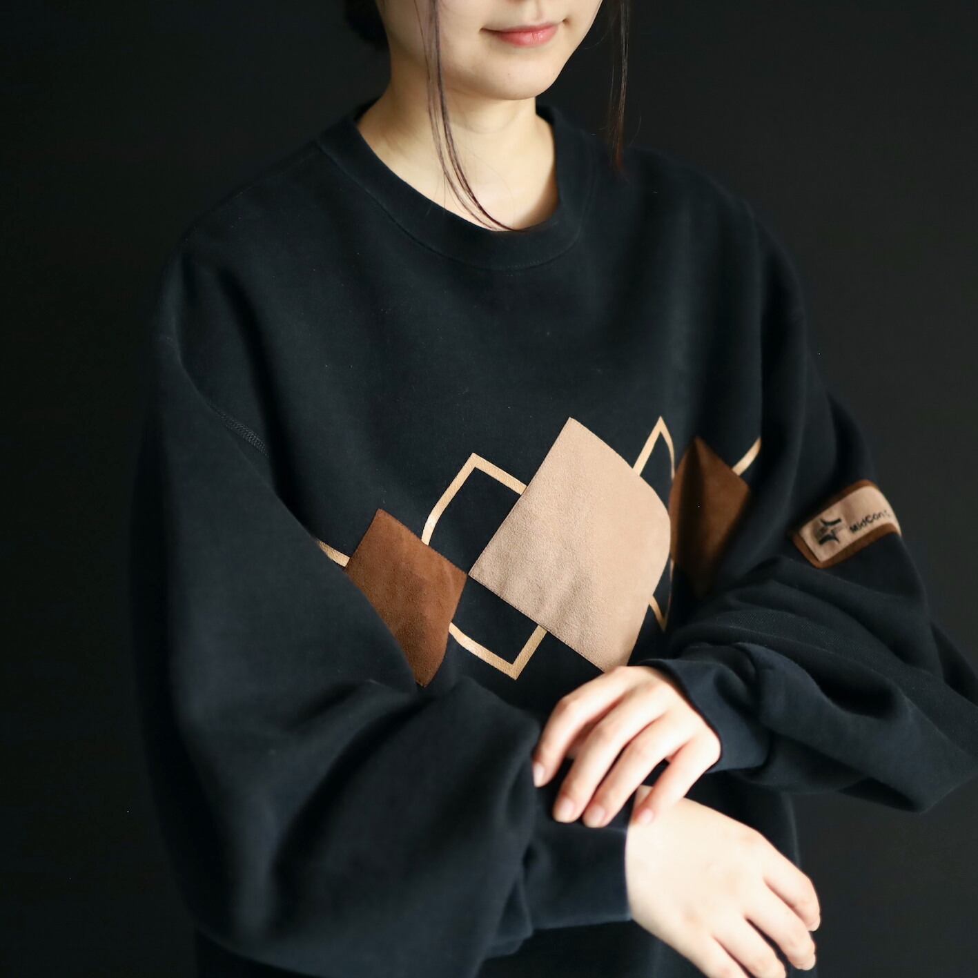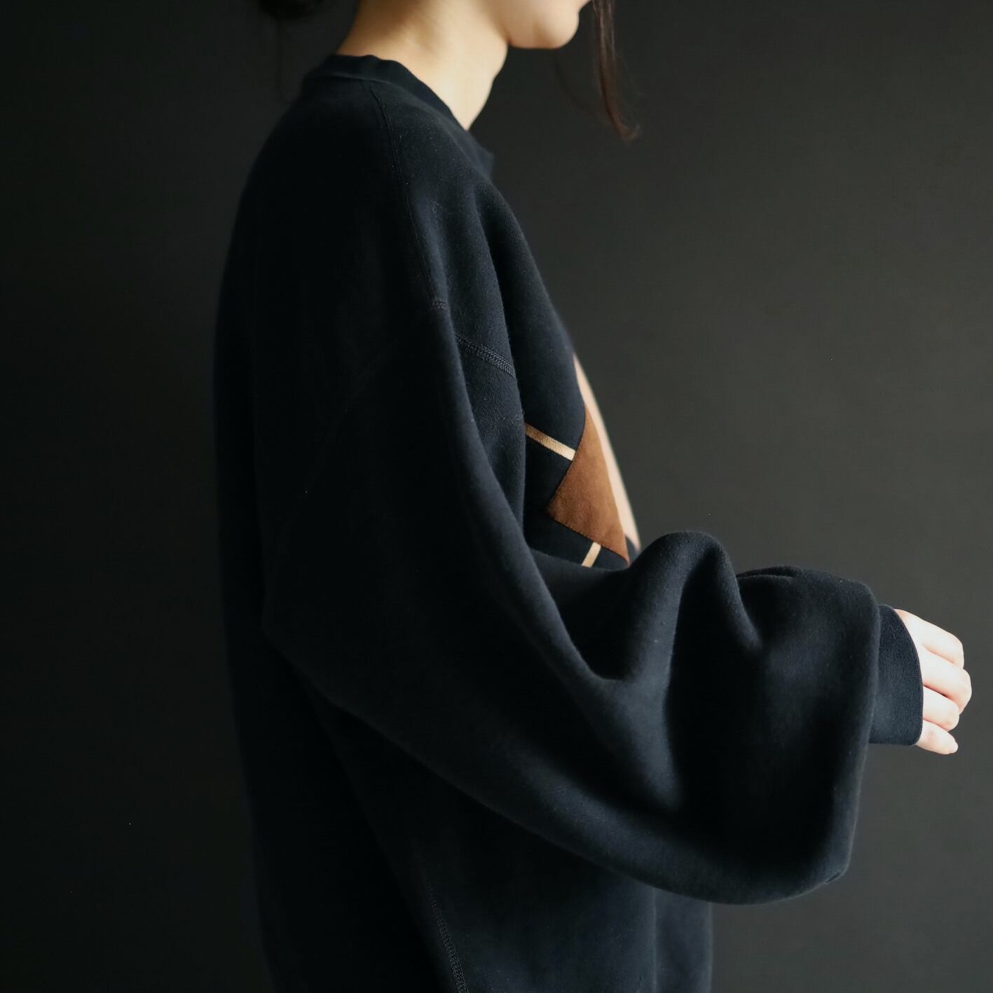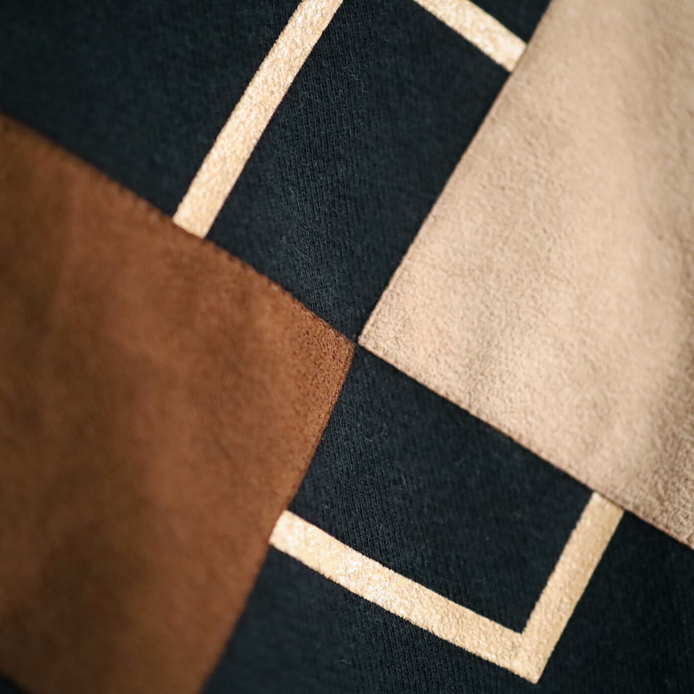 フロントにブラウンとベージュの2色遣いの,フェイクスウェードパッチデザイン.