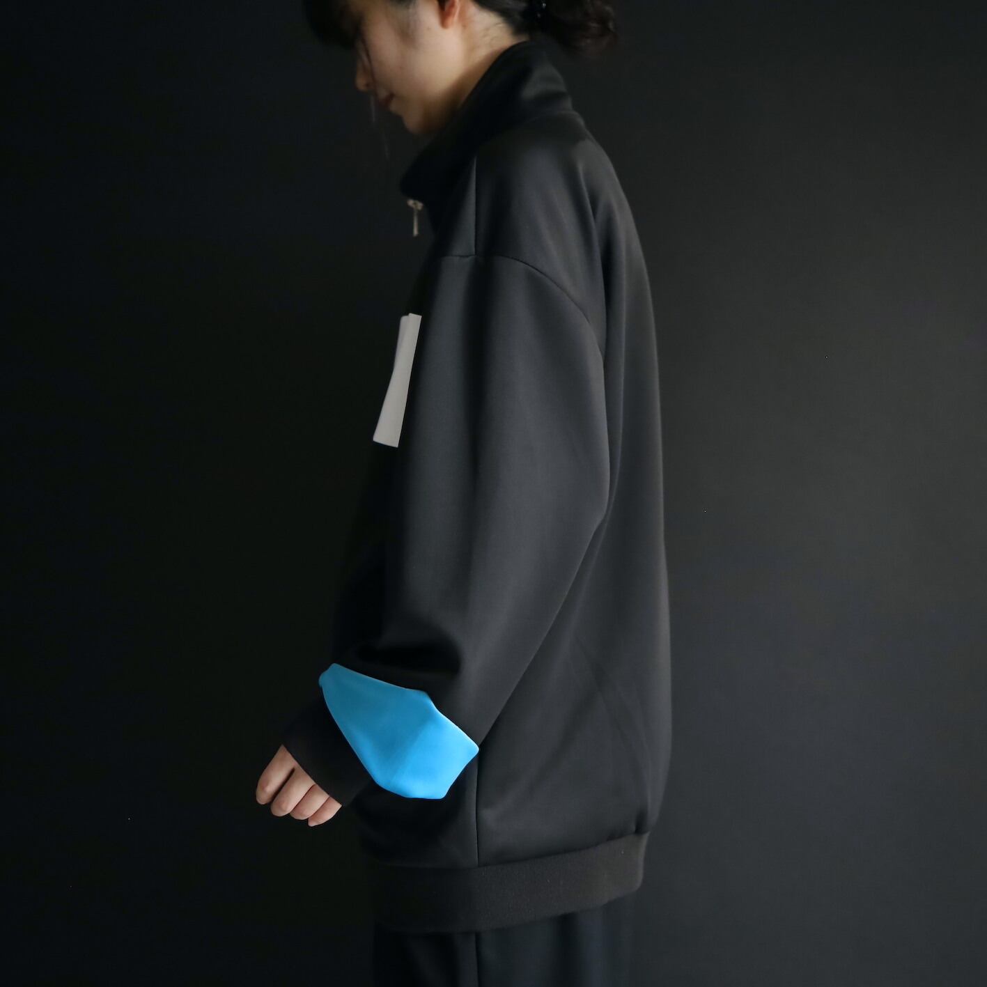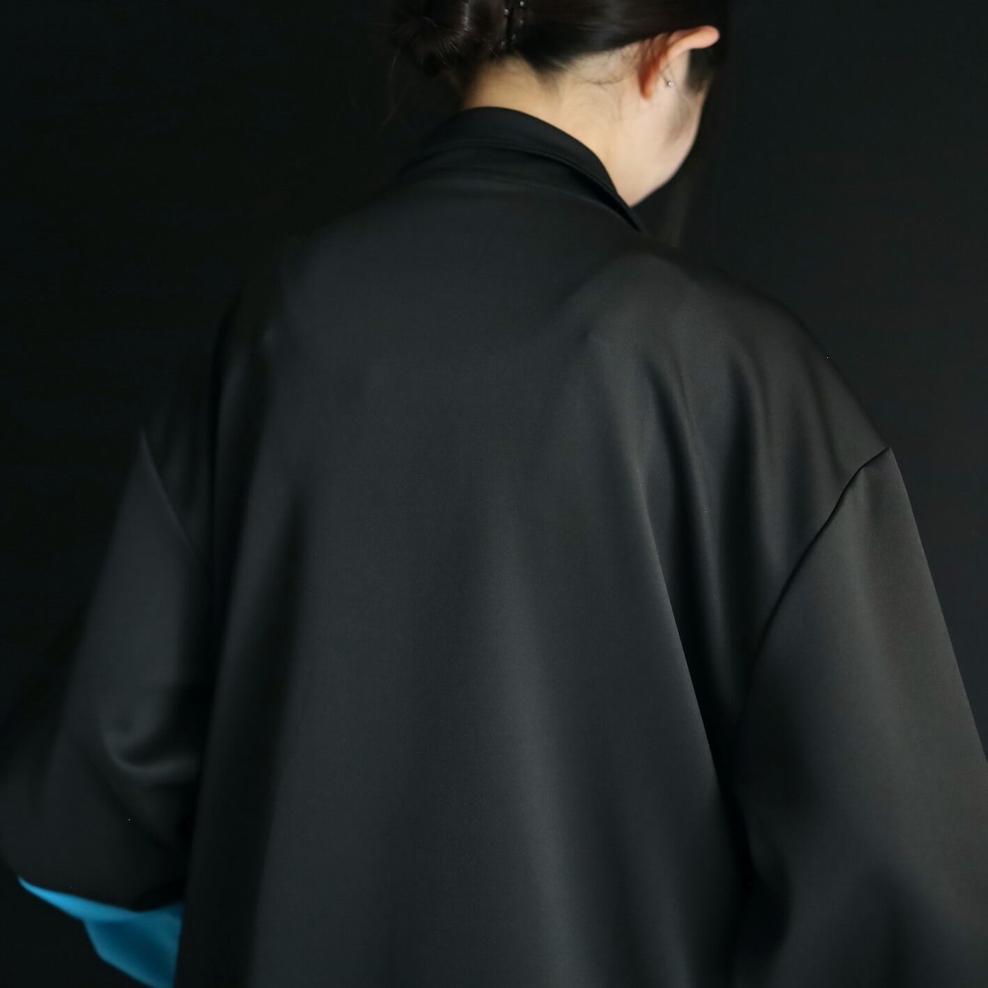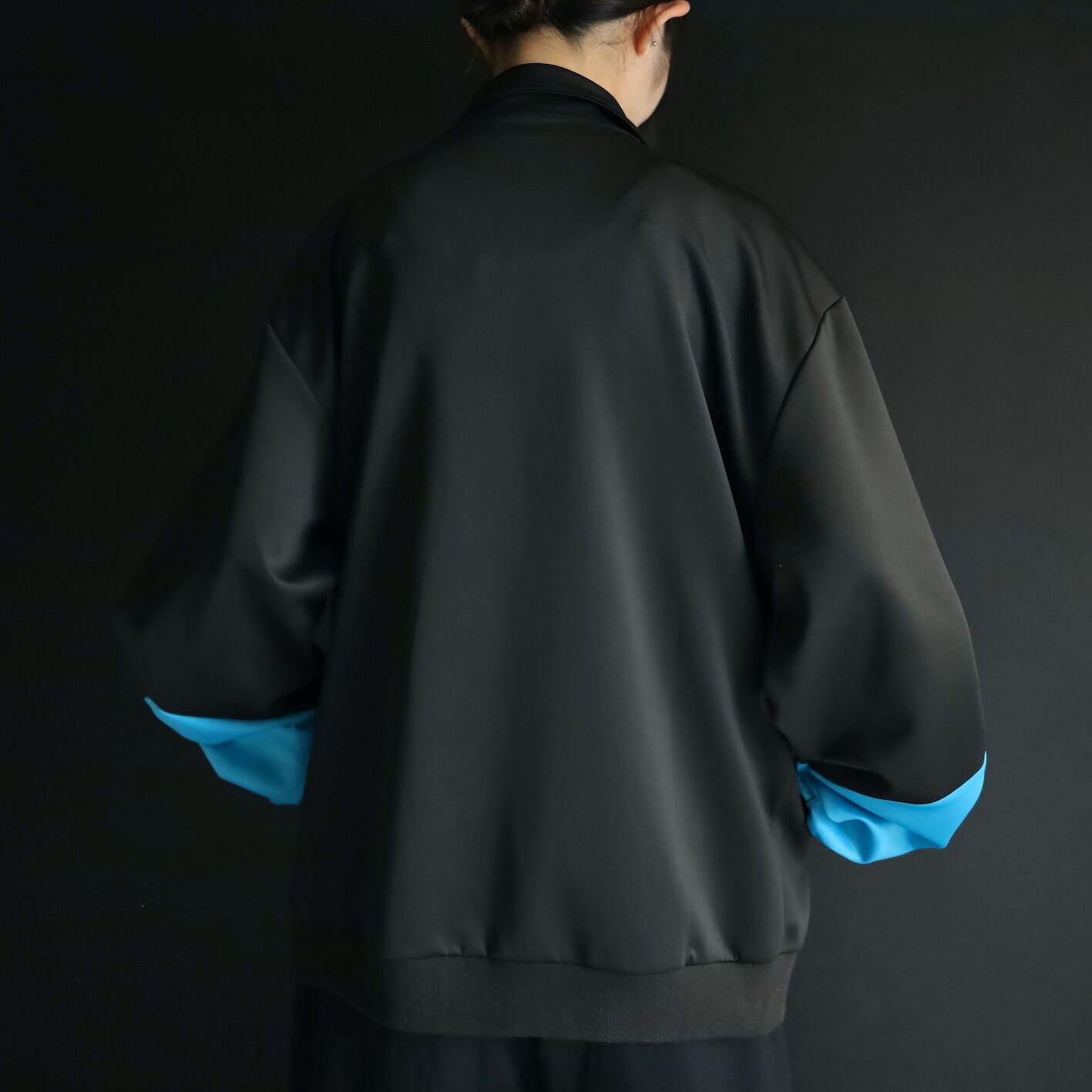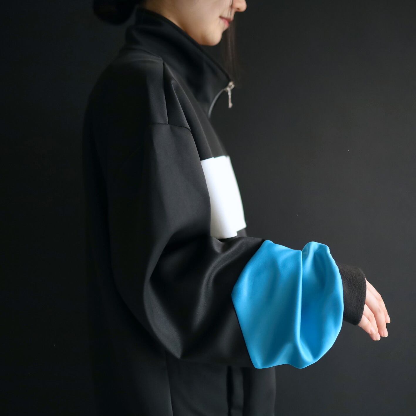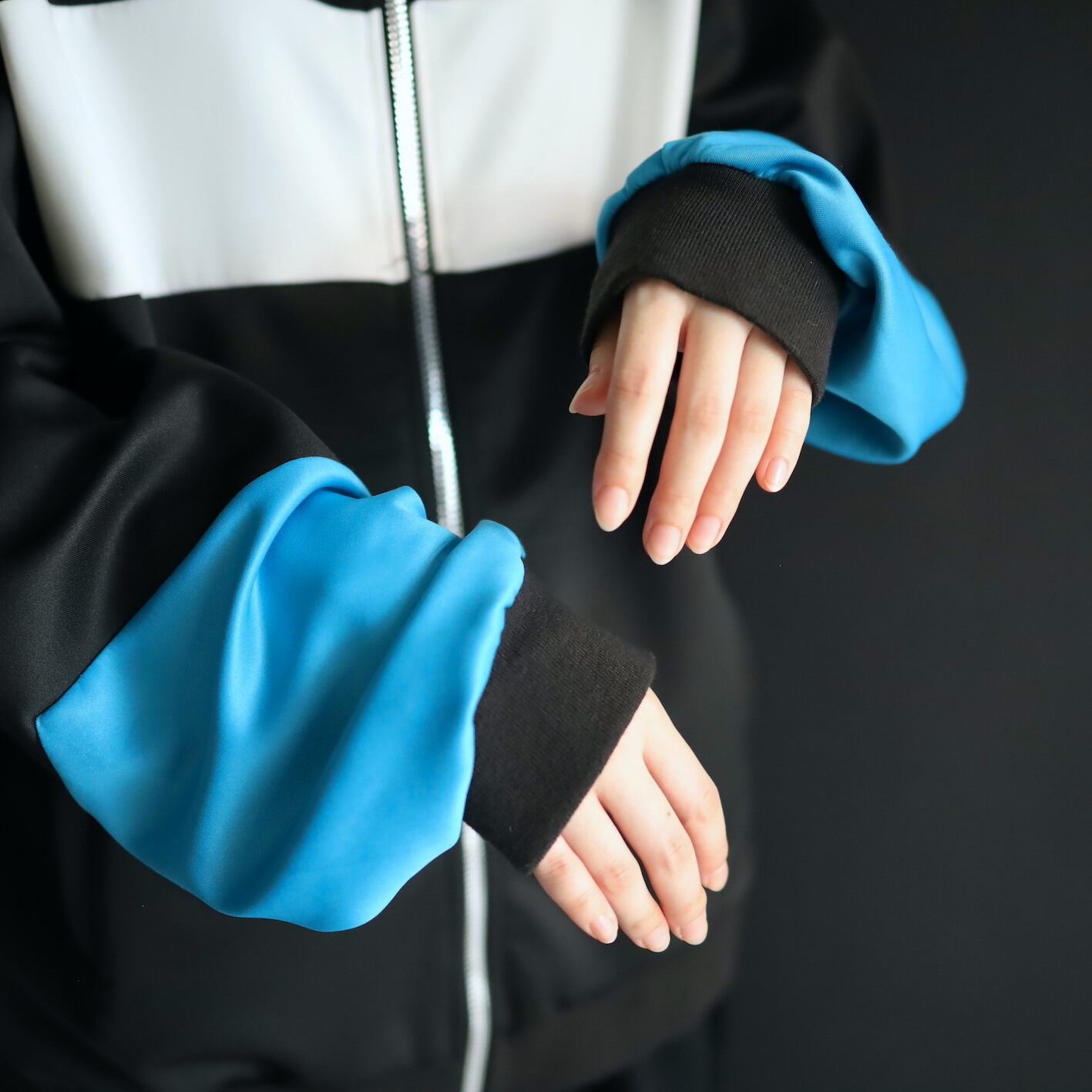 さらに袖先はスカイブルーにスイッチする,モノトーンと差し色のバランスが取れた一枚.