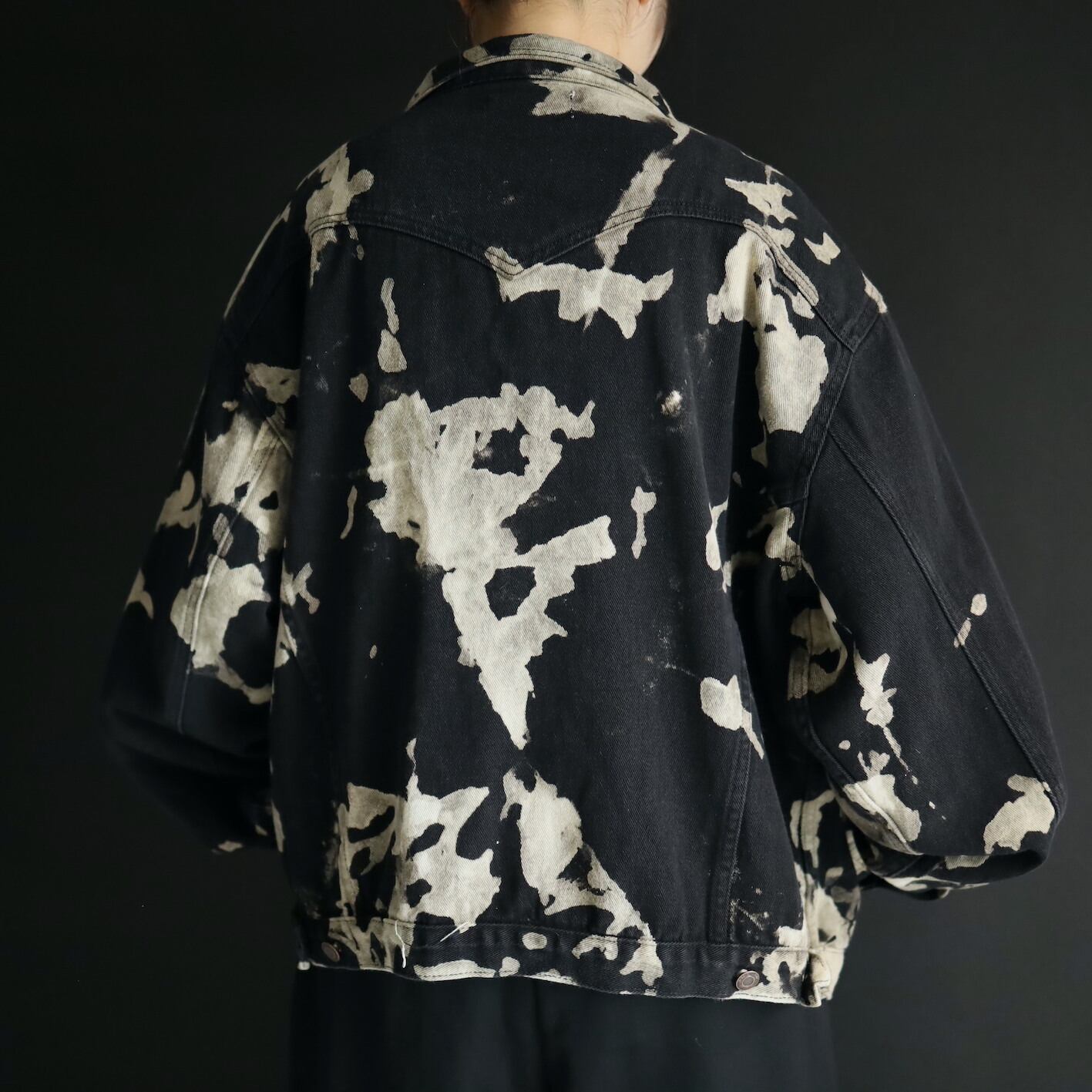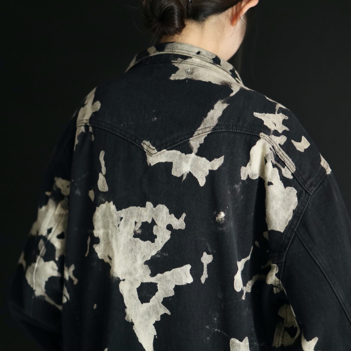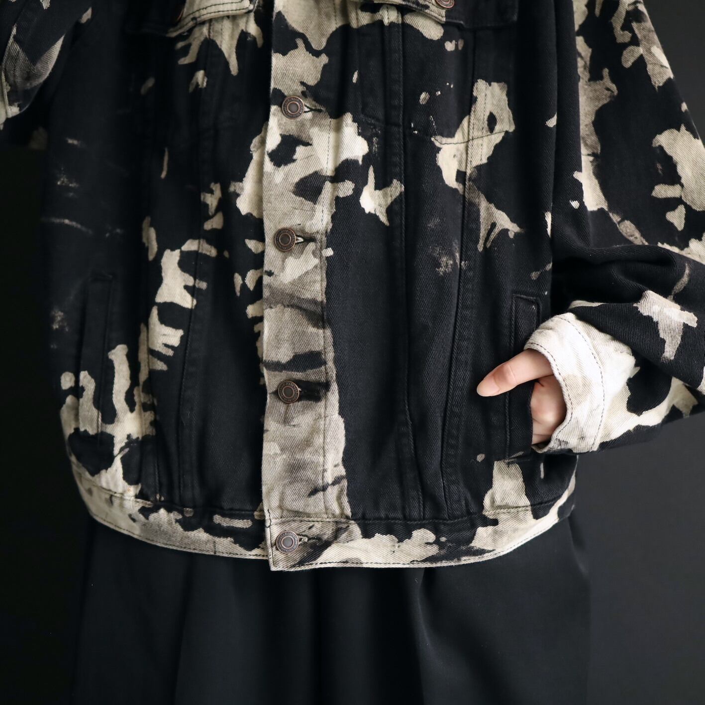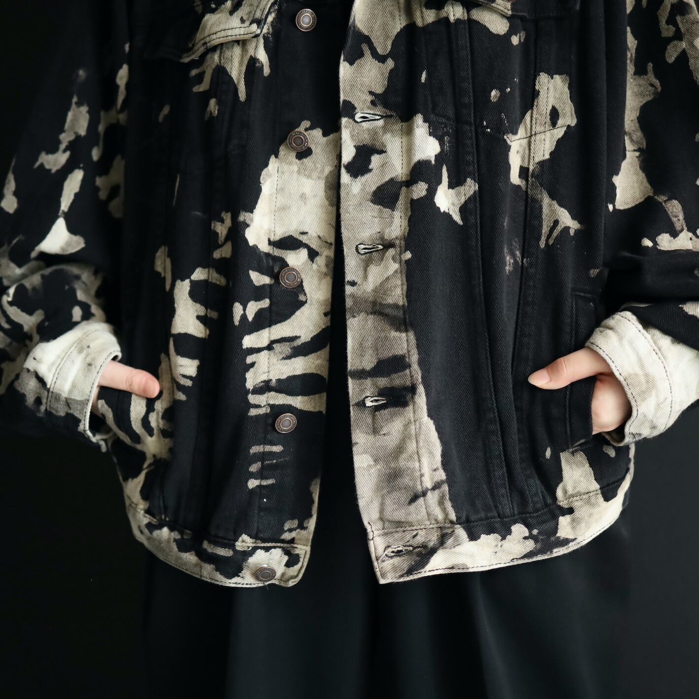 ベースのブラックデニムを大胆に,ランダムにブリーチしたデザイン.