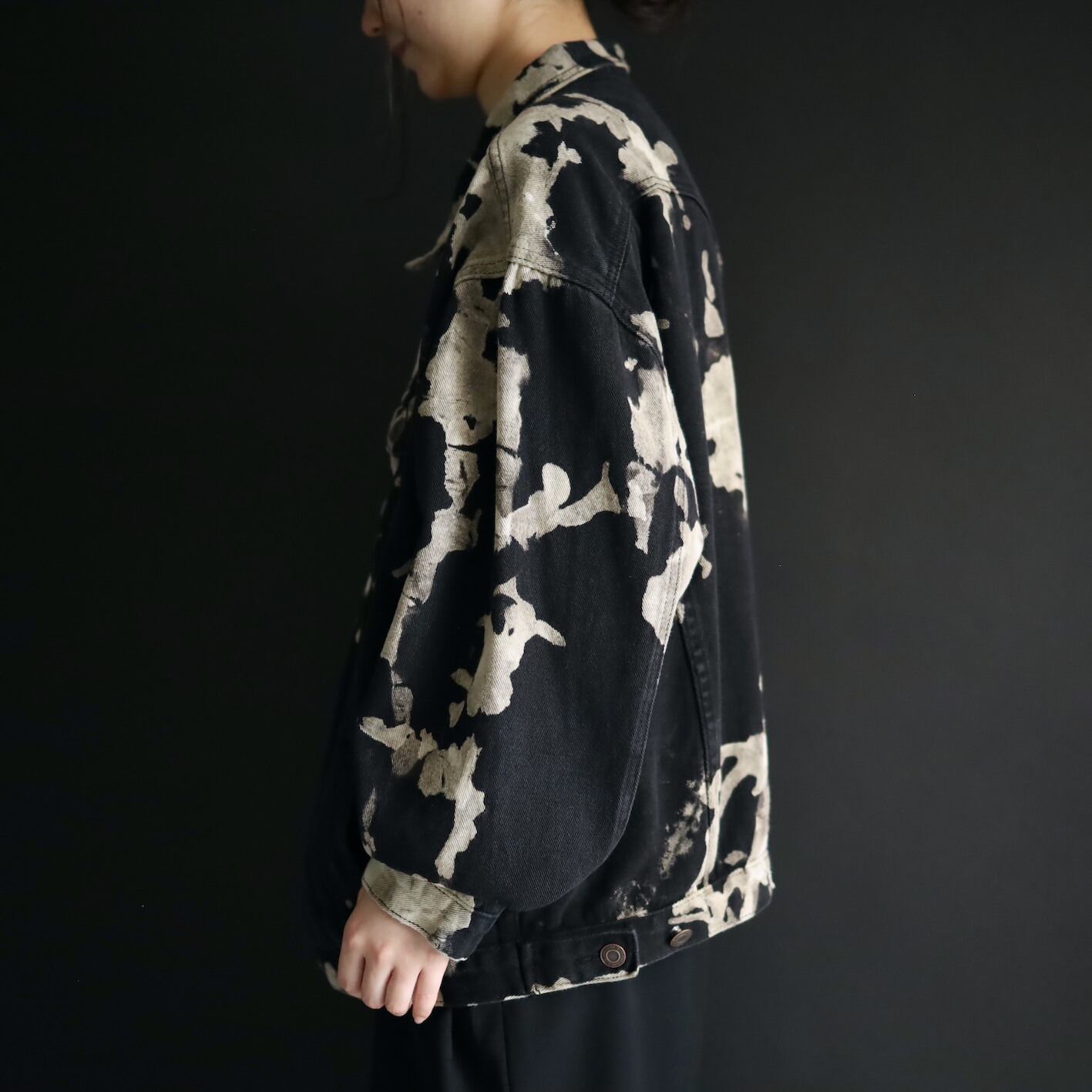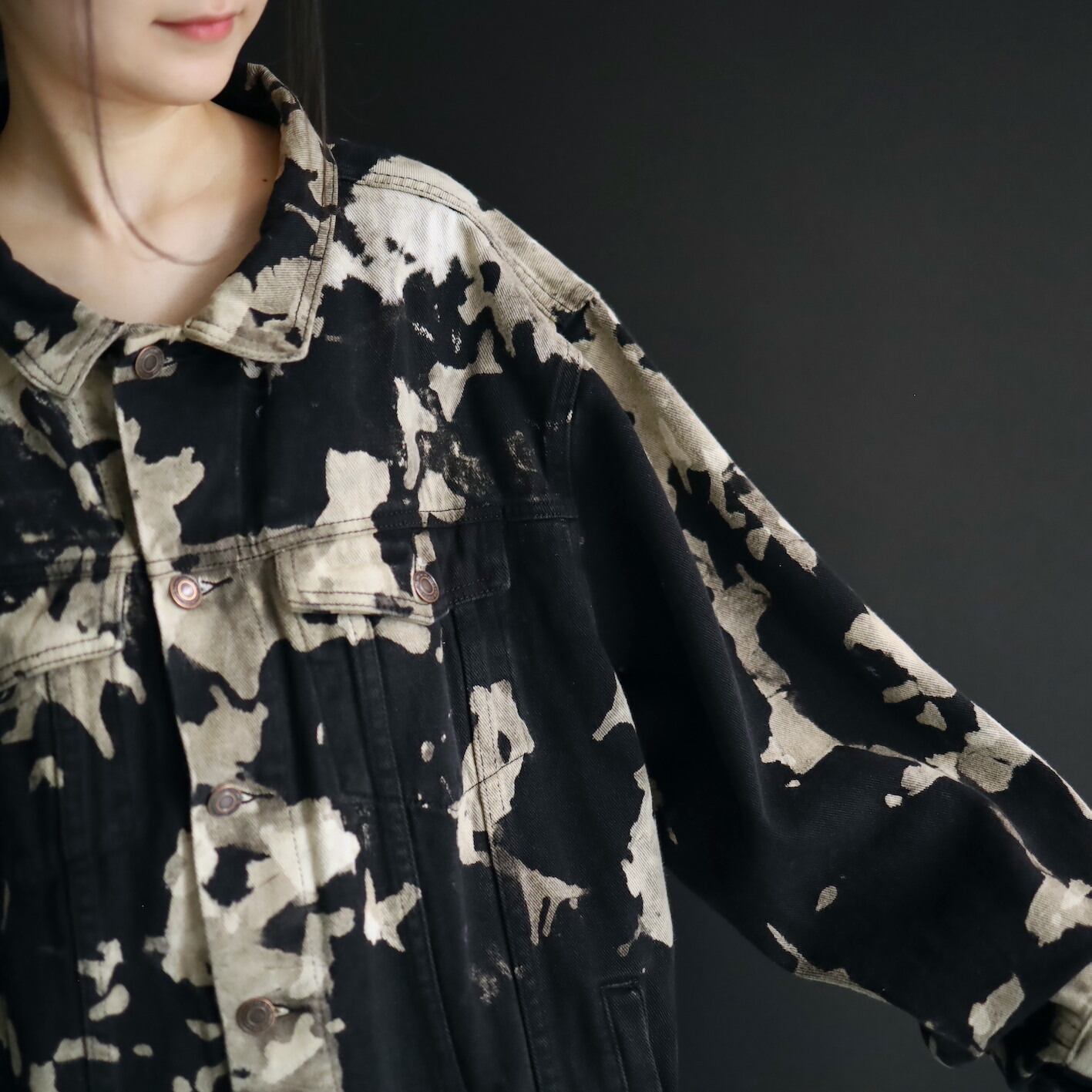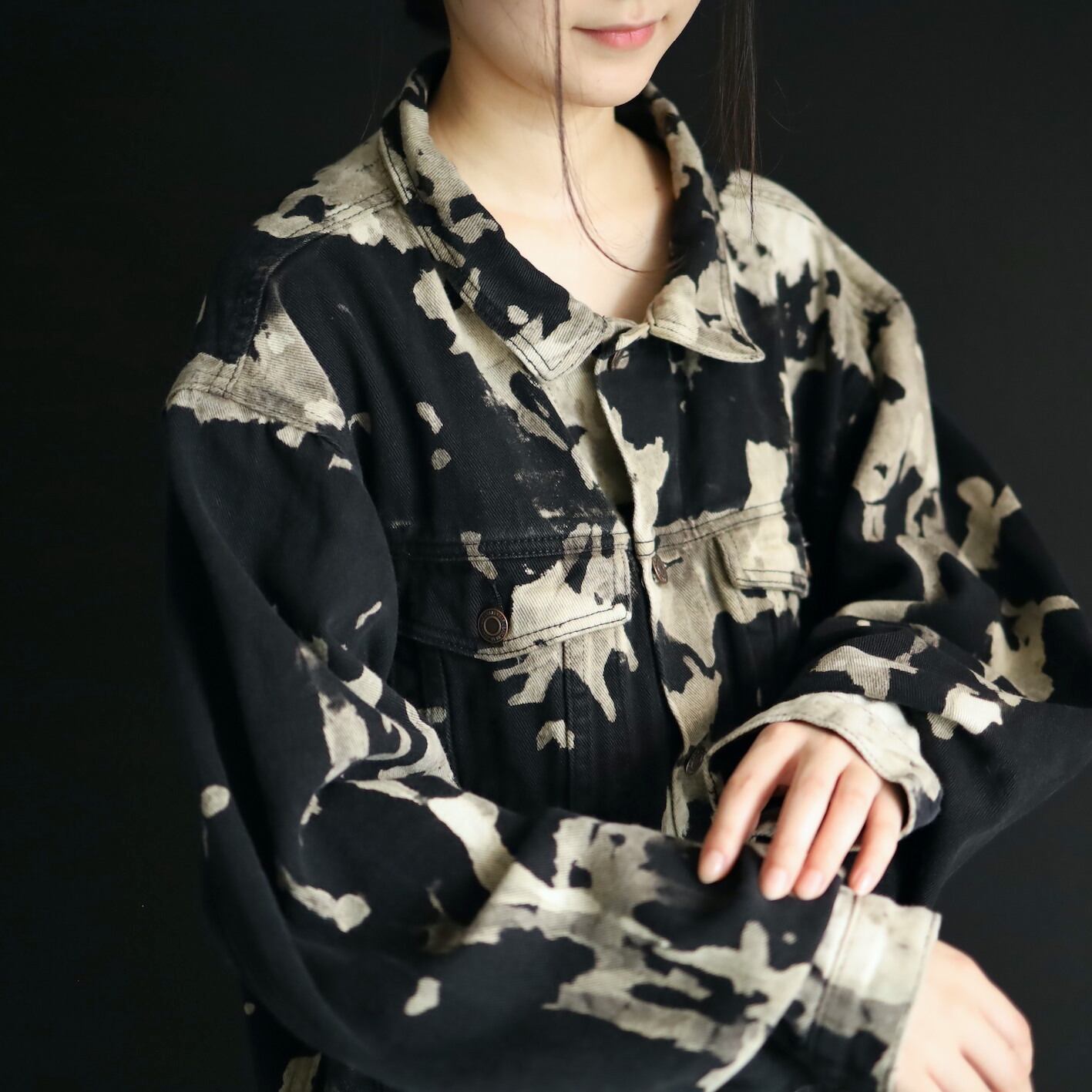 ベースのブラックデニムを大胆に,ランダムにブリーチしたデザイン.