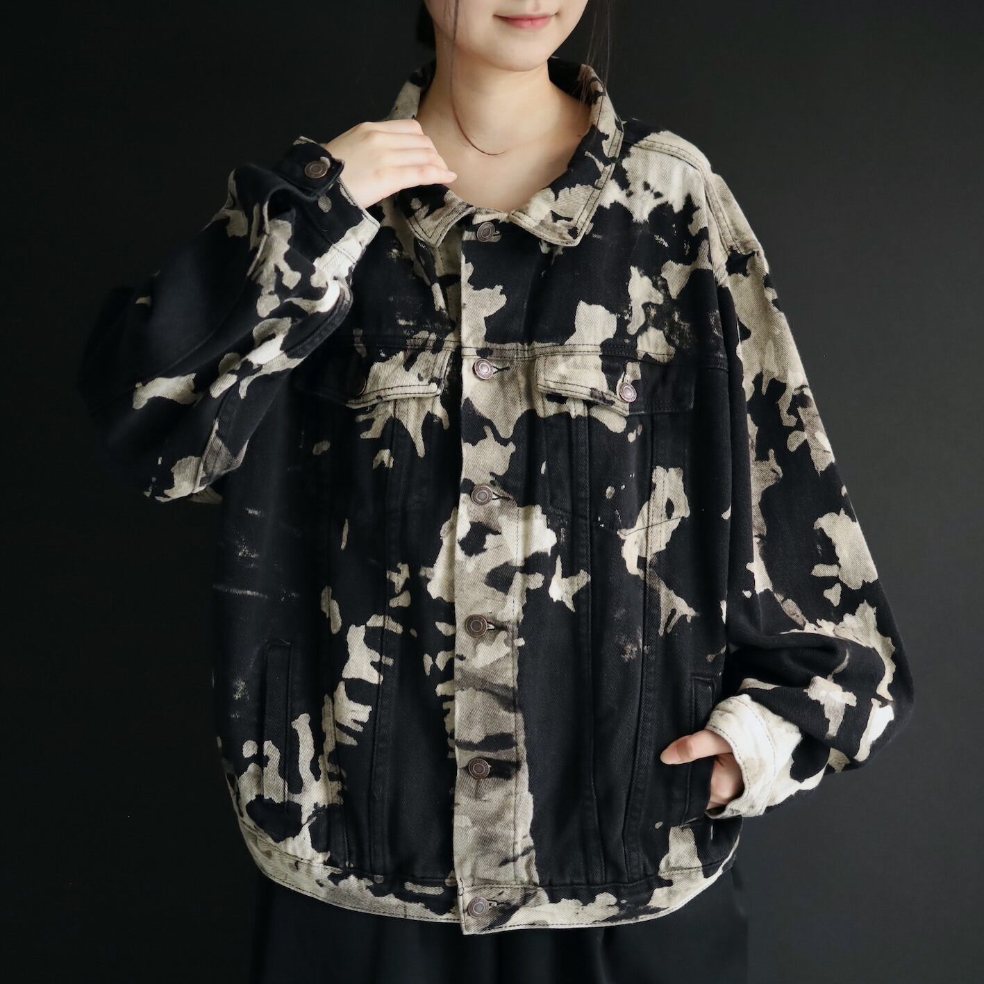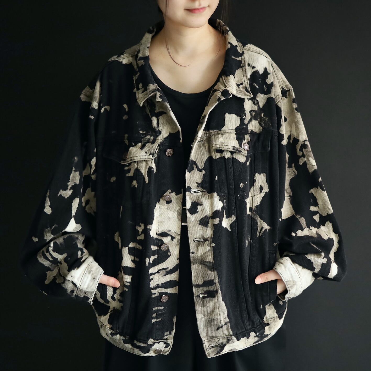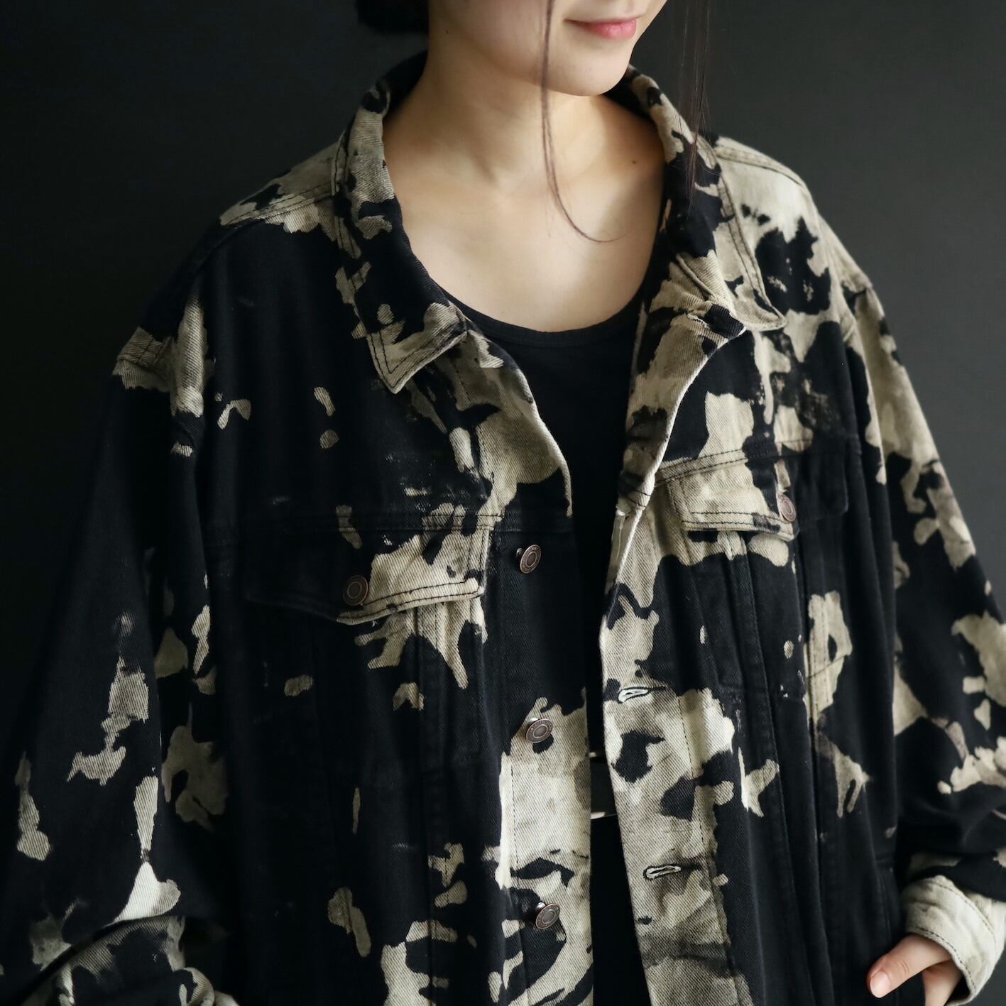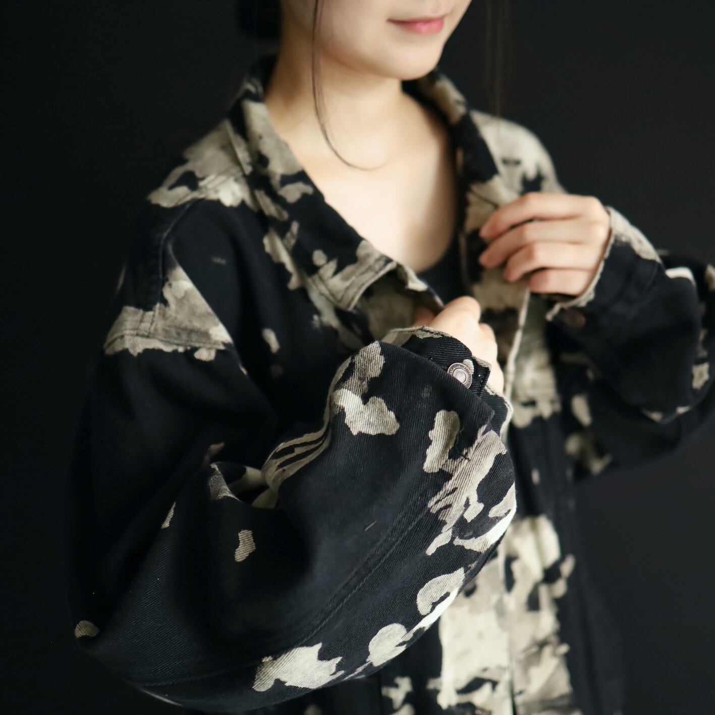 ベースのブラックデニムを大胆に,ランダムにブリーチしたデザイン.