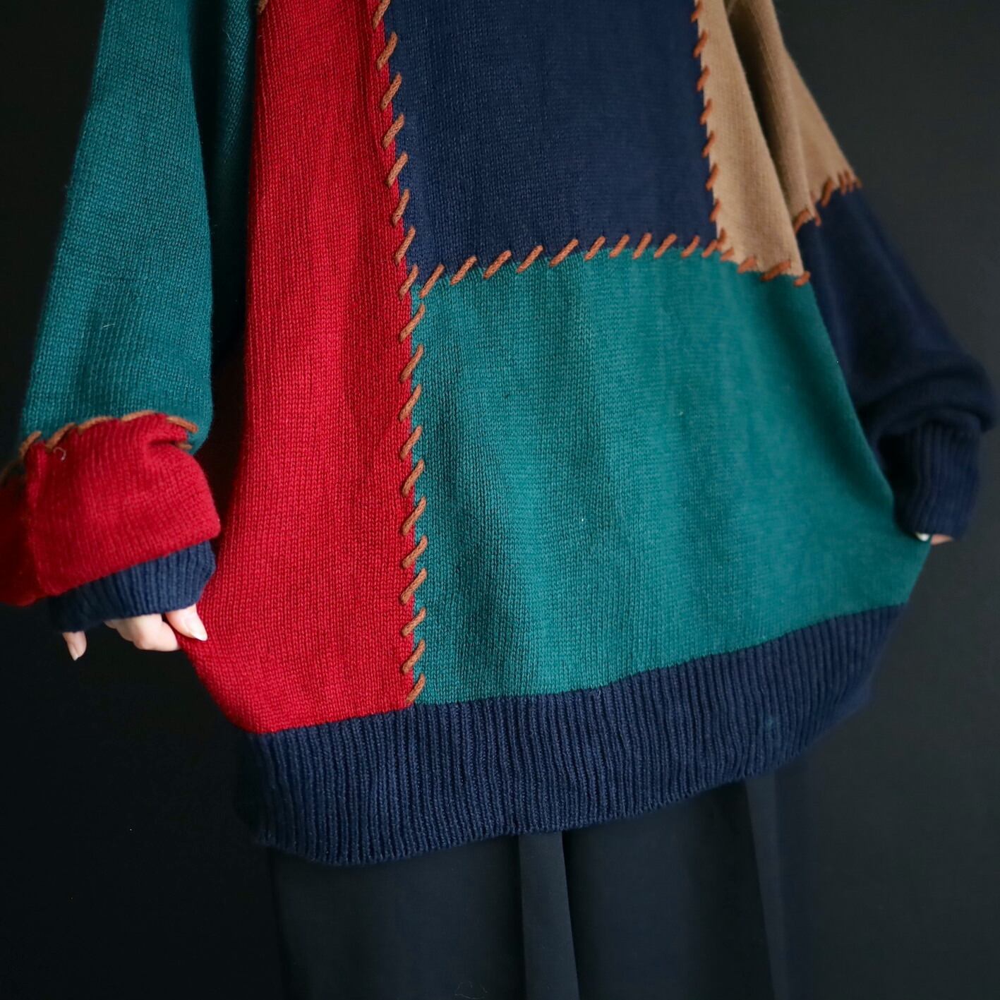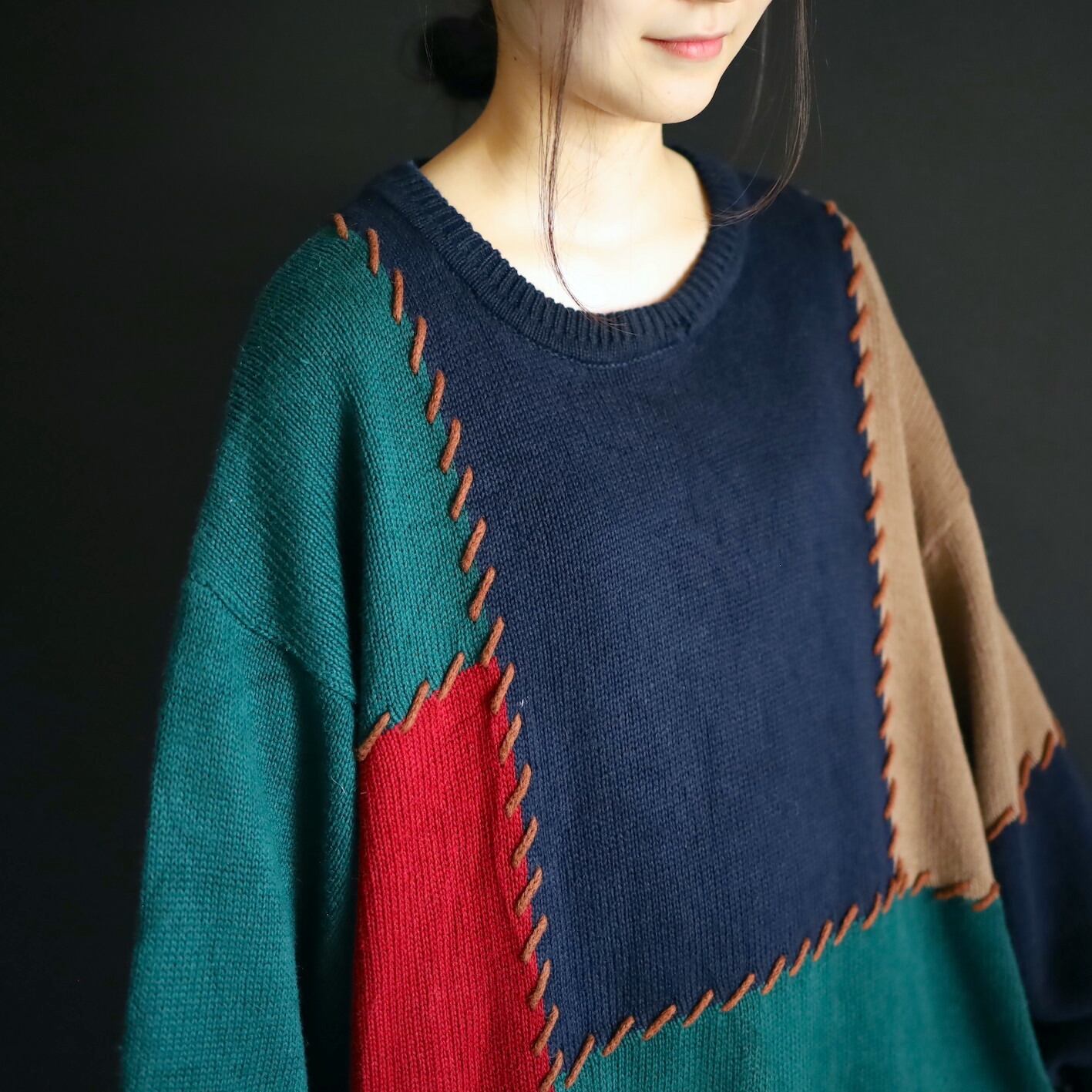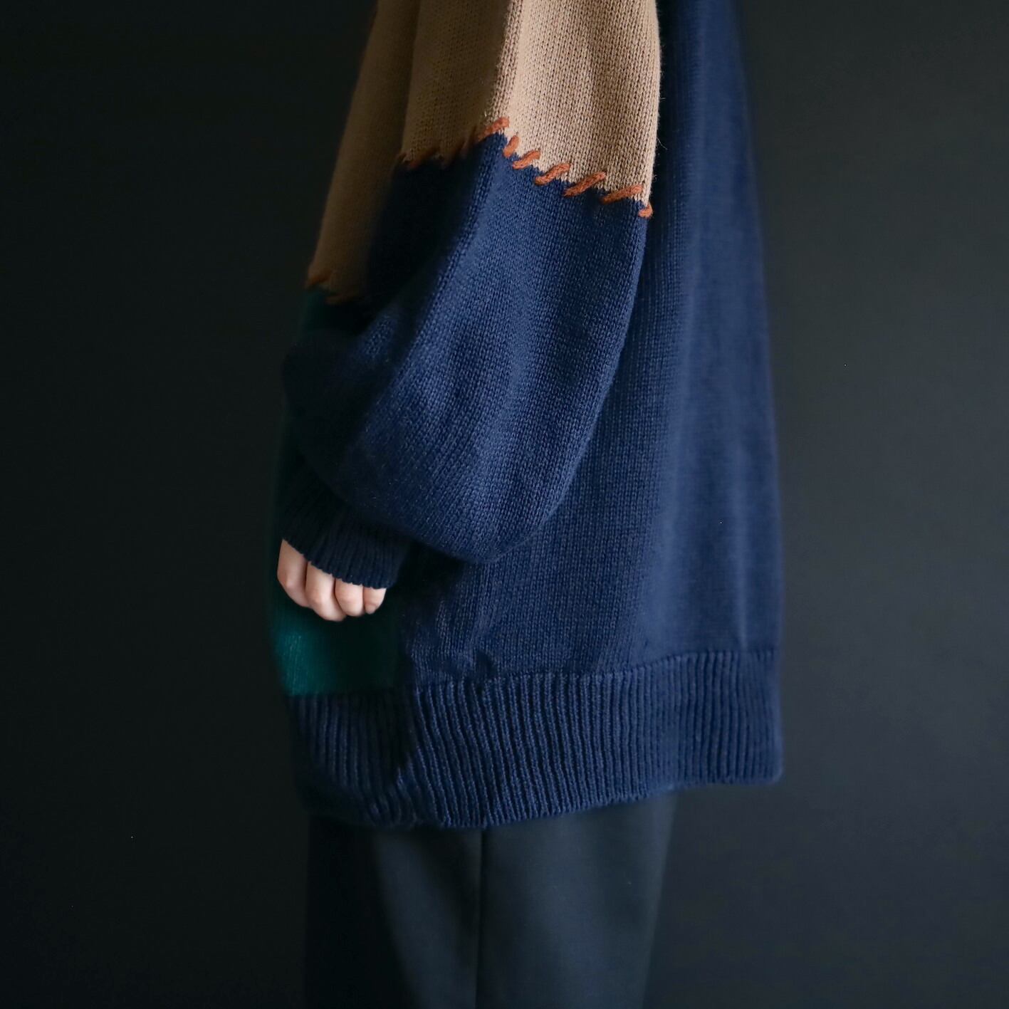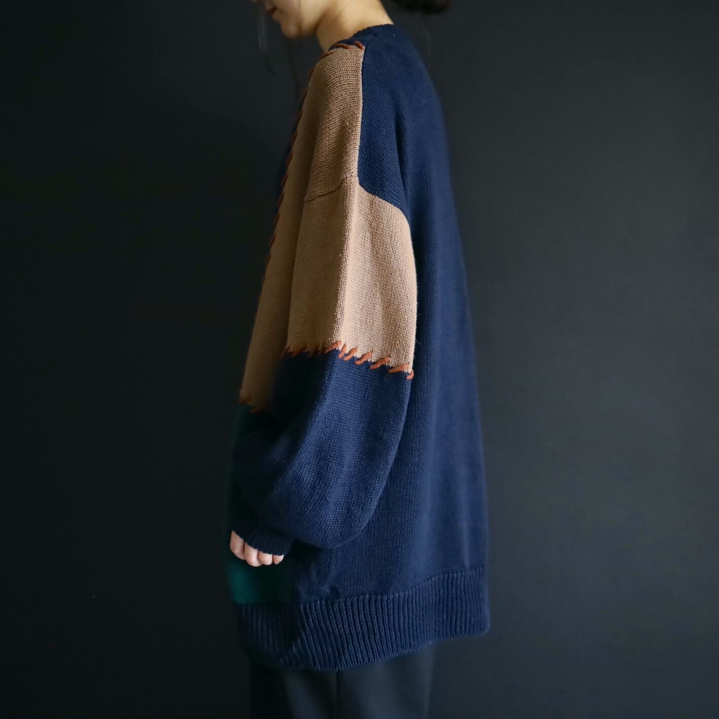 色切替部には太いステッチ風な編みを加えて,ツギハギ風なデザインに魅せているのがポイント.