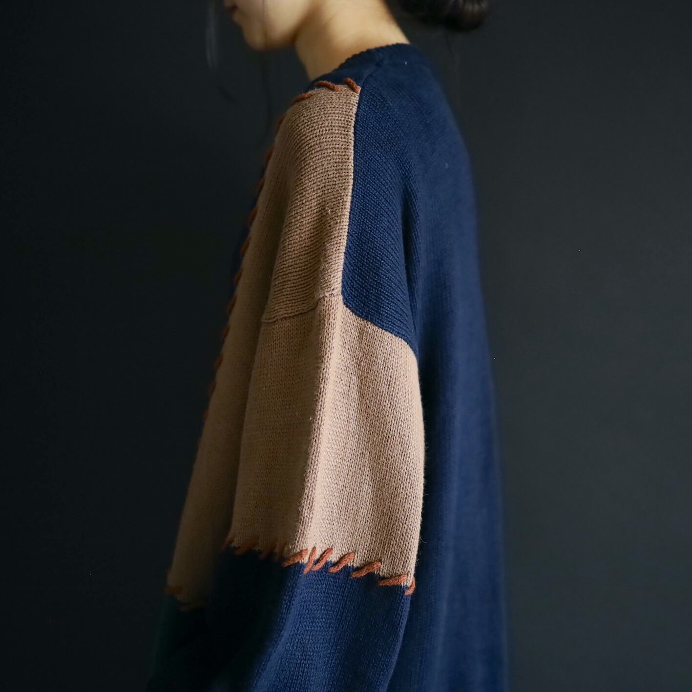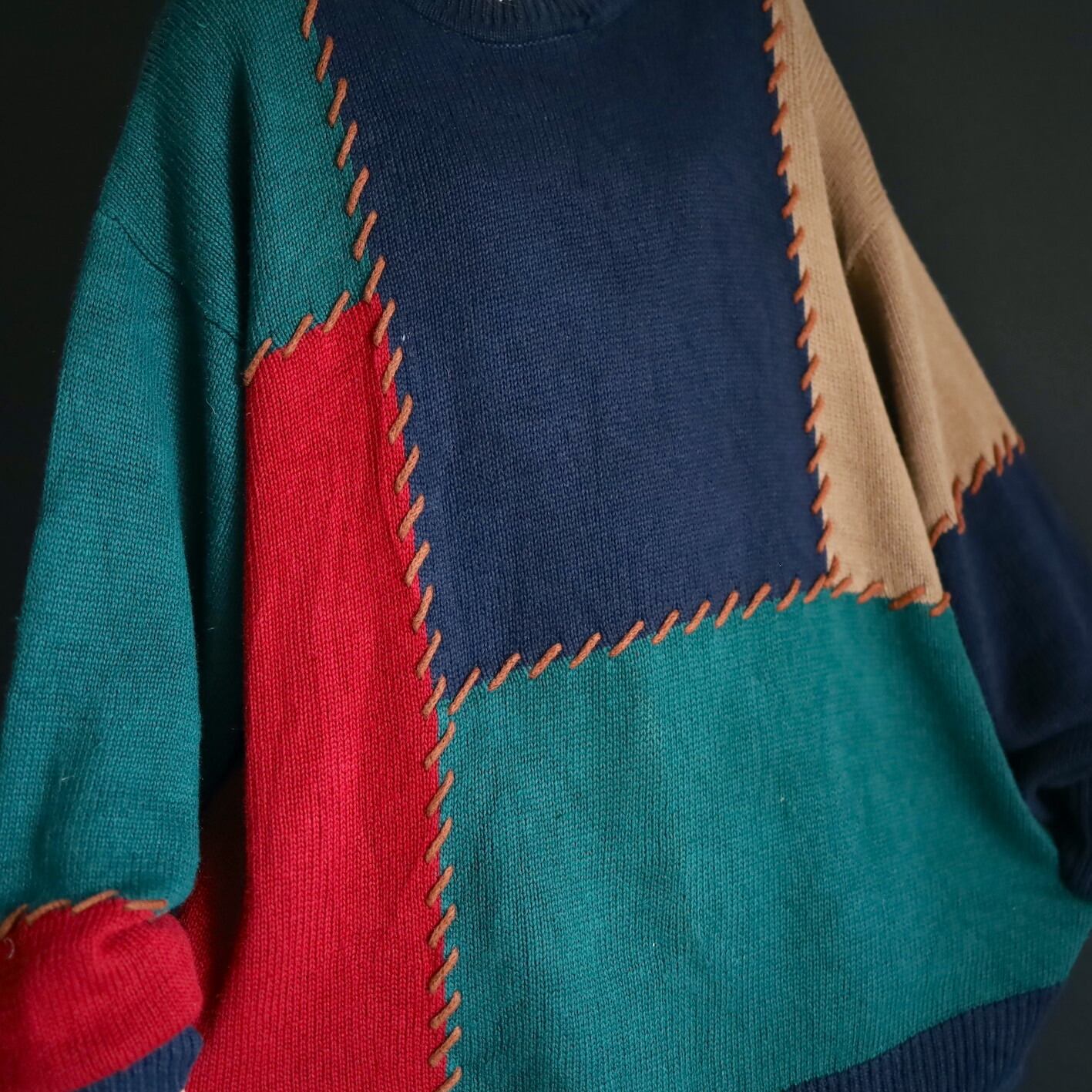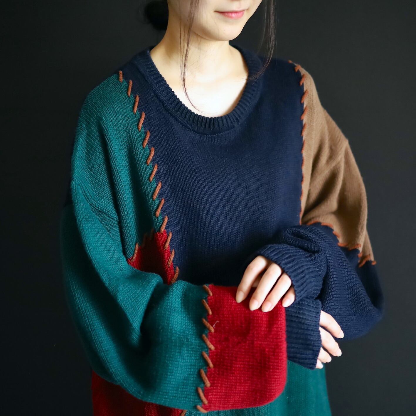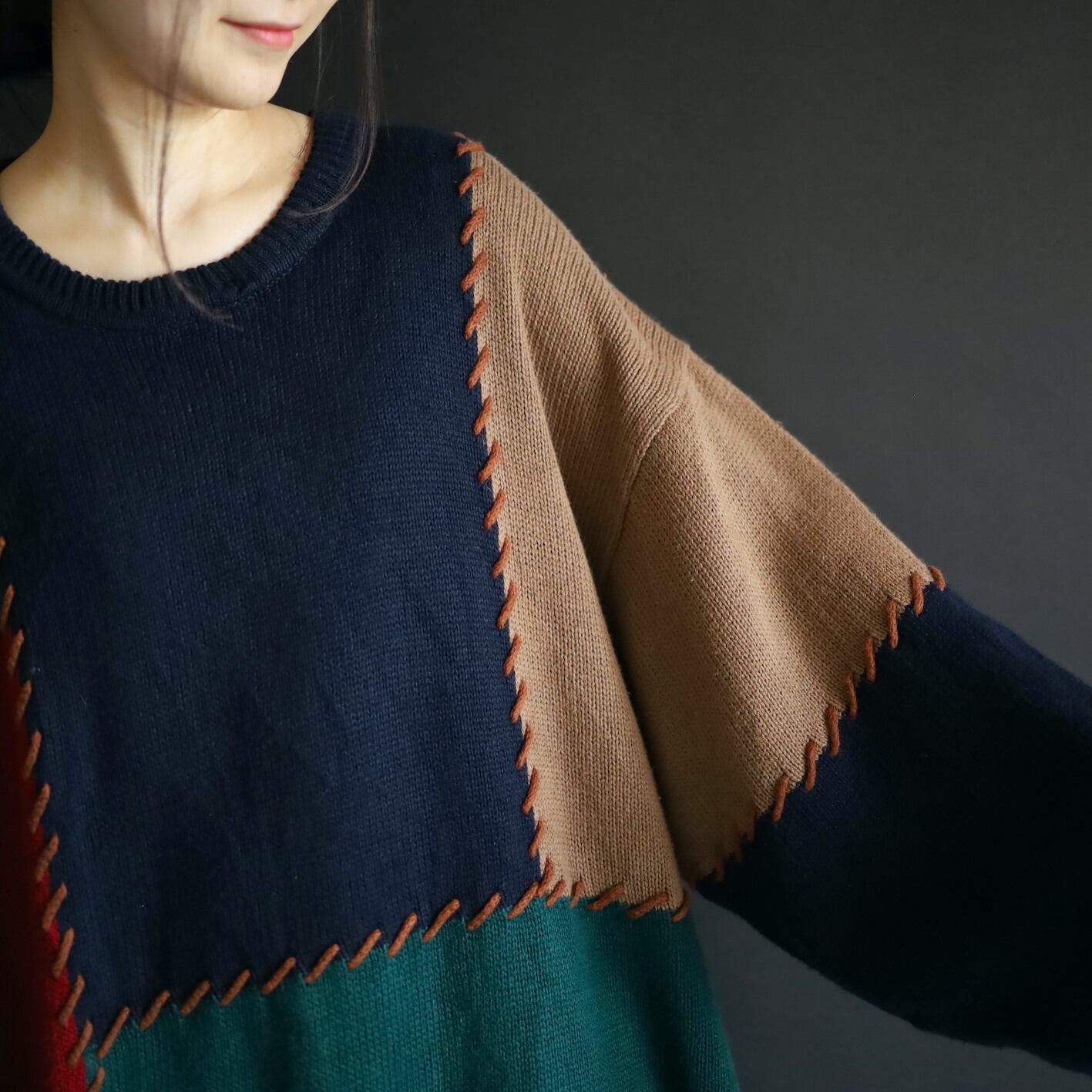 色切替部には太いステッチ風な編みを加えて,ツギハギ風なデザインに魅せているのがポイント.
