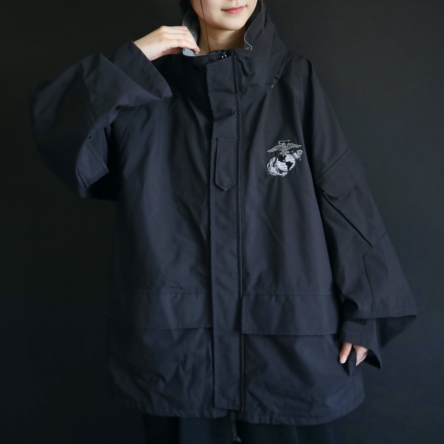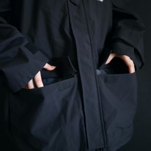 サイドポケットにフラップポケット,さらに両袖にアームポケットで収納面も充実.