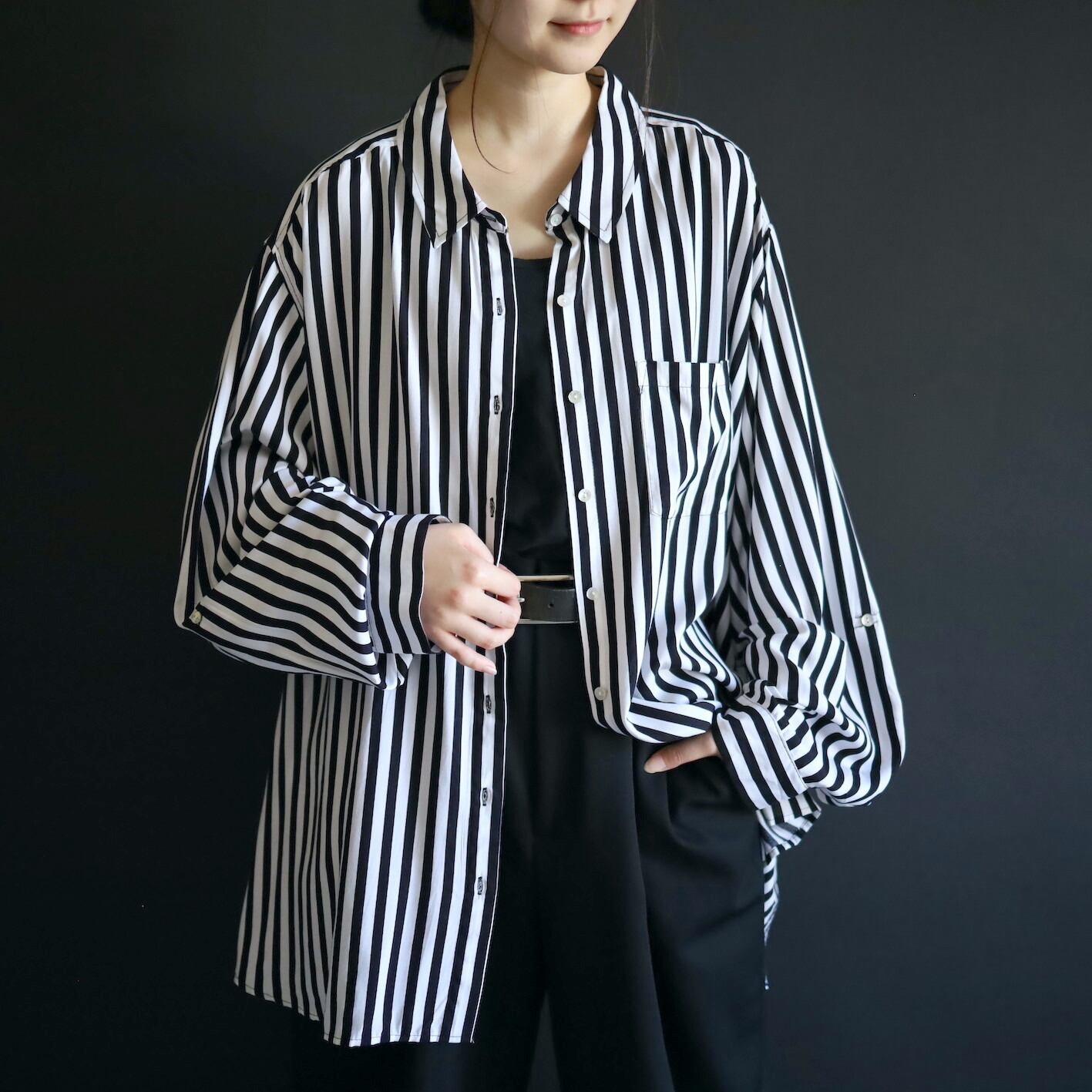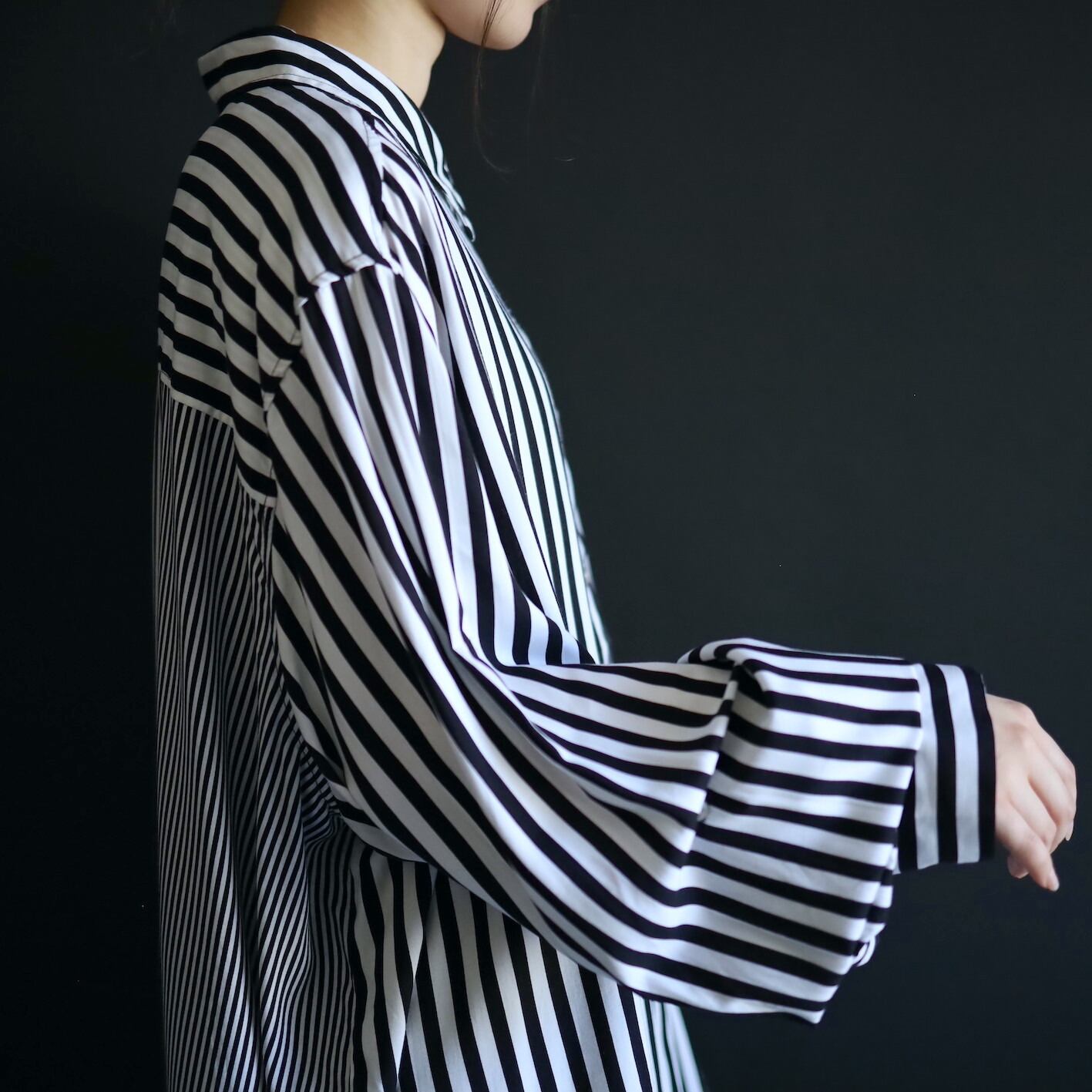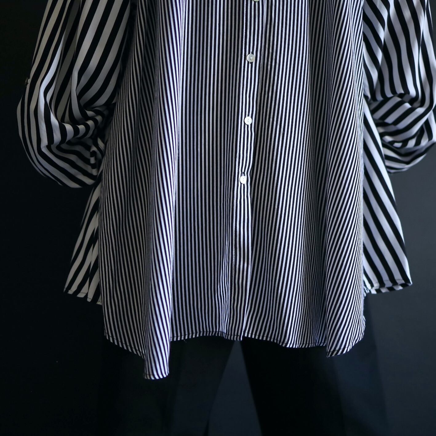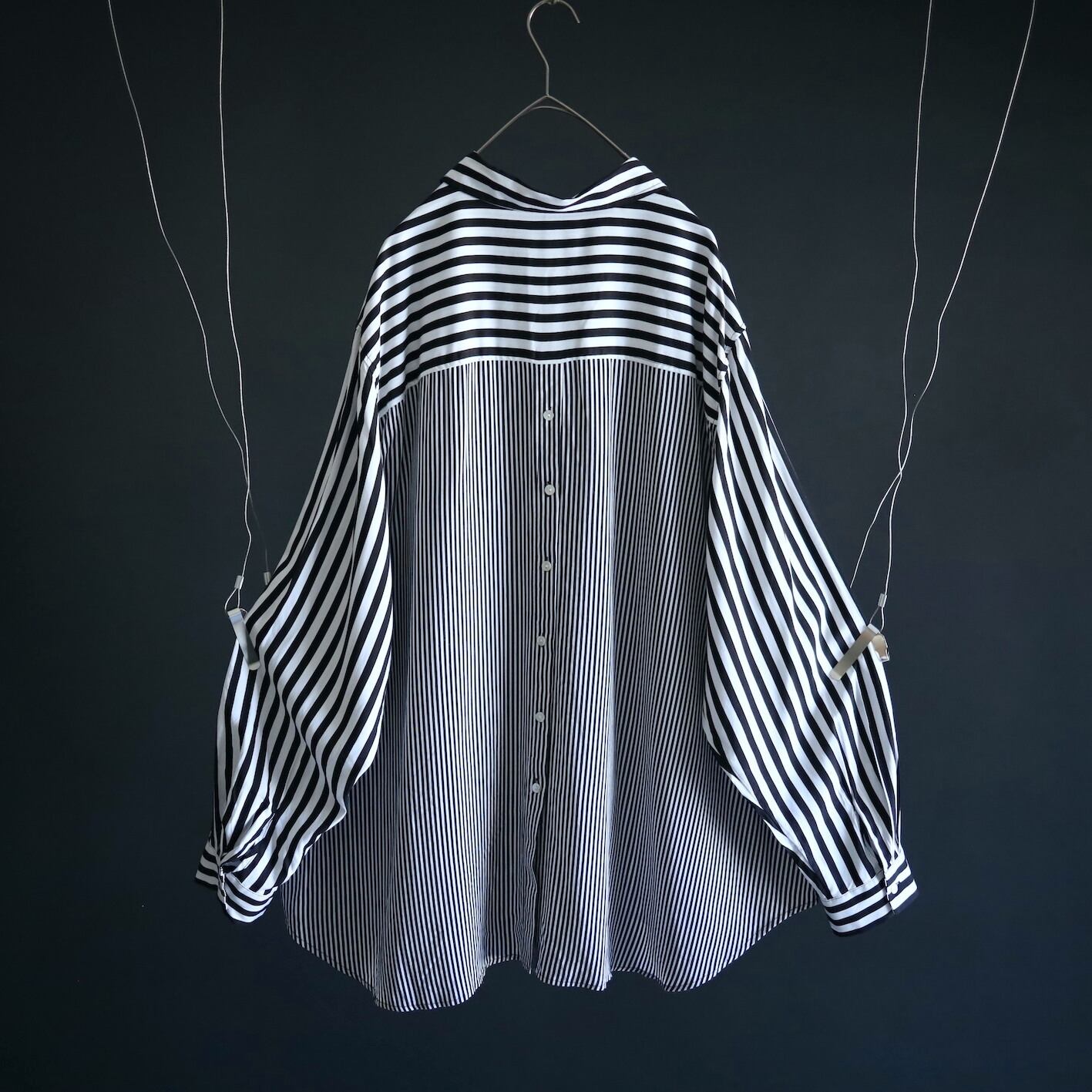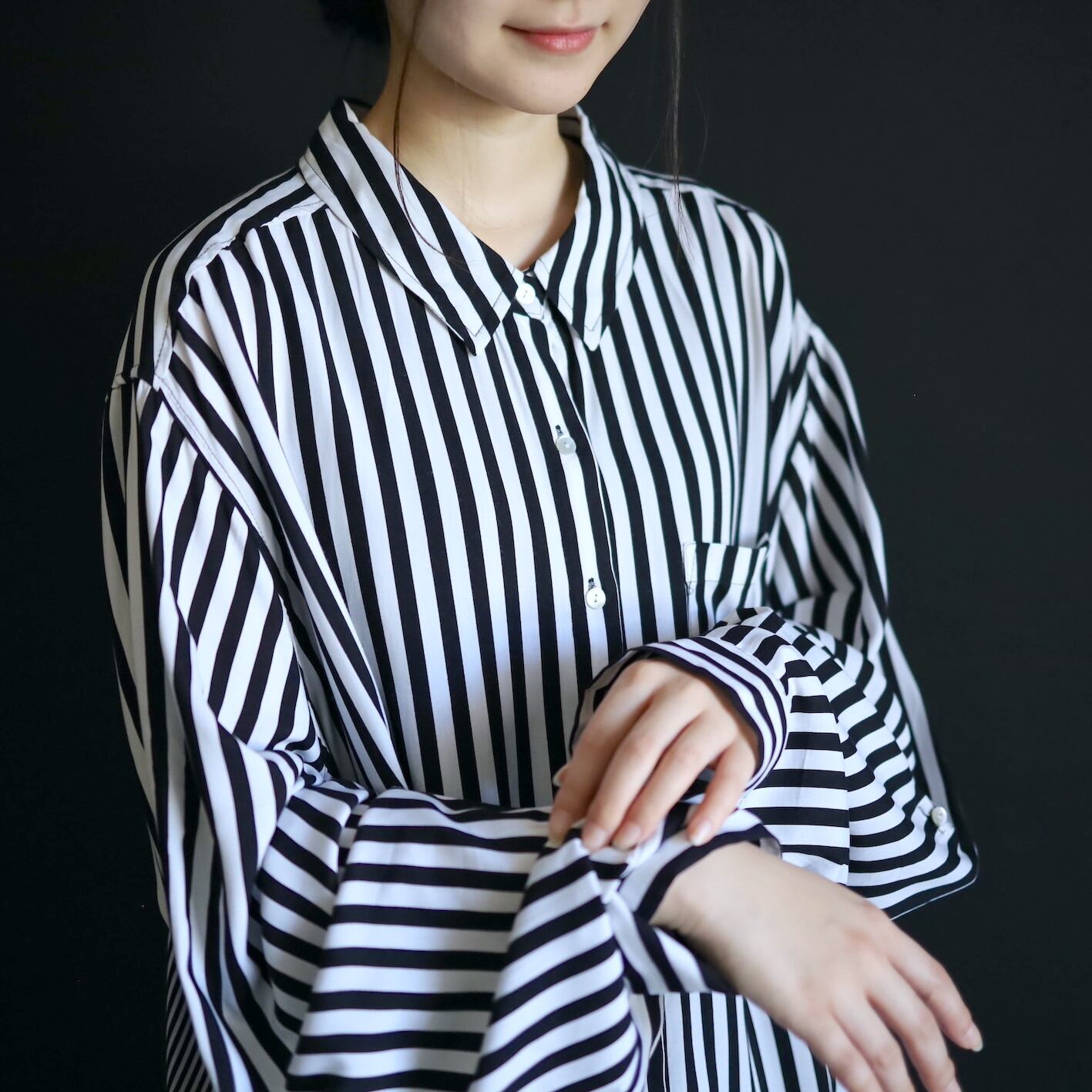 綺麗め,カジュアルなものが多いストライプシャツの中,モードなデザイン性,生地感のイッテンモノ.