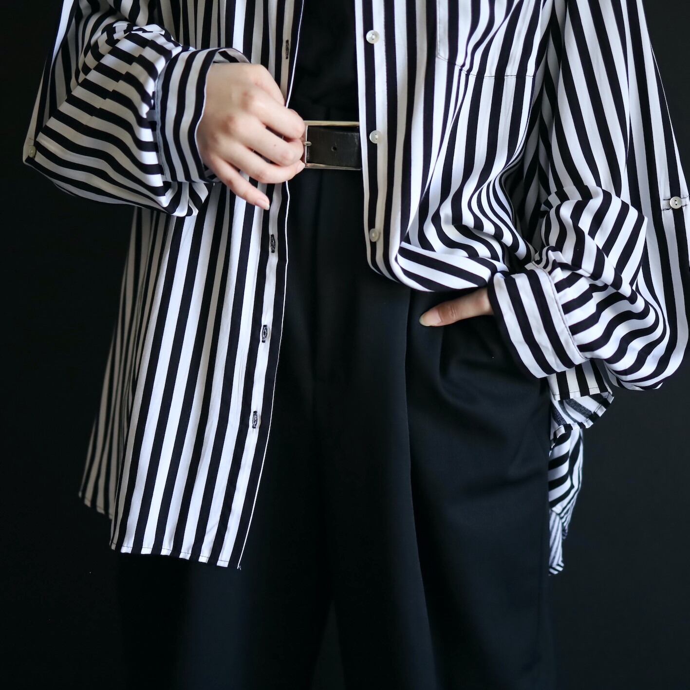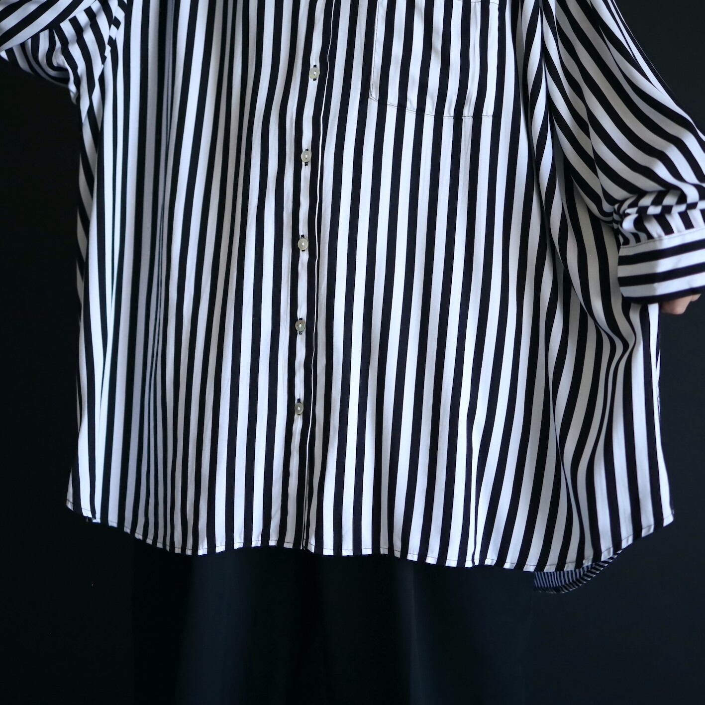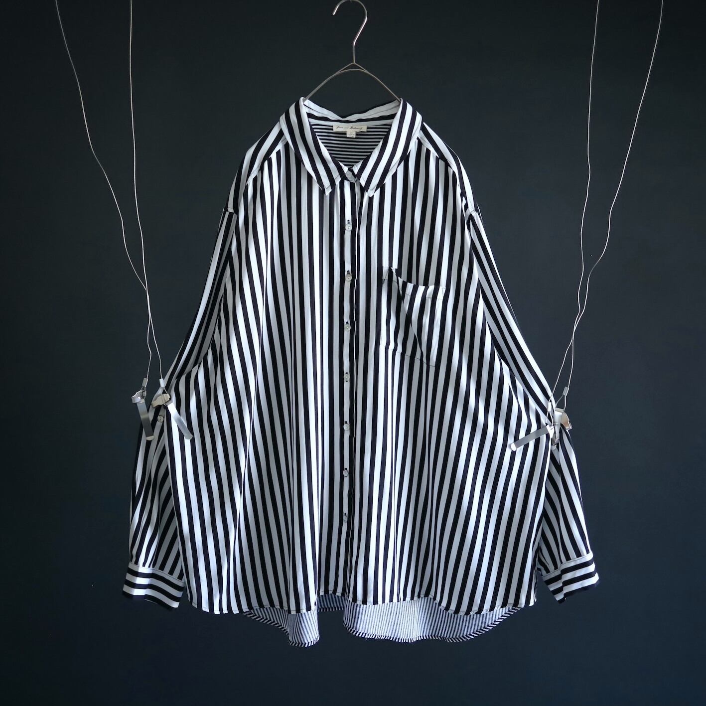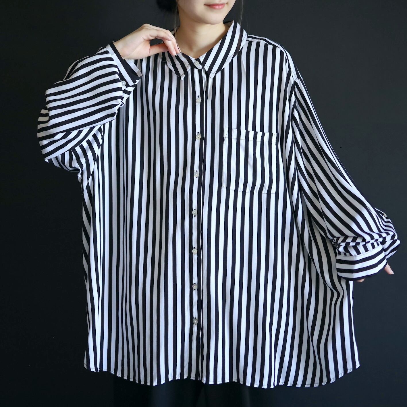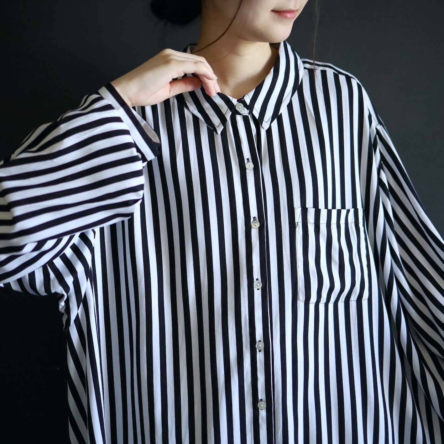 綺麗め,カジュアルなものが多いストライプシャツの中,モードなデザイン性,生地感のイッテンモノ.
