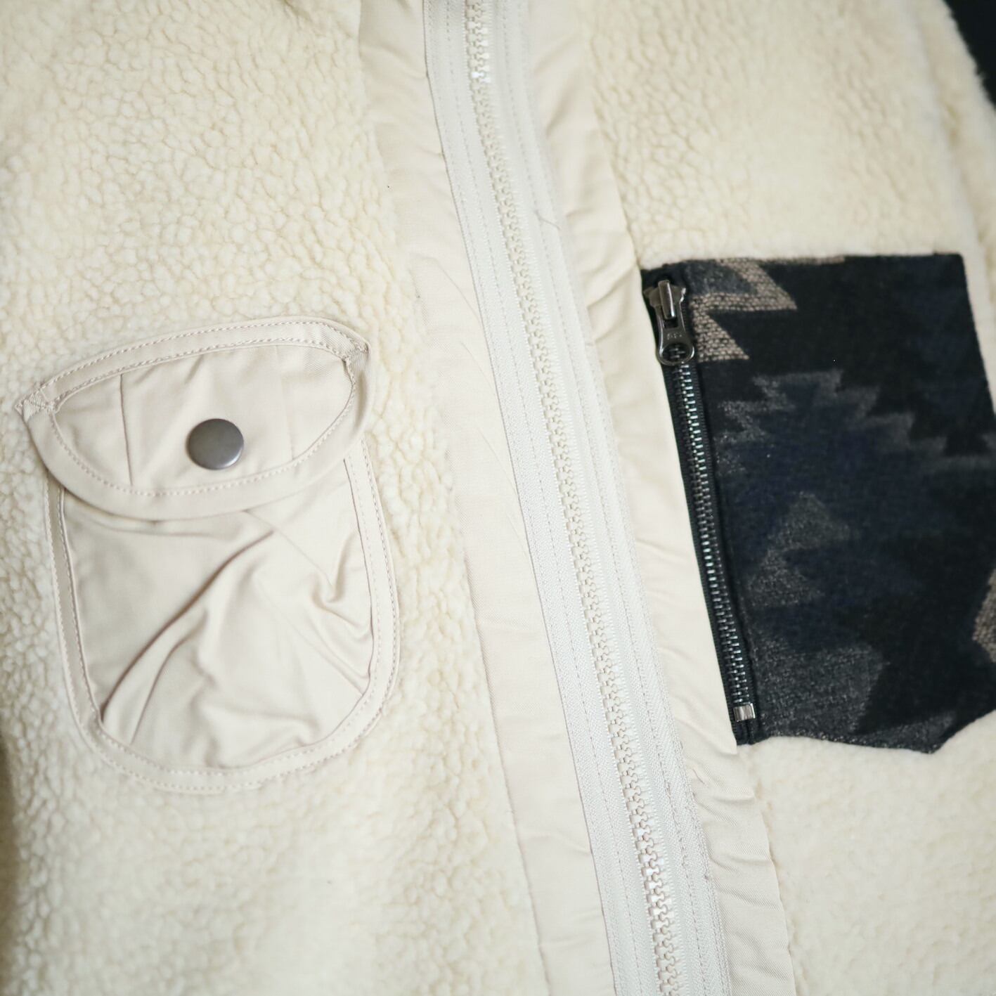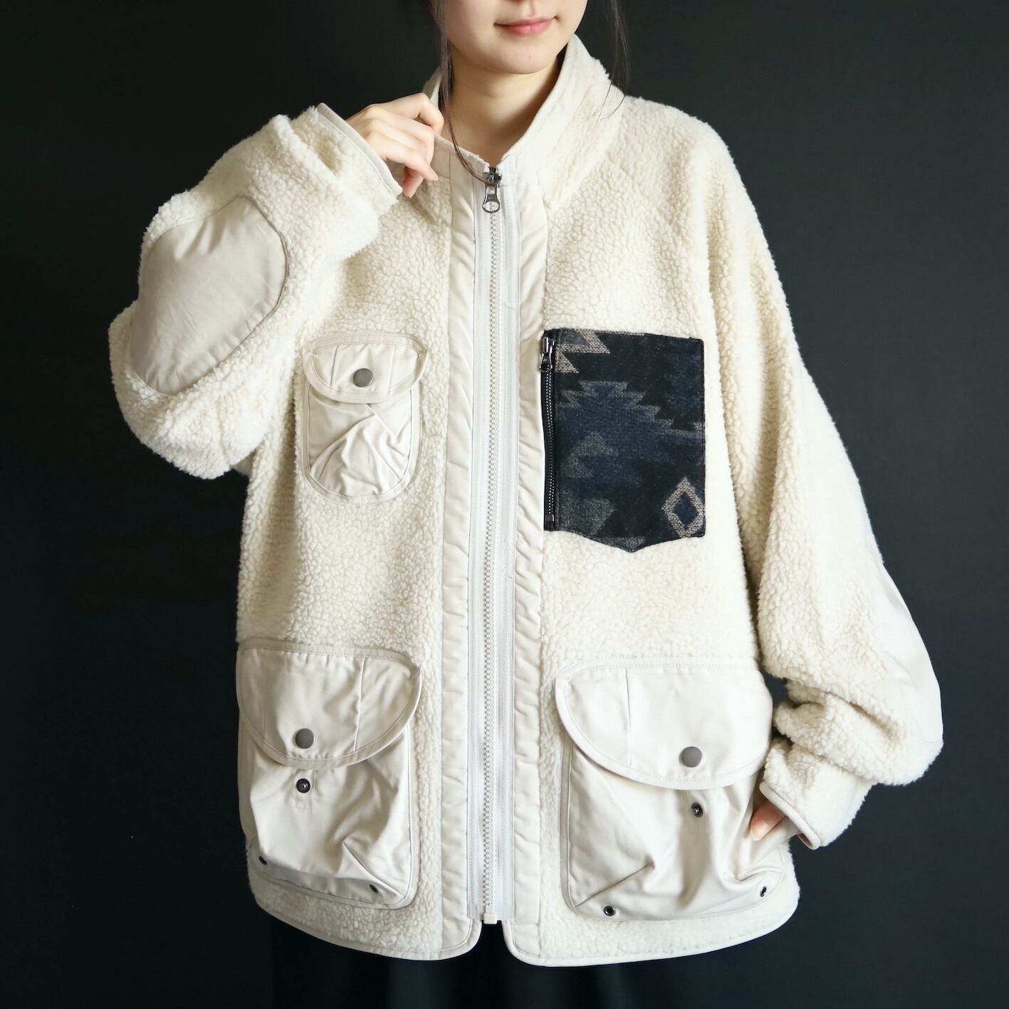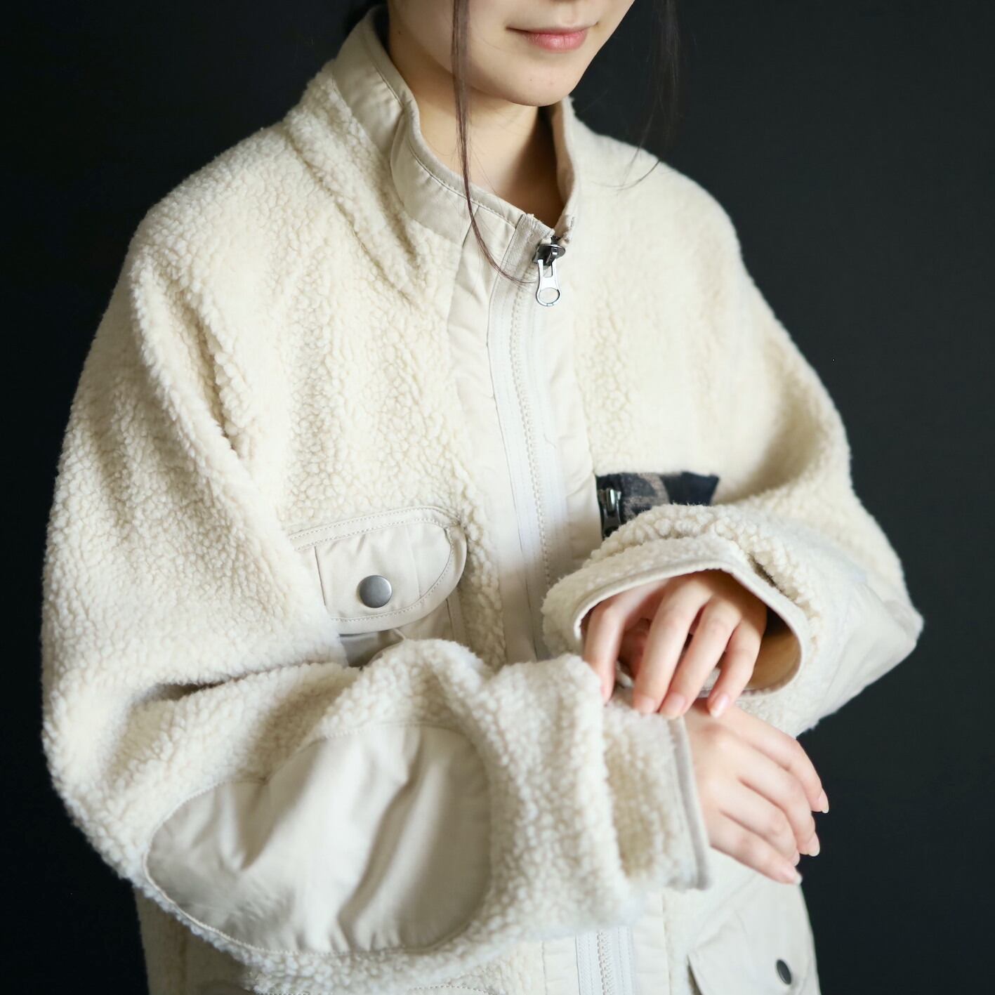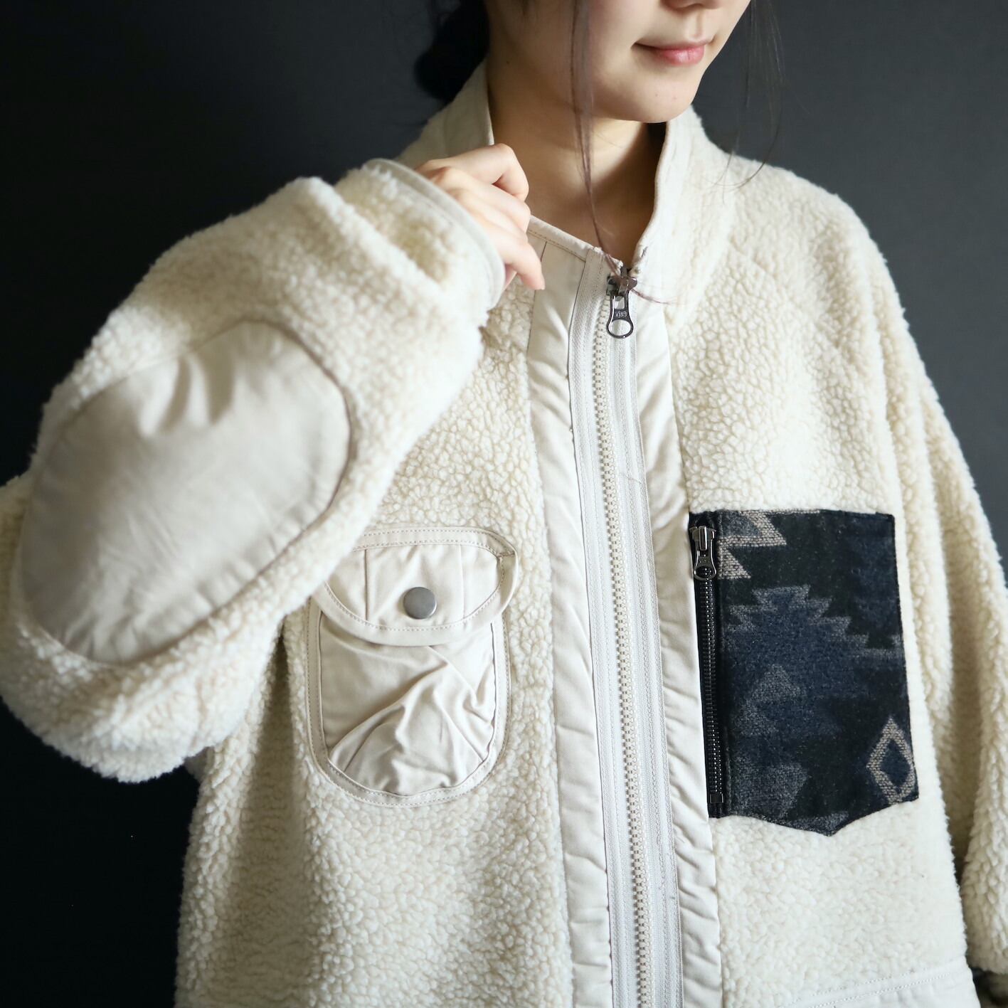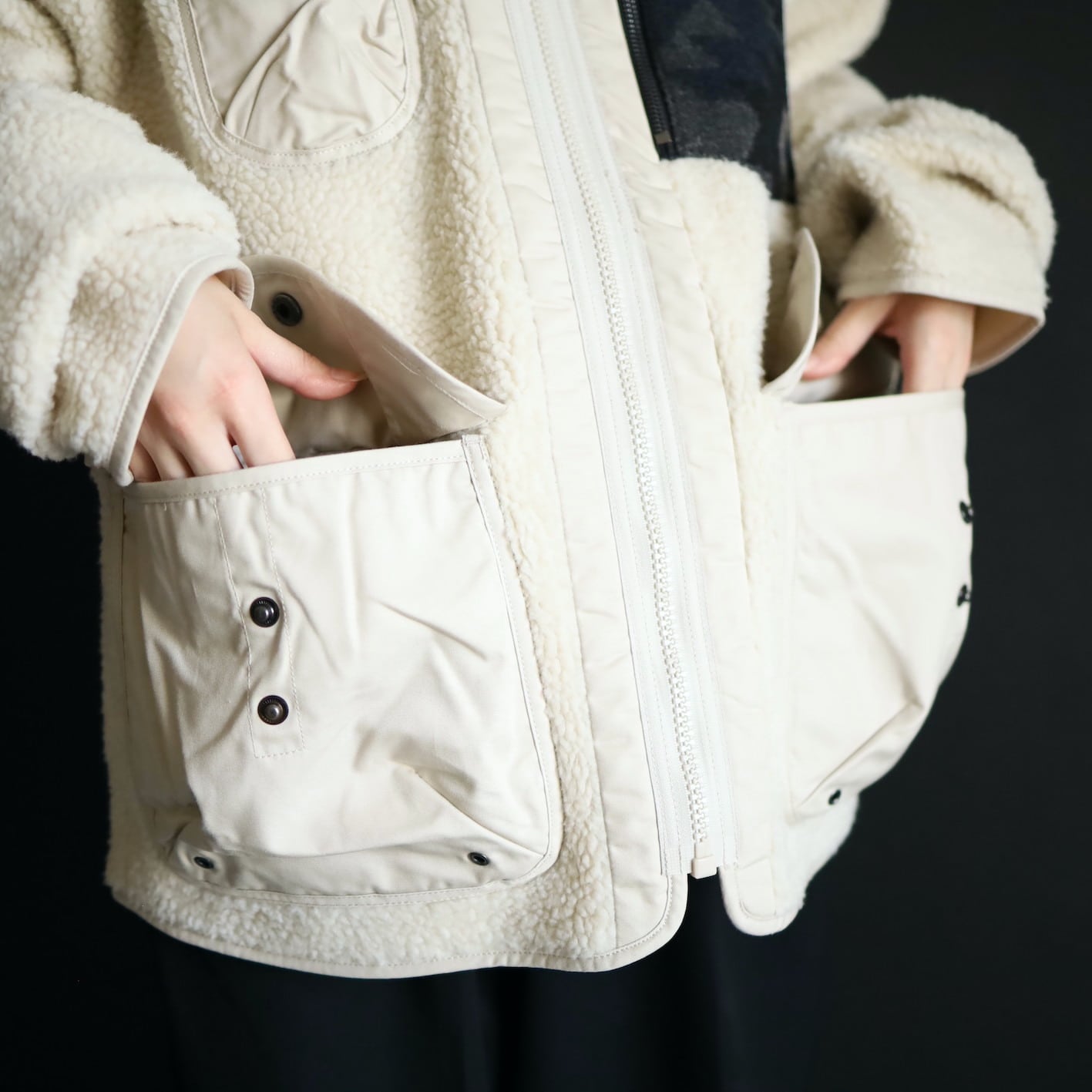 オフホワイトカラーのボアフリースをメインに,ポケットが生地切替と柄切替.