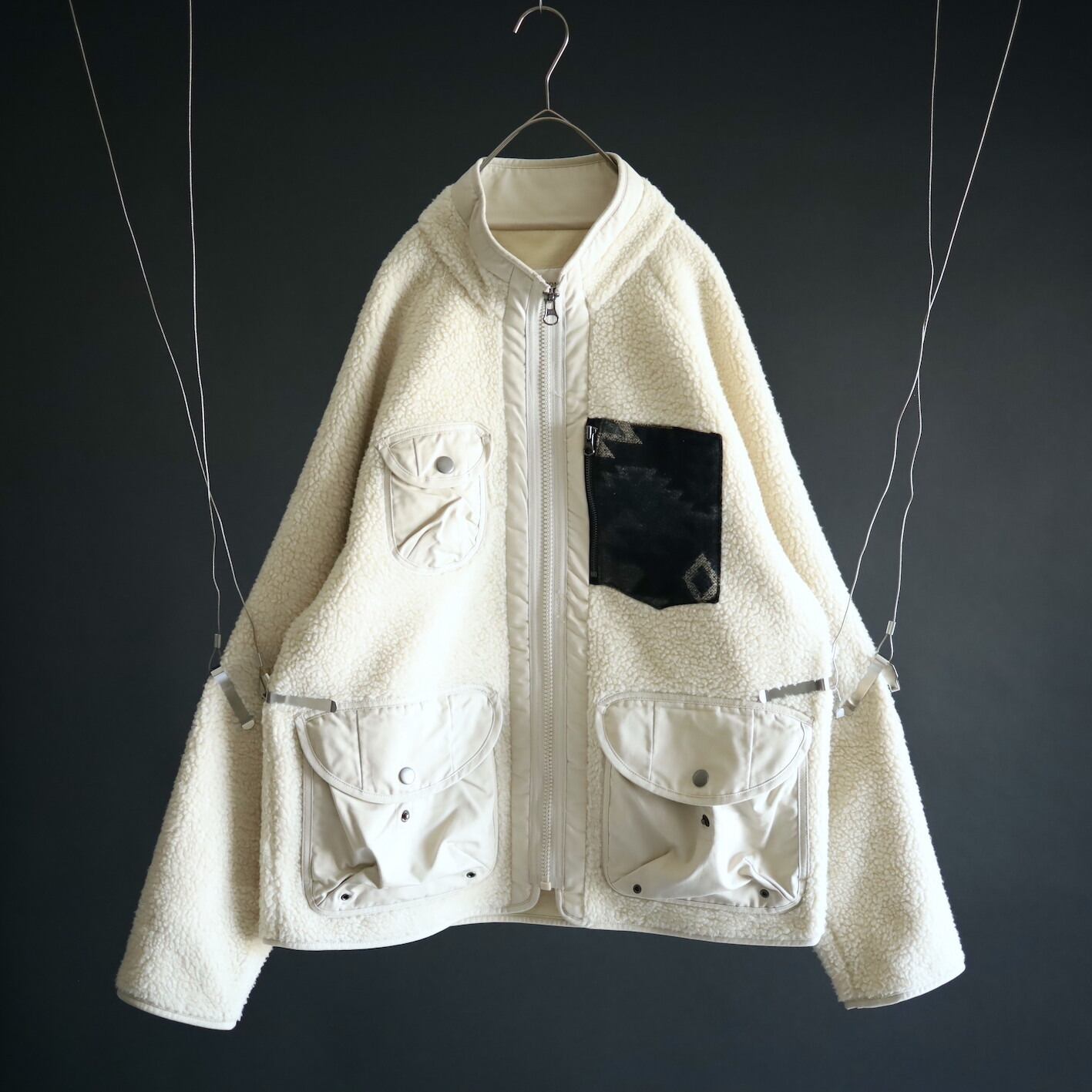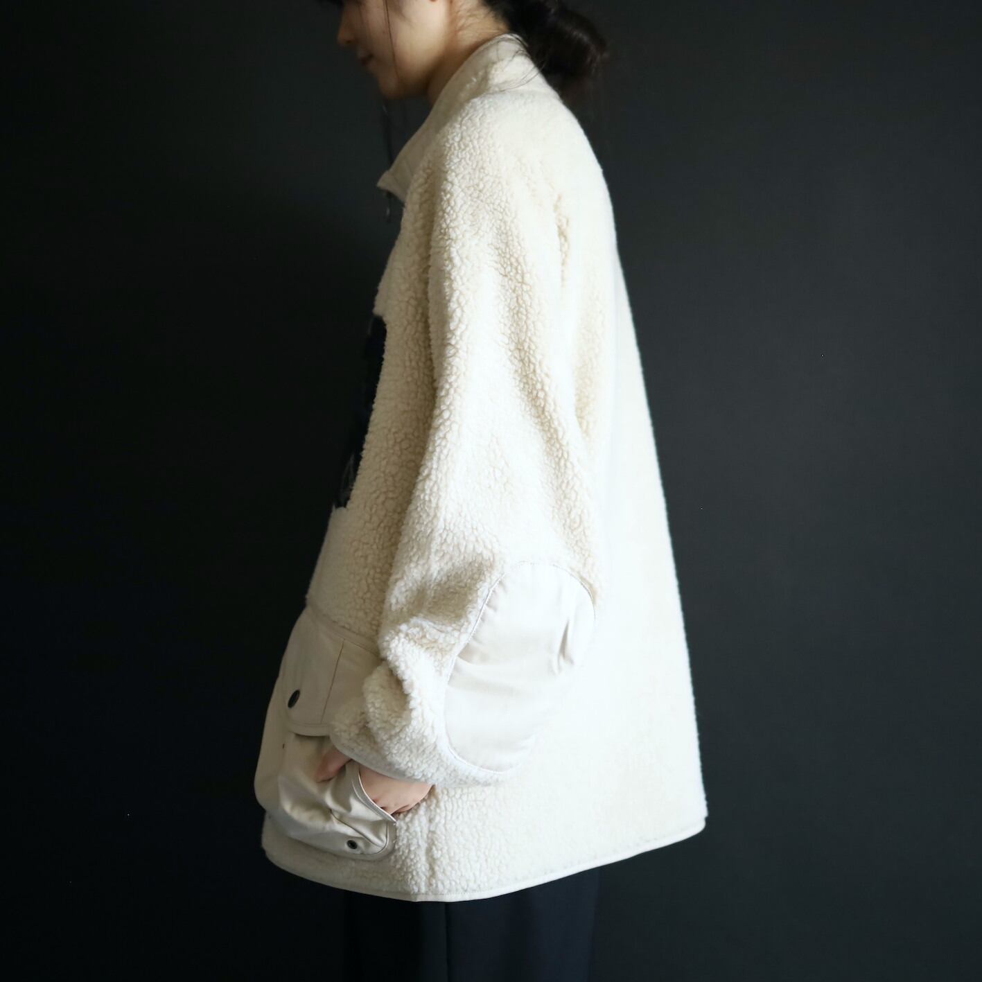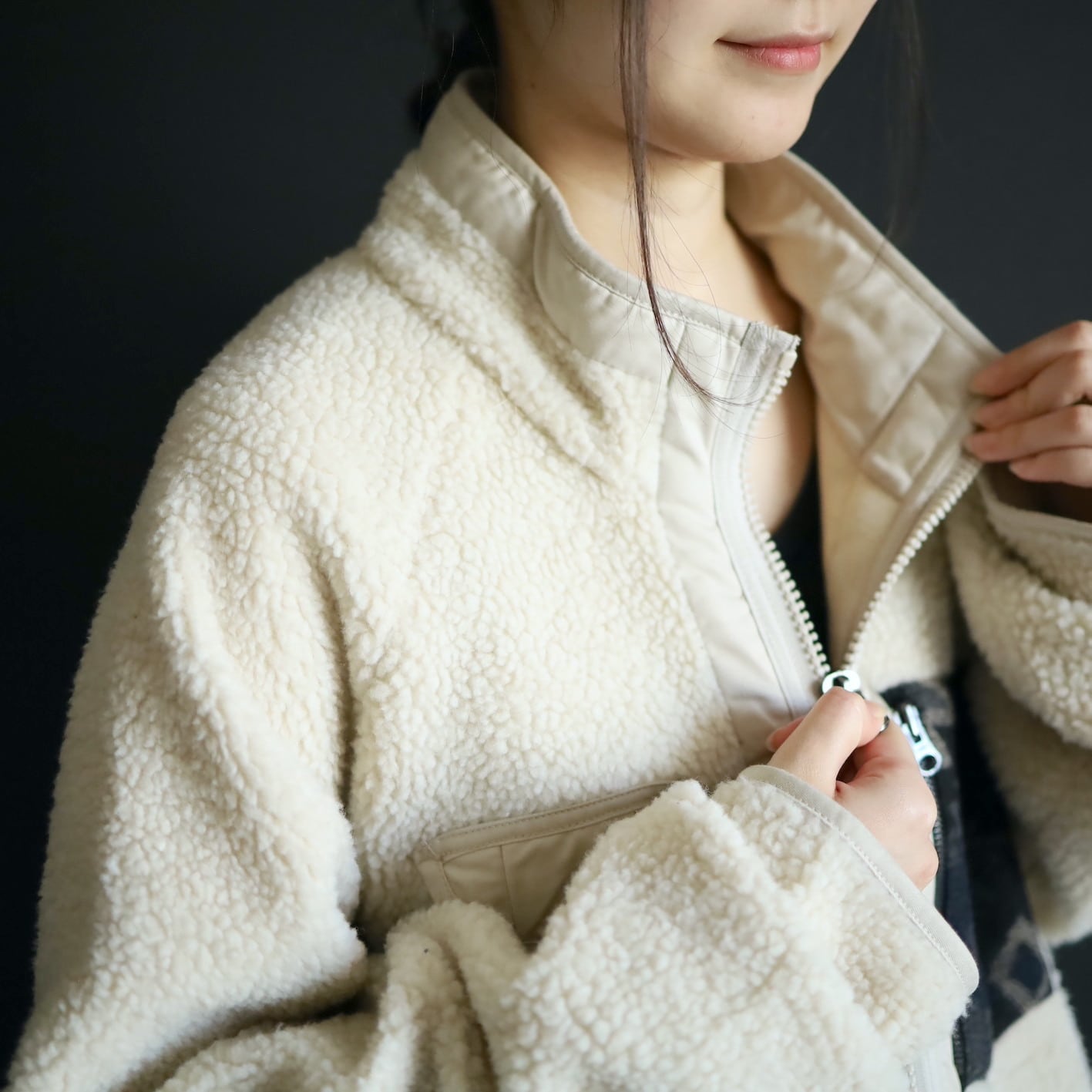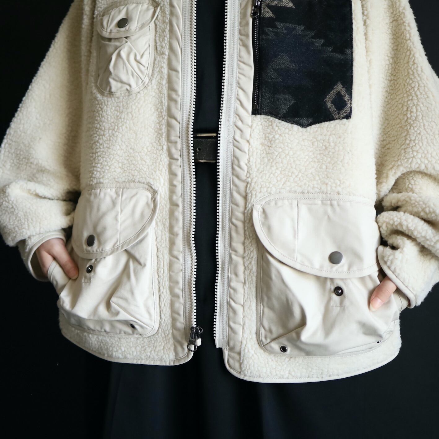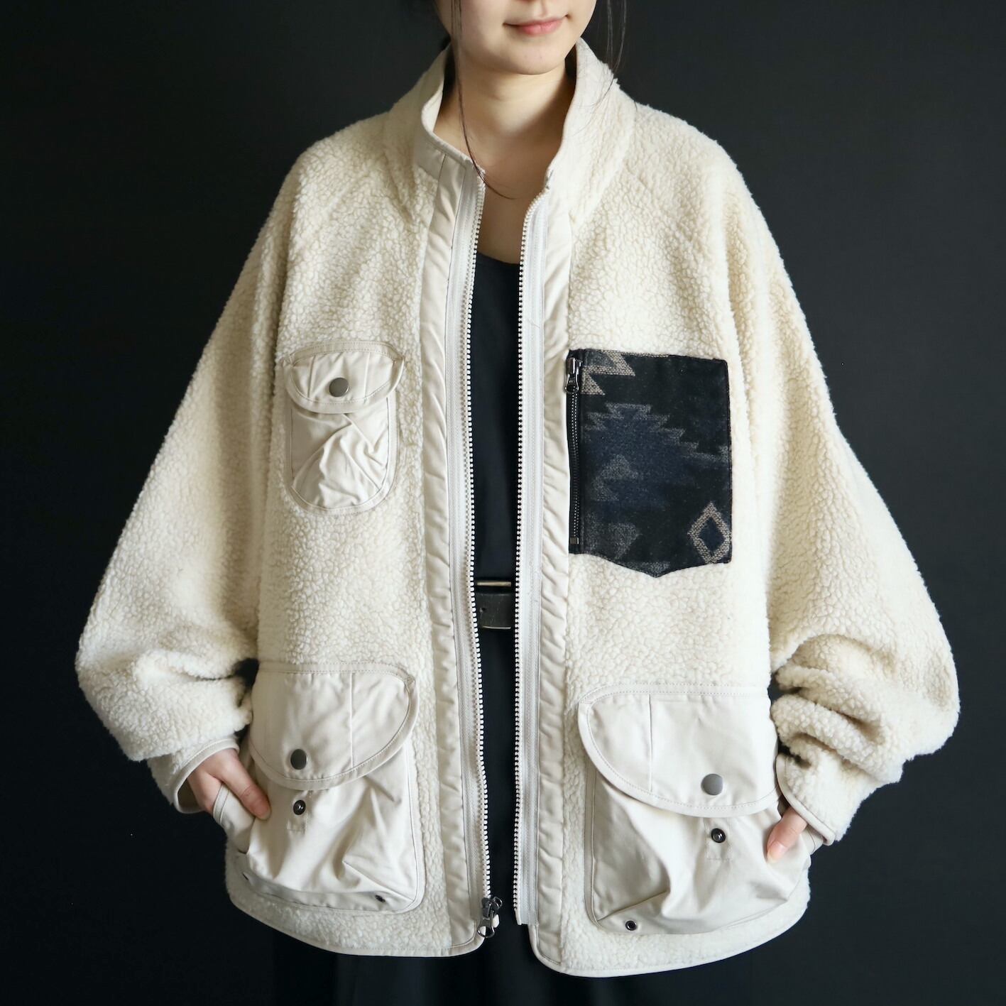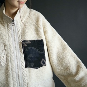 オフホワイトカラーのボアフリースをメインに,ポケットが生地切替と柄切替.