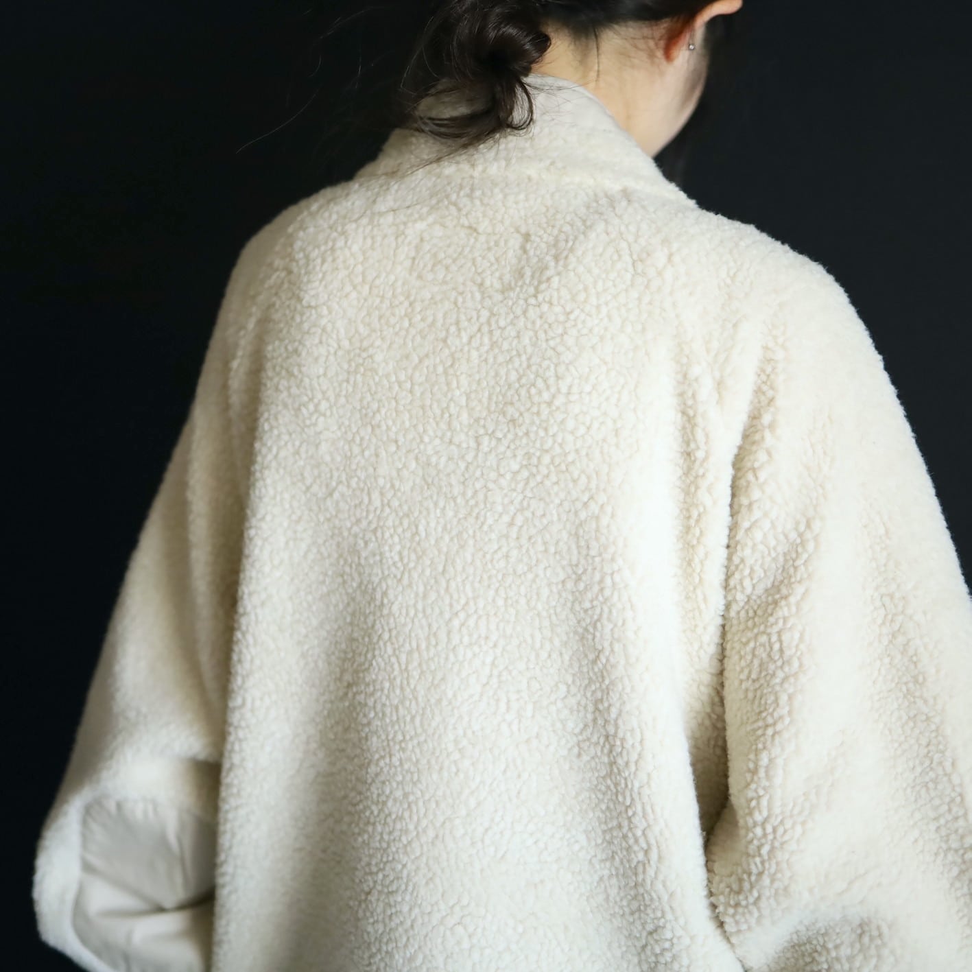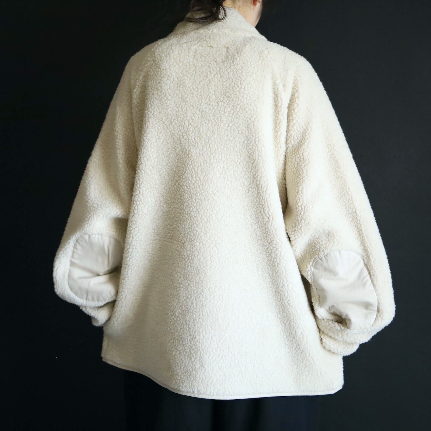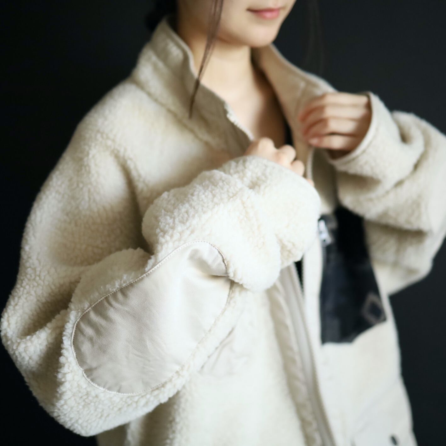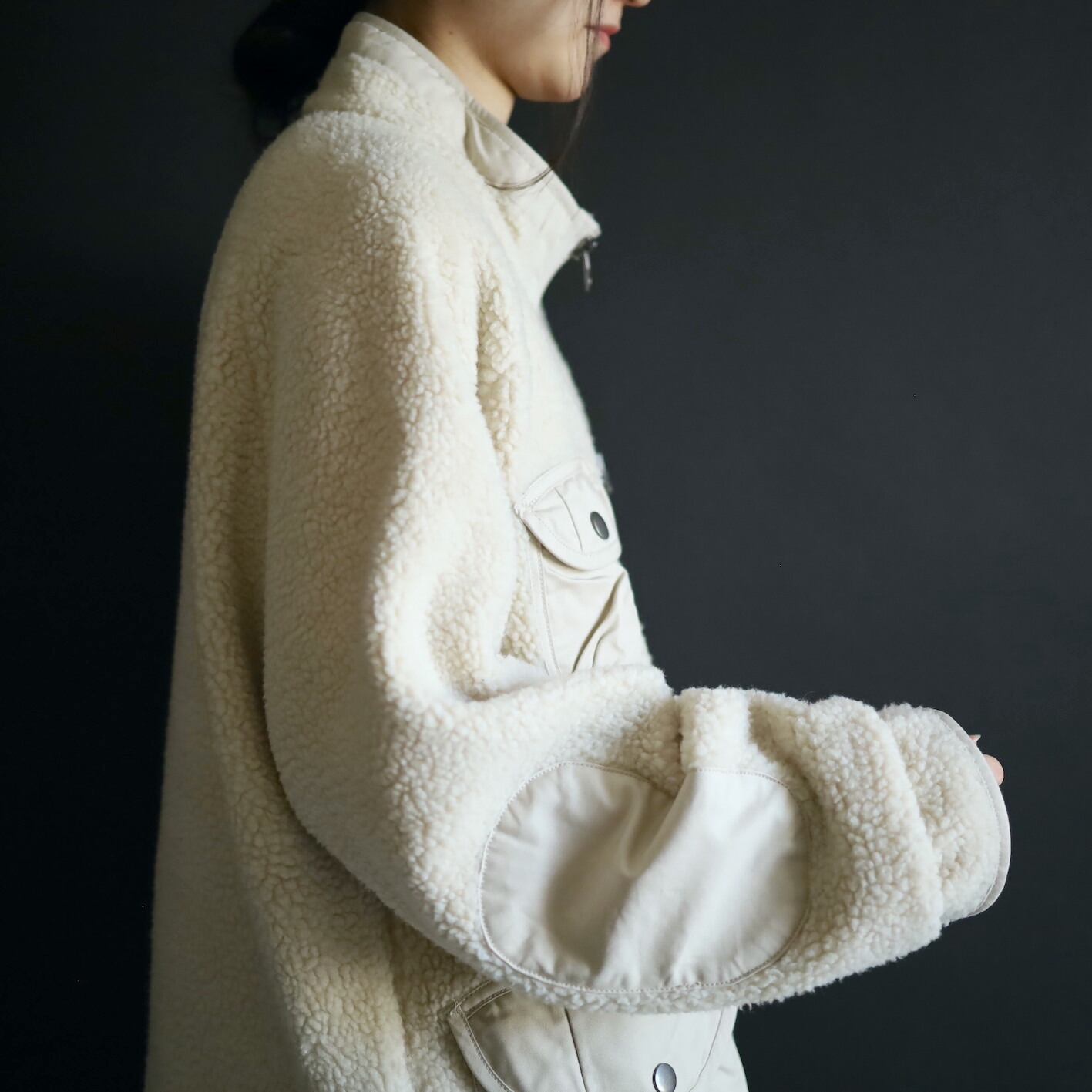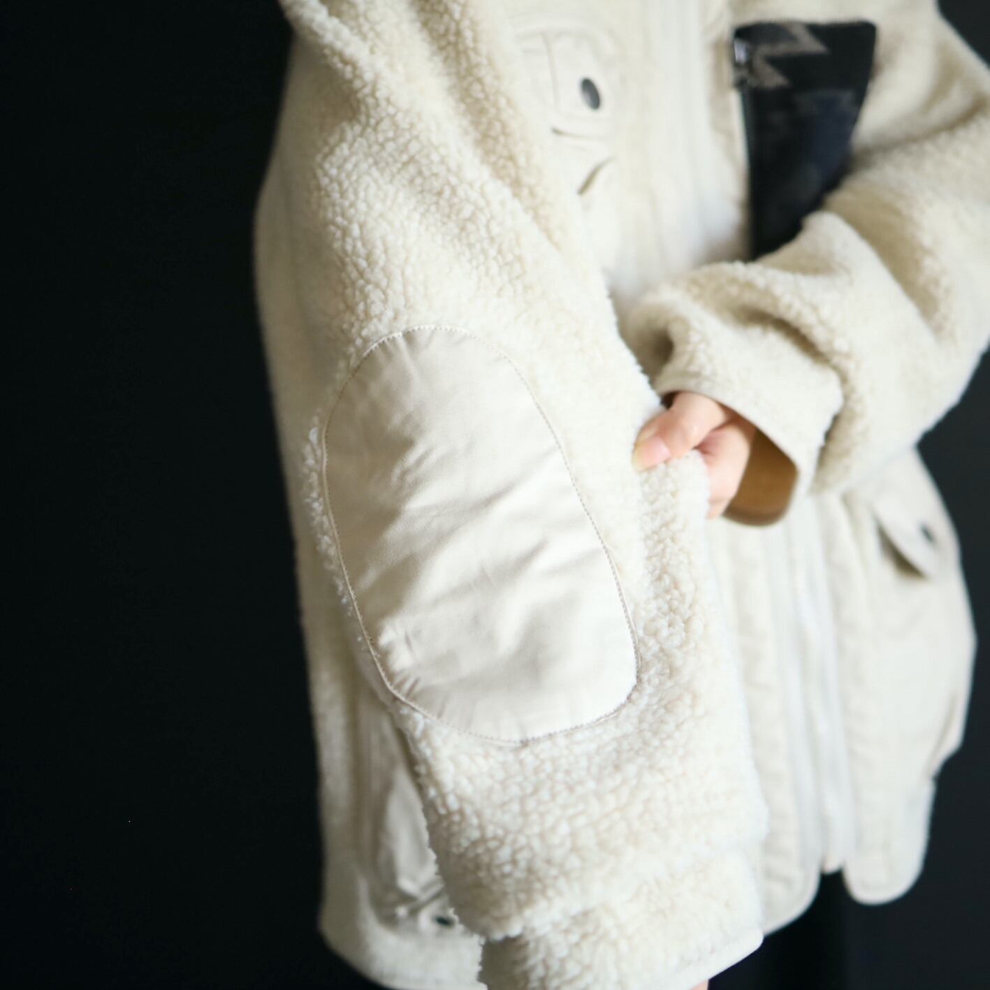 オフホワイトカラーのボアフリースをメインに,ポケットが生地切替と柄切替.