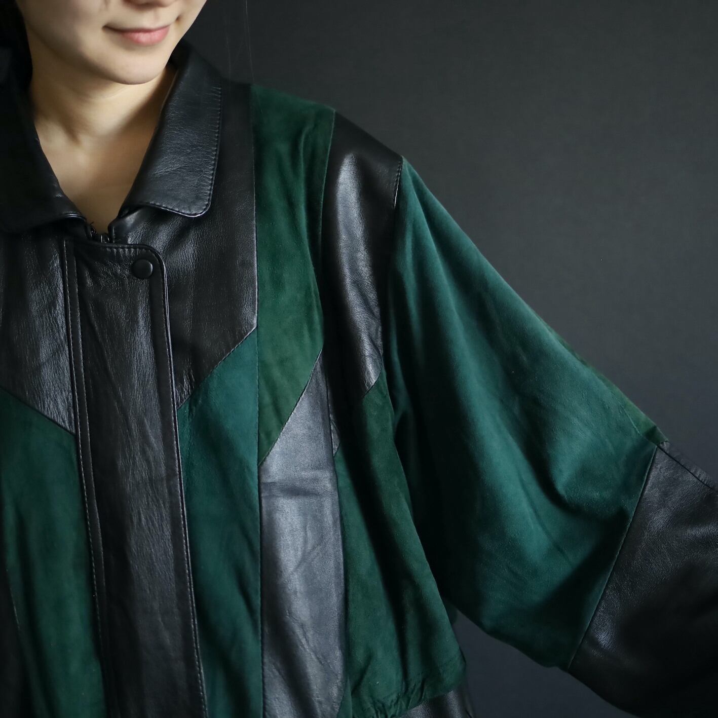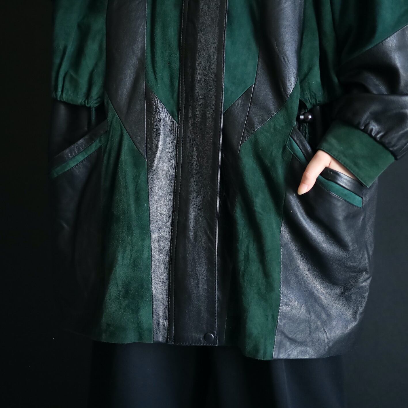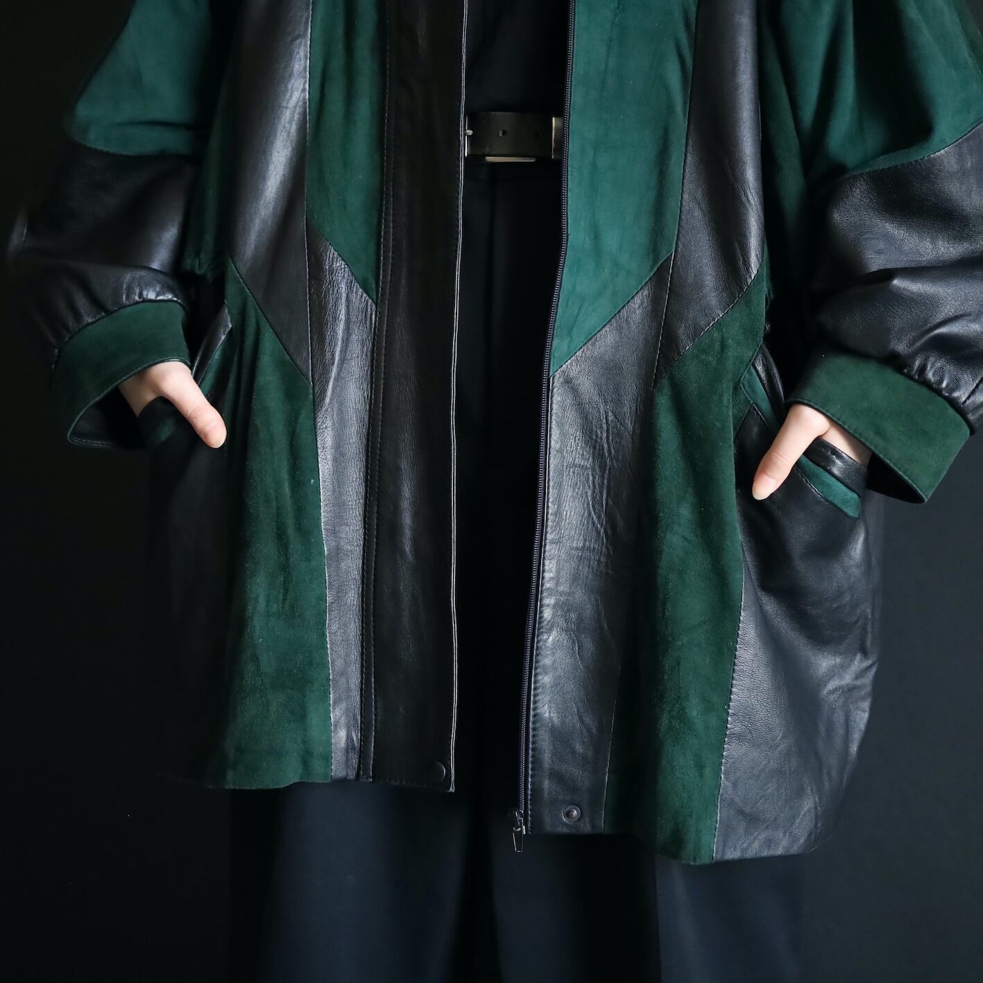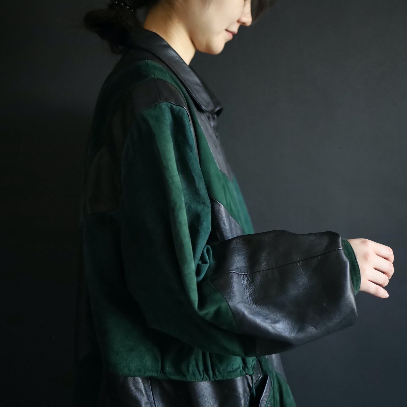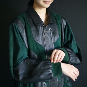 柔らかくコンディションのいいブラックレザーと,深みのあるグリーンのフェイクスエード切替ボディ.