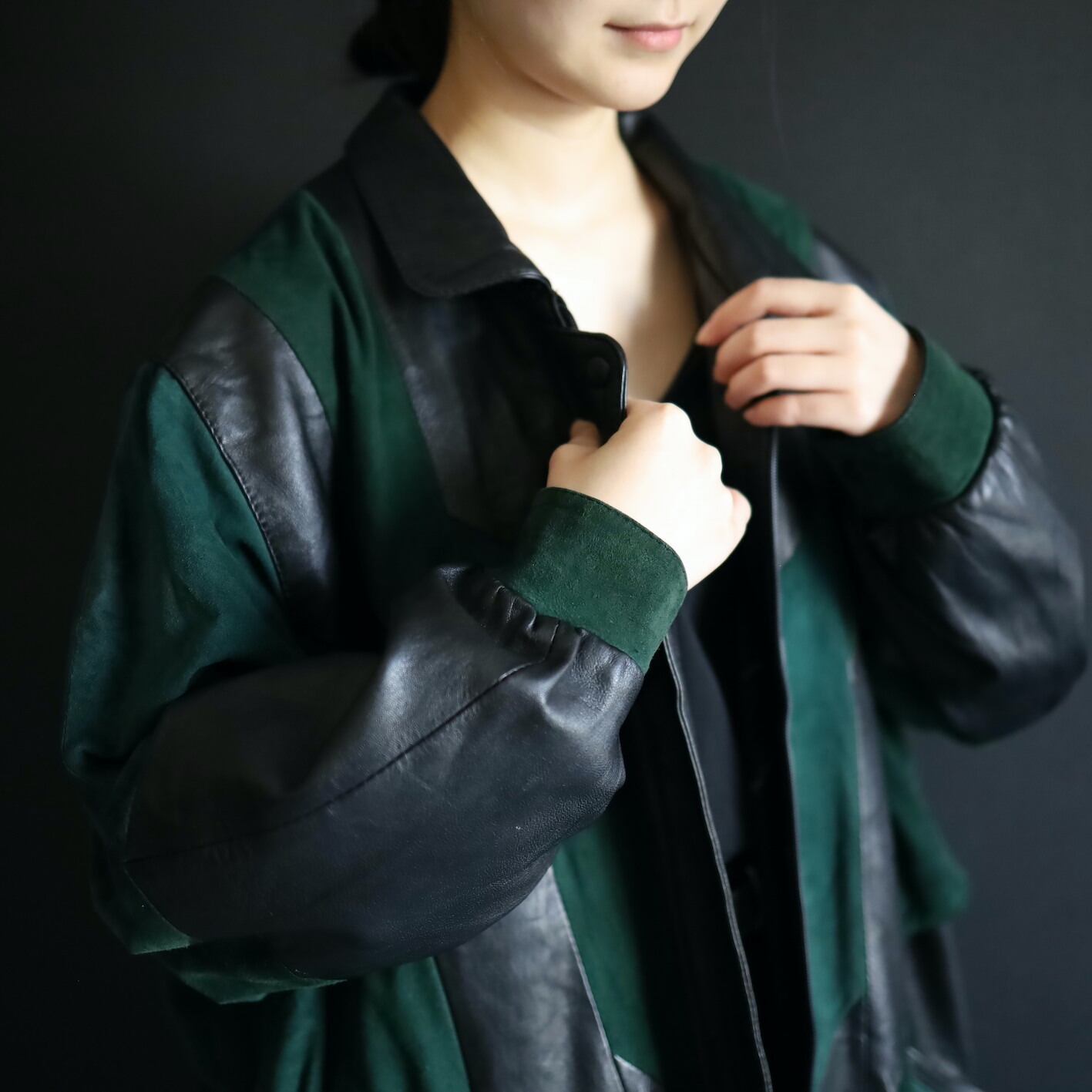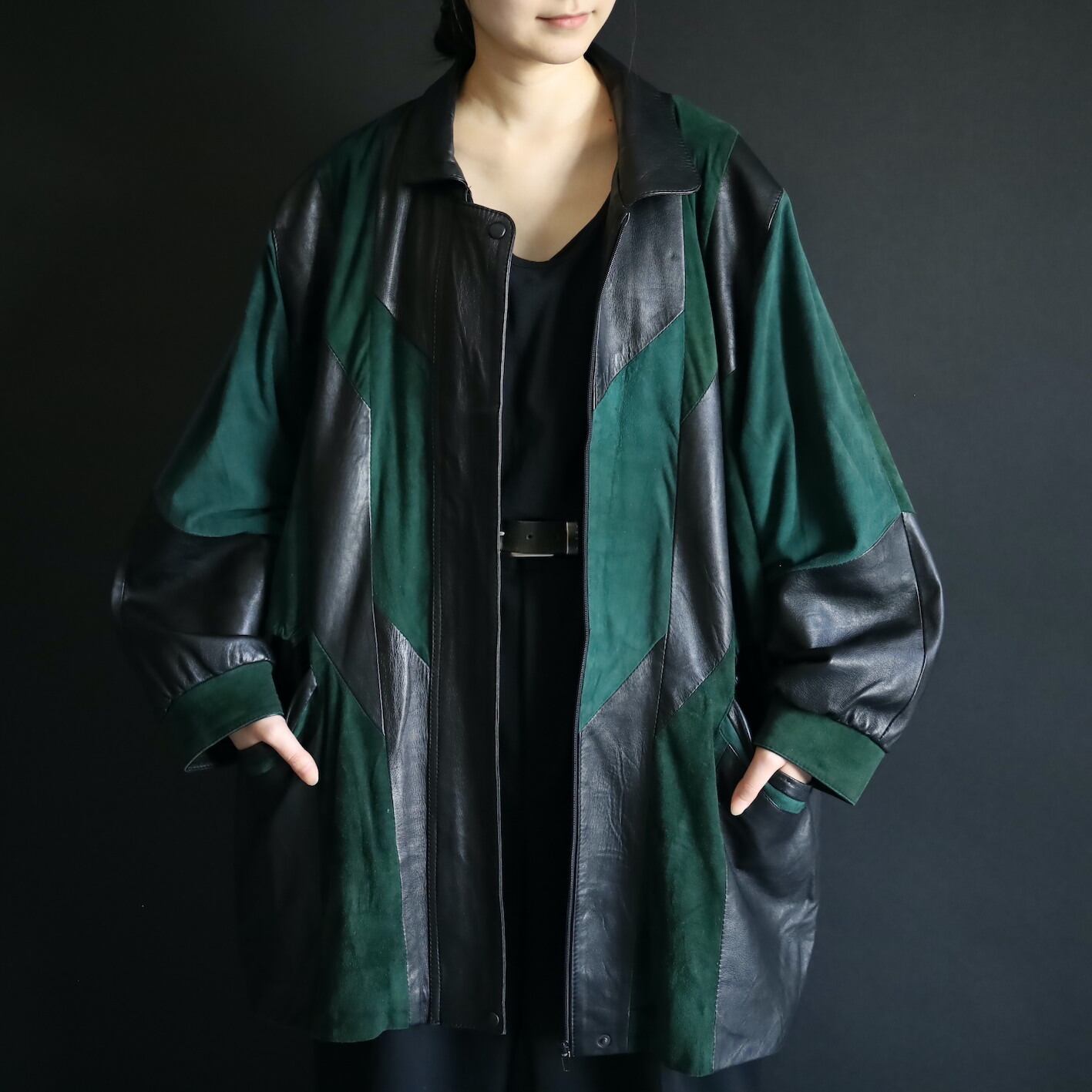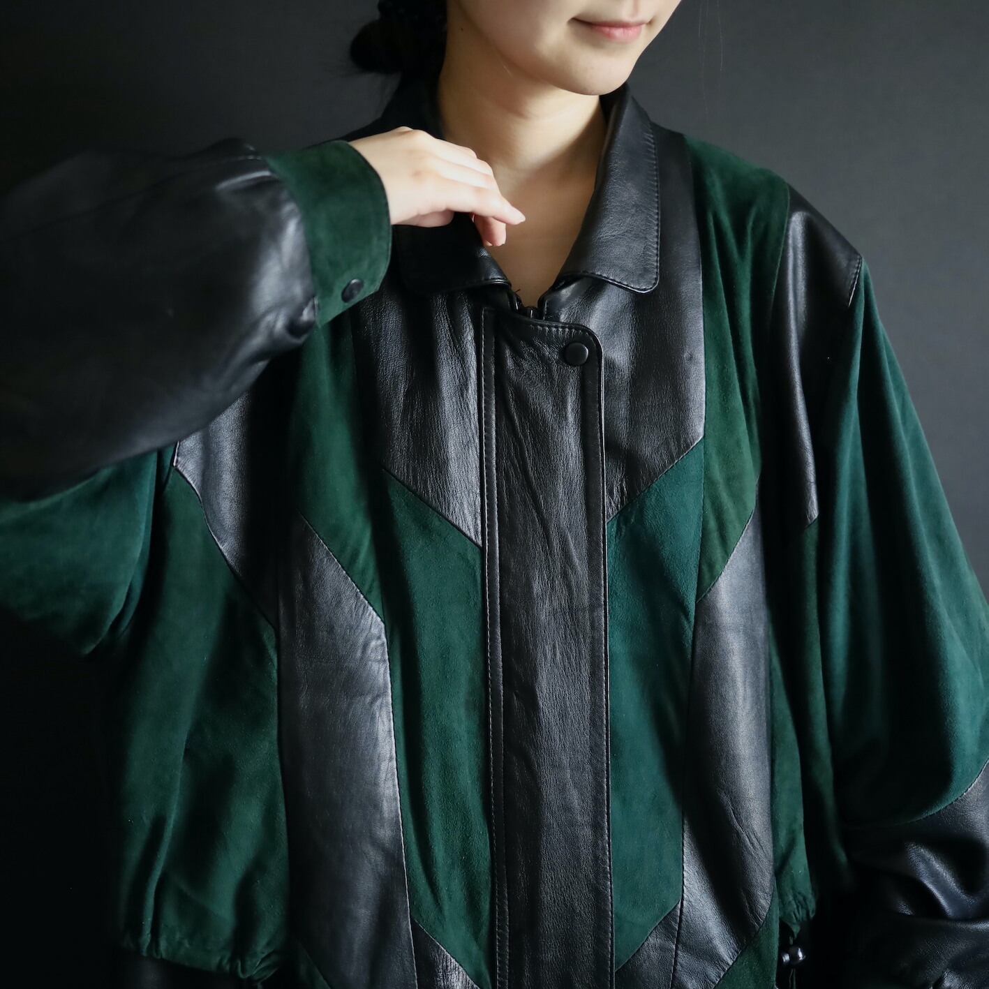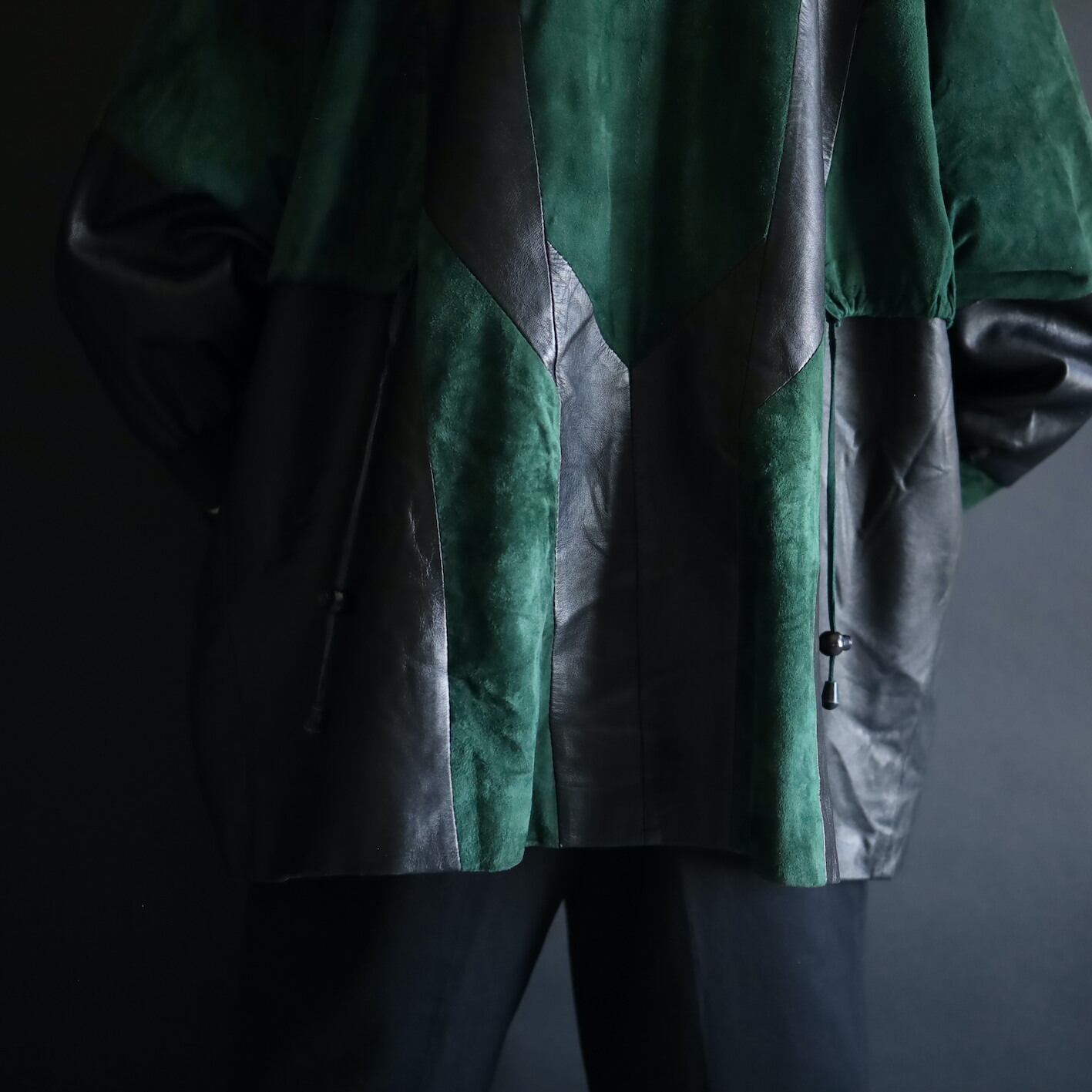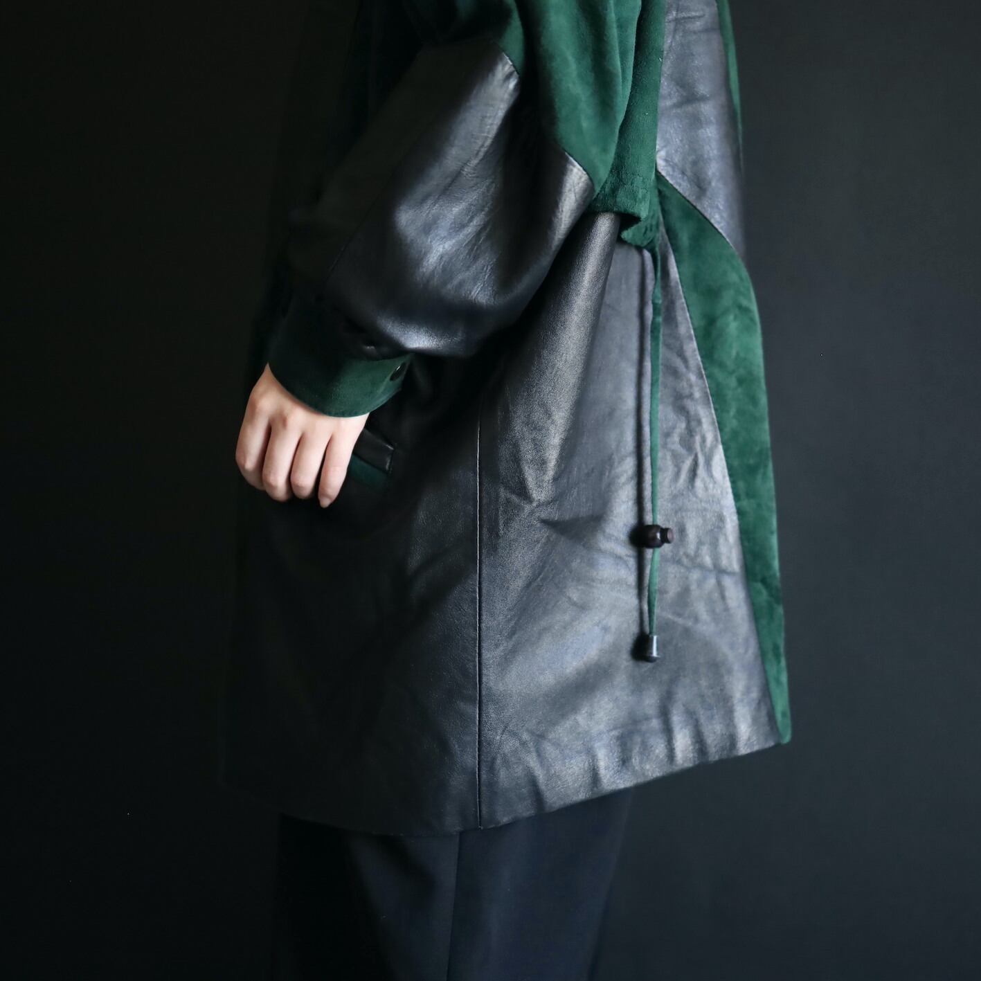 柔らかくコンディションのいいブラックレザーと,深みのあるグリーンのフェイクスエード切替ボディ.