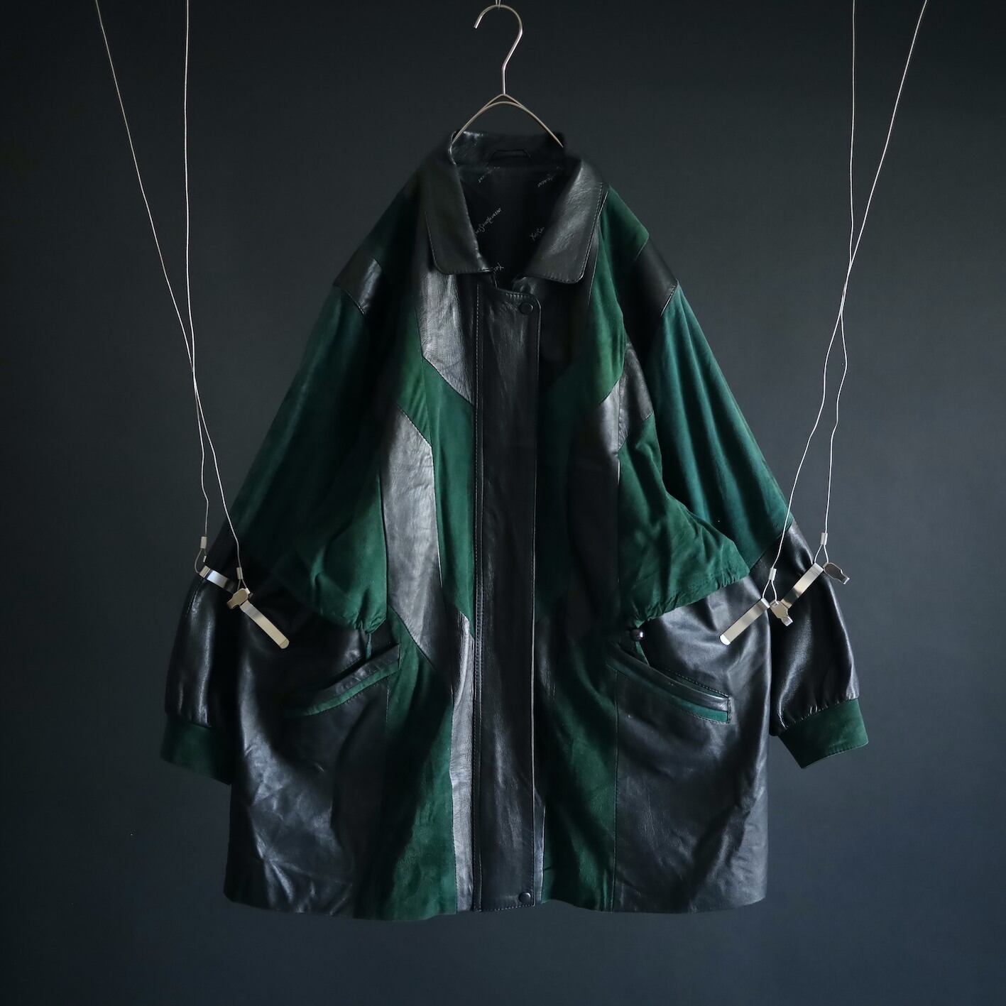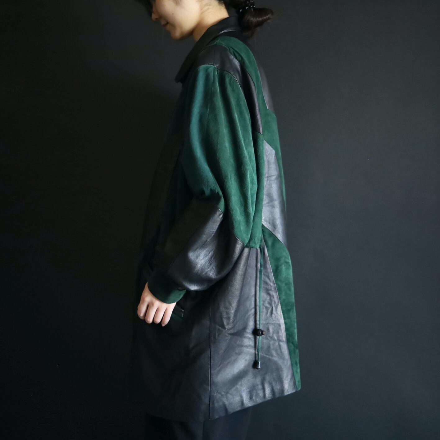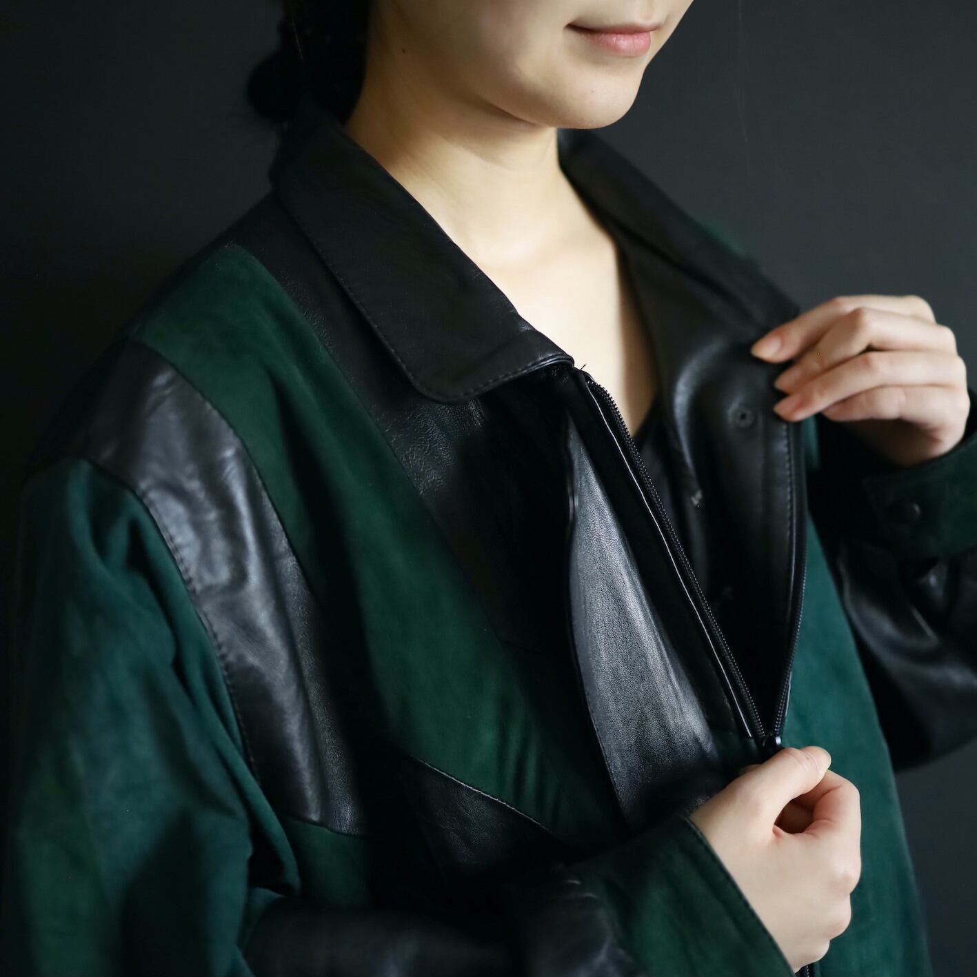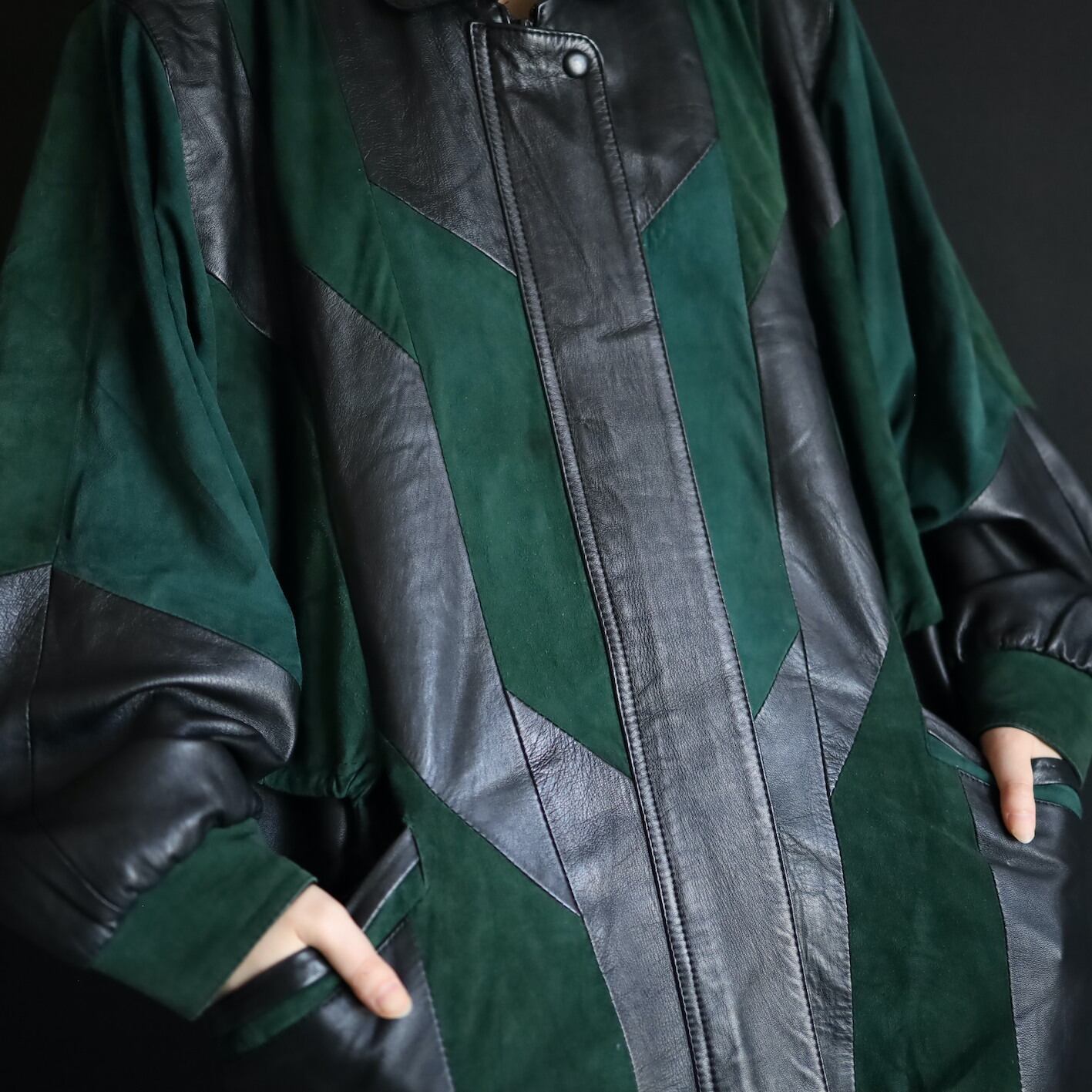 柔らかくコンディションのいいブラックレザーと,深みのあるグリーンのフェイクスエード切替ボディ.