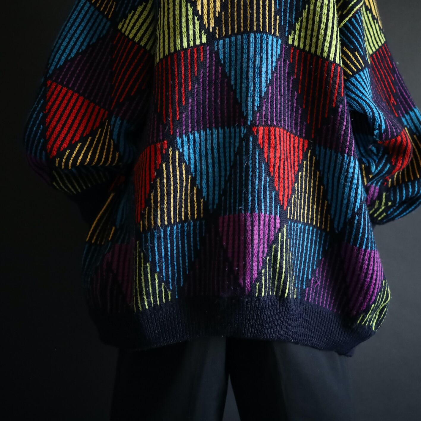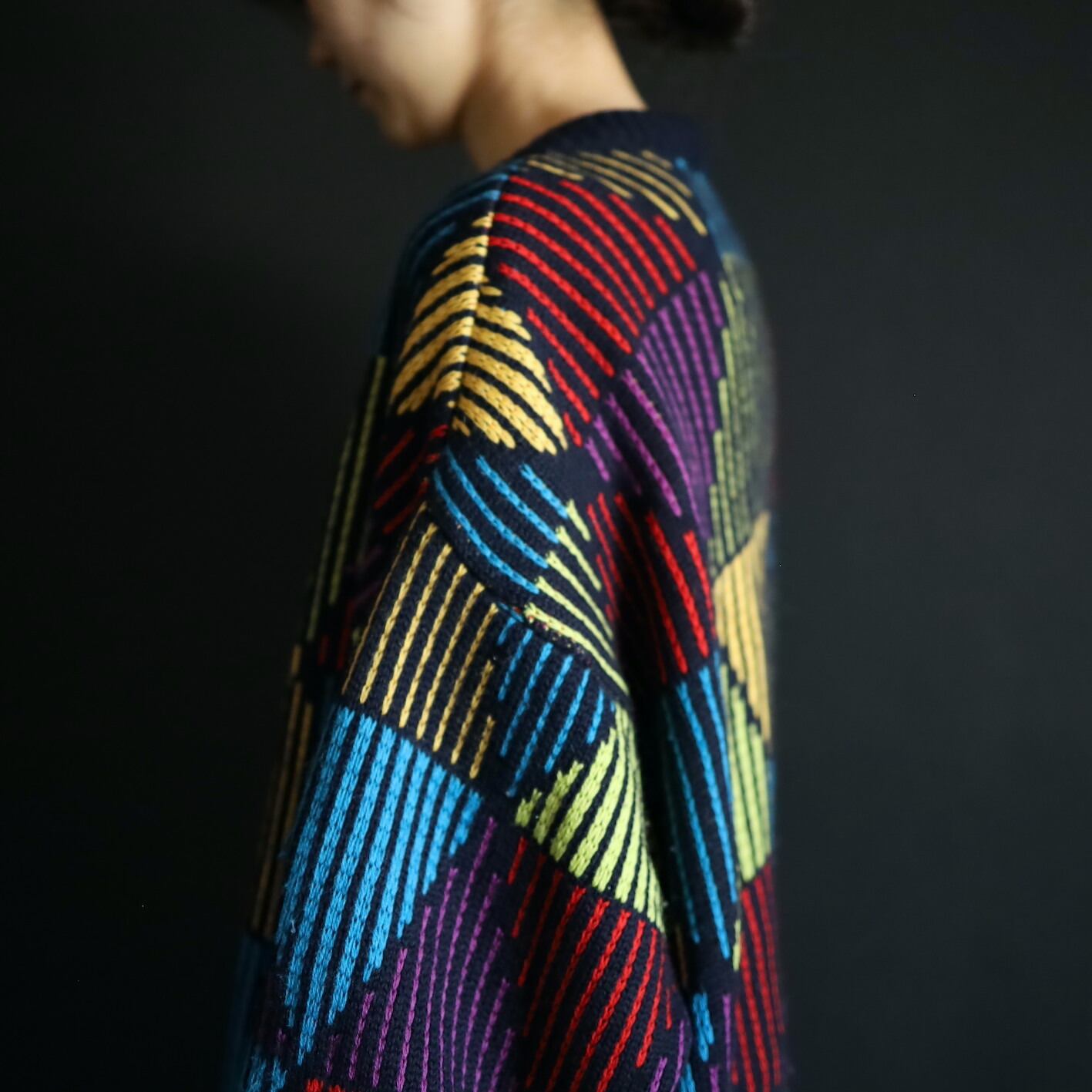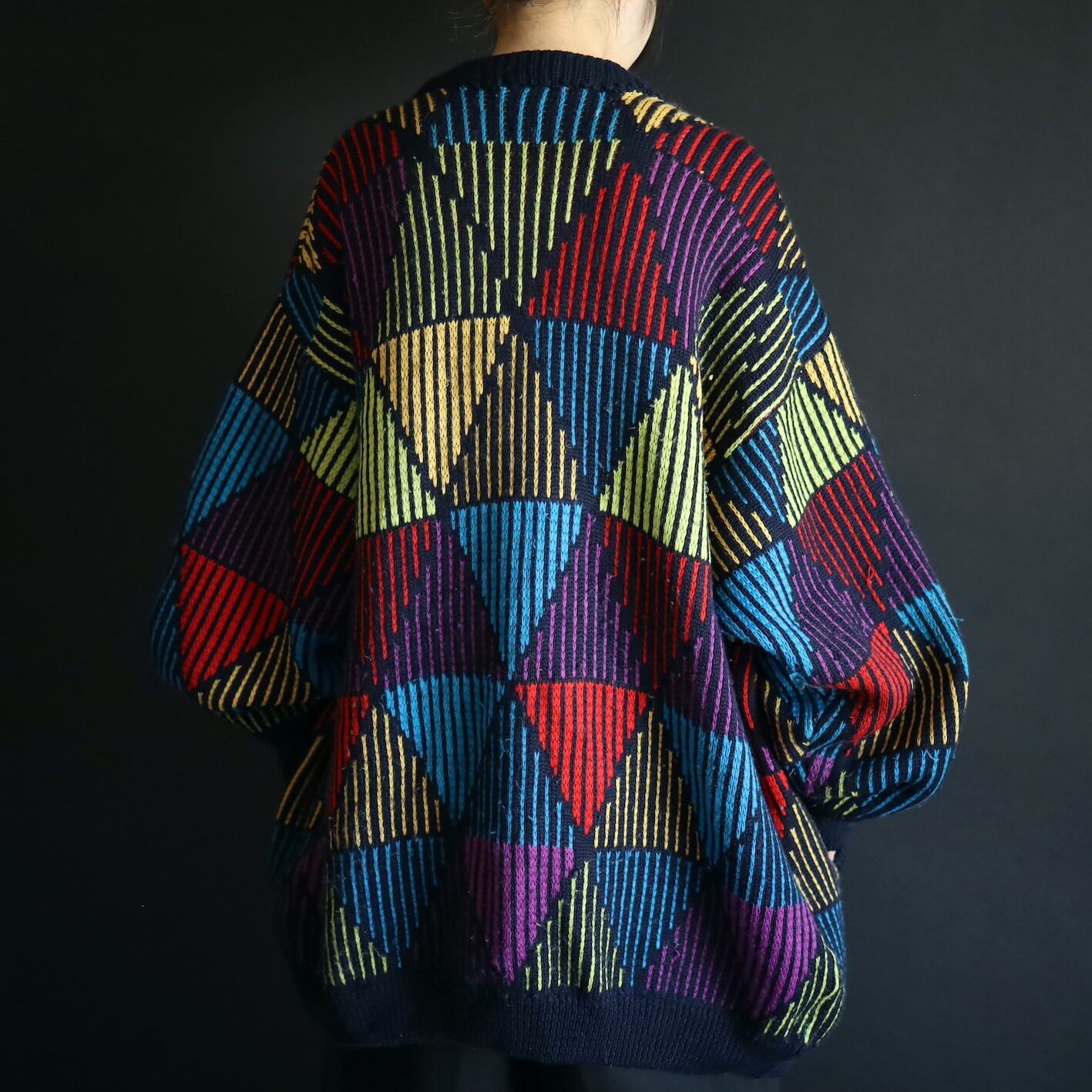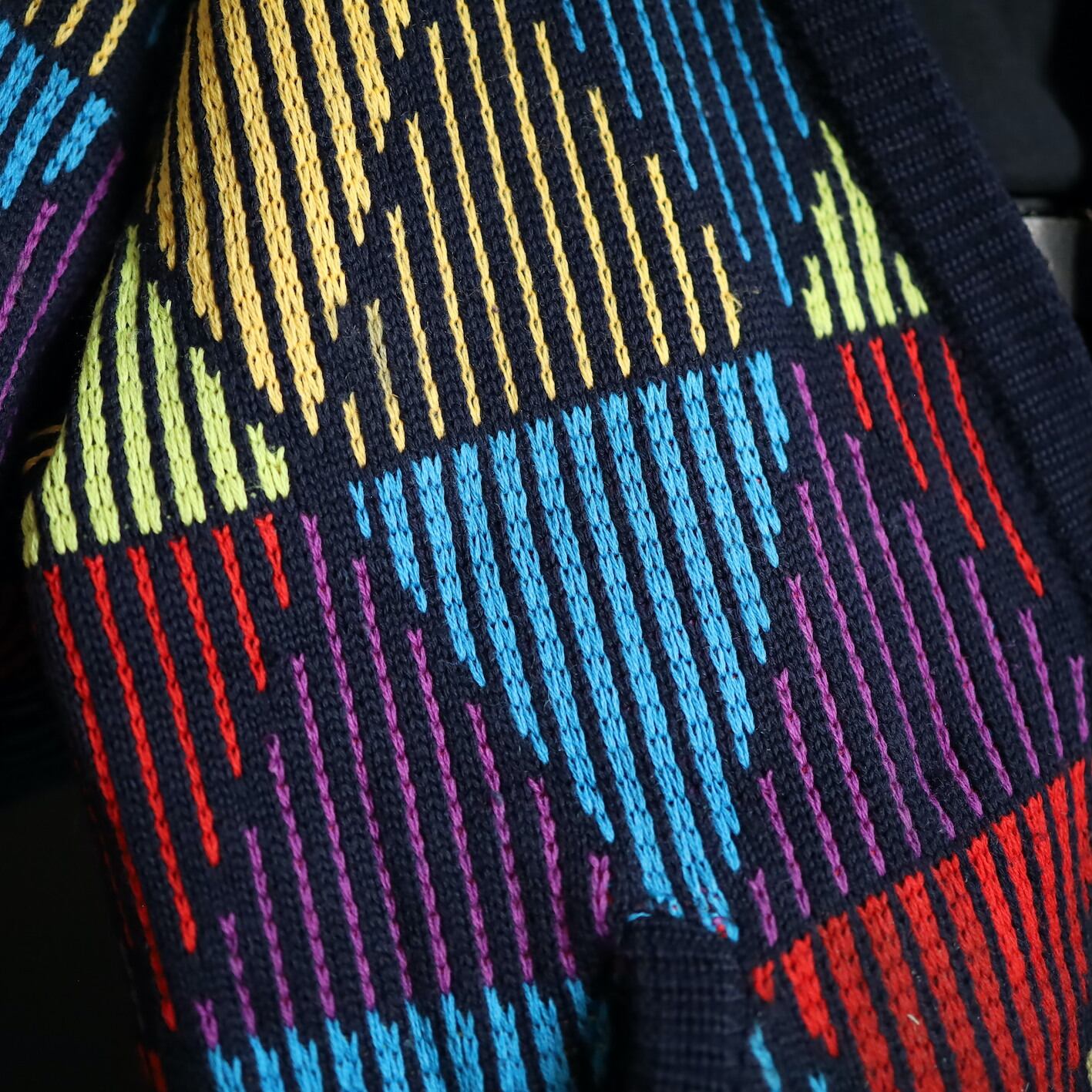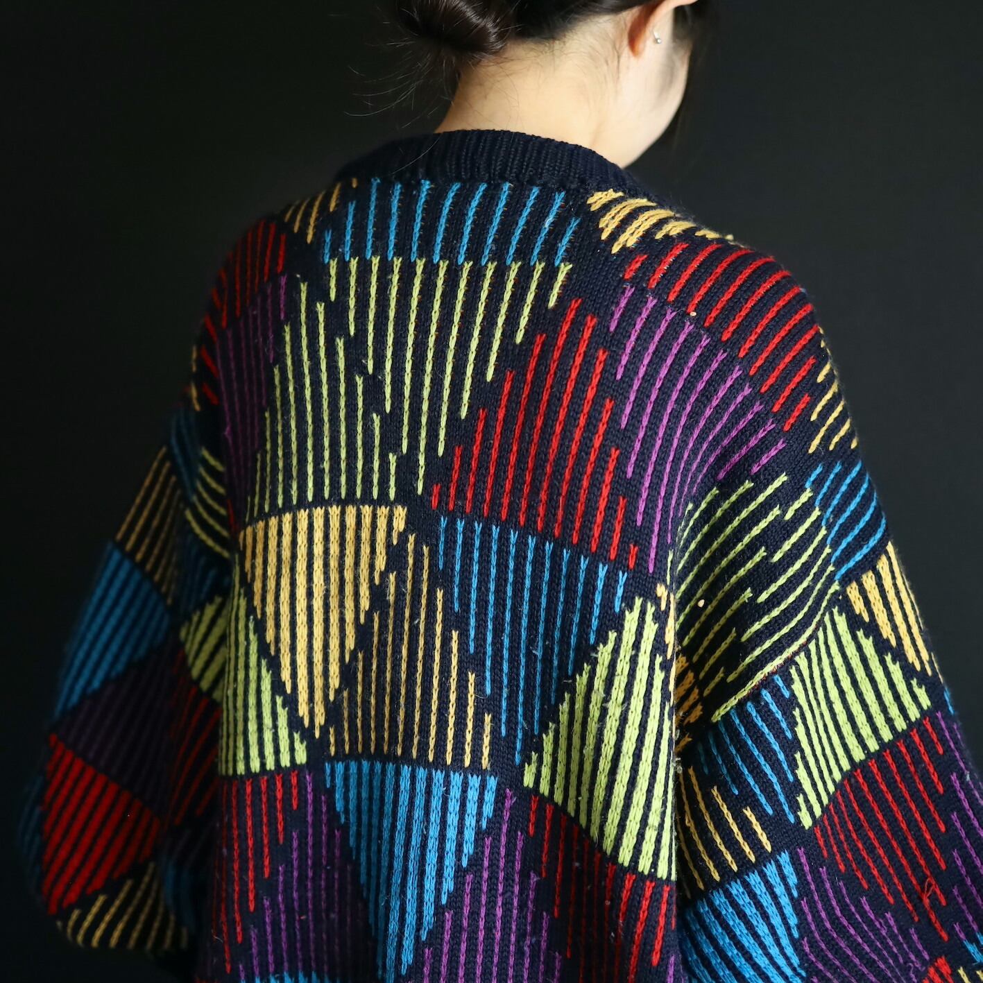 カラフルな配色を▽△状のパネル風に編み込んだ一枚.