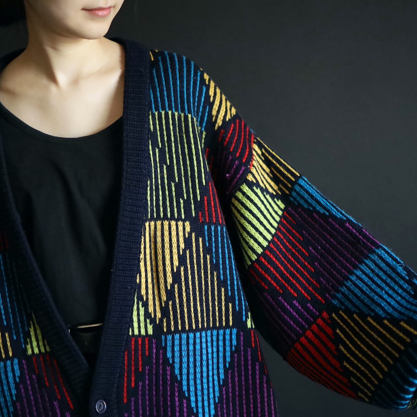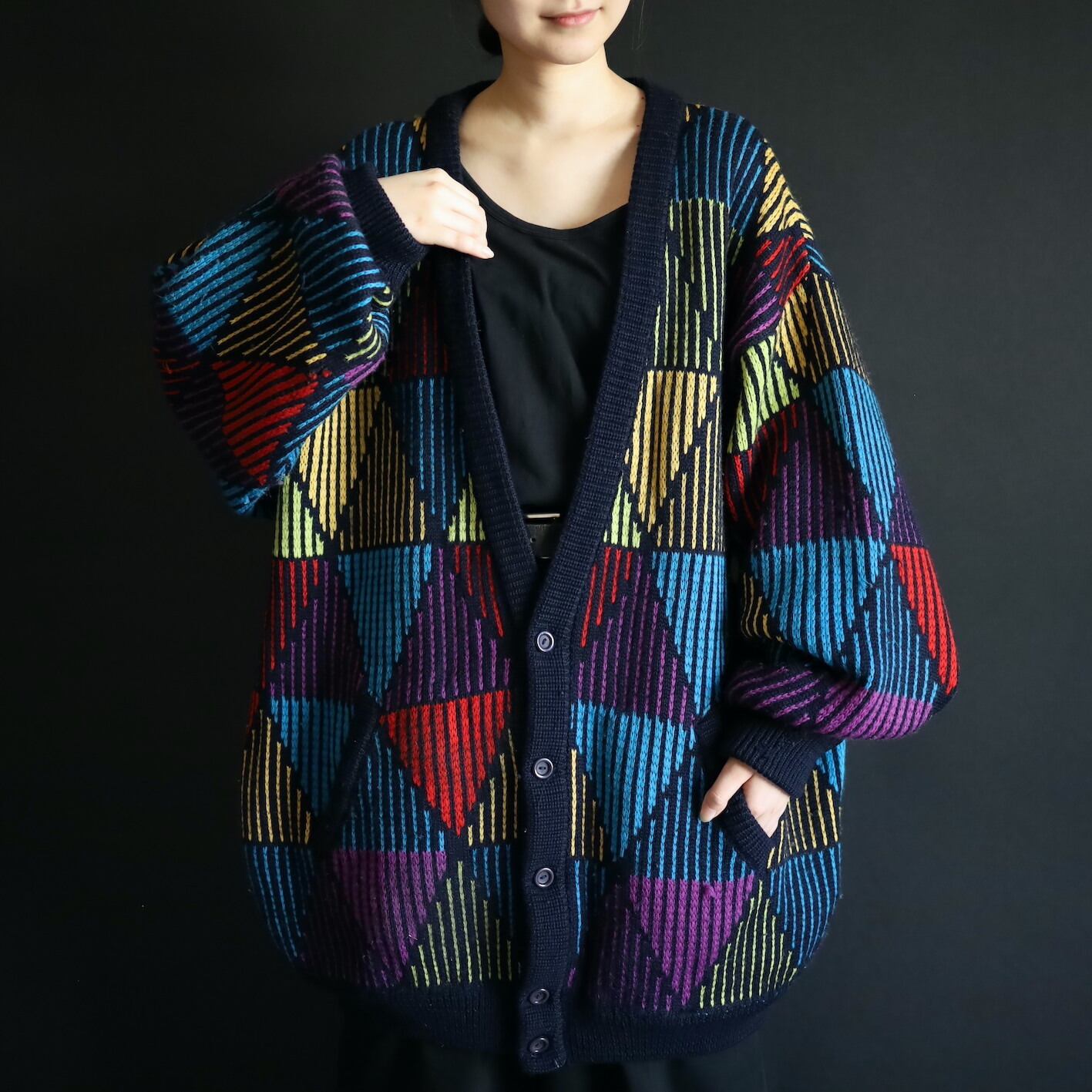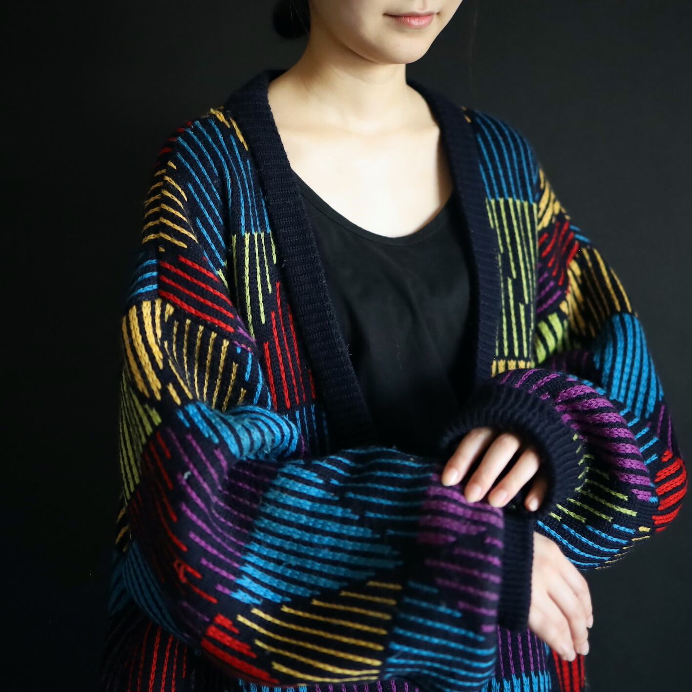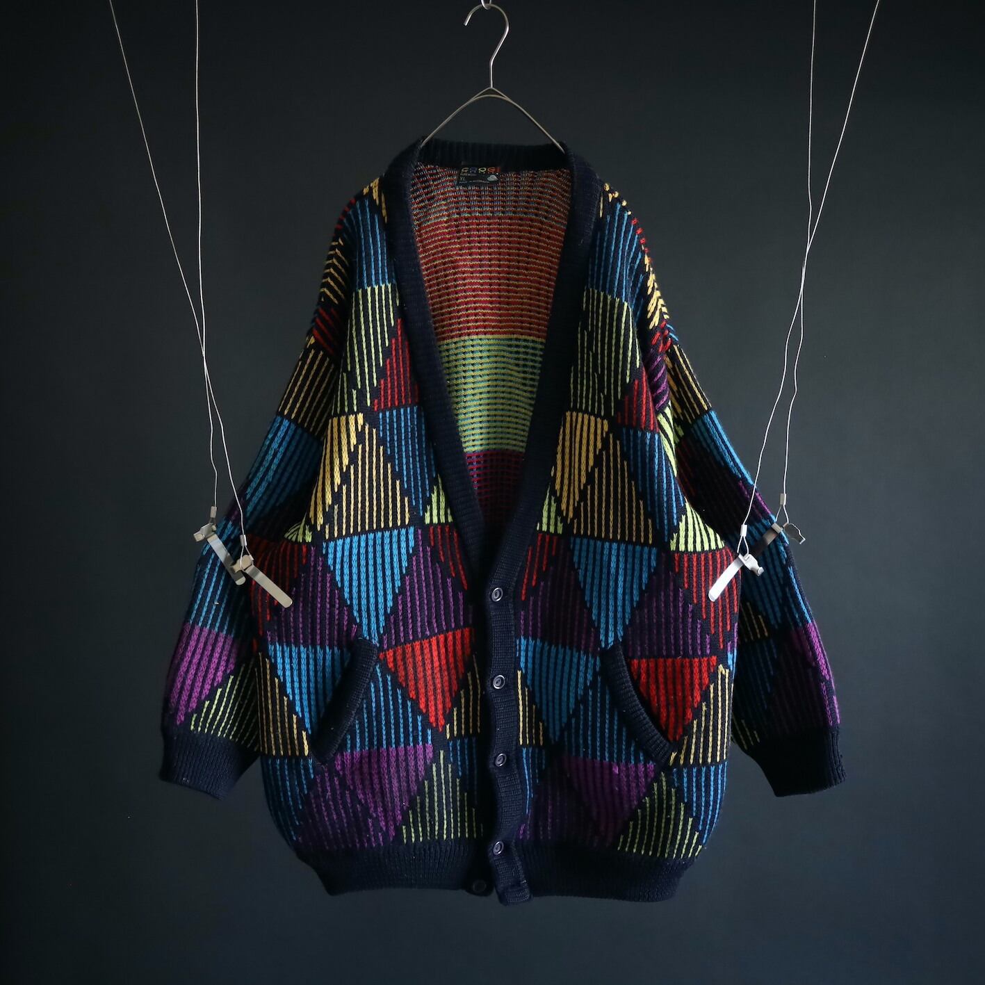 カラフルな配色を▽△状のパネル風に編み込んだ一枚.