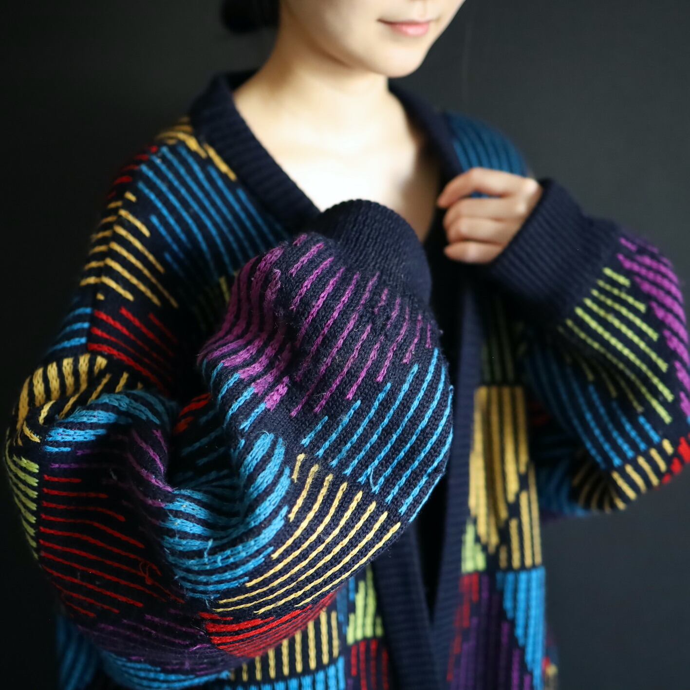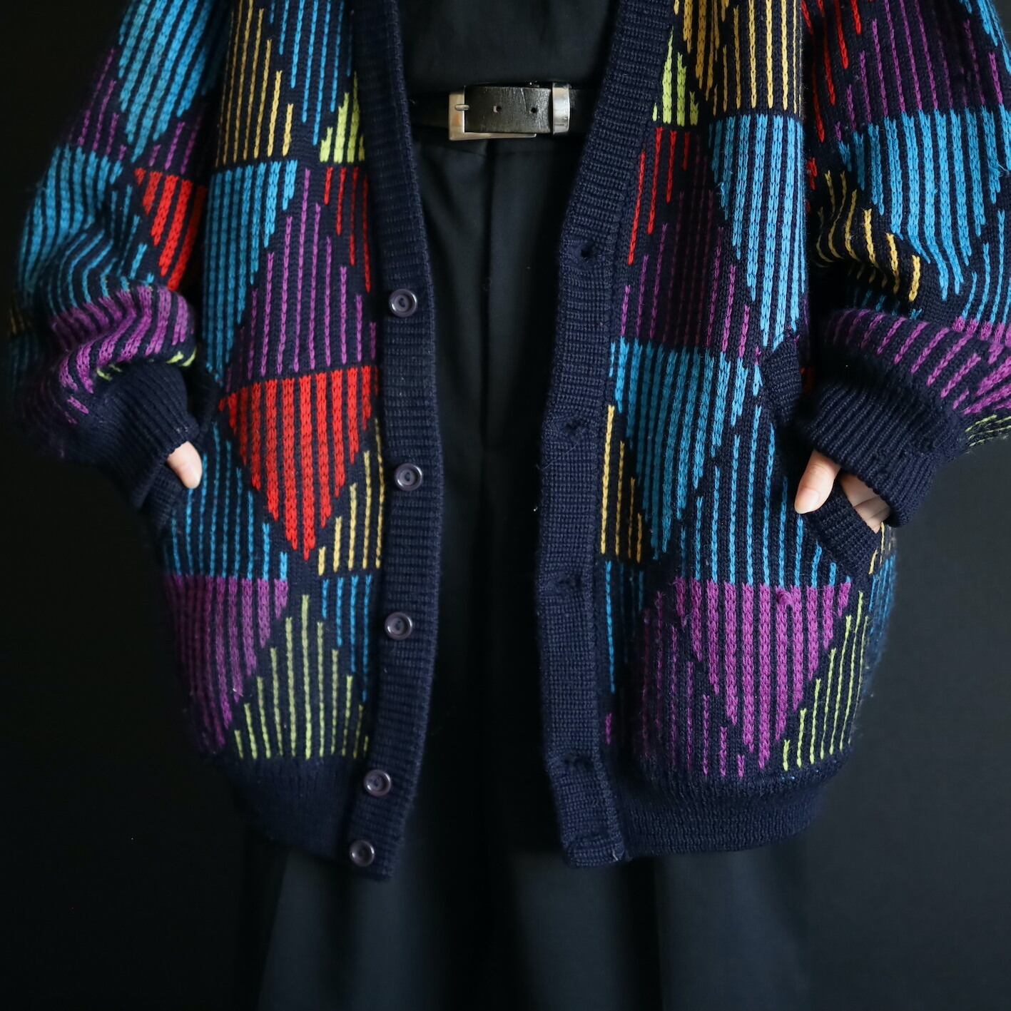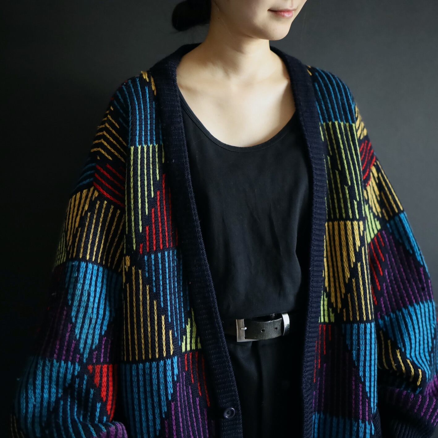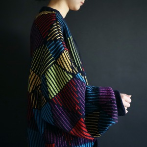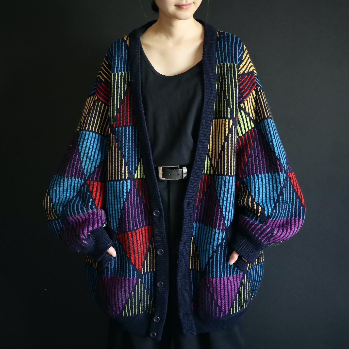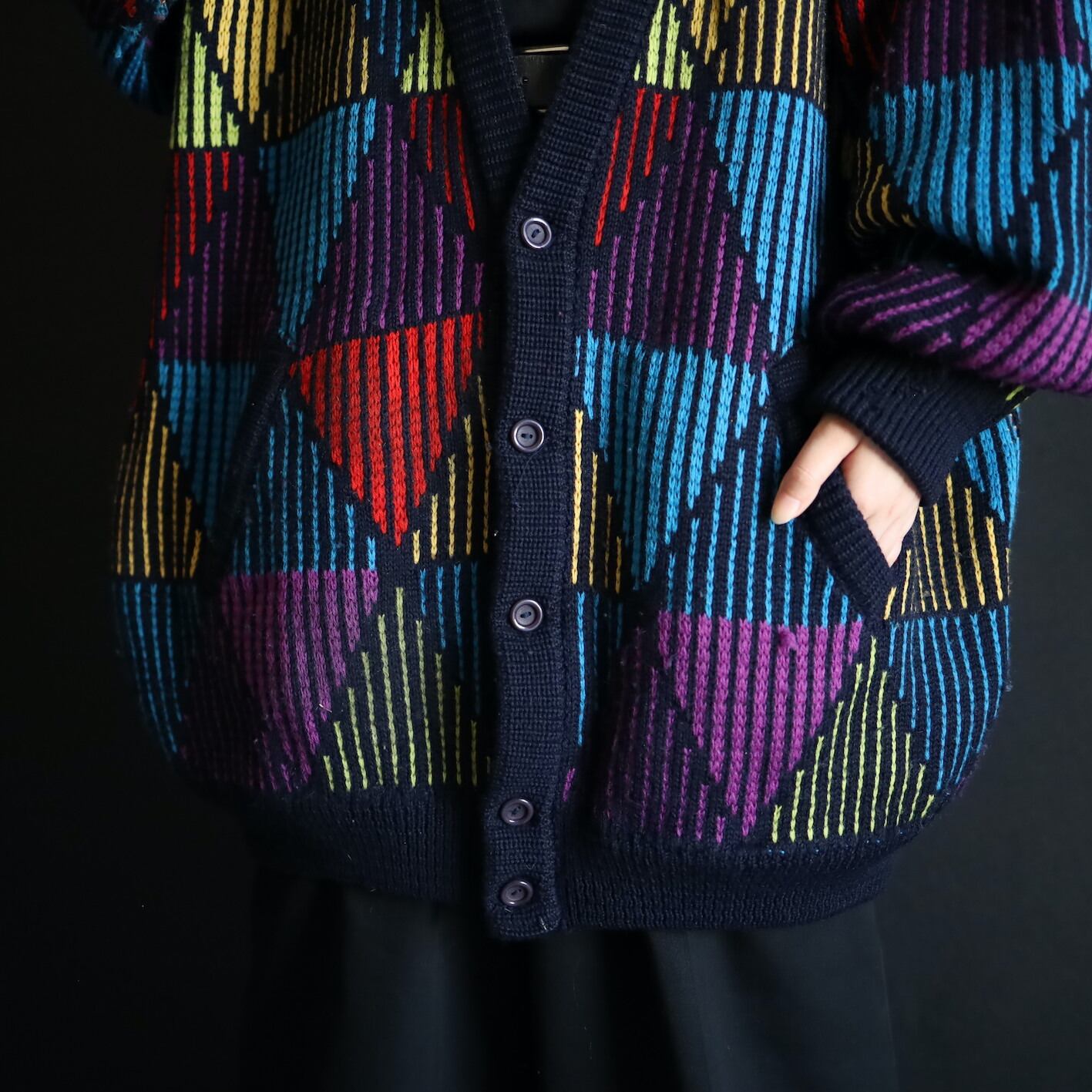 カラフルな配色を▽△状のパネル風に編み込んだ一枚.