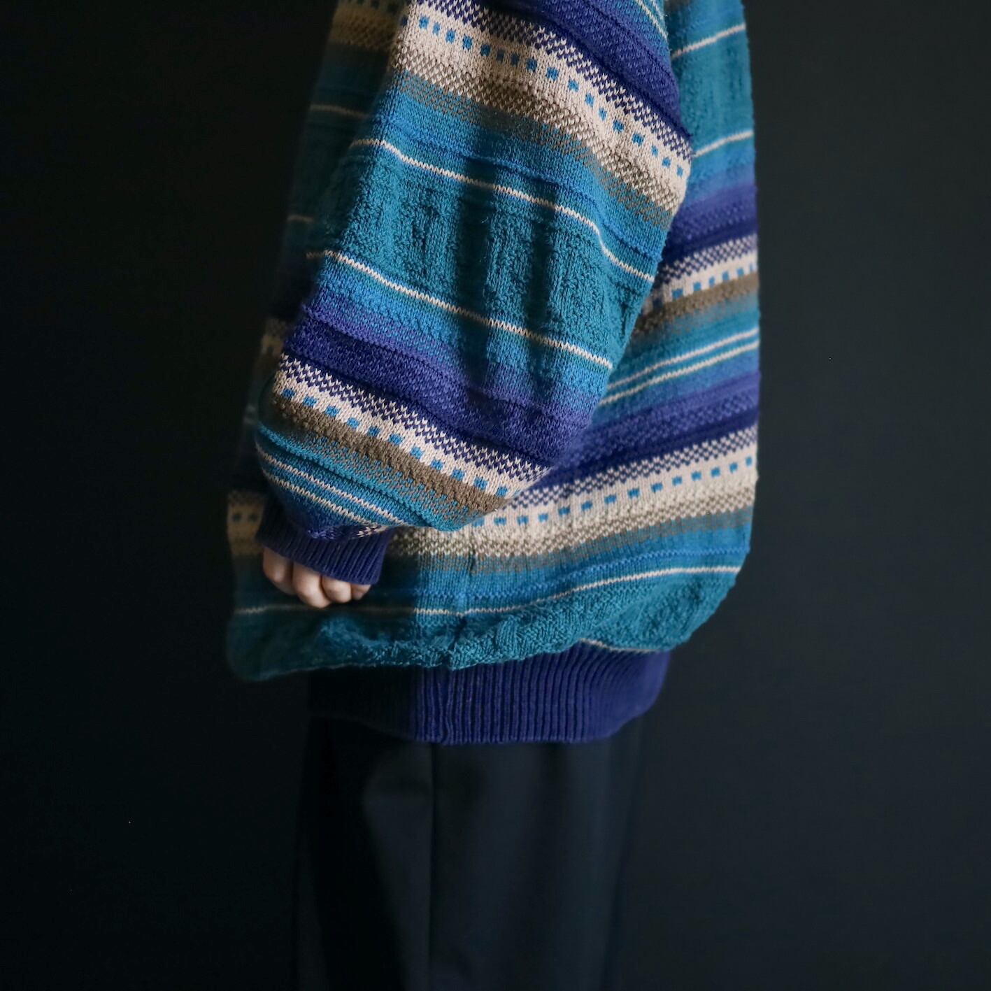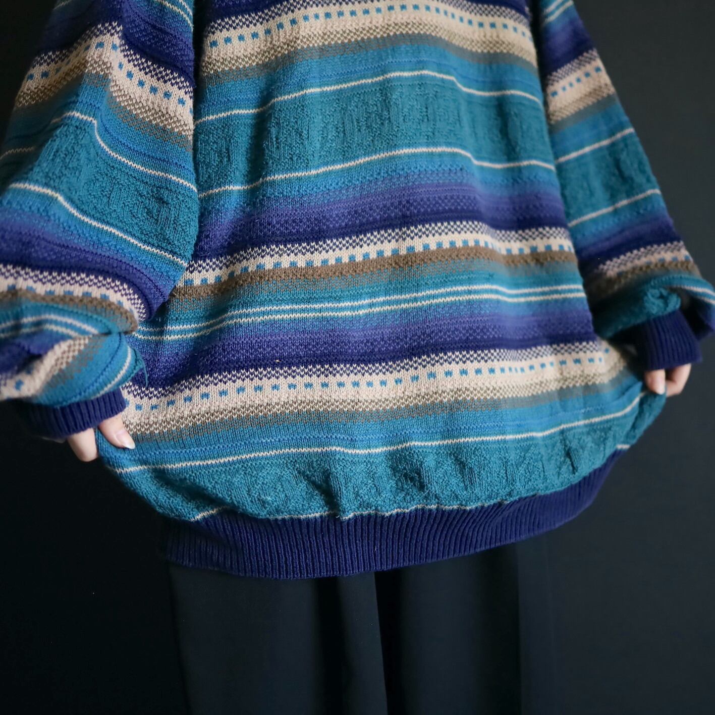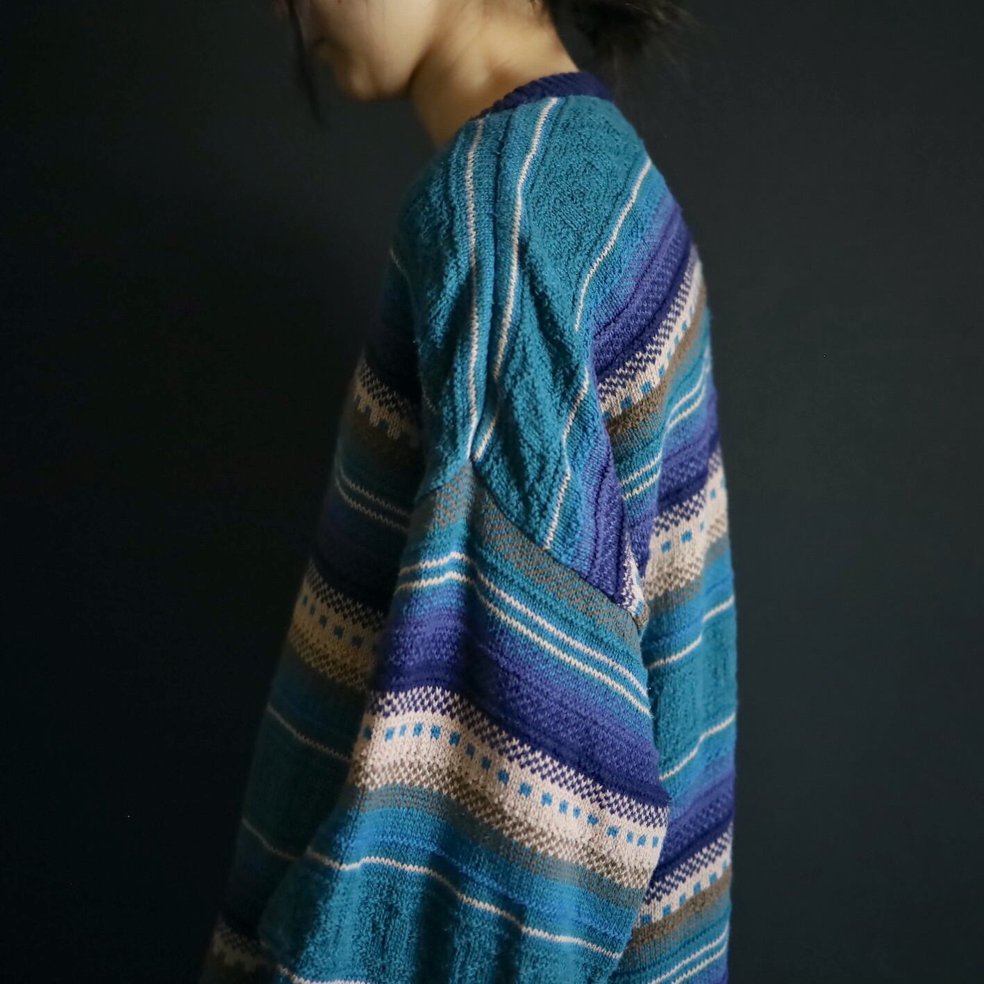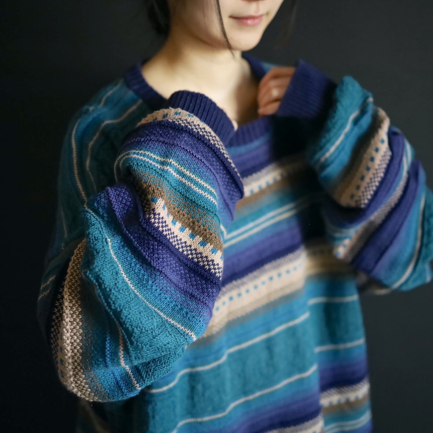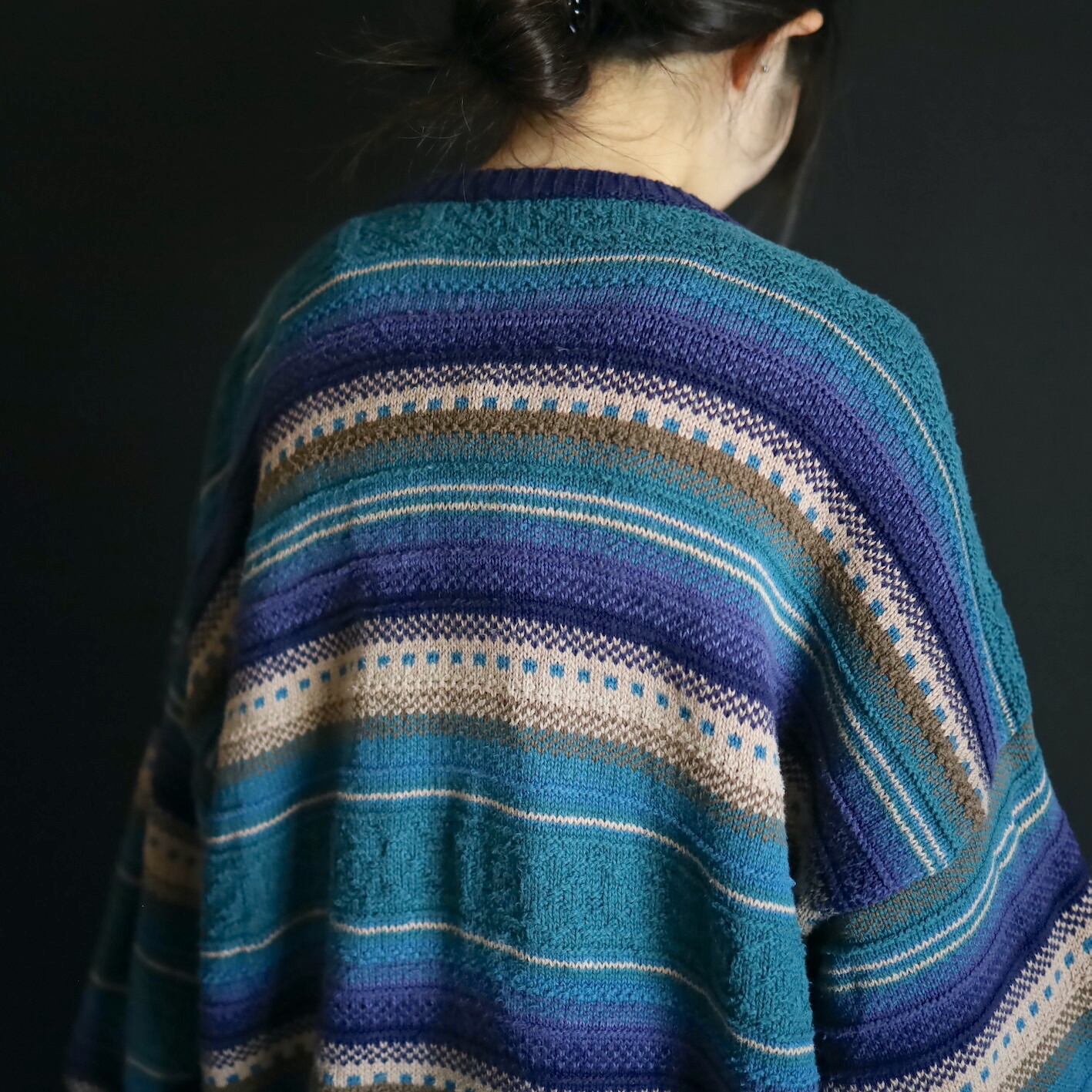 ターコイズにブルーやネイビー,さらにベージュにブラウン,加えてパープルなどのグラデーション風ボーダー柄.