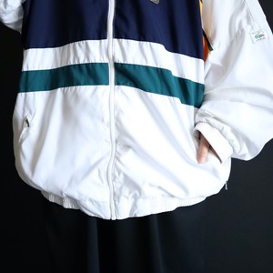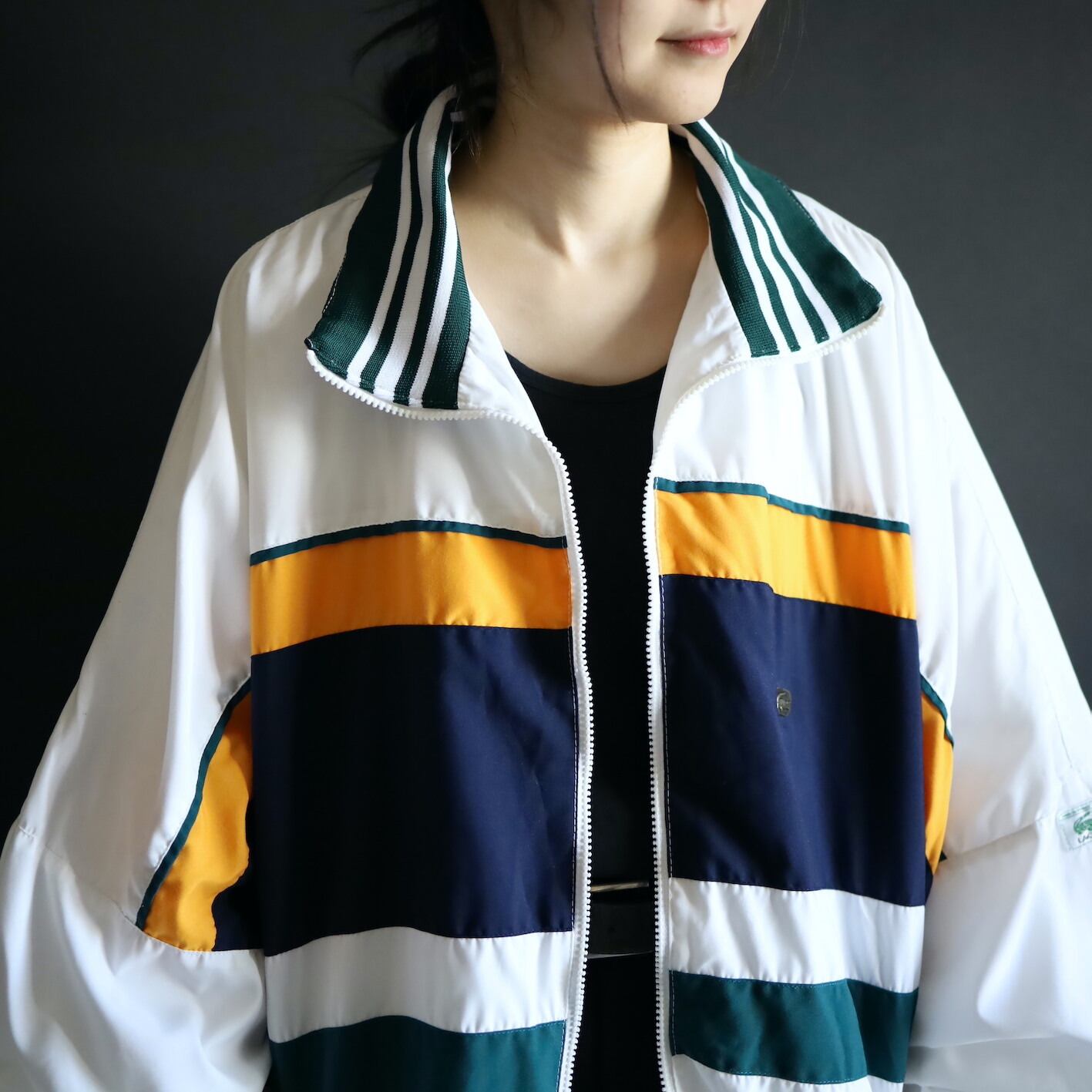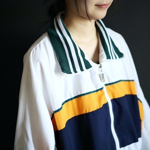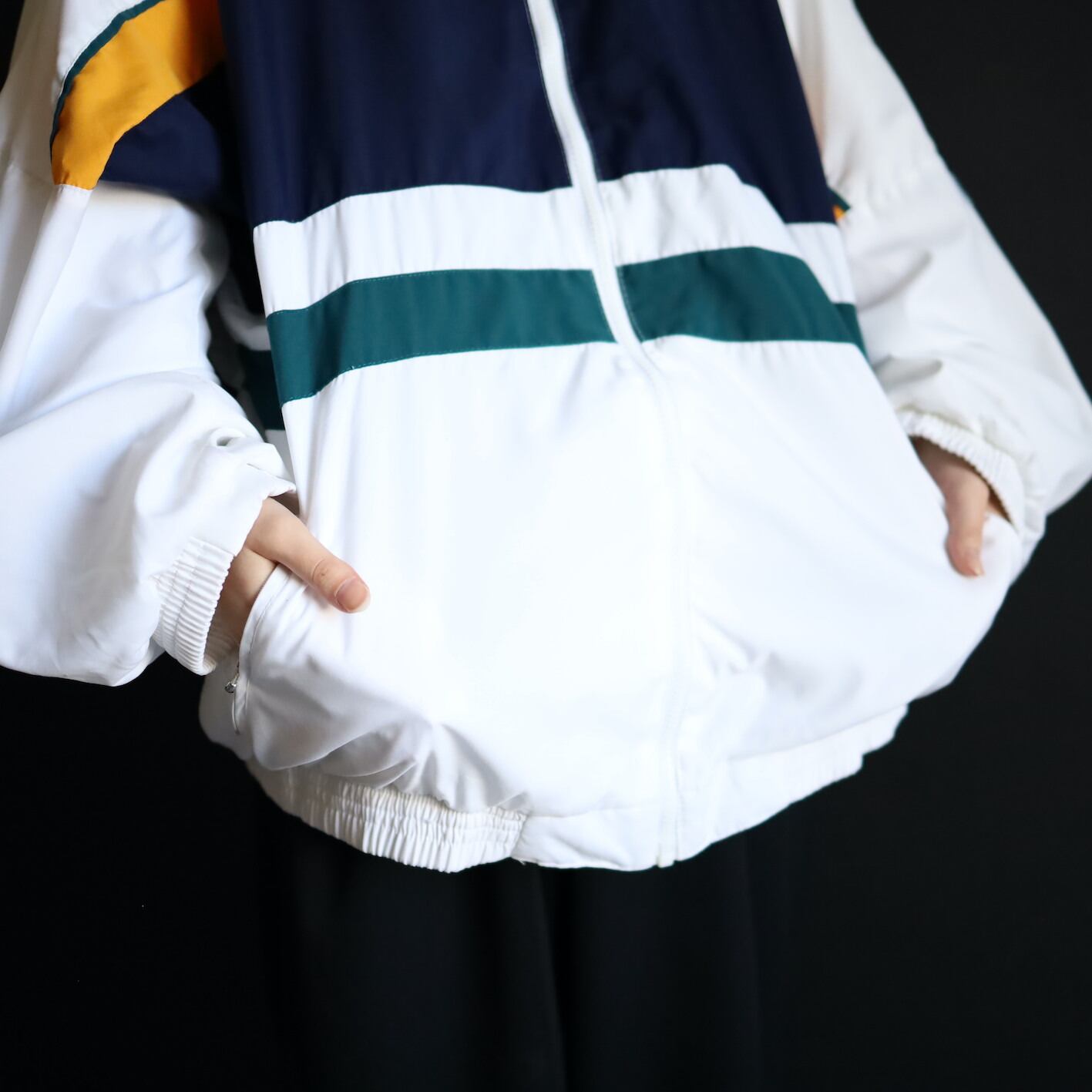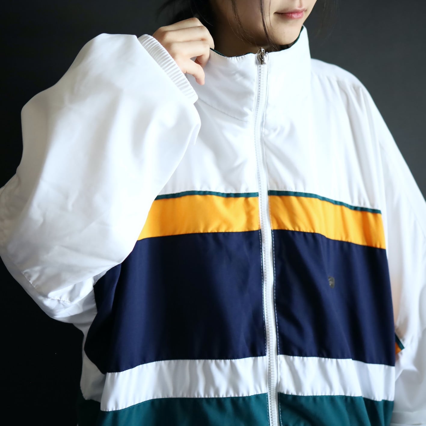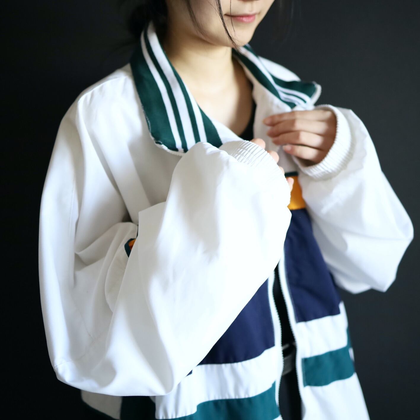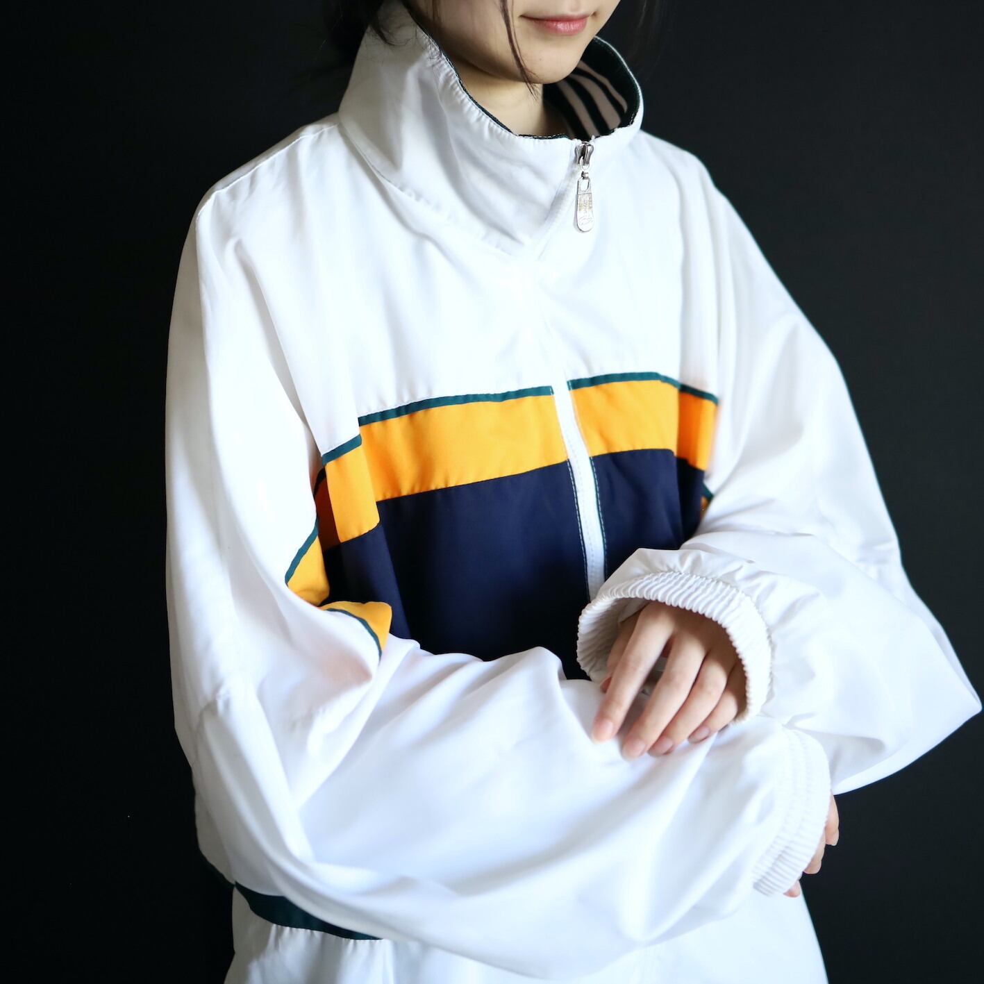 ホワイトカラーをベースとしたボディに,フロントはイエロー,ネイビー,グリーン切替,バックは上部がホワイト,下部がネイビーにスイッチ.