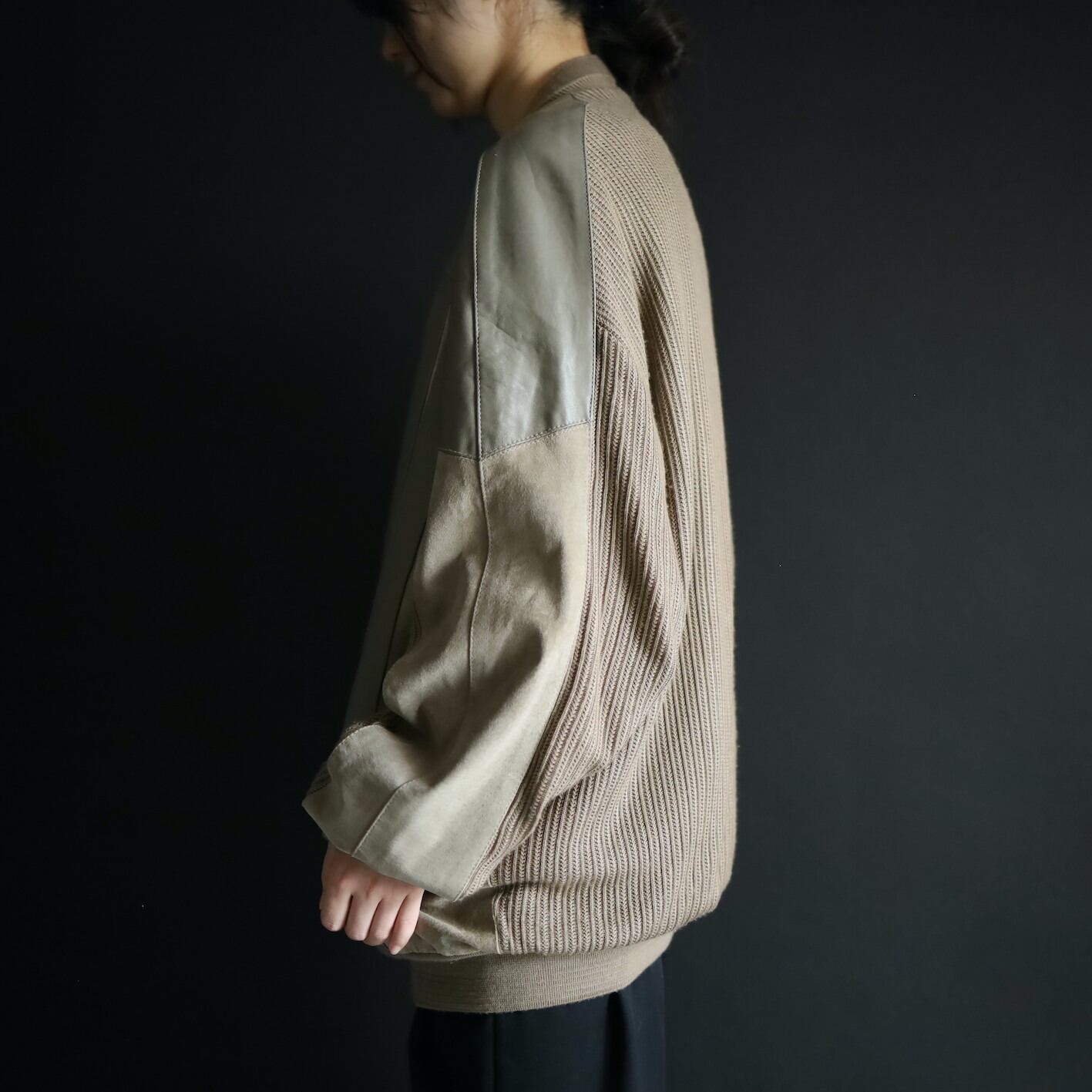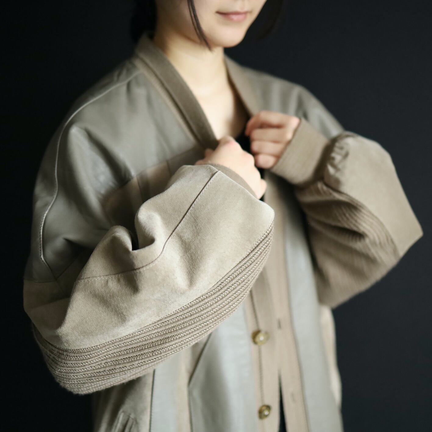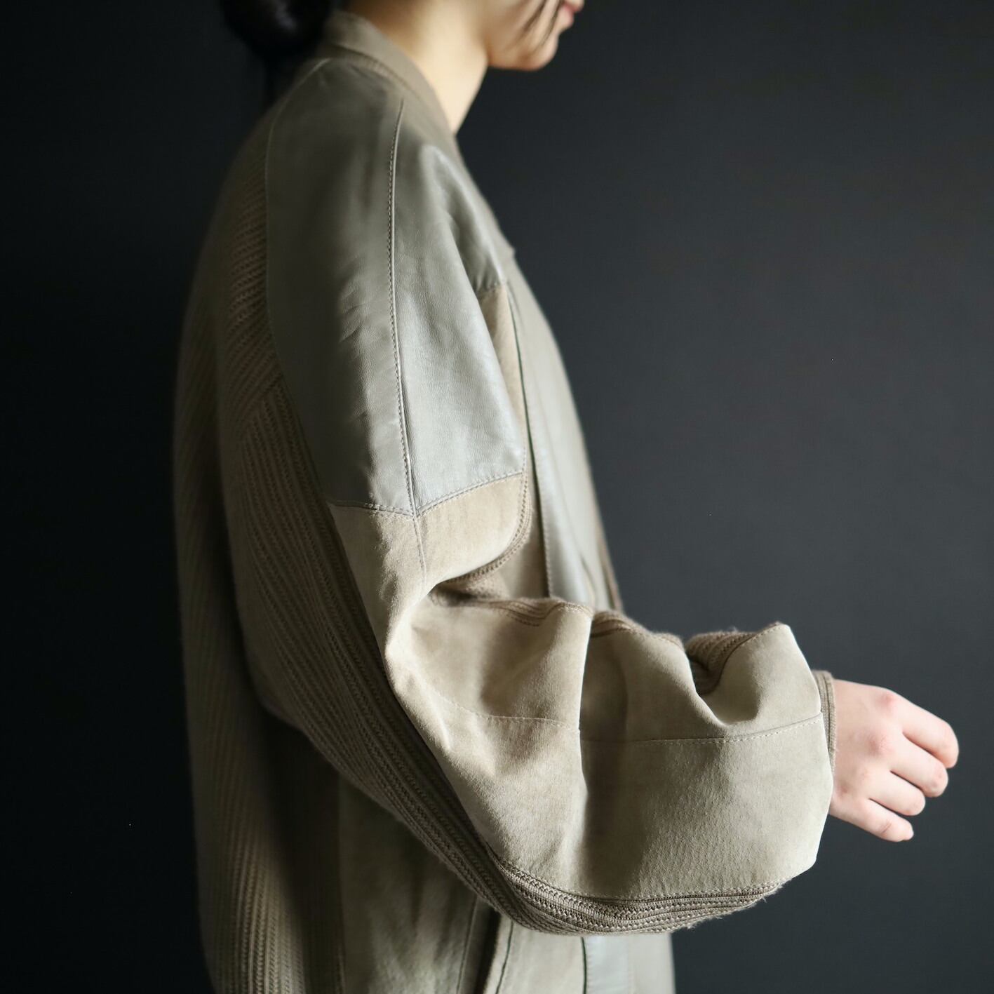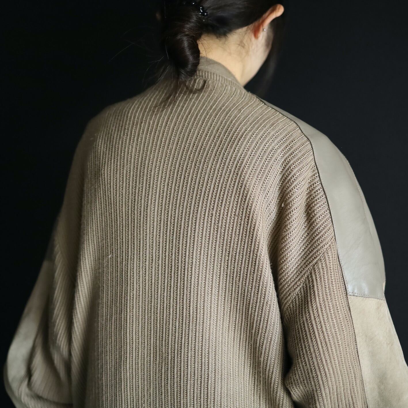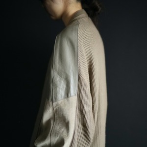 グレージュのレザーとスウェード,そしてベージュのニット切替で細かく表情の変わる一枚.