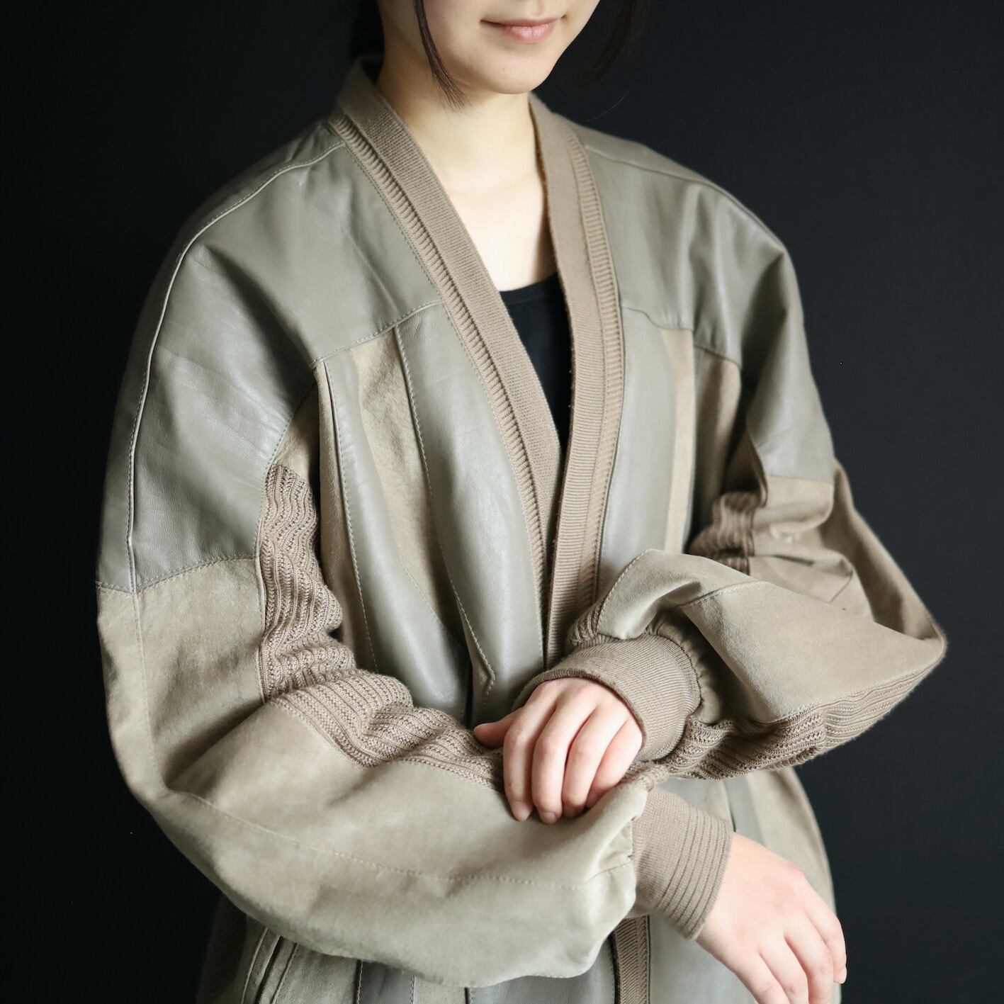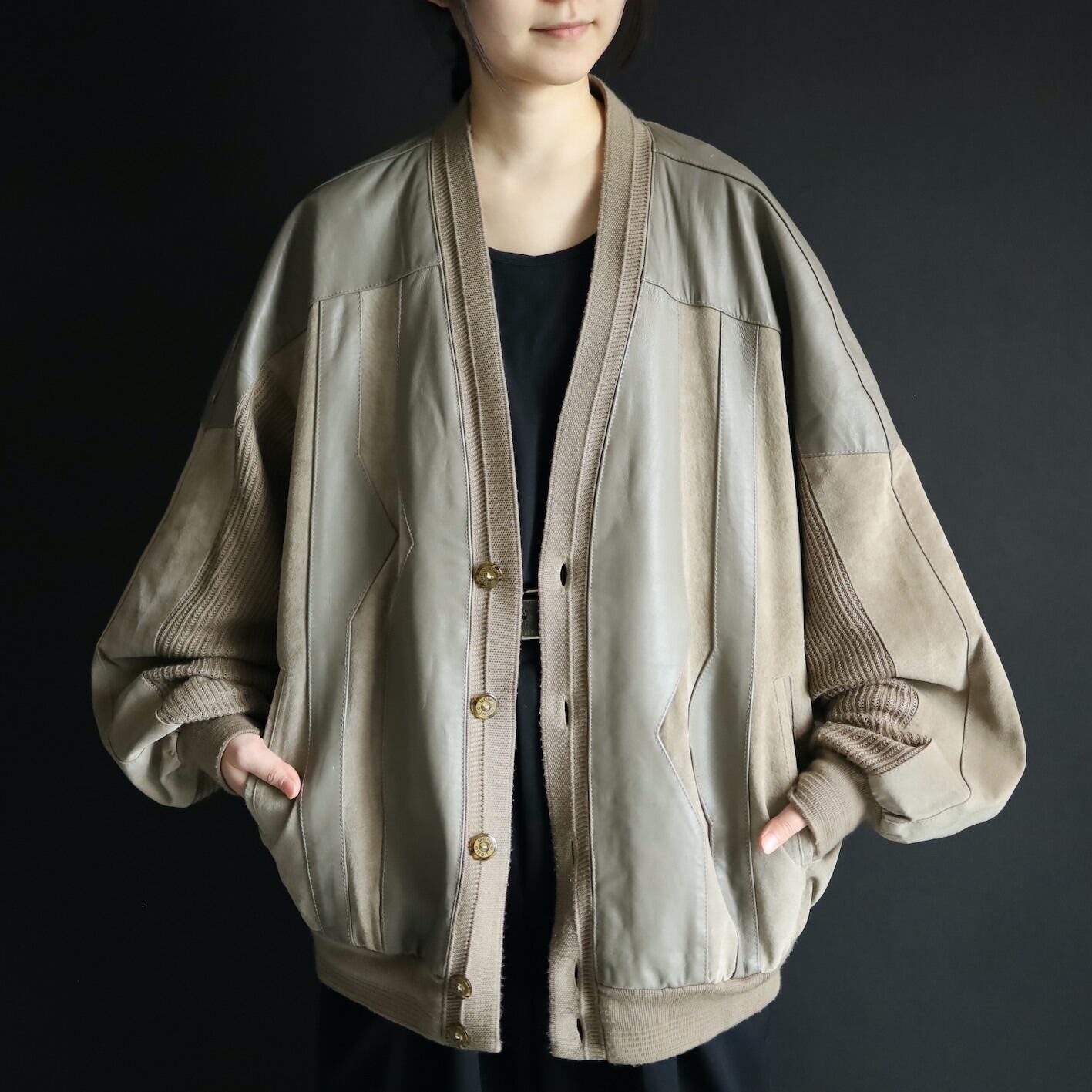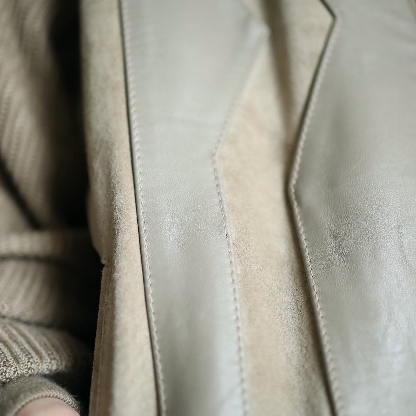 グレージュのレザーとスウェード,そしてベージュのニット切替で細かく表情の変わる一枚.