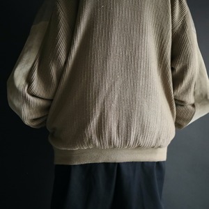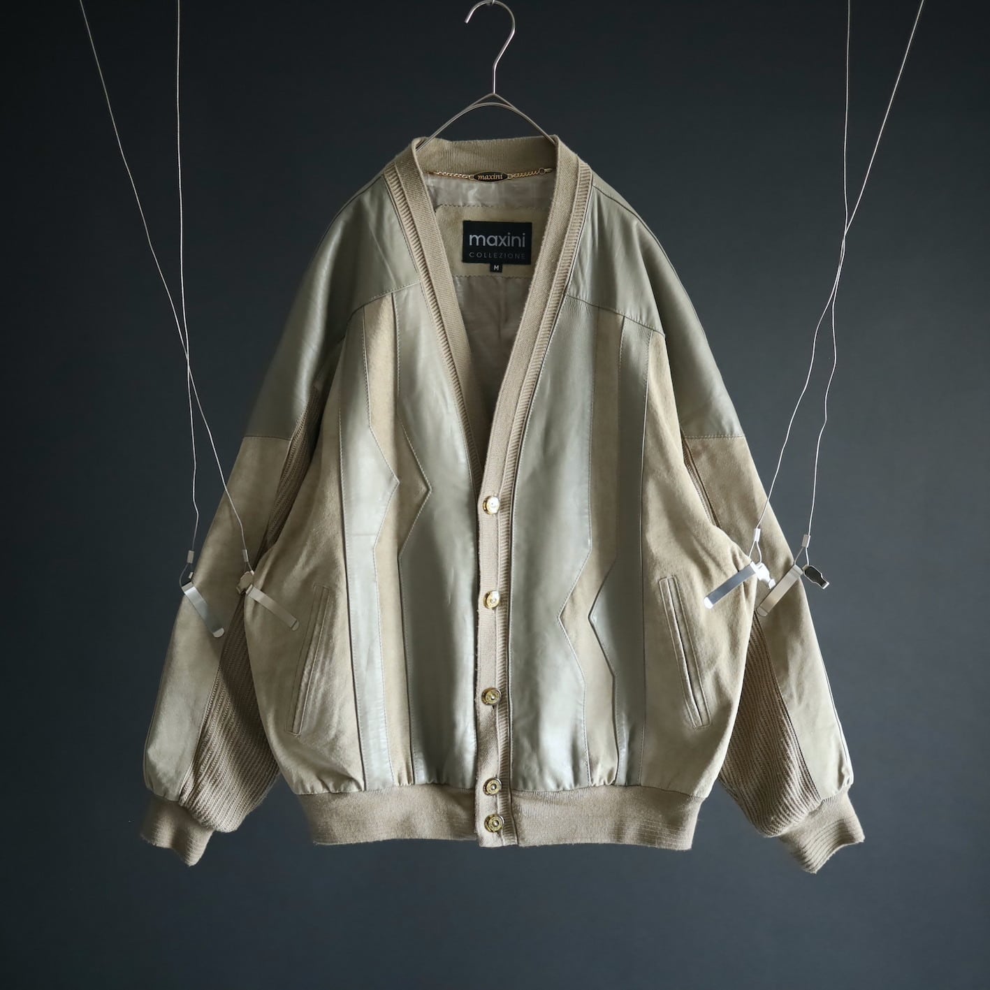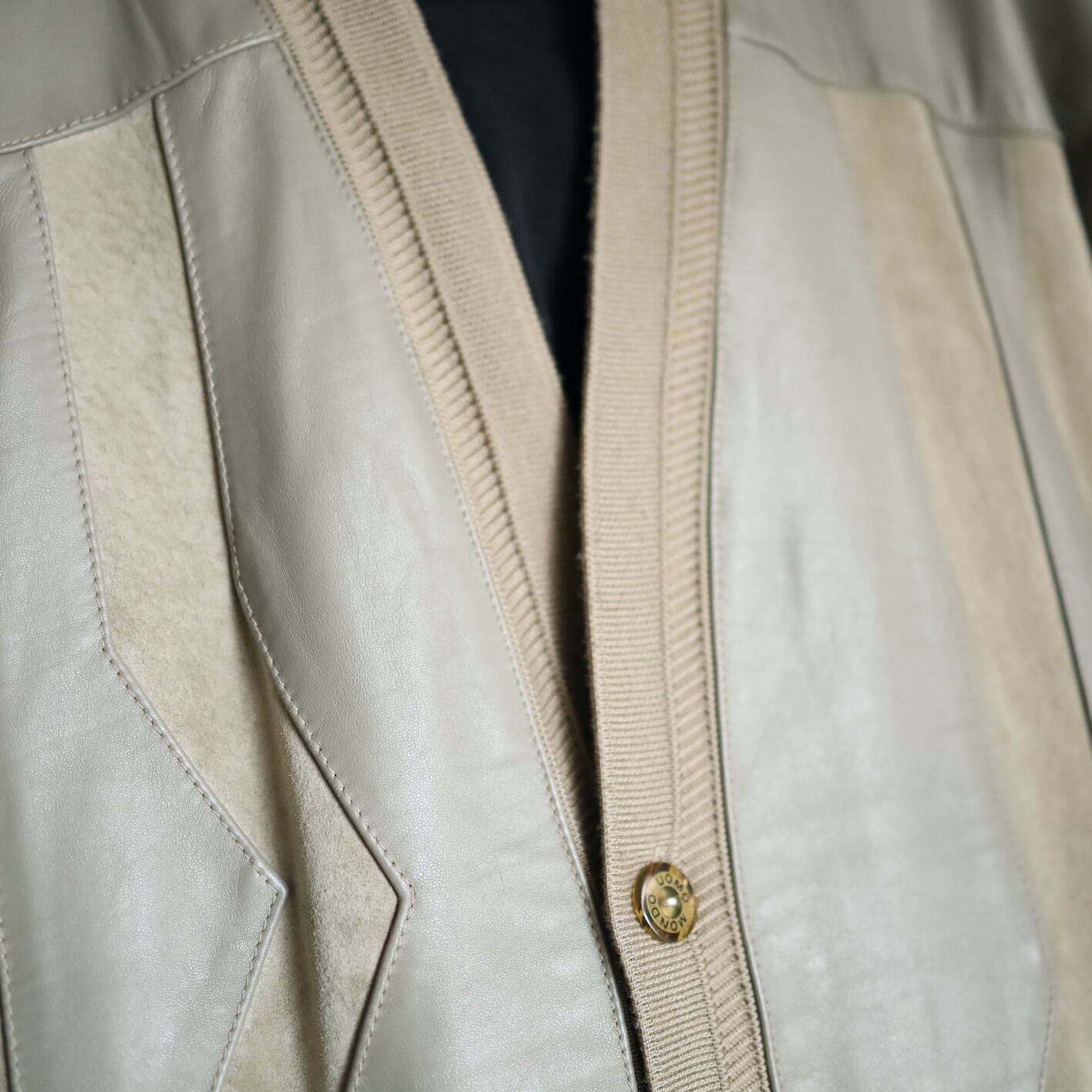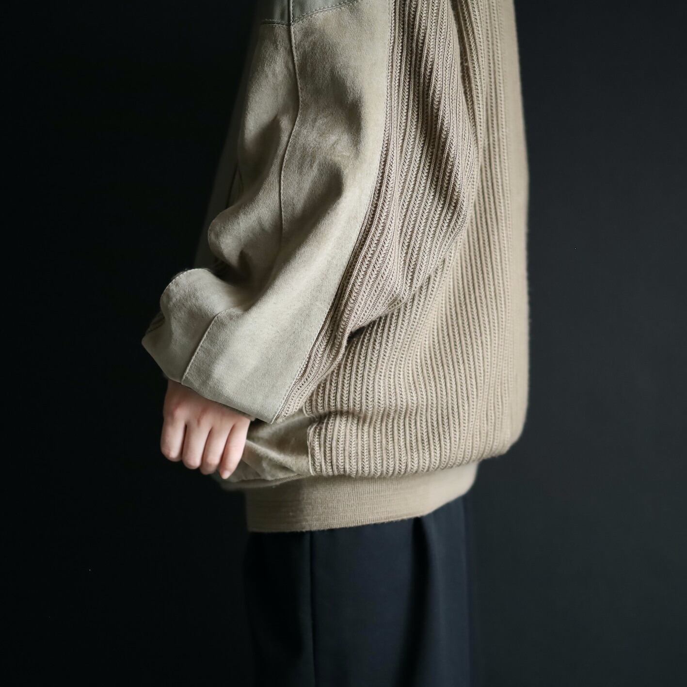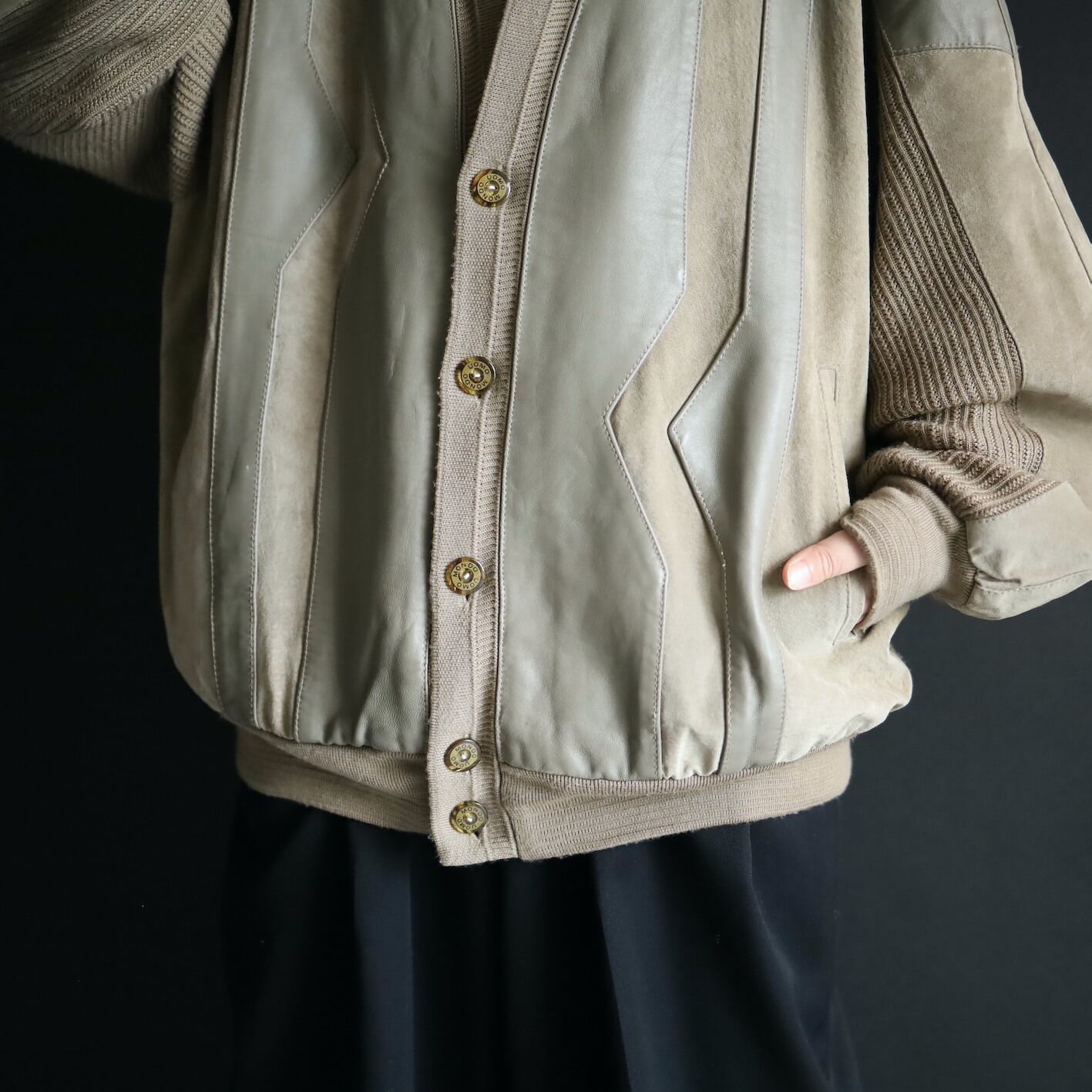 グレージュのレザーとスウェード,そしてベージュのニット切替で細かく表情の変わる一枚.