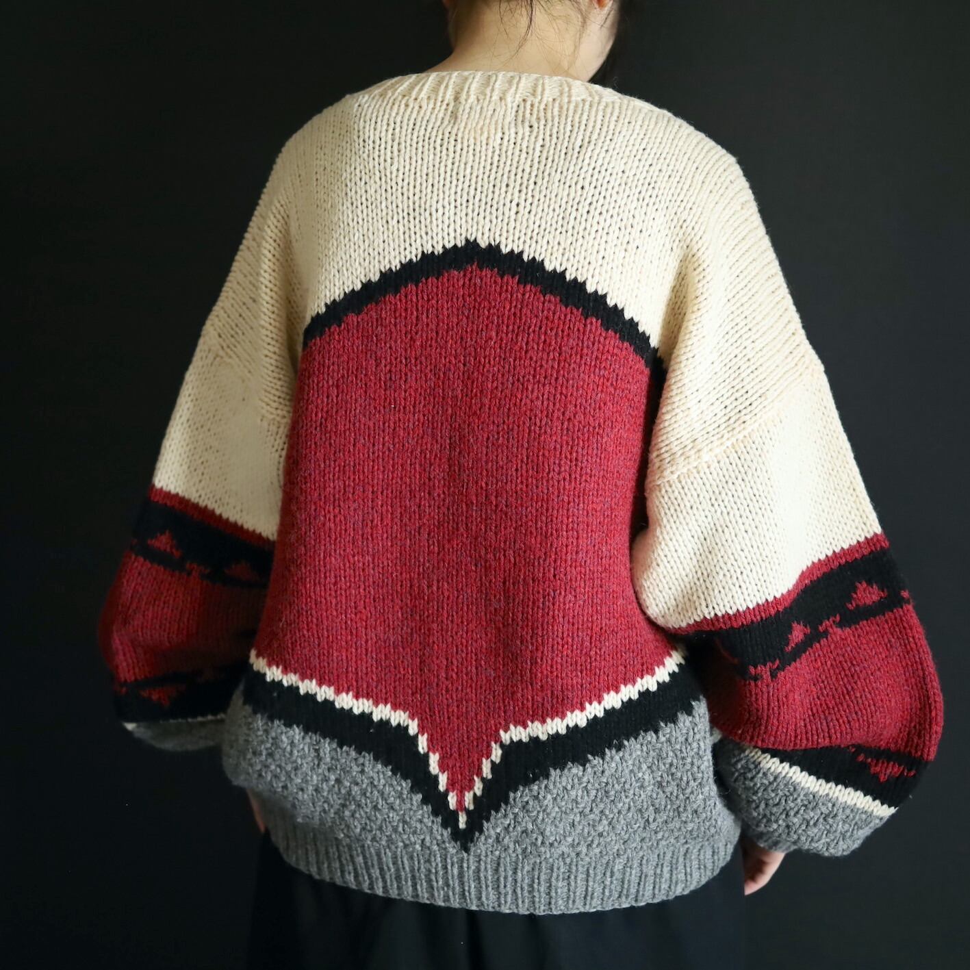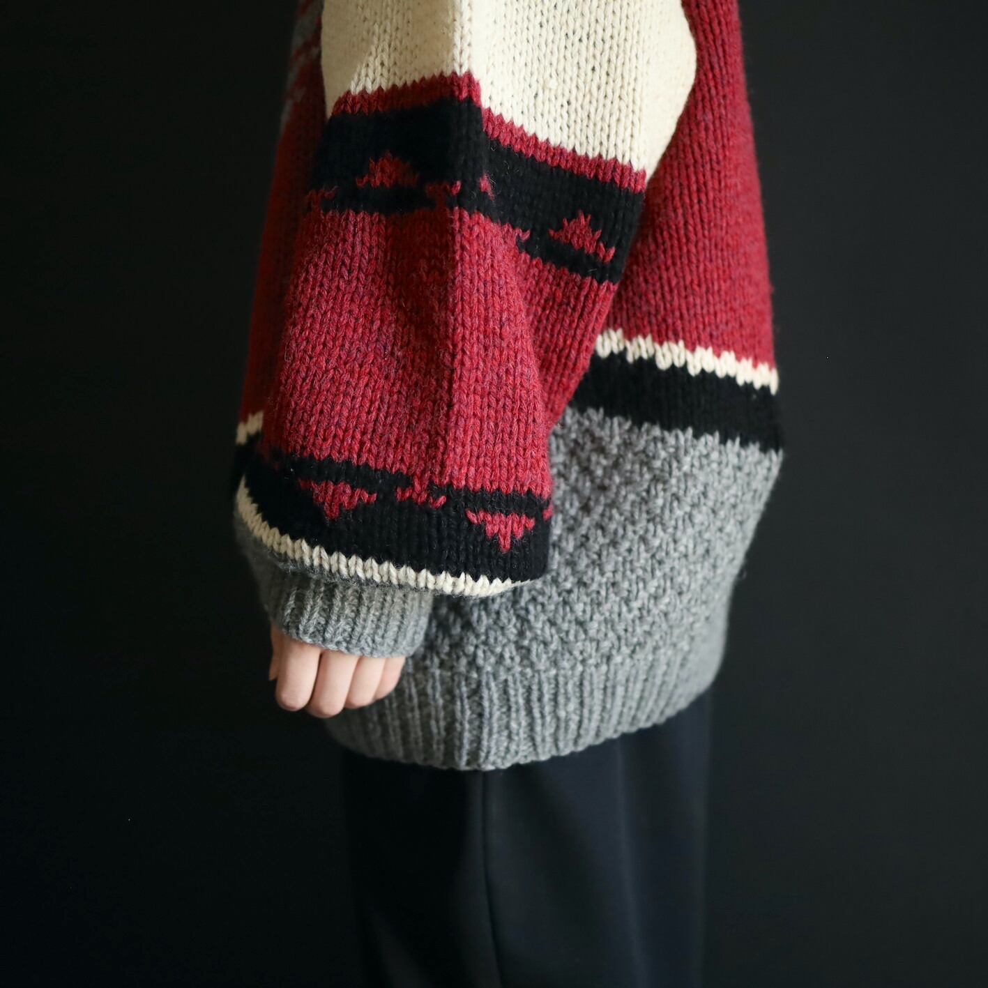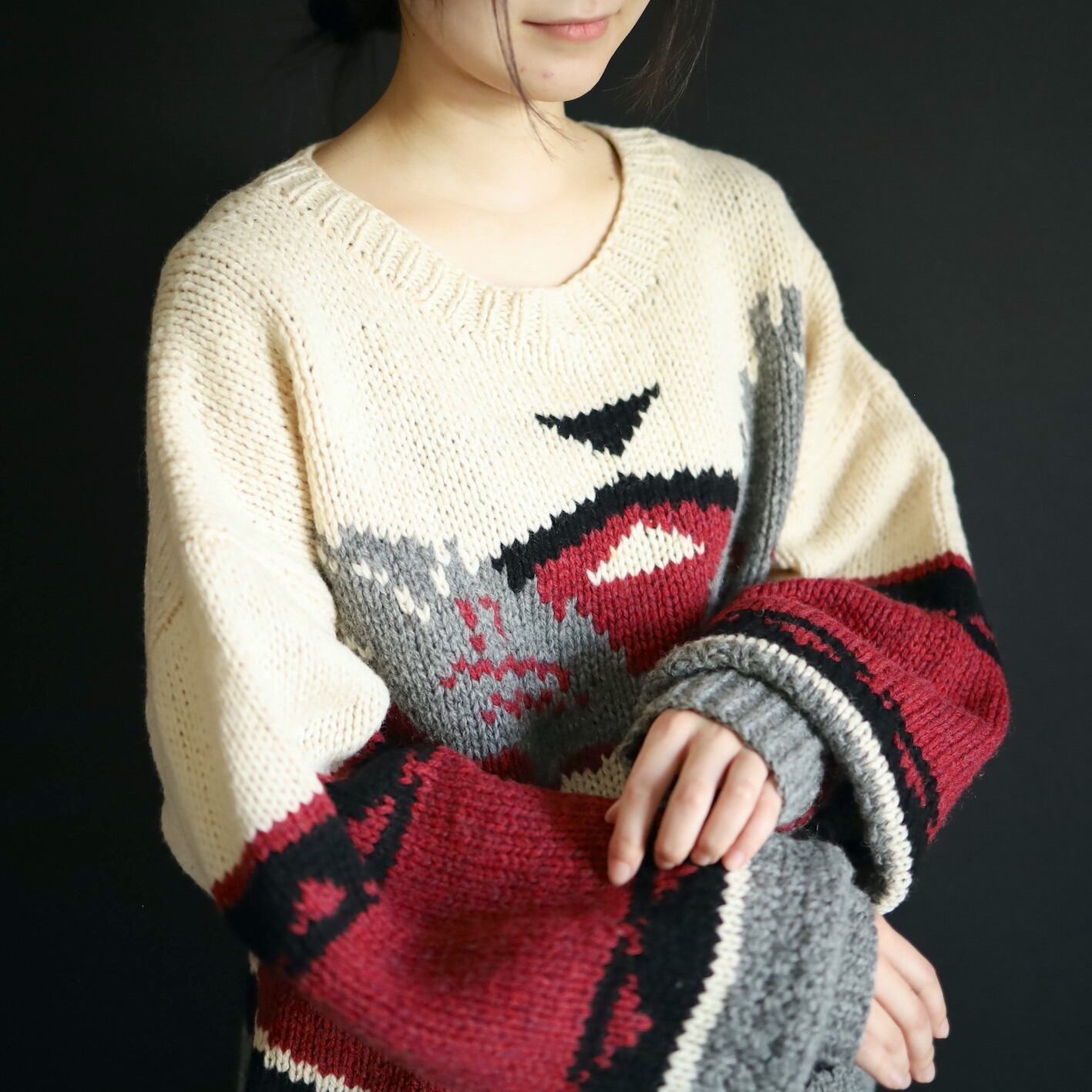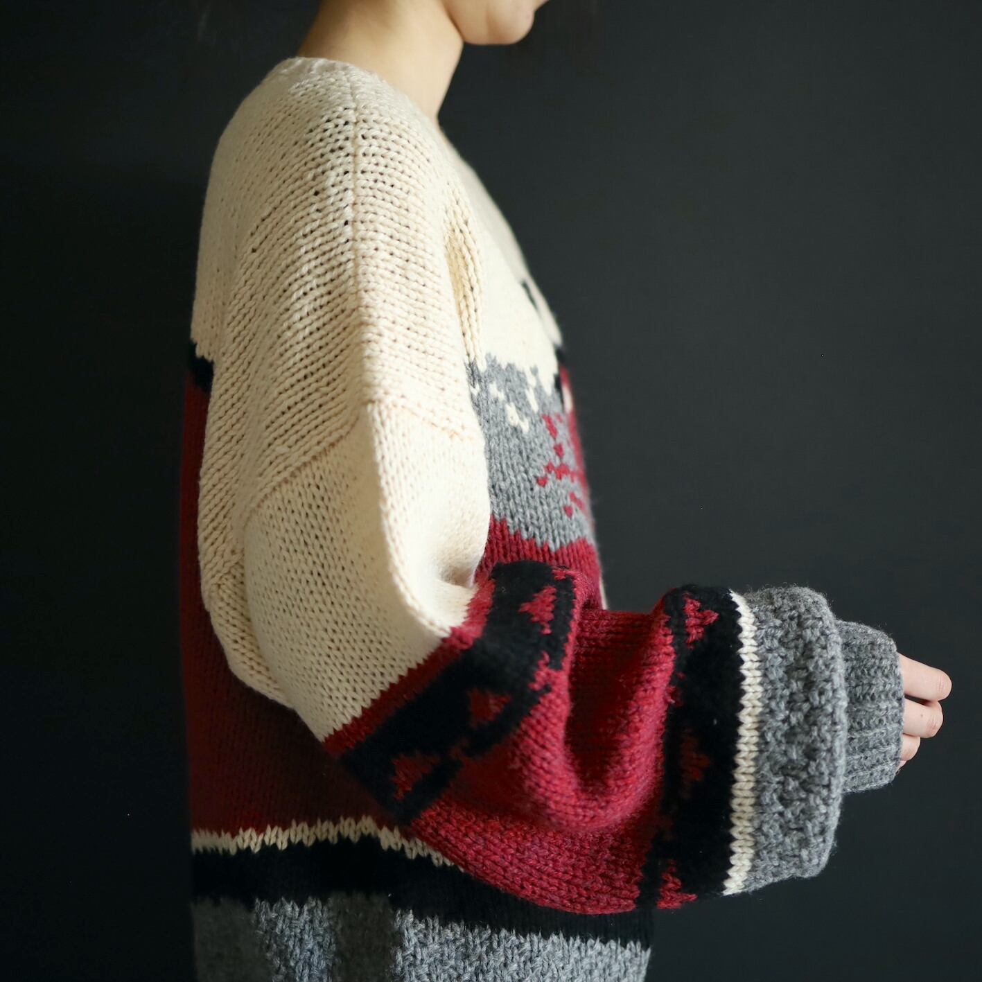 オフホワイト,ワインレッド,ブラック,グレー4色による,肉厚なボディのジャガードニットセーター.