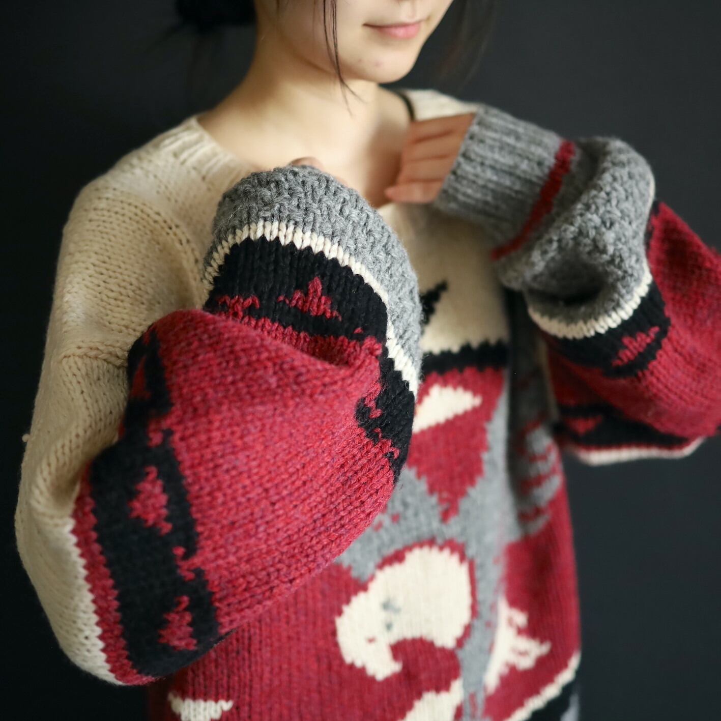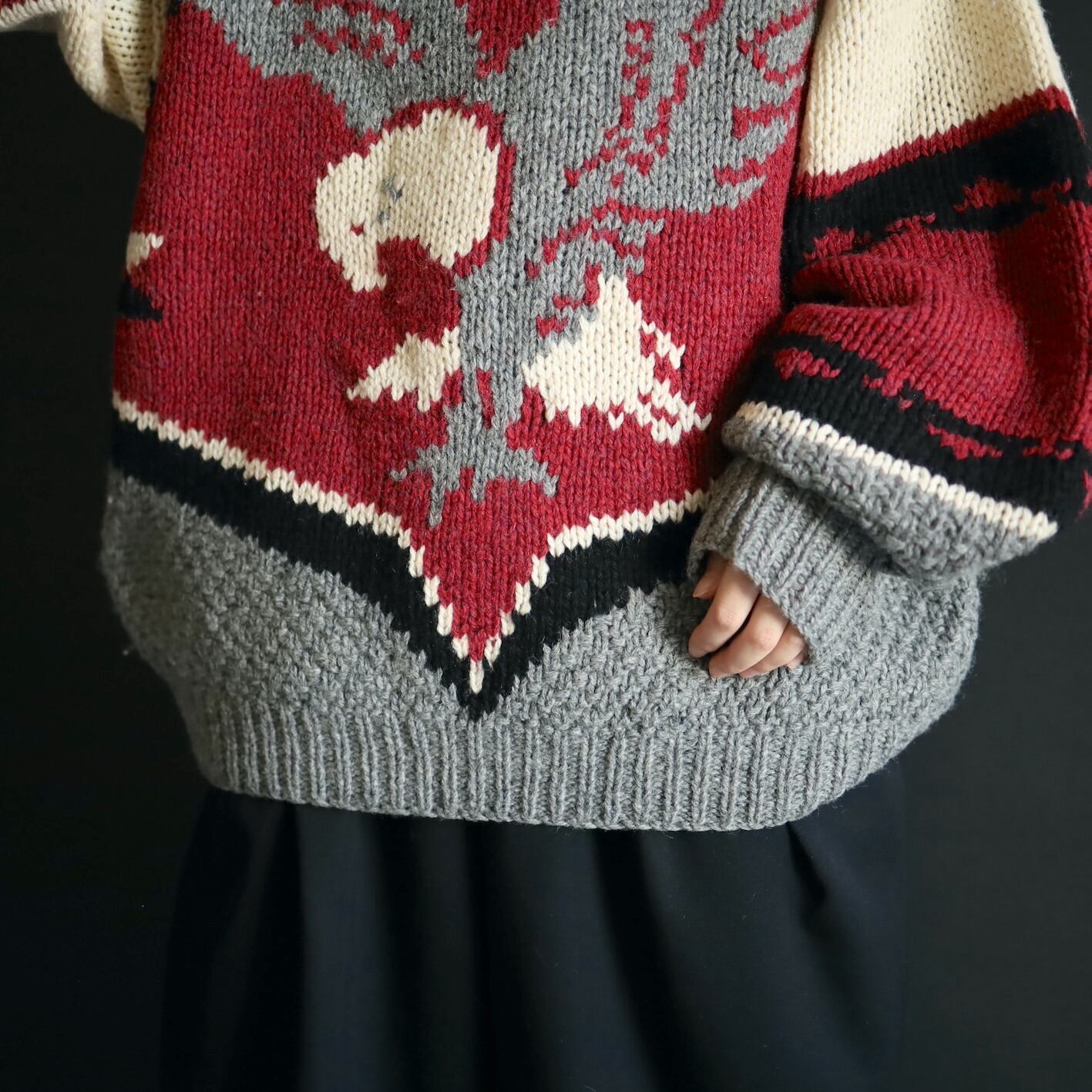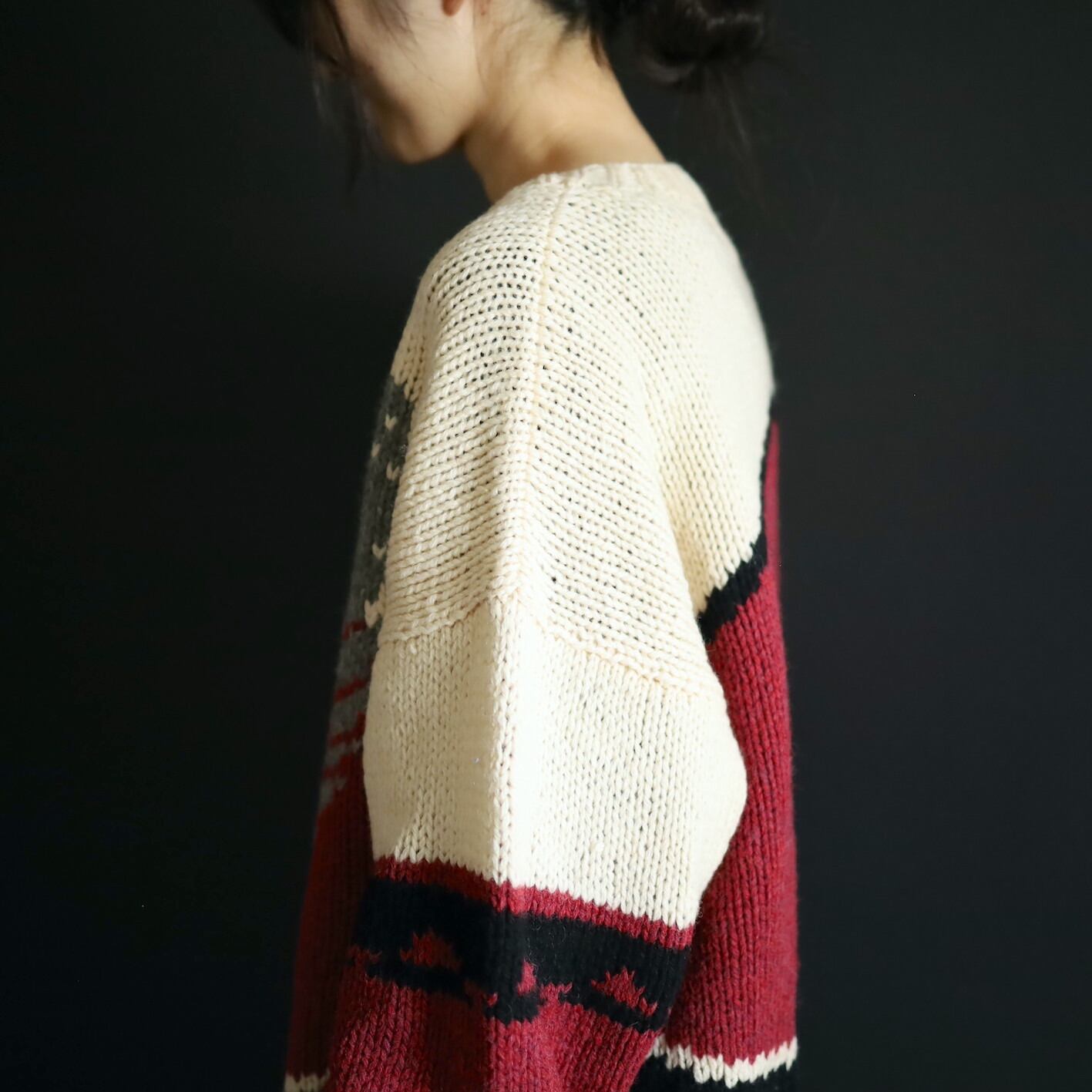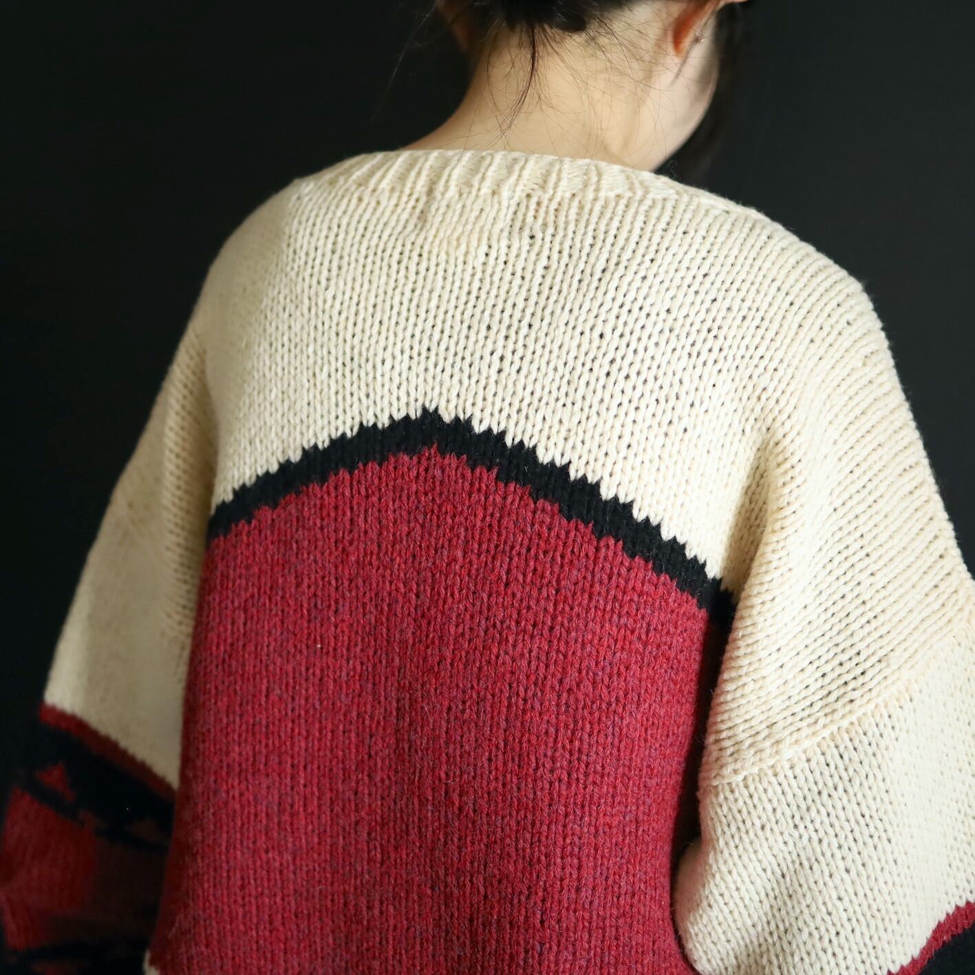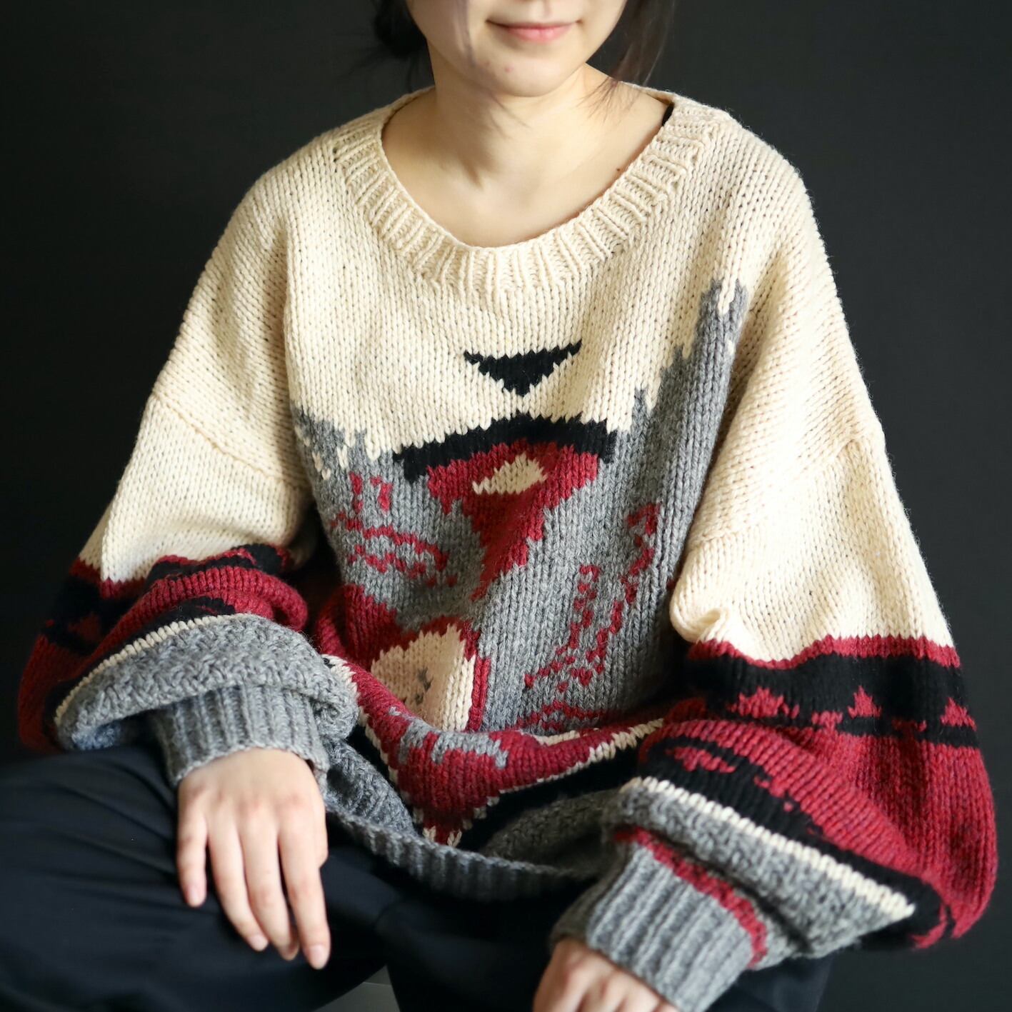 オフホワイト,ワインレッド,ブラック,グレー4色による,肉厚なボディのジャガードニットセーター.