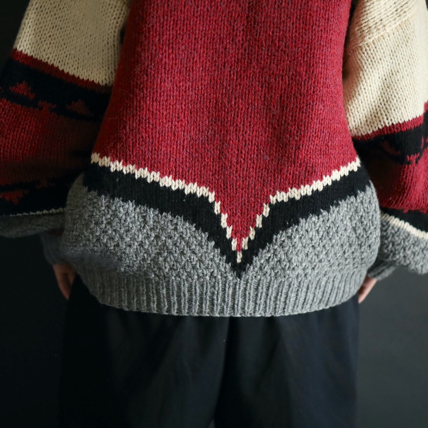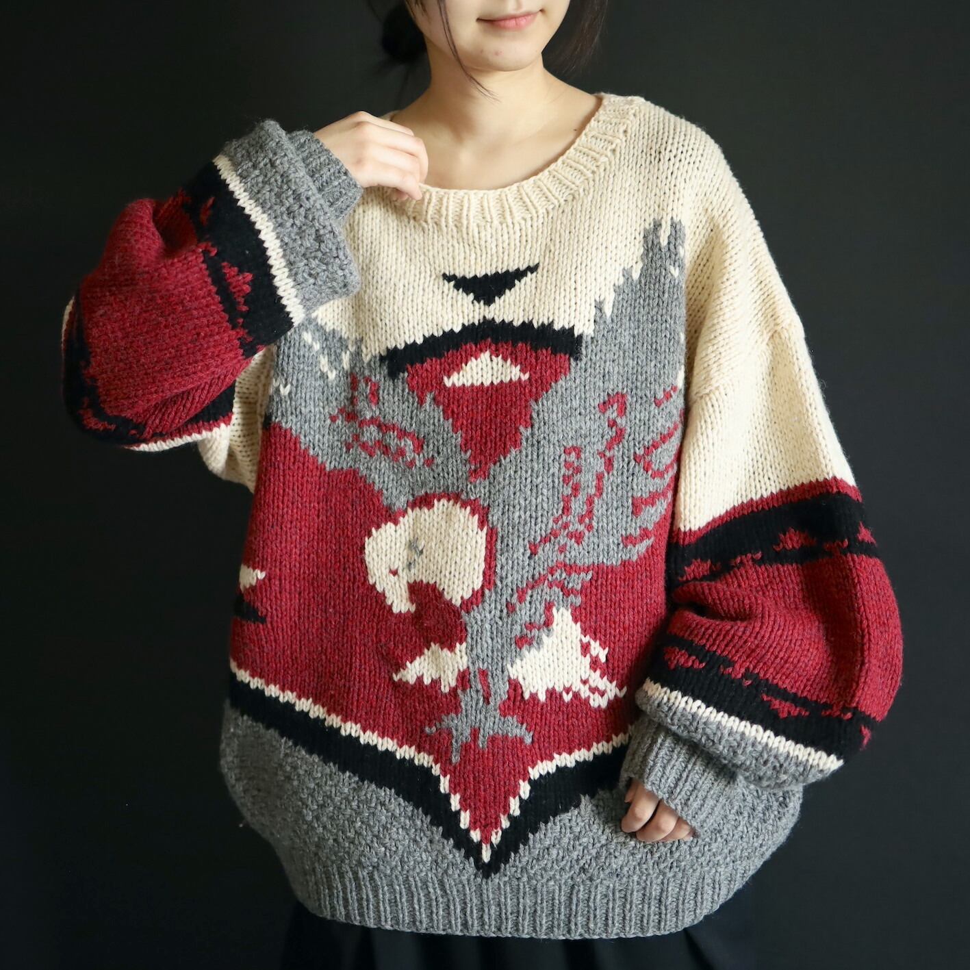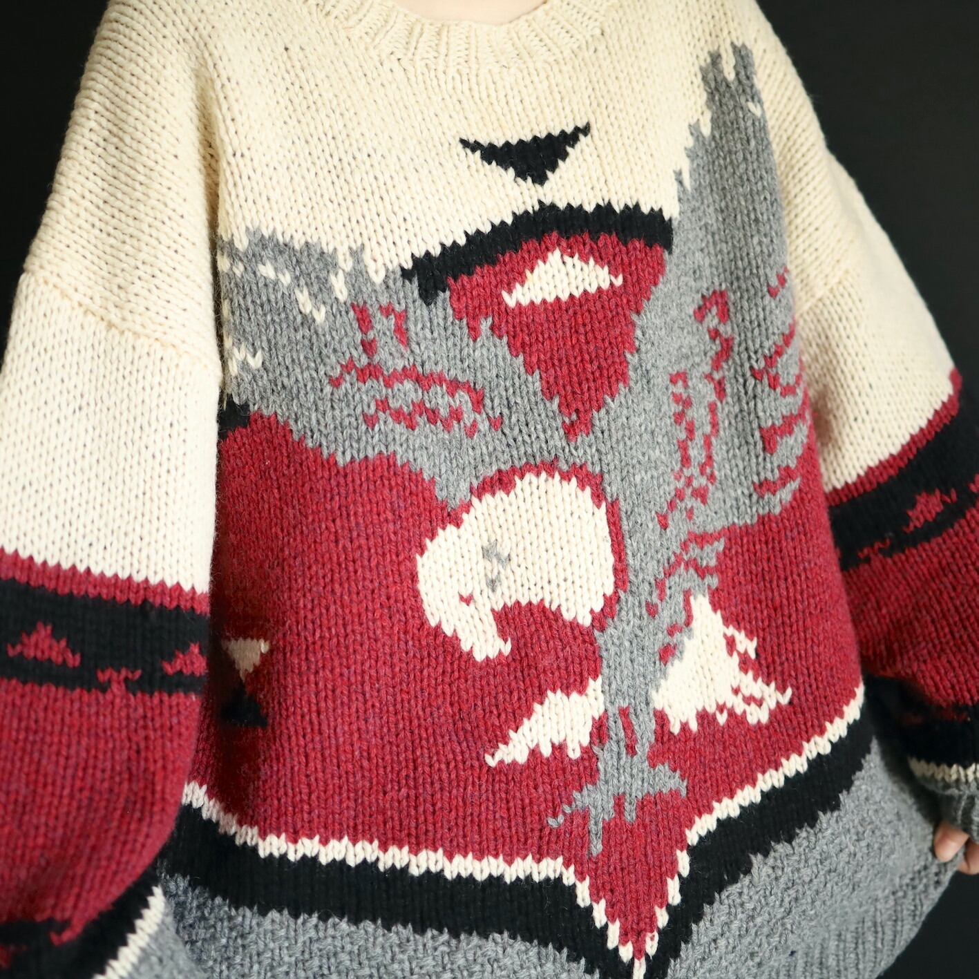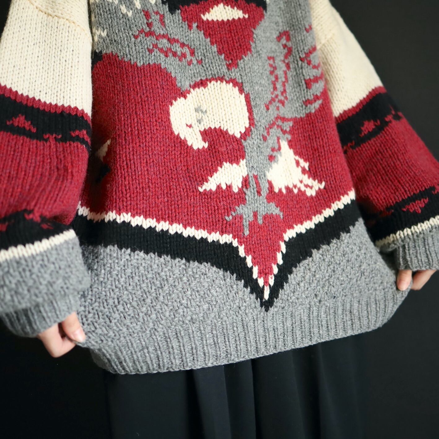 オフホワイト,ワインレッド,ブラック,グレー4色による,肉厚なボディのジャガードニットセーター.