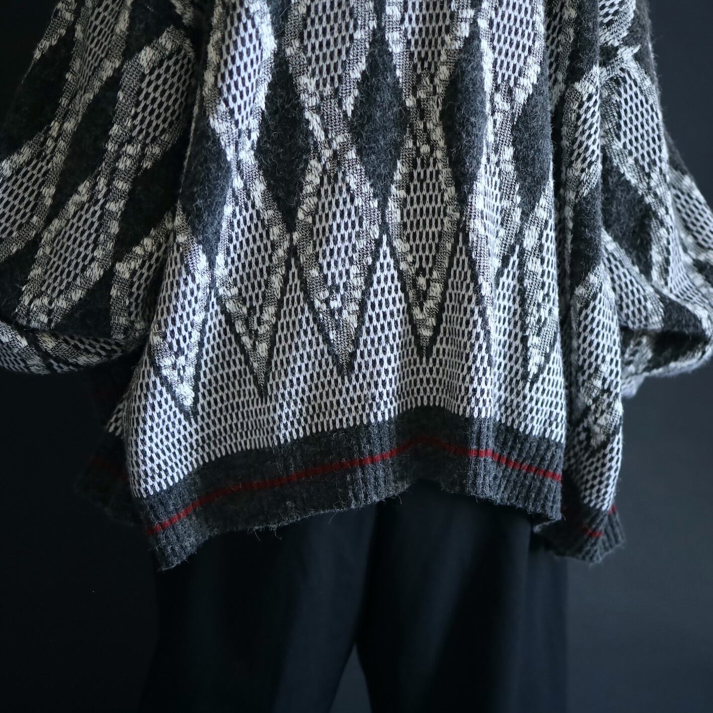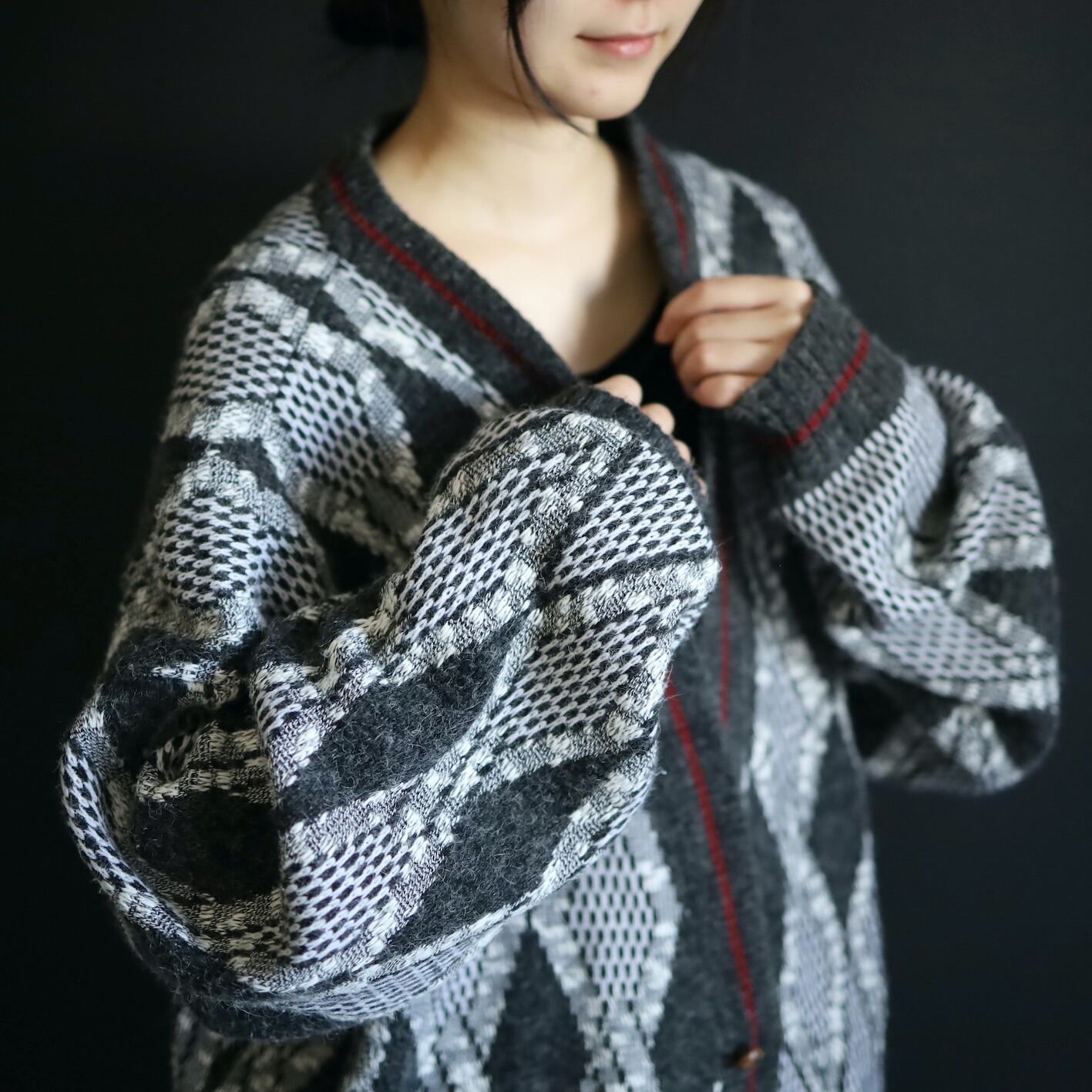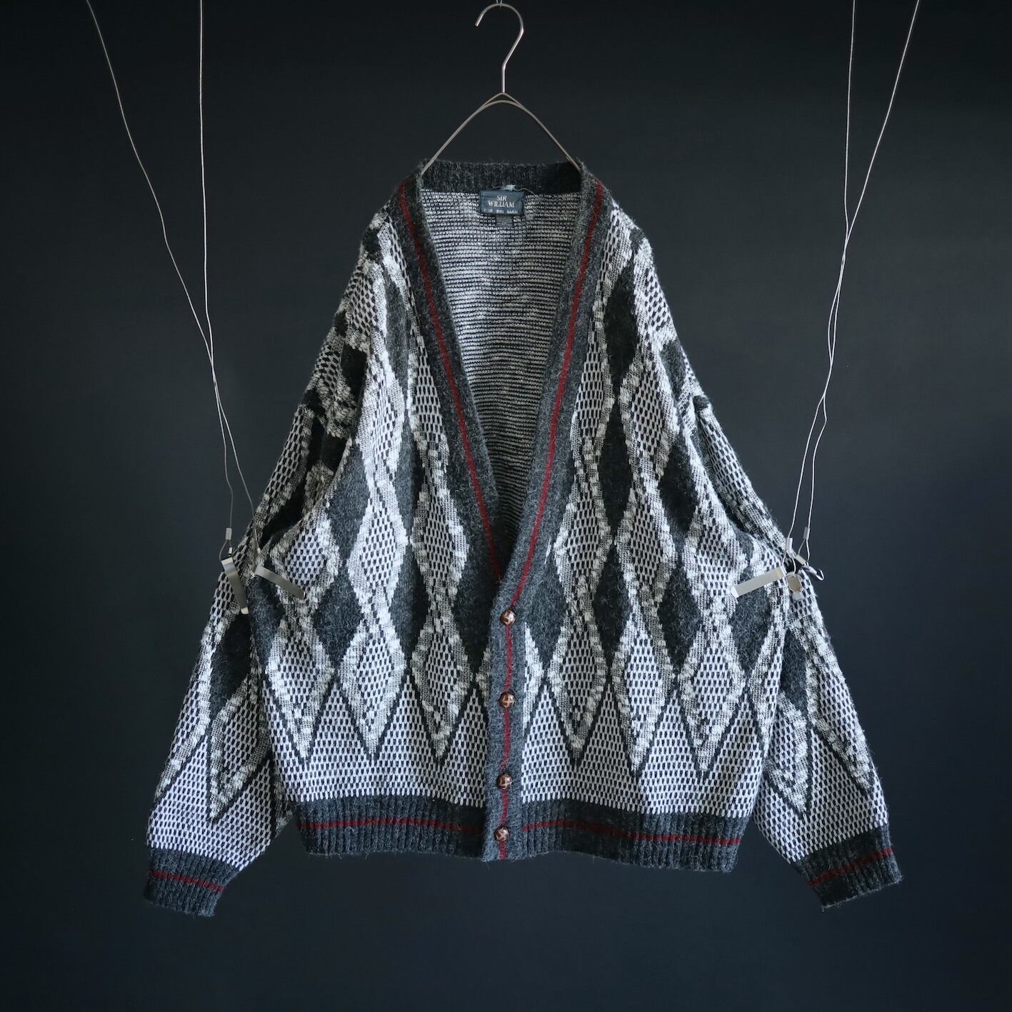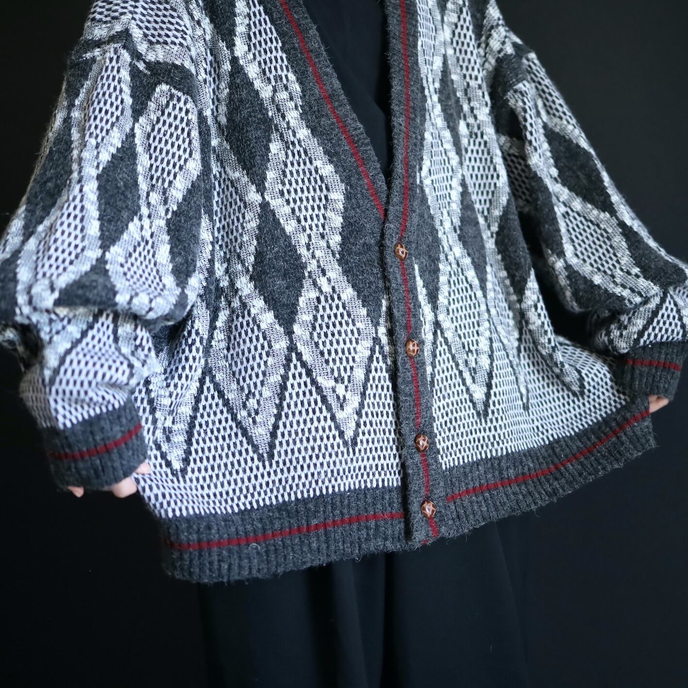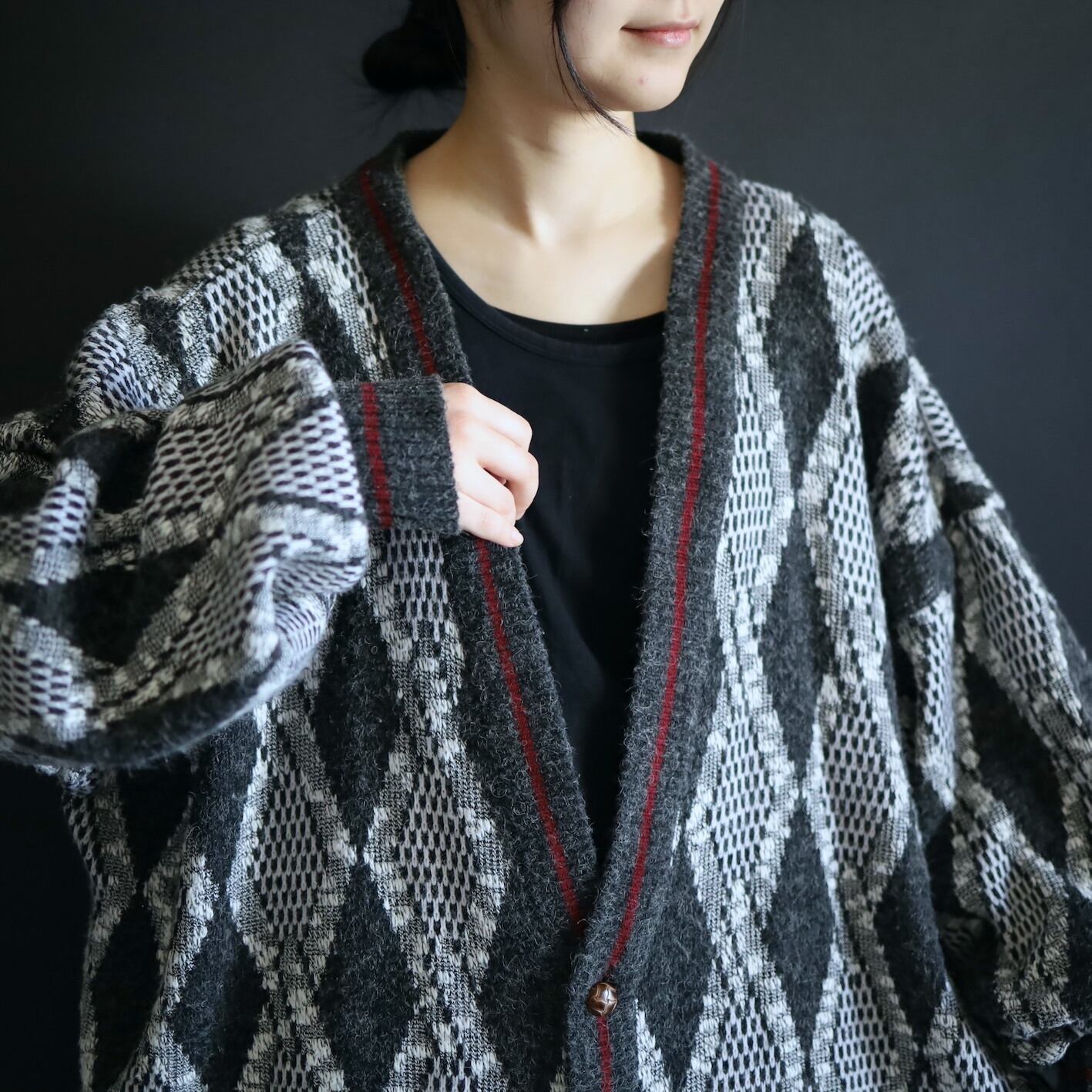 チャコールグレーとホワイトのアーガイルアートベース,前立てと裾,袖リブにはモノトーンの中でよく映えるワインレッドのラインが走ります.