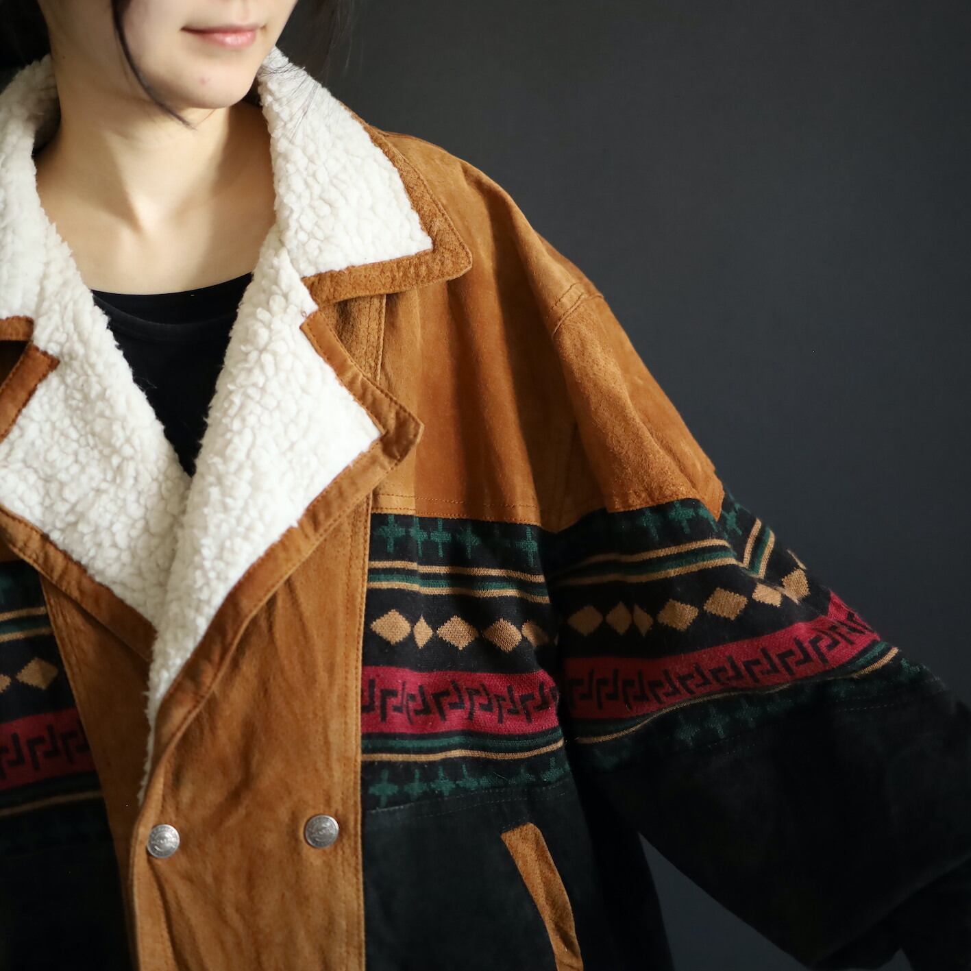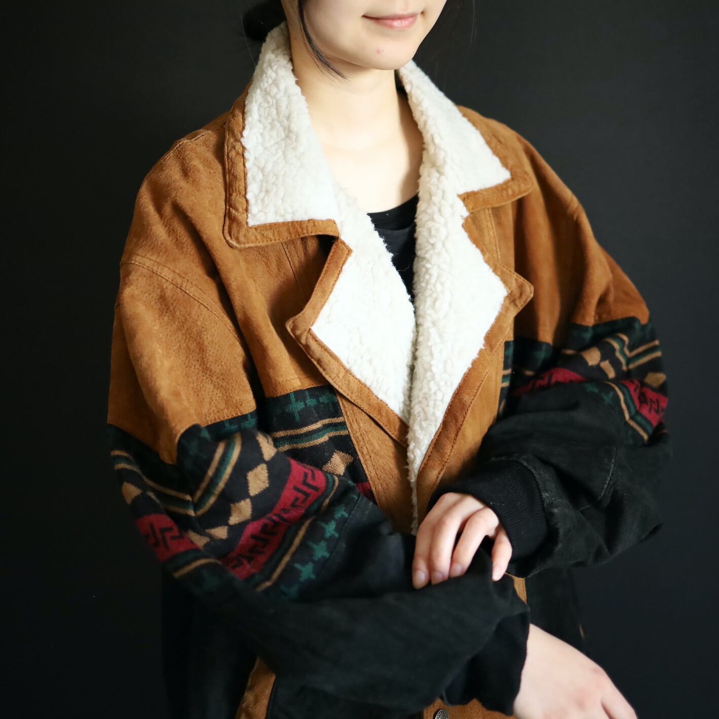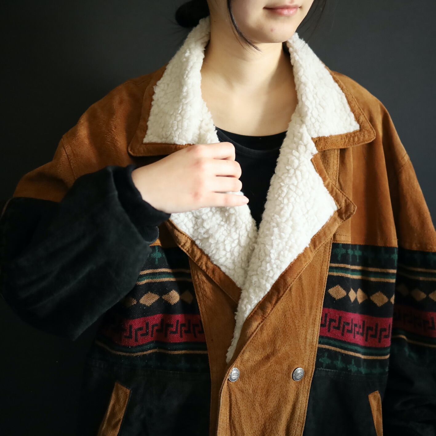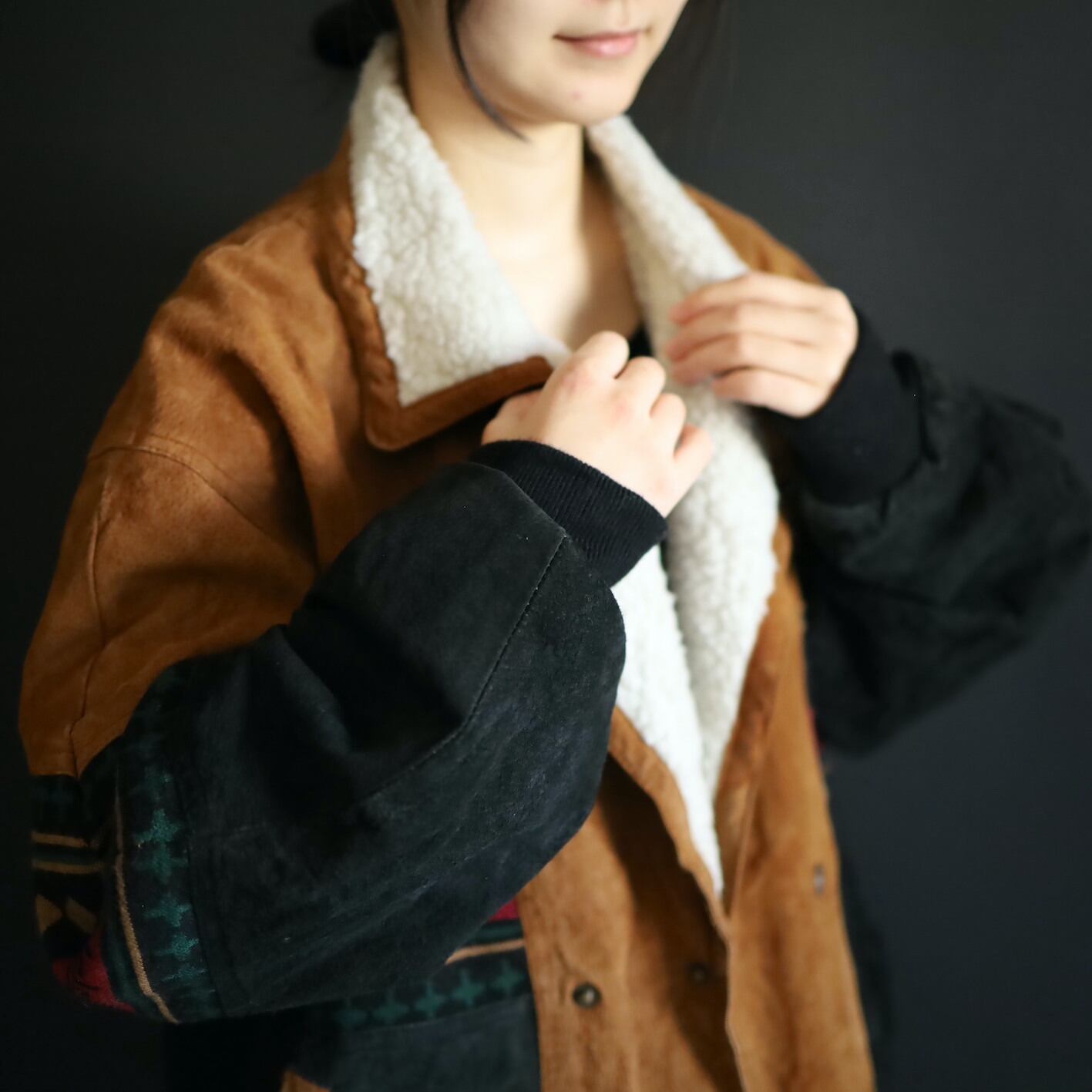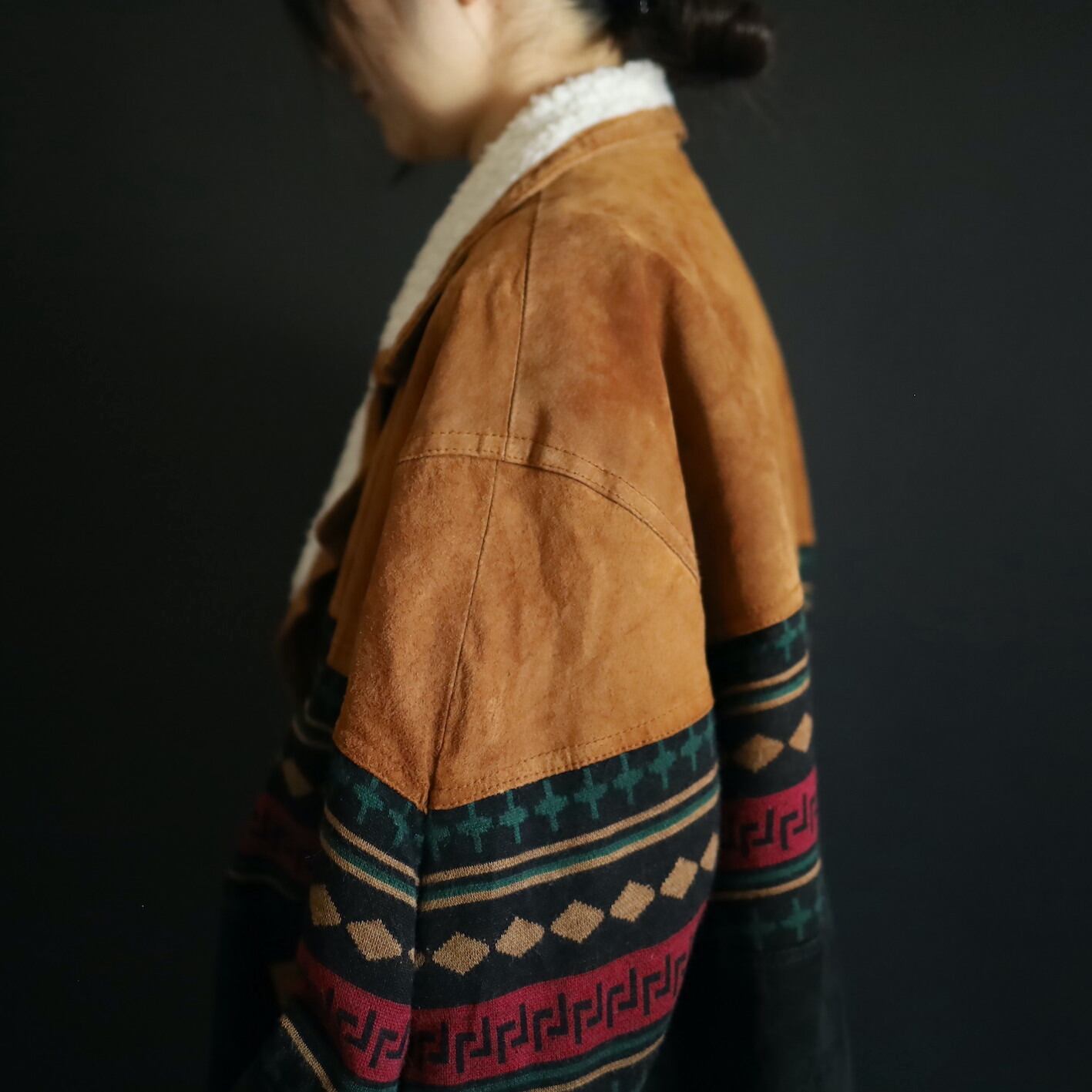 2色のスエードレザーに加えてニットのスイッチング,襟元はボア仕様で,表にもチラッと表情を覗かせます.