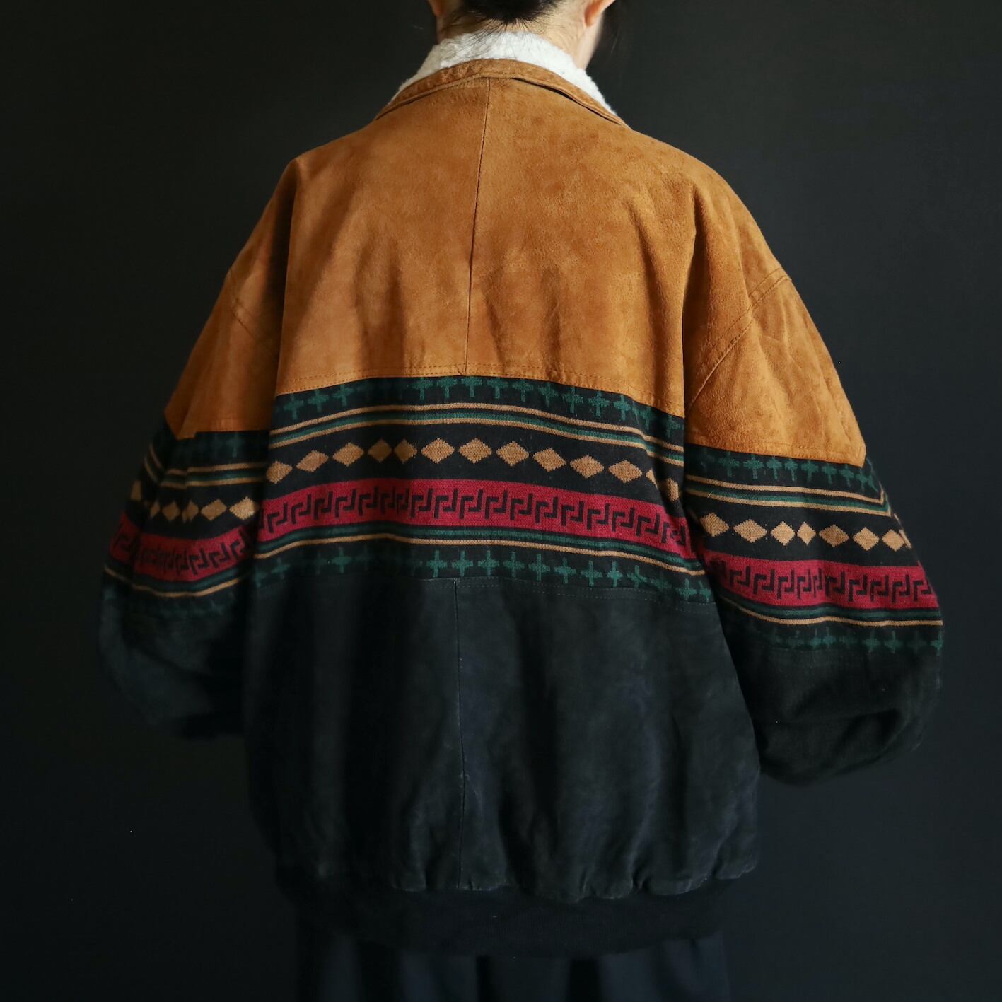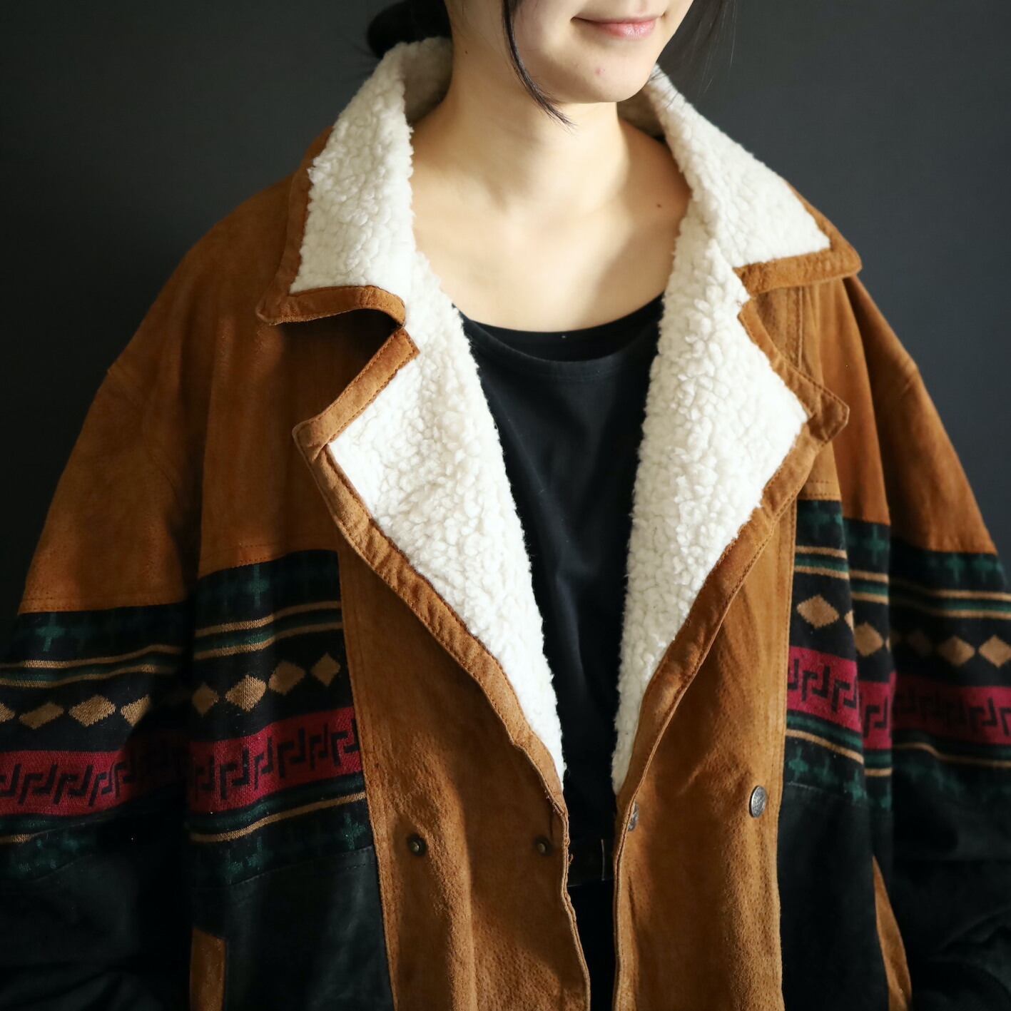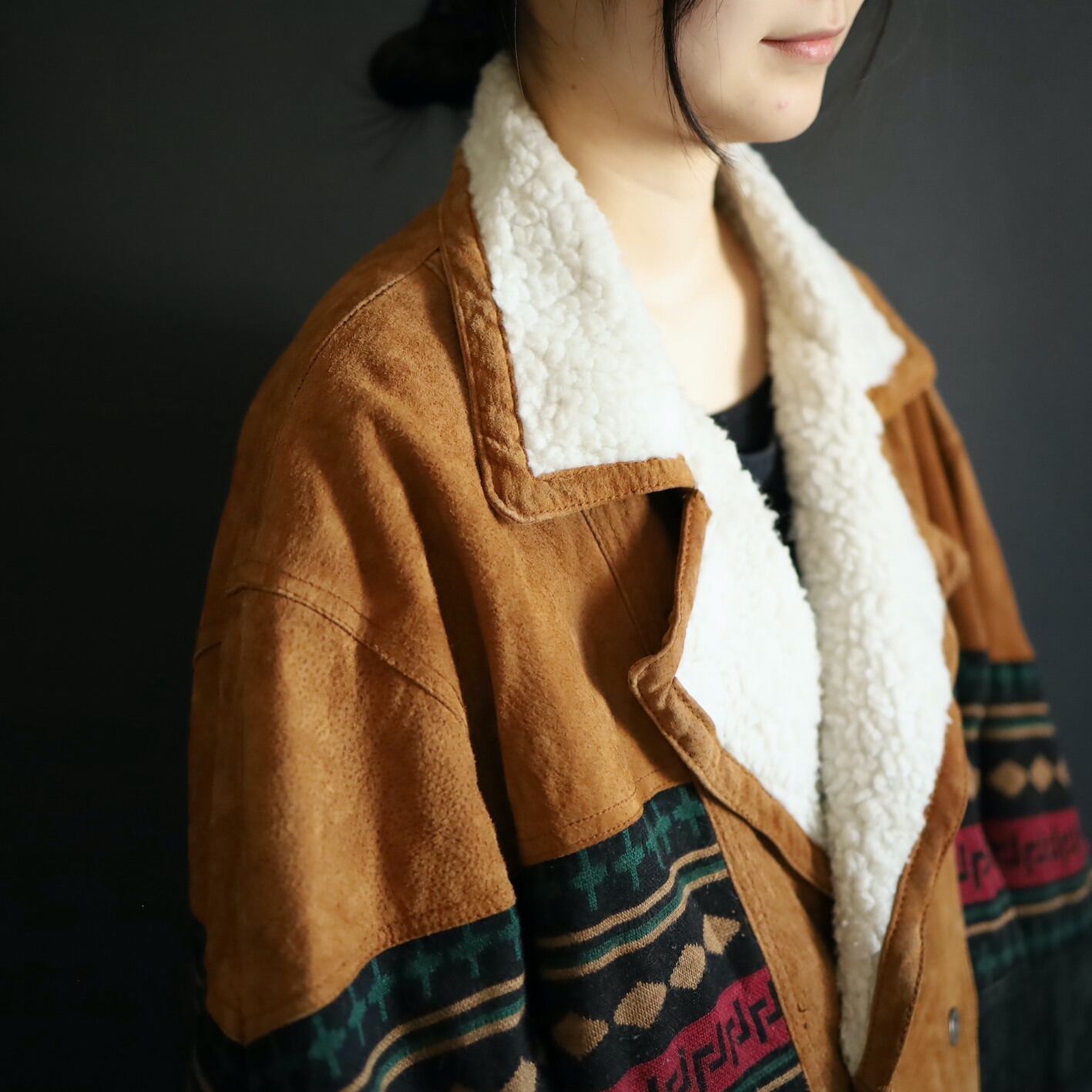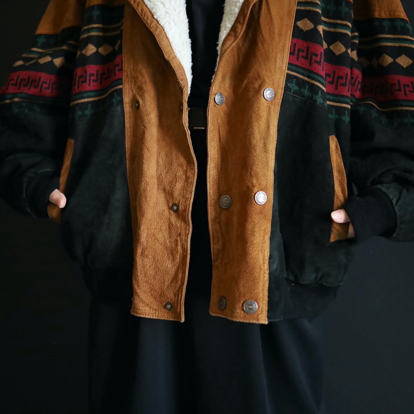 2色のスエードレザーに加えてニットのスイッチング,襟元はボア仕様で,表にもチラッと表情を覗かせます.