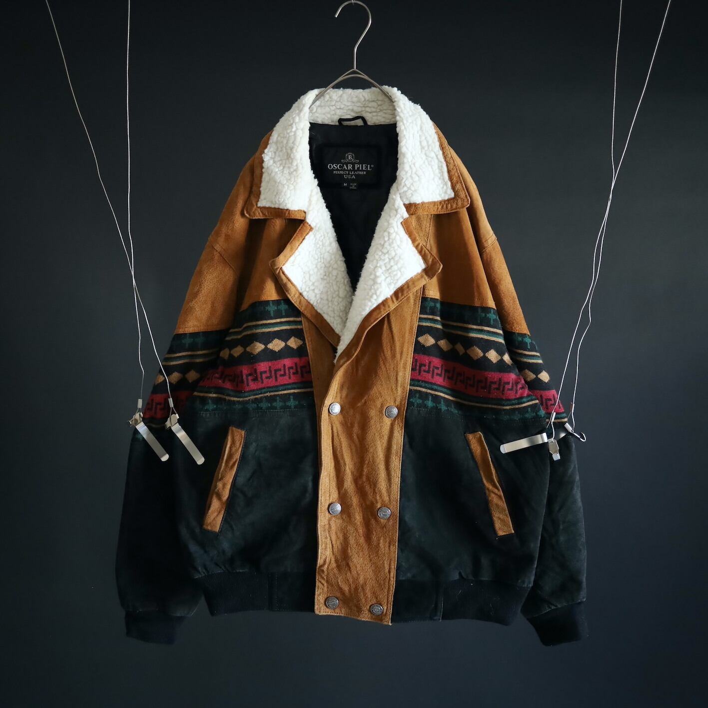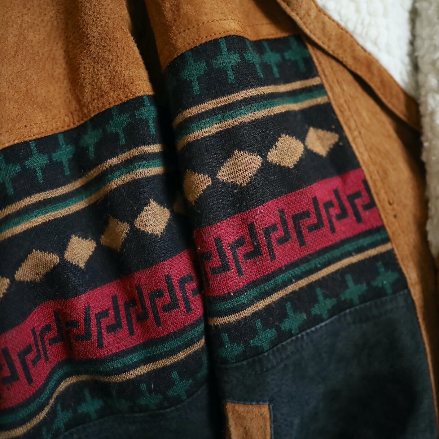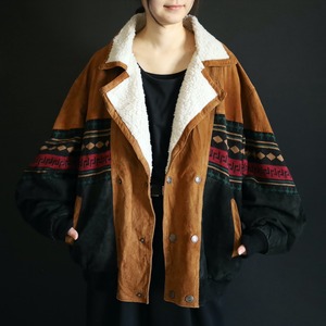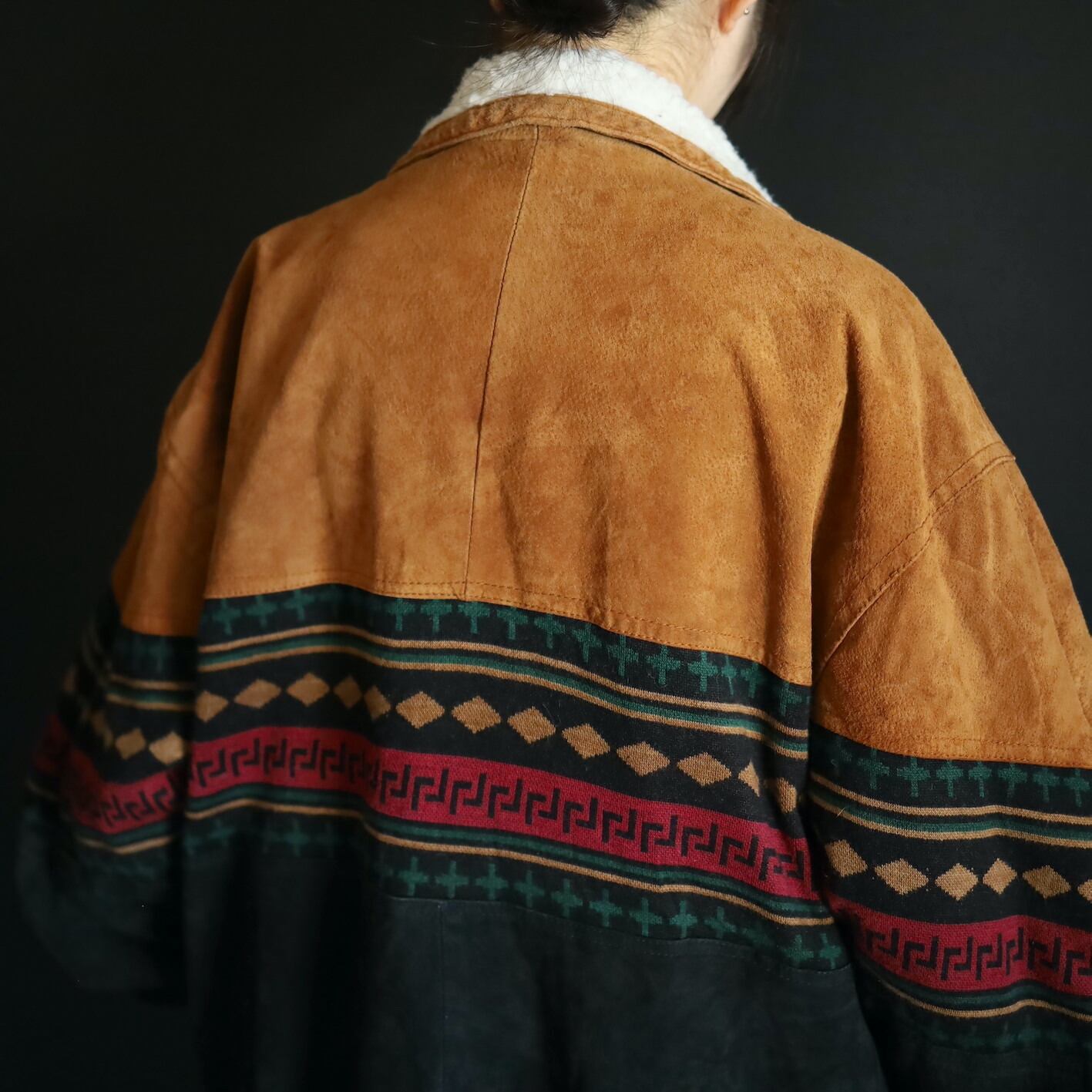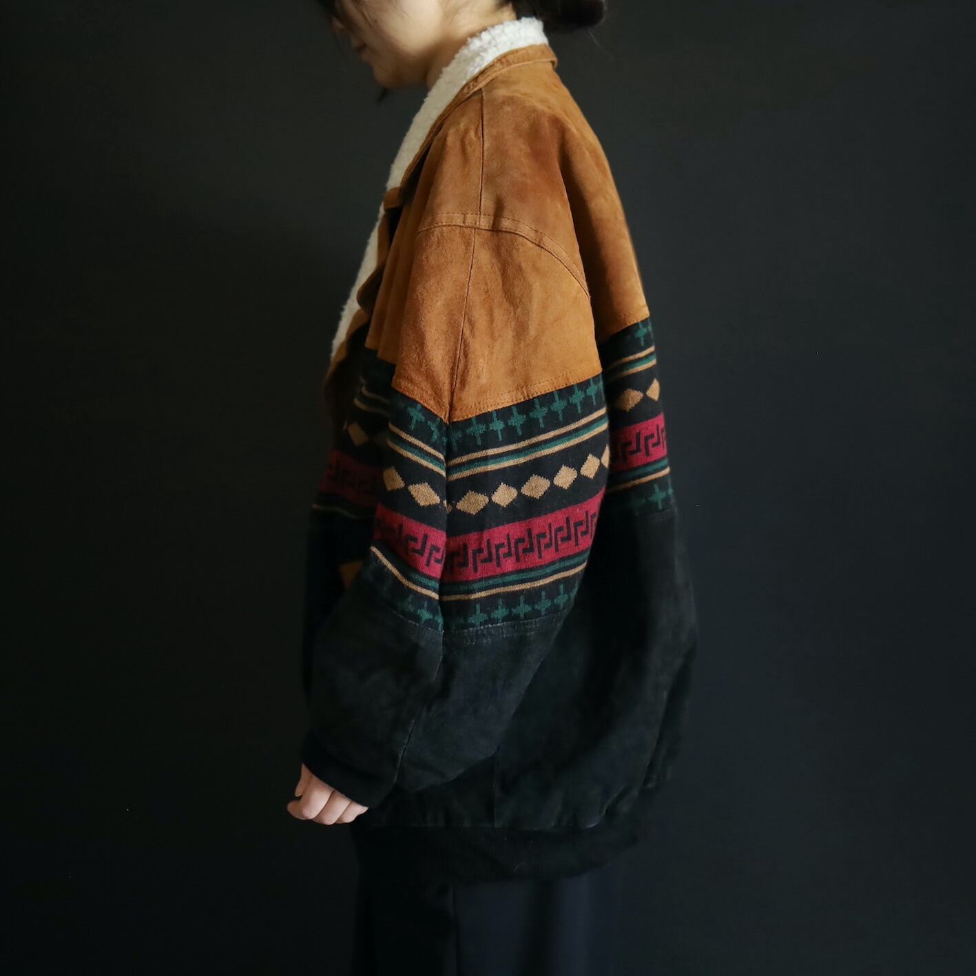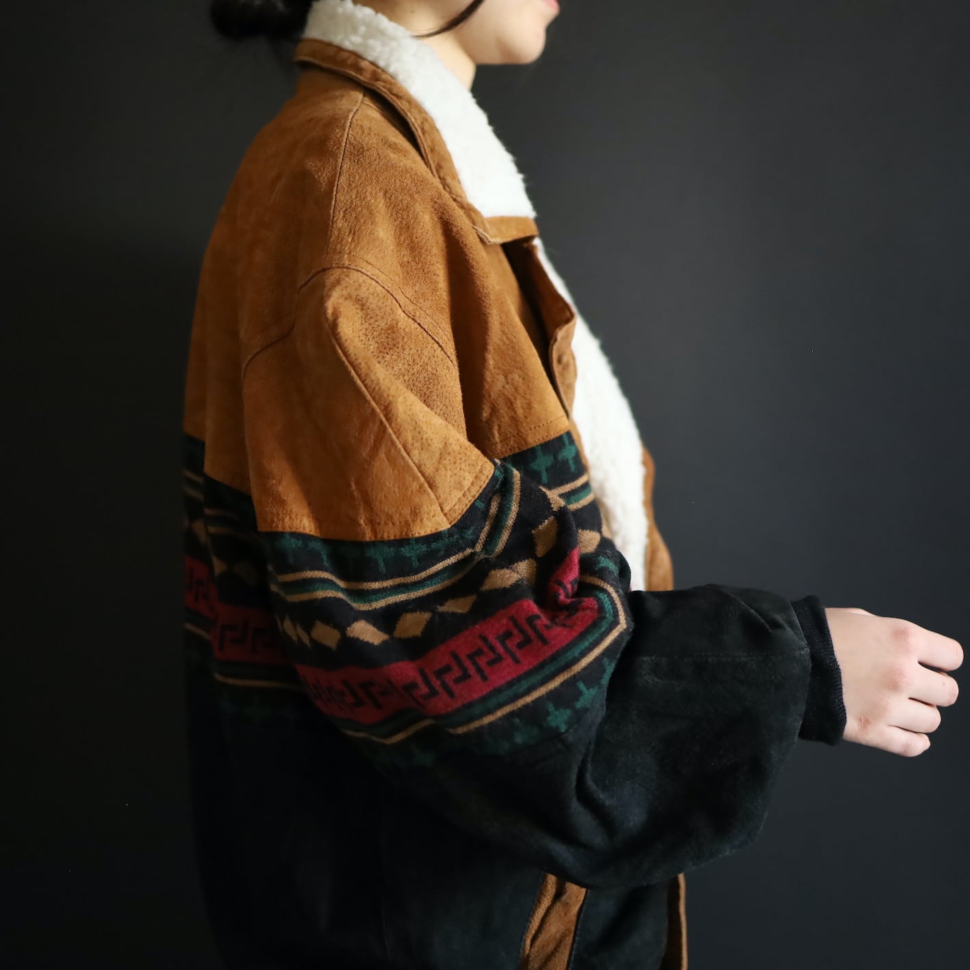2色のスエードレザーに加えてニットのスイッチング,襟元はボア仕様で,表にもチラッと表情を覗かせます.