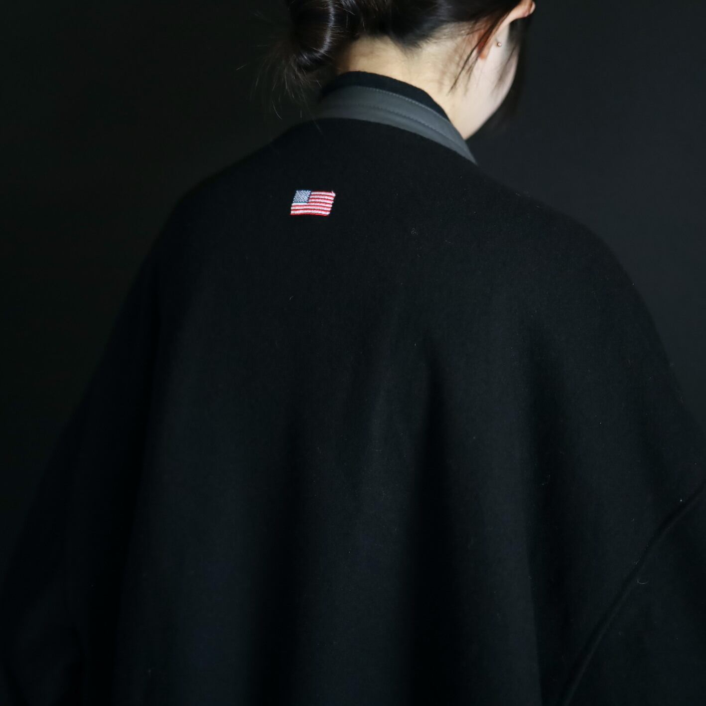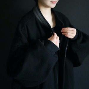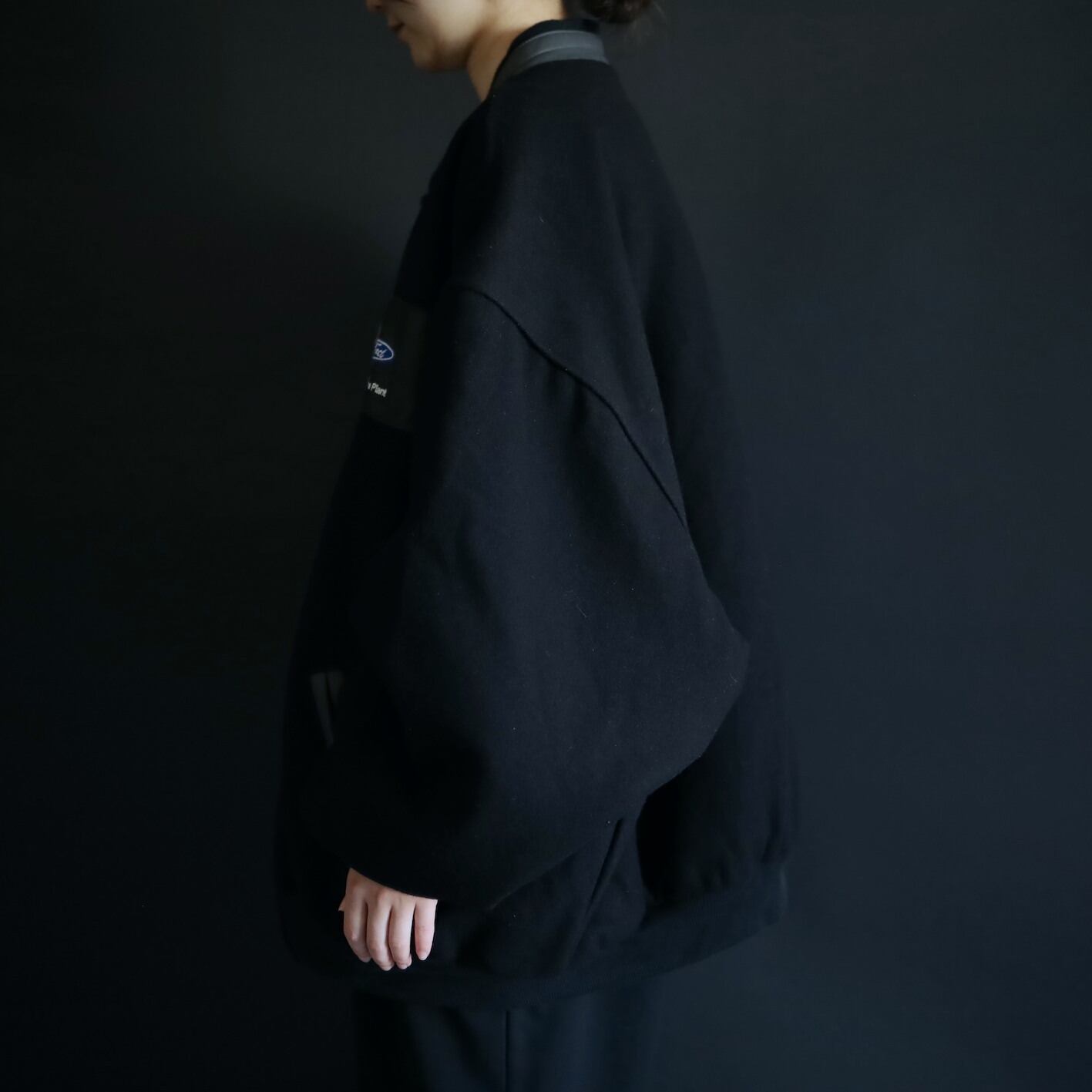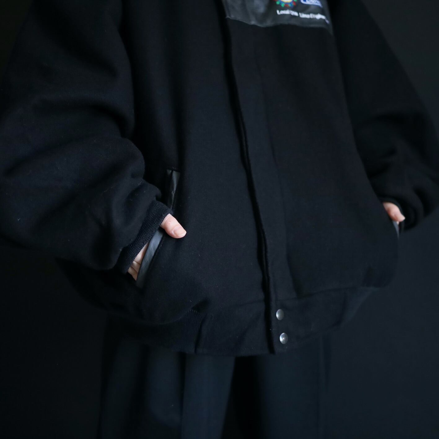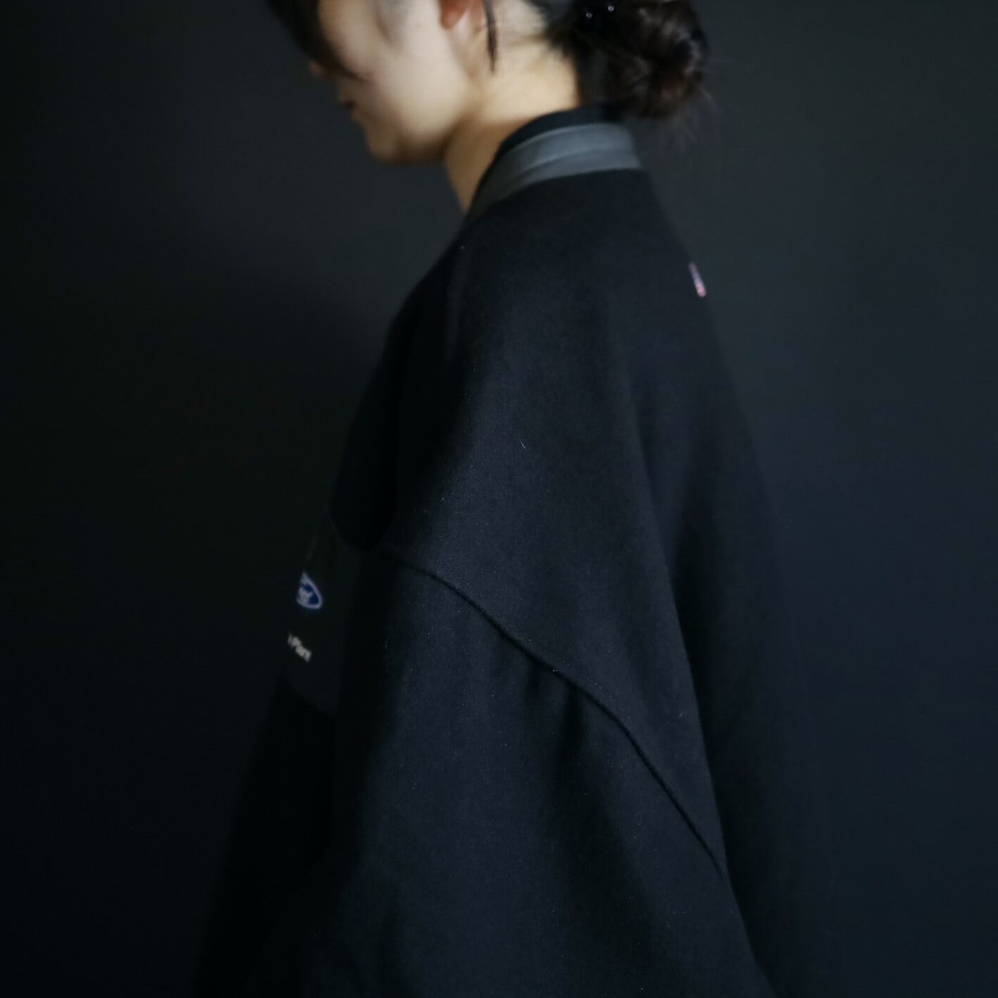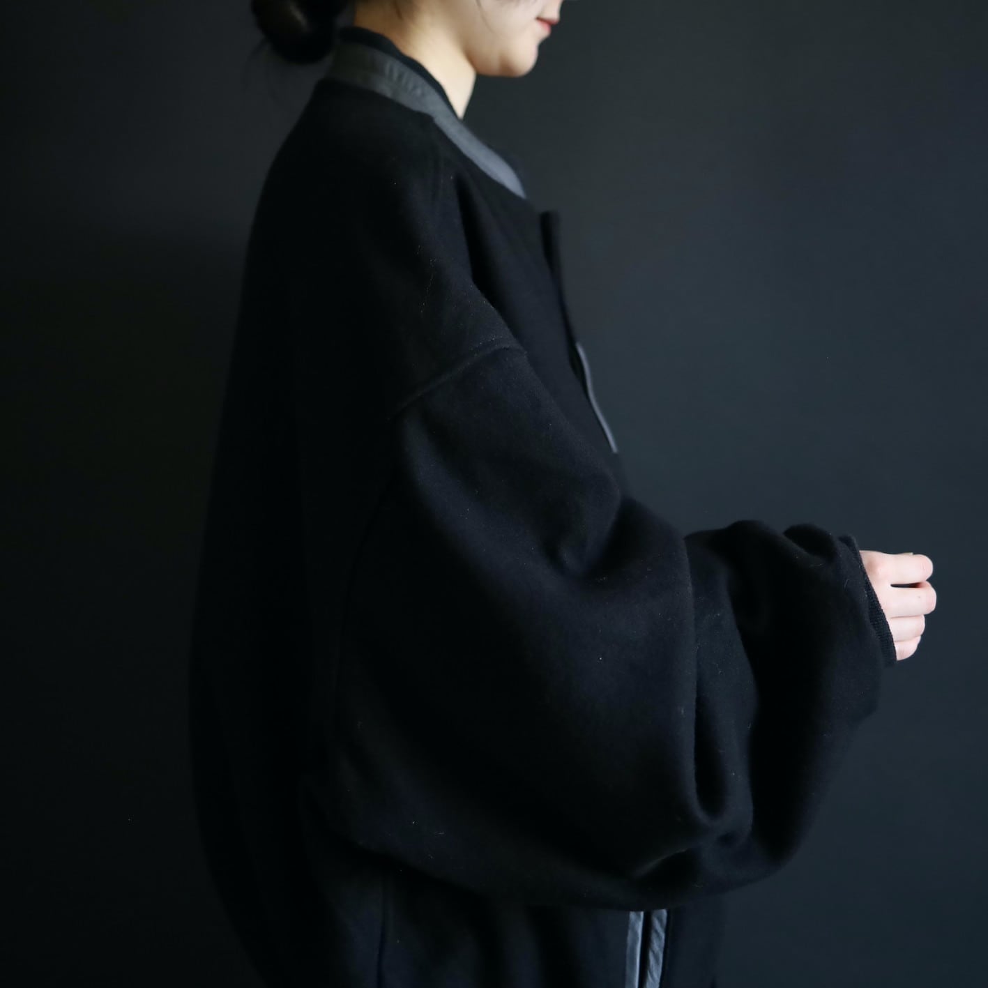 ブラックカラーのウールボディをベースに,左胸部のみレザーのワンポイント切替.