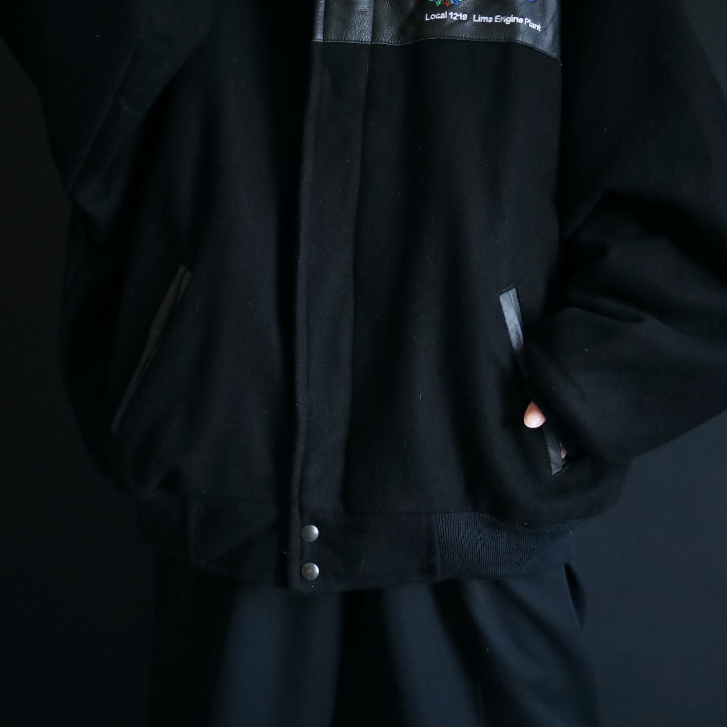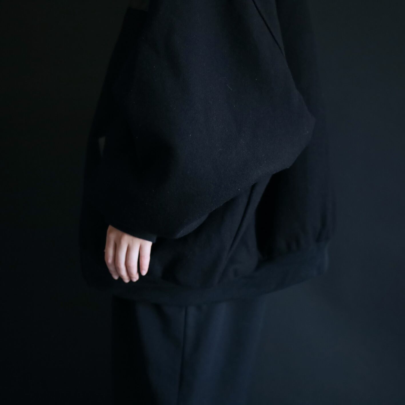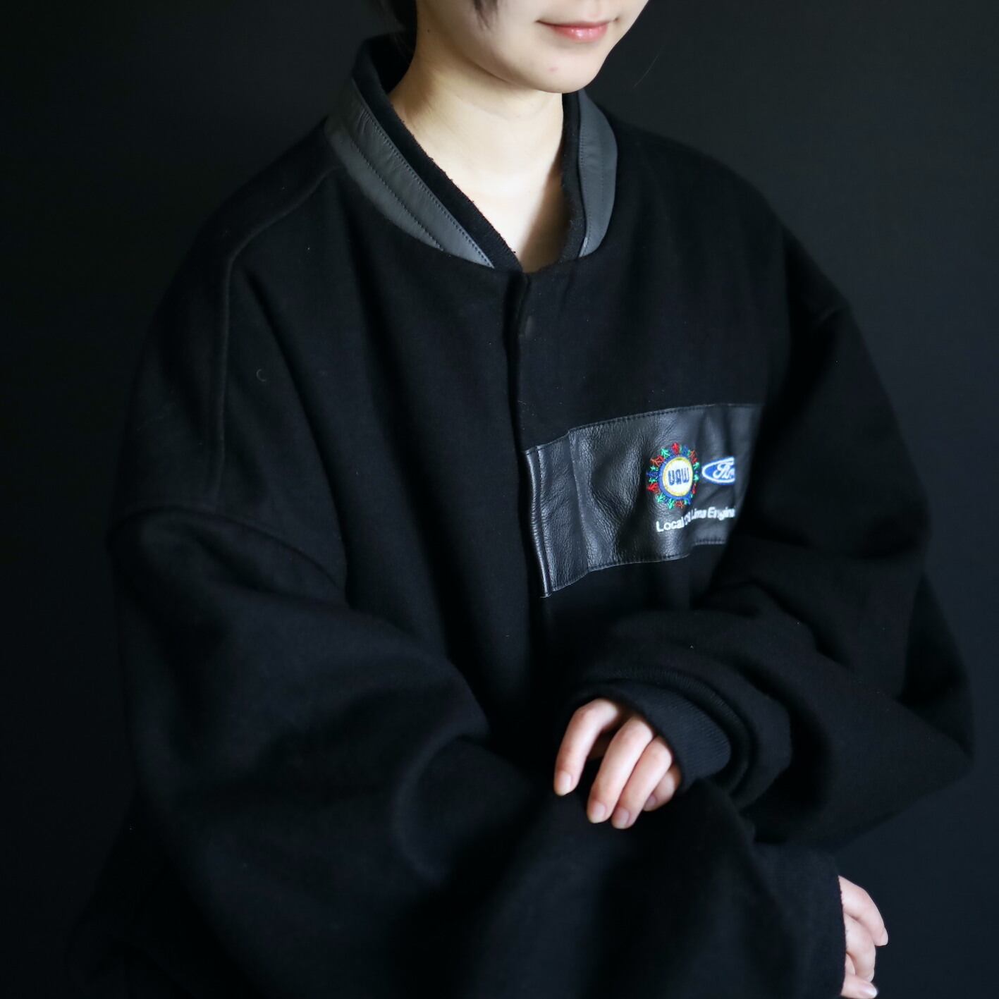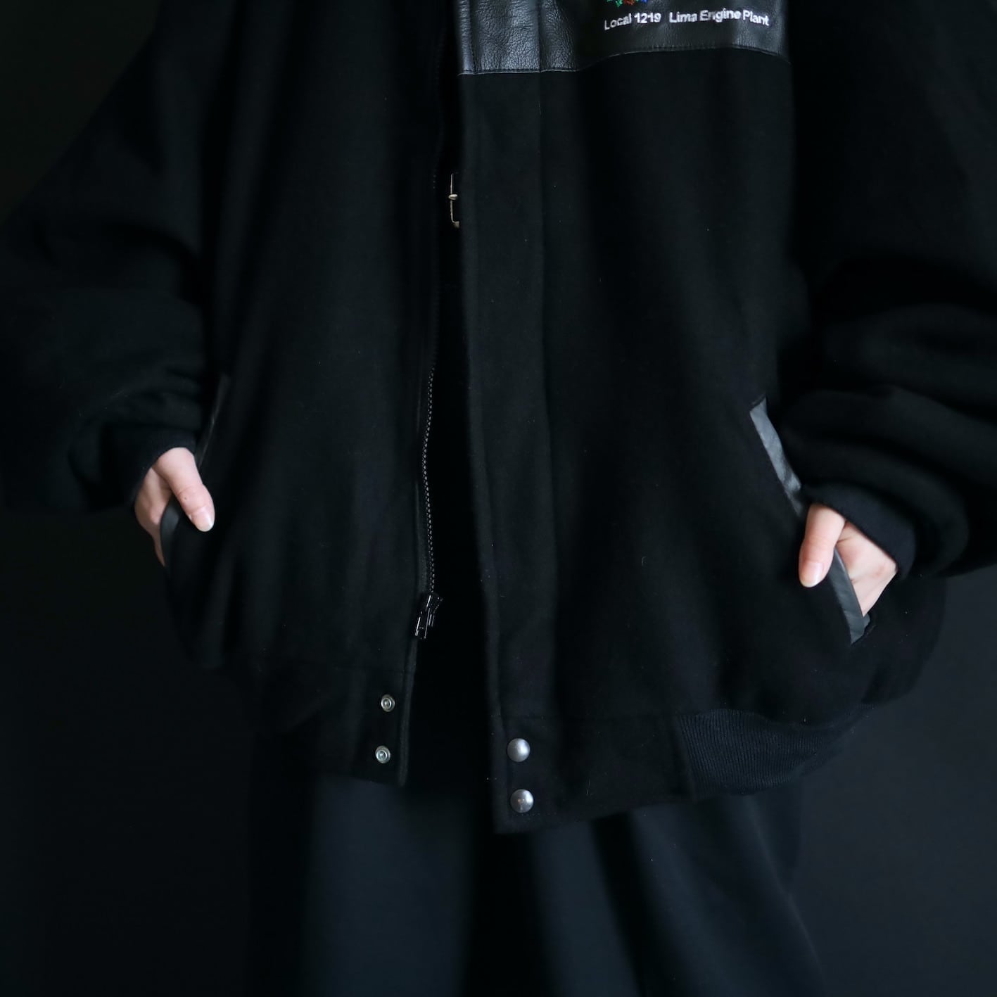 ブラックカラーのウールボディをベースに,左胸部のみレザーのワンポイント切替.