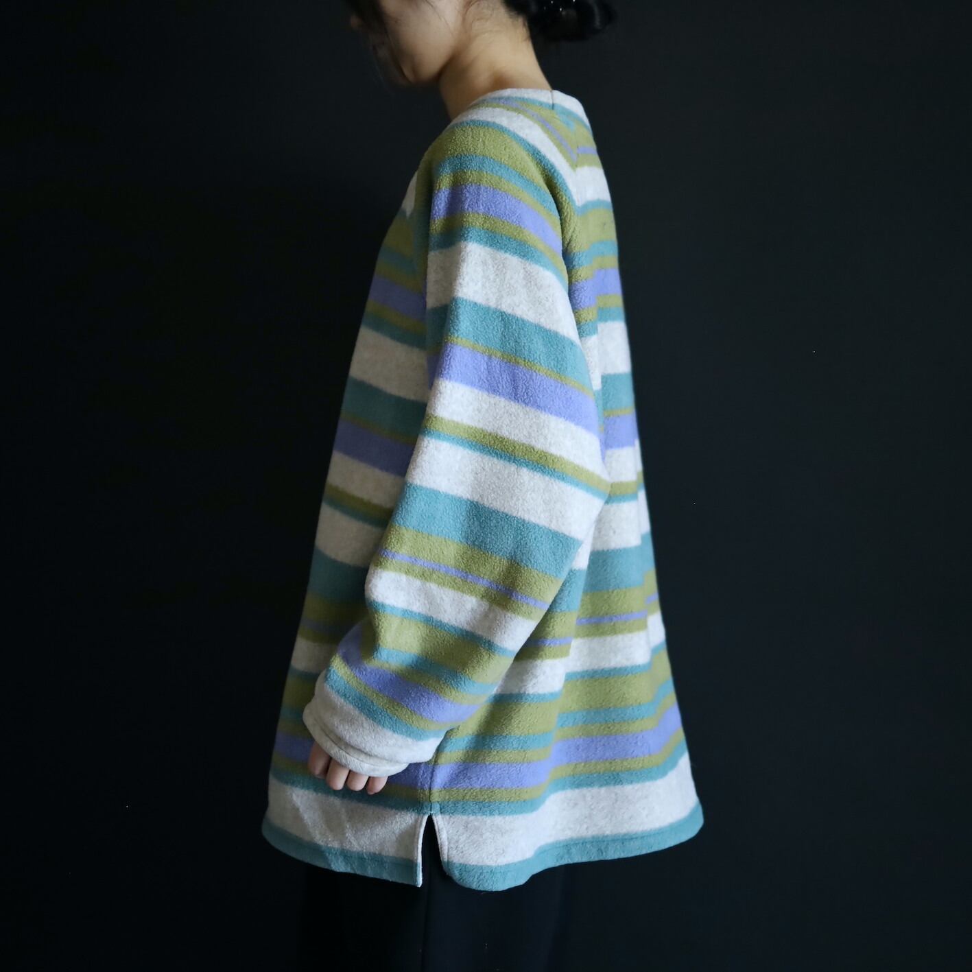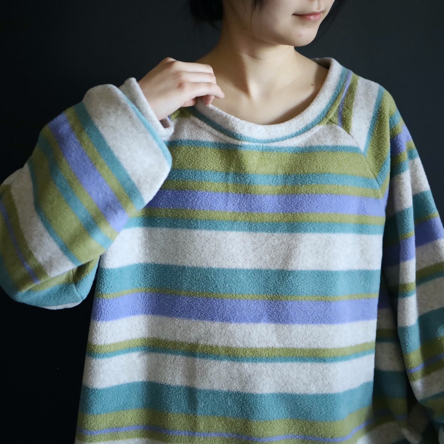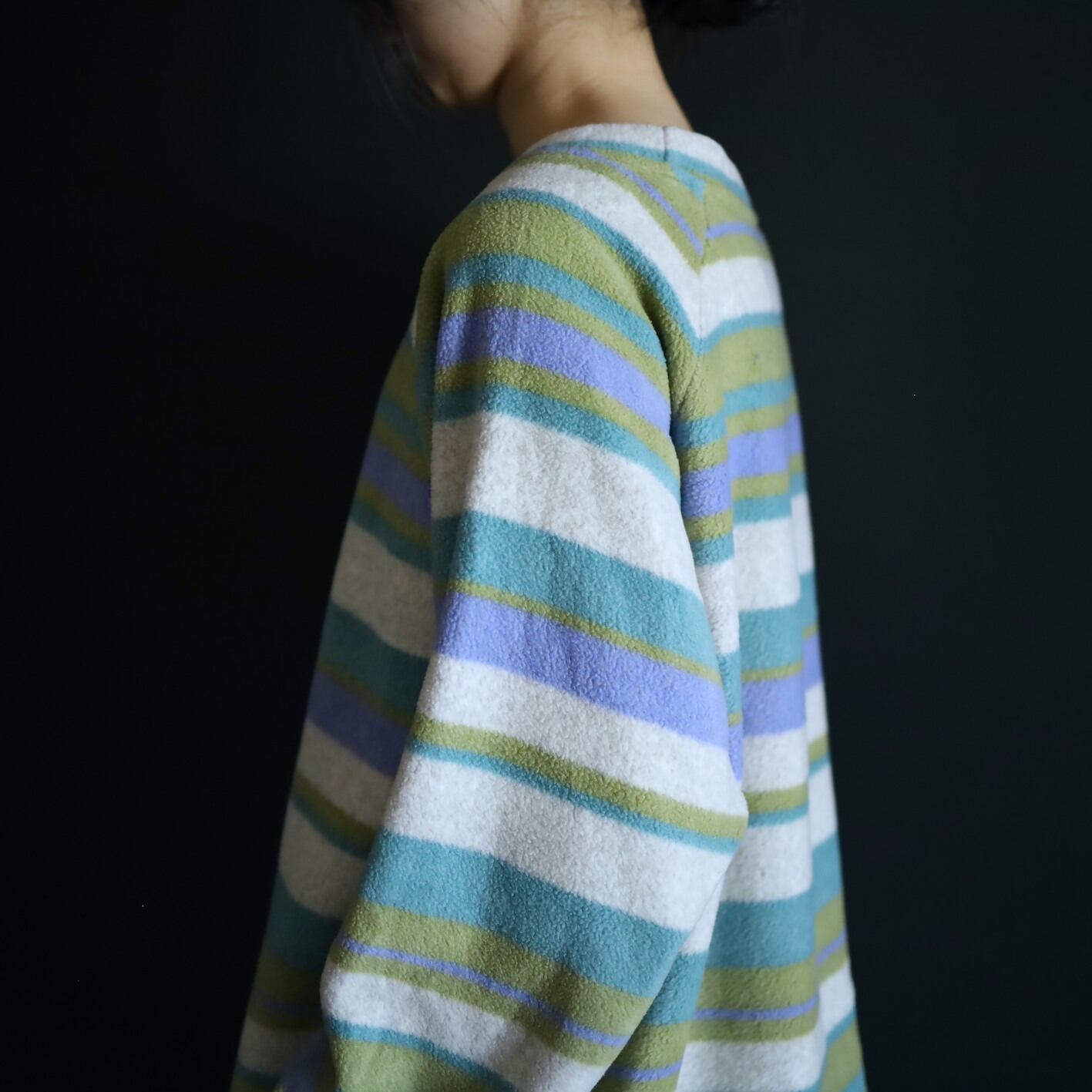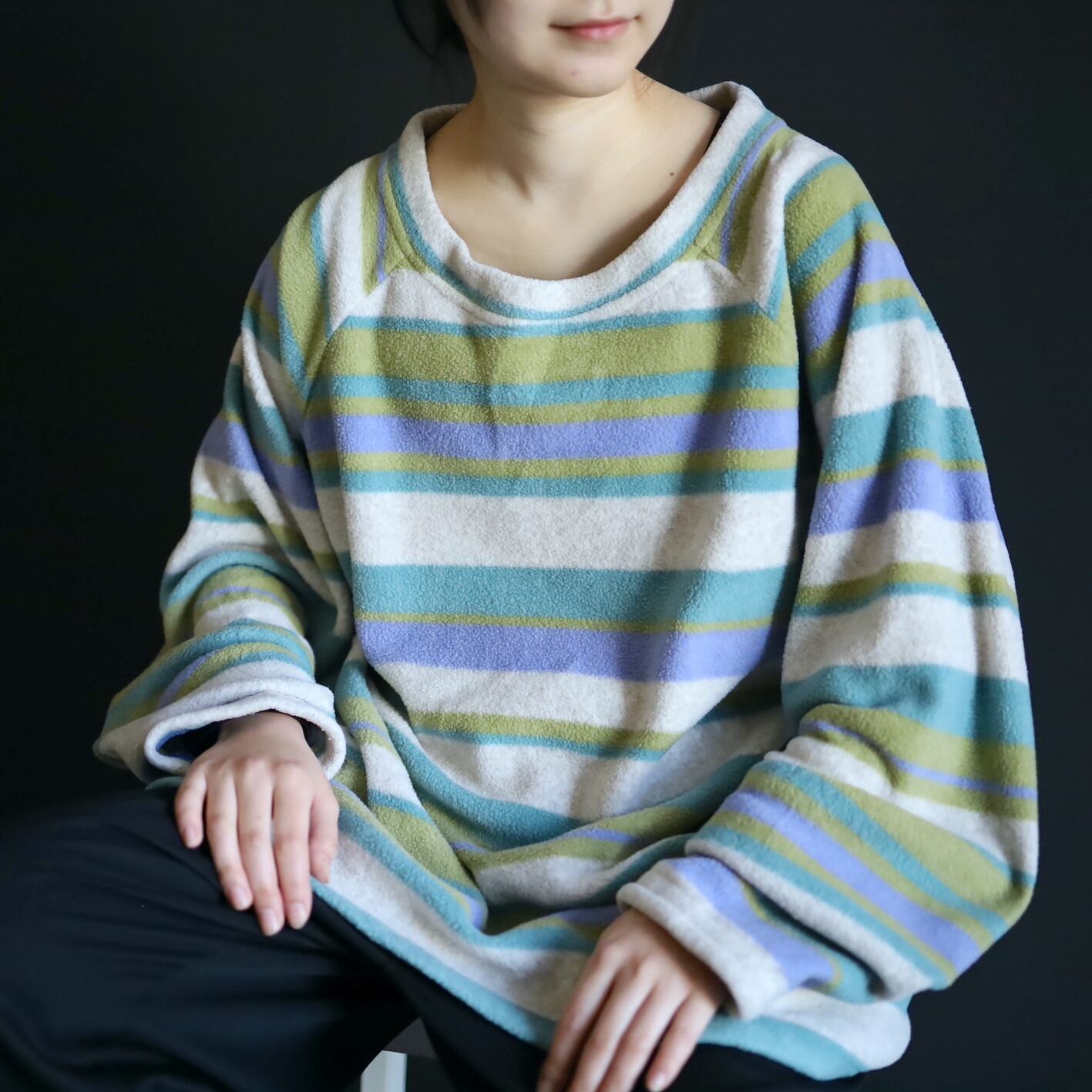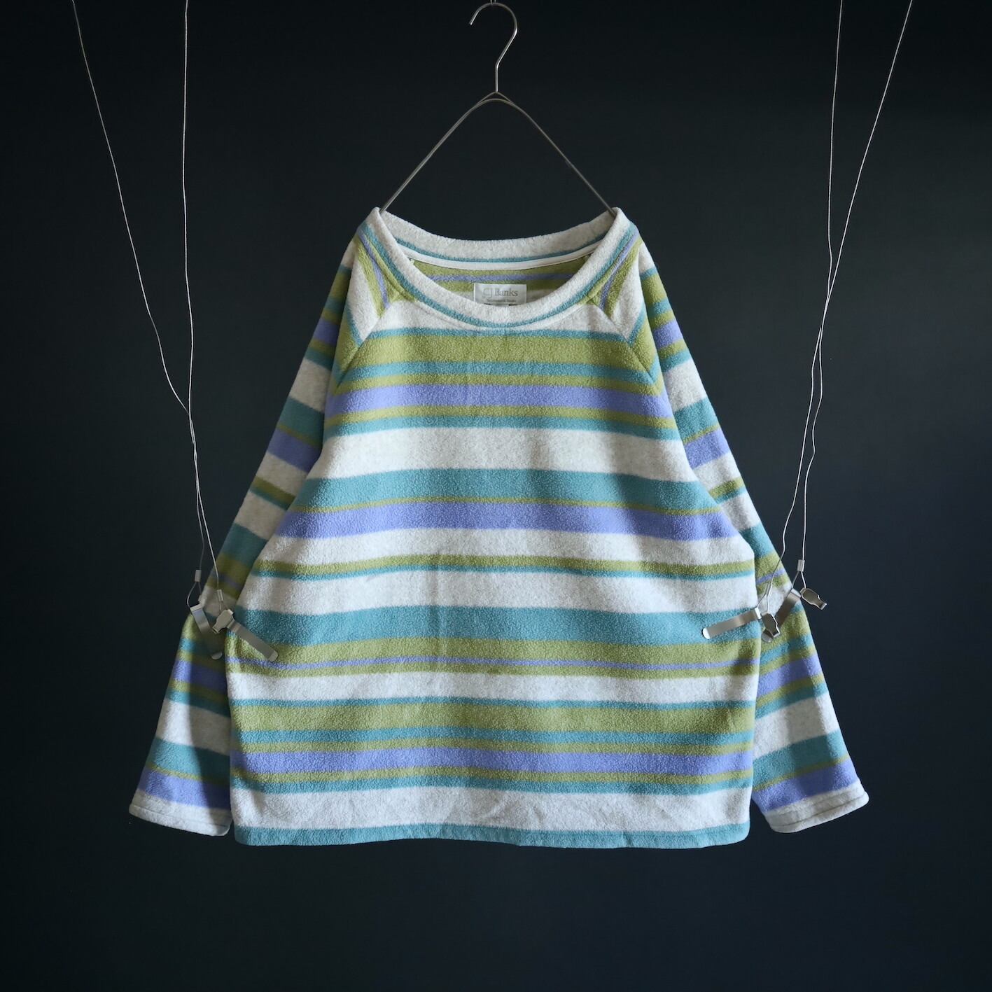 ペールトーン主体のカラーに加えてボーダー柄で脱力感が特に強めのアイテムのため,スラックスなどと合わせてバランス取るのが吉.