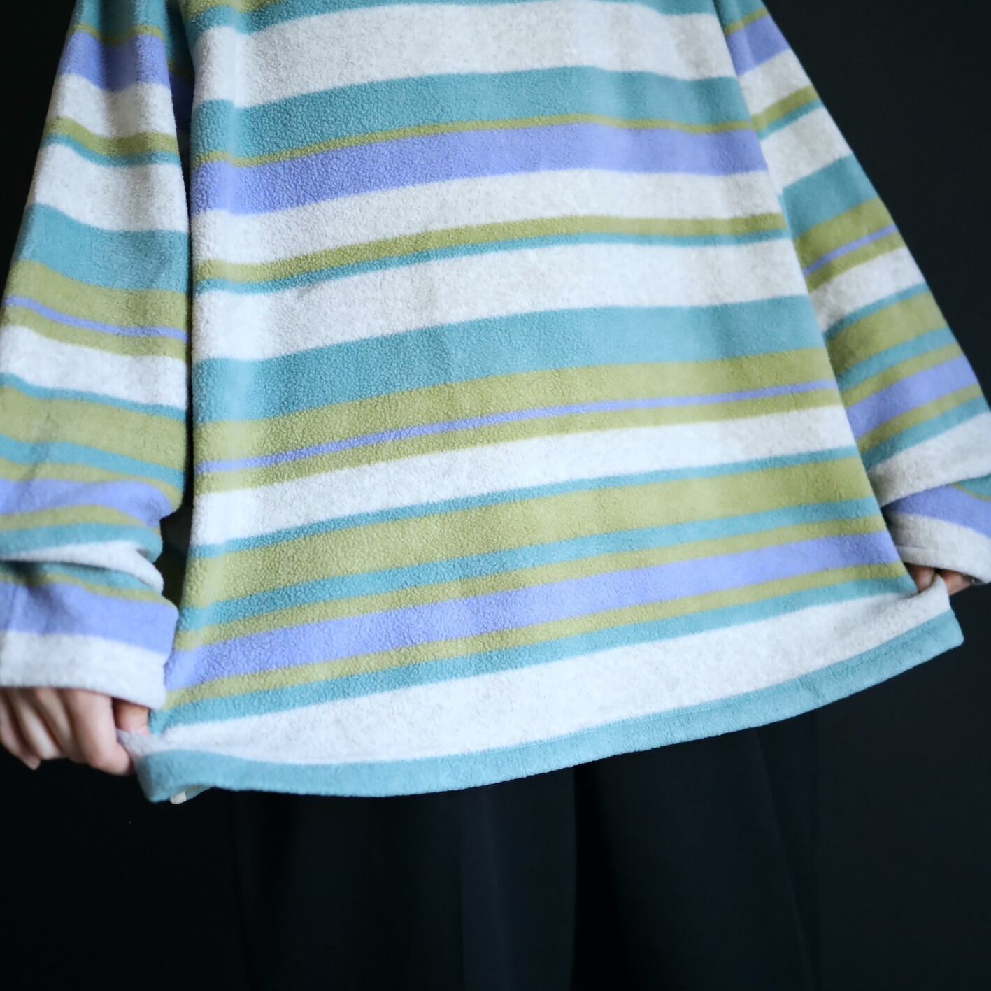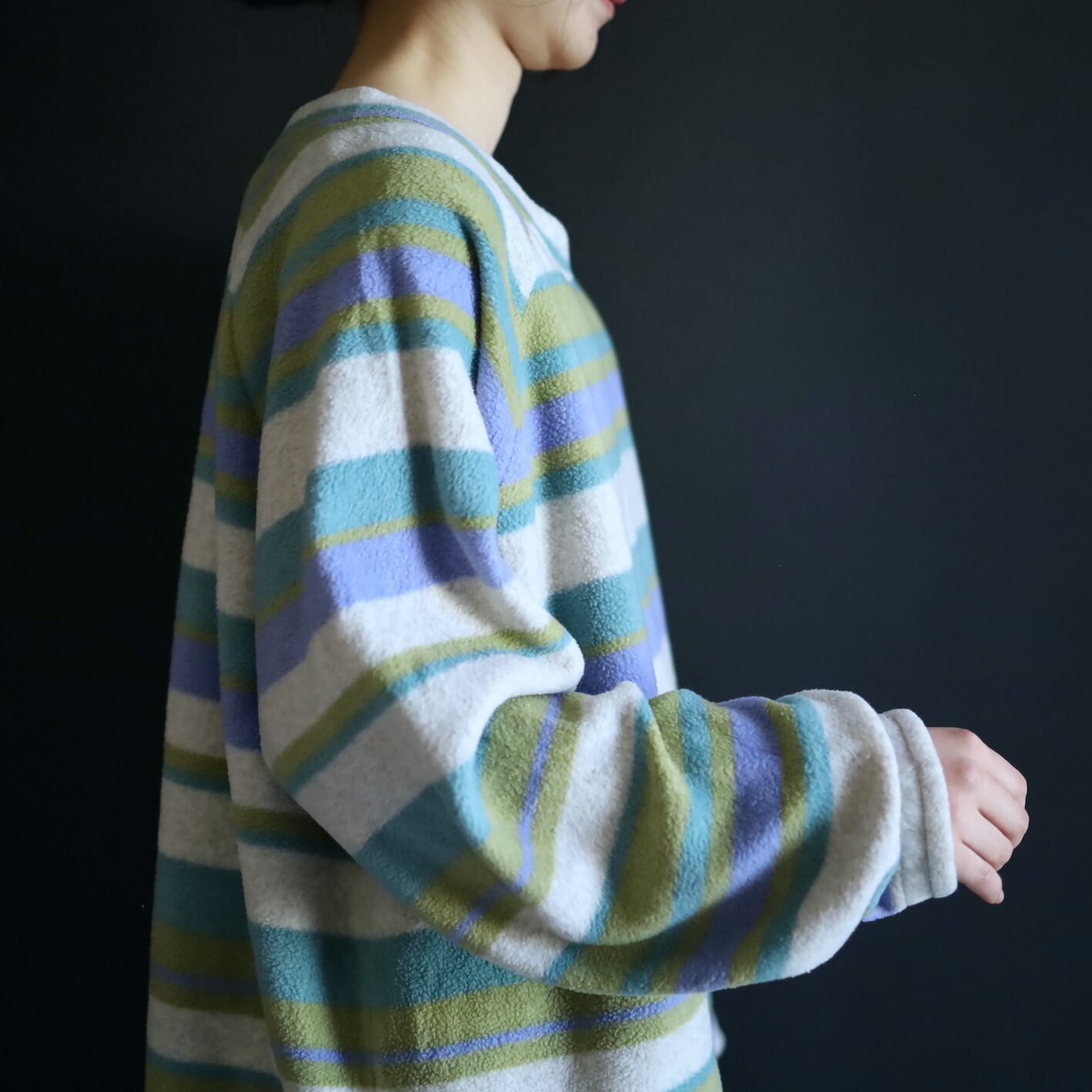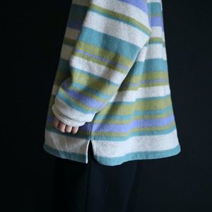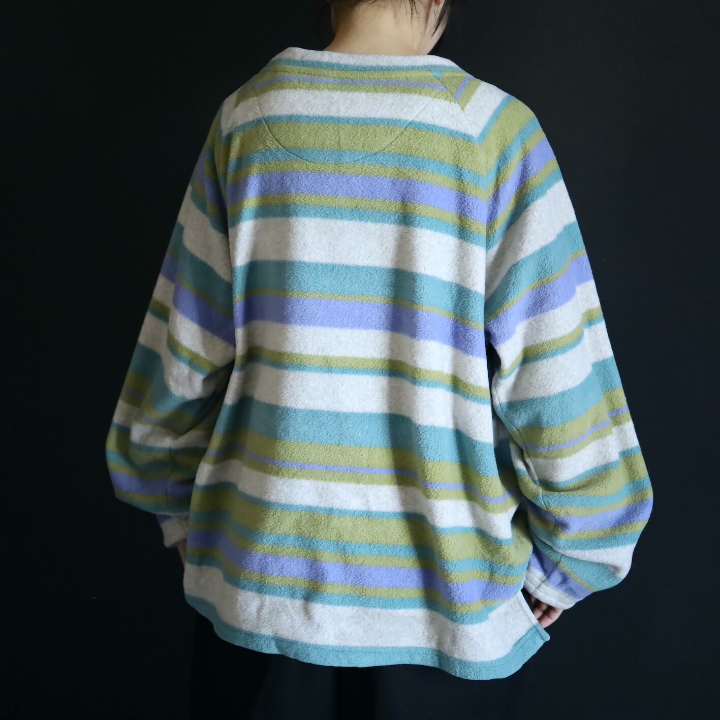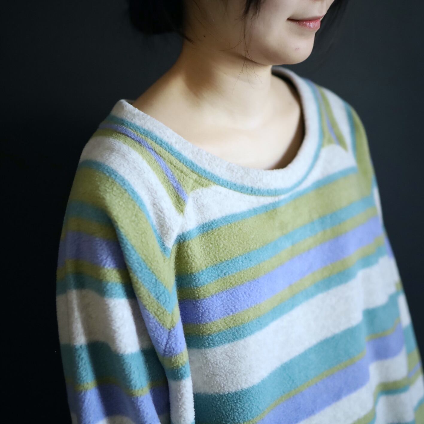 ペールトーン主体のカラーに加えてボーダー柄で脱力感が特に強めのアイテムのため,スラックスなどと合わせてバランス取るのが吉.