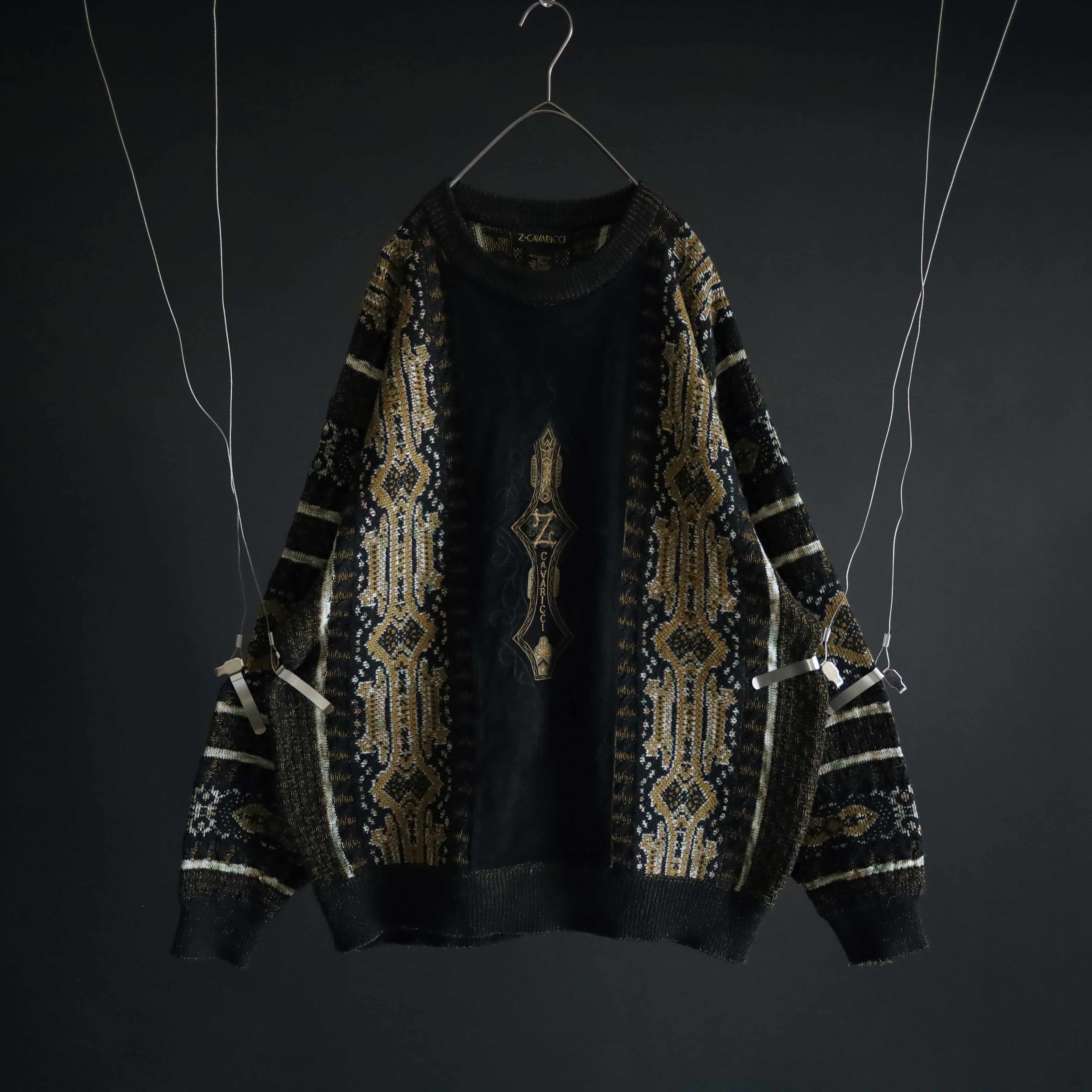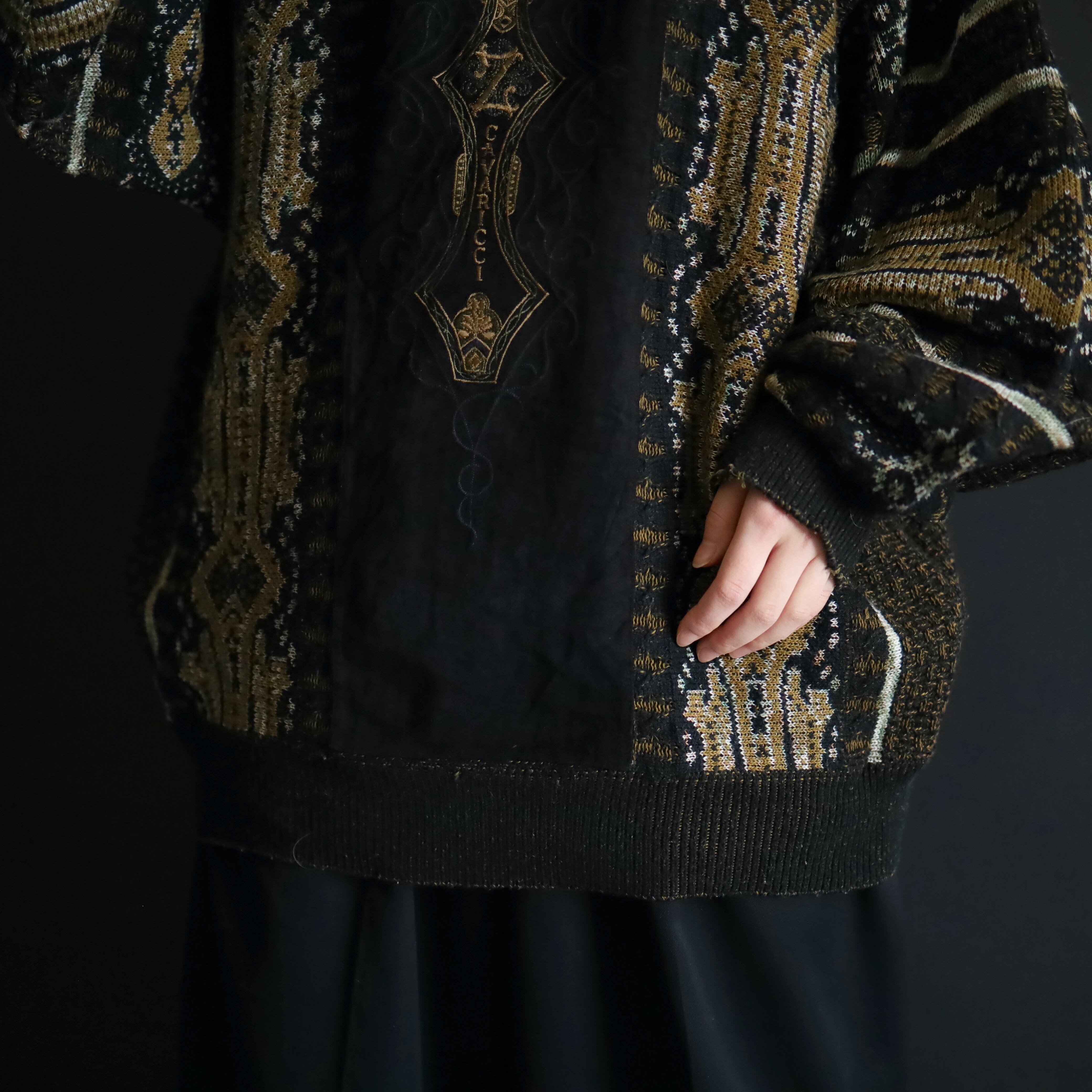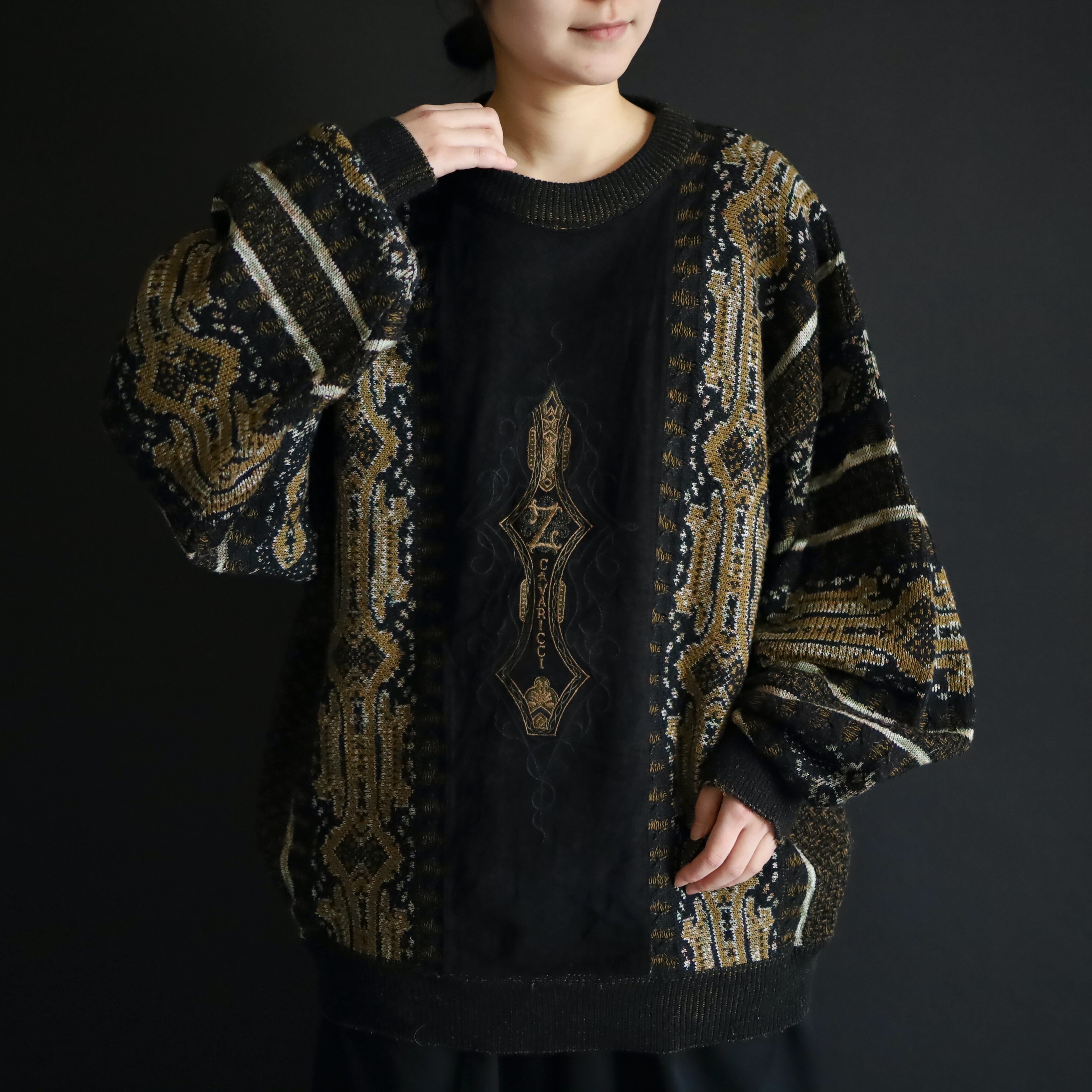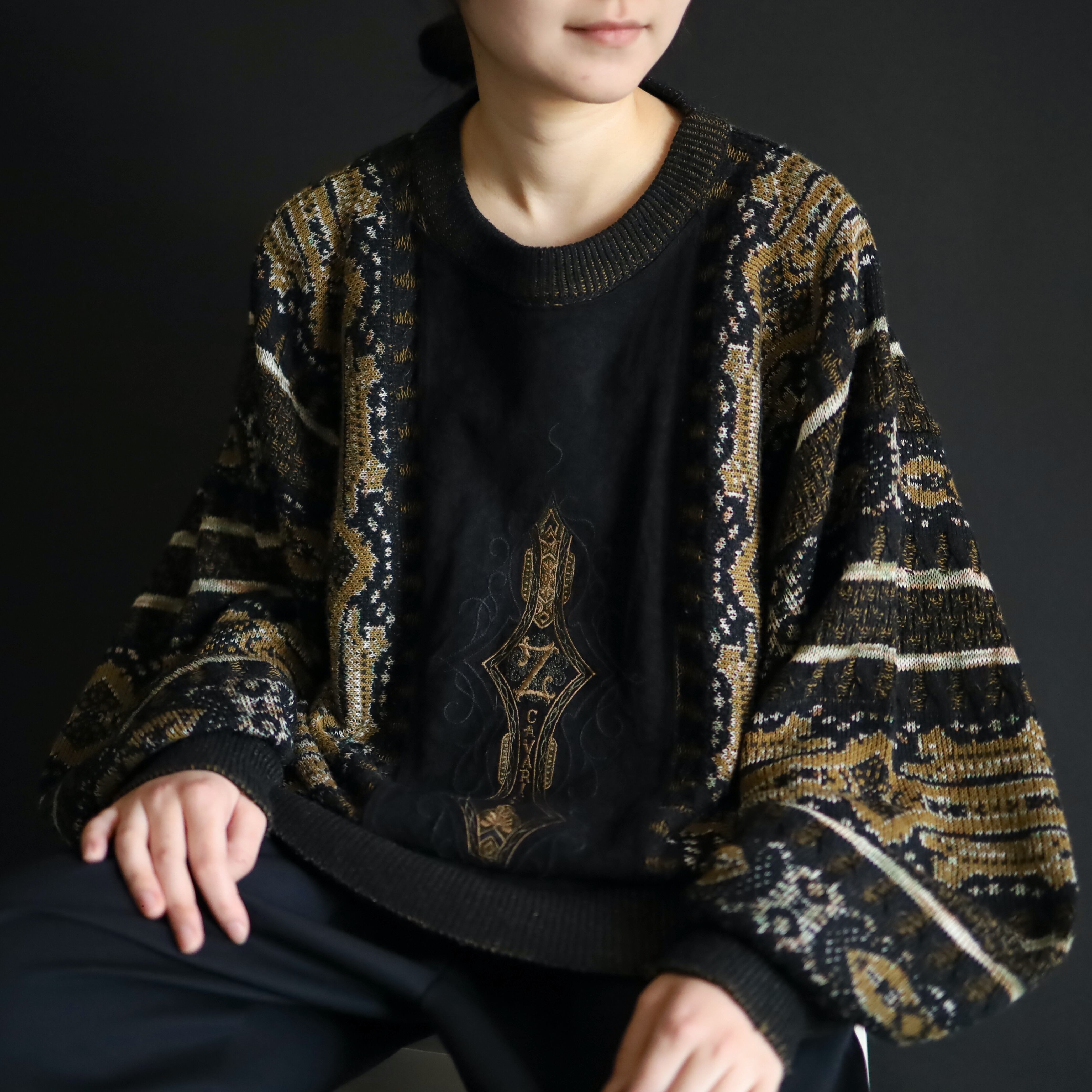 異素材の切替に加えて刺繍デザイン,エレガント,そしてモードなニットセーター.