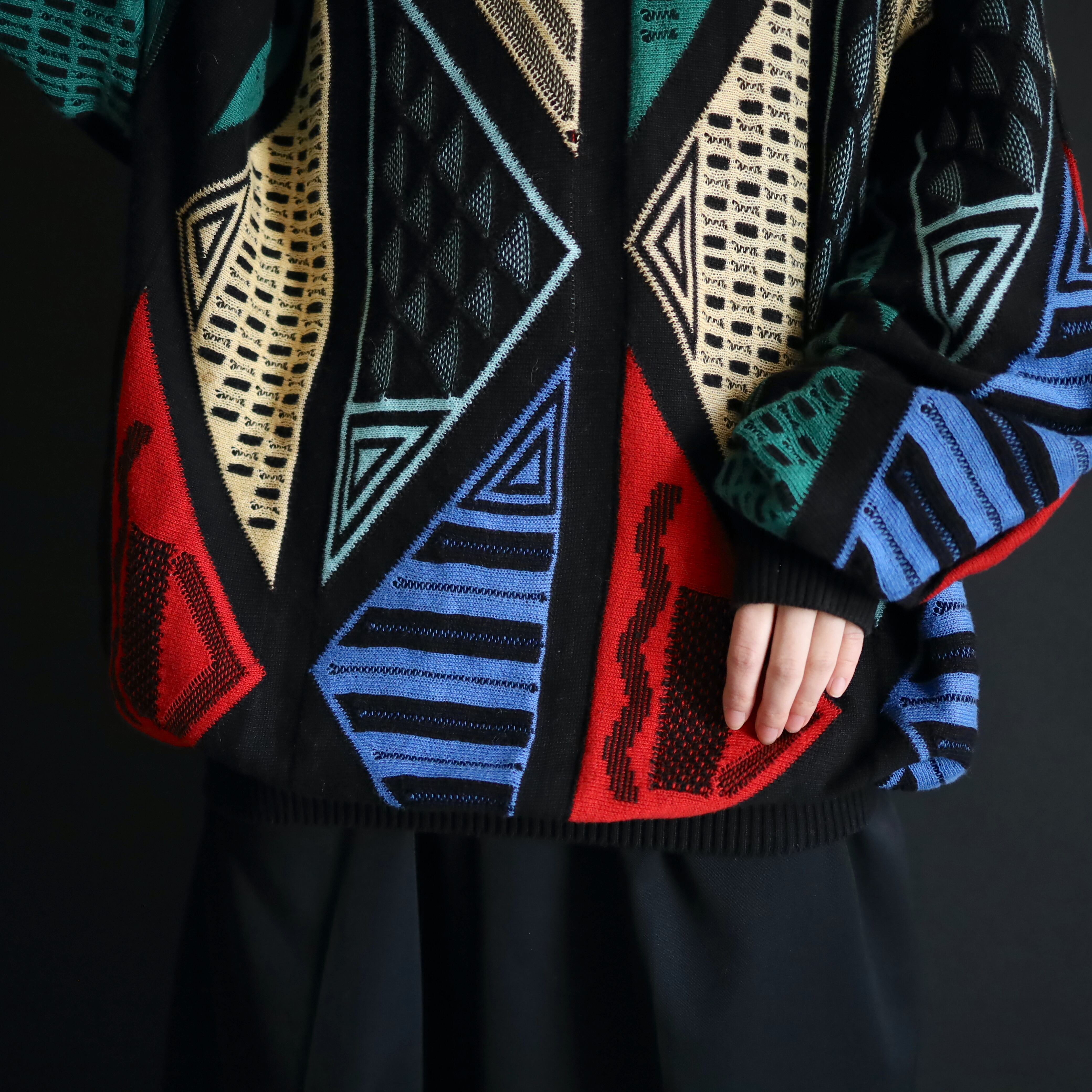 レッド,ブルー,グリーン,ベージュにモノトーン,三角形のパネル切替に加えて,そのパネルの中でそれぞれ柄も異なるデザイン.