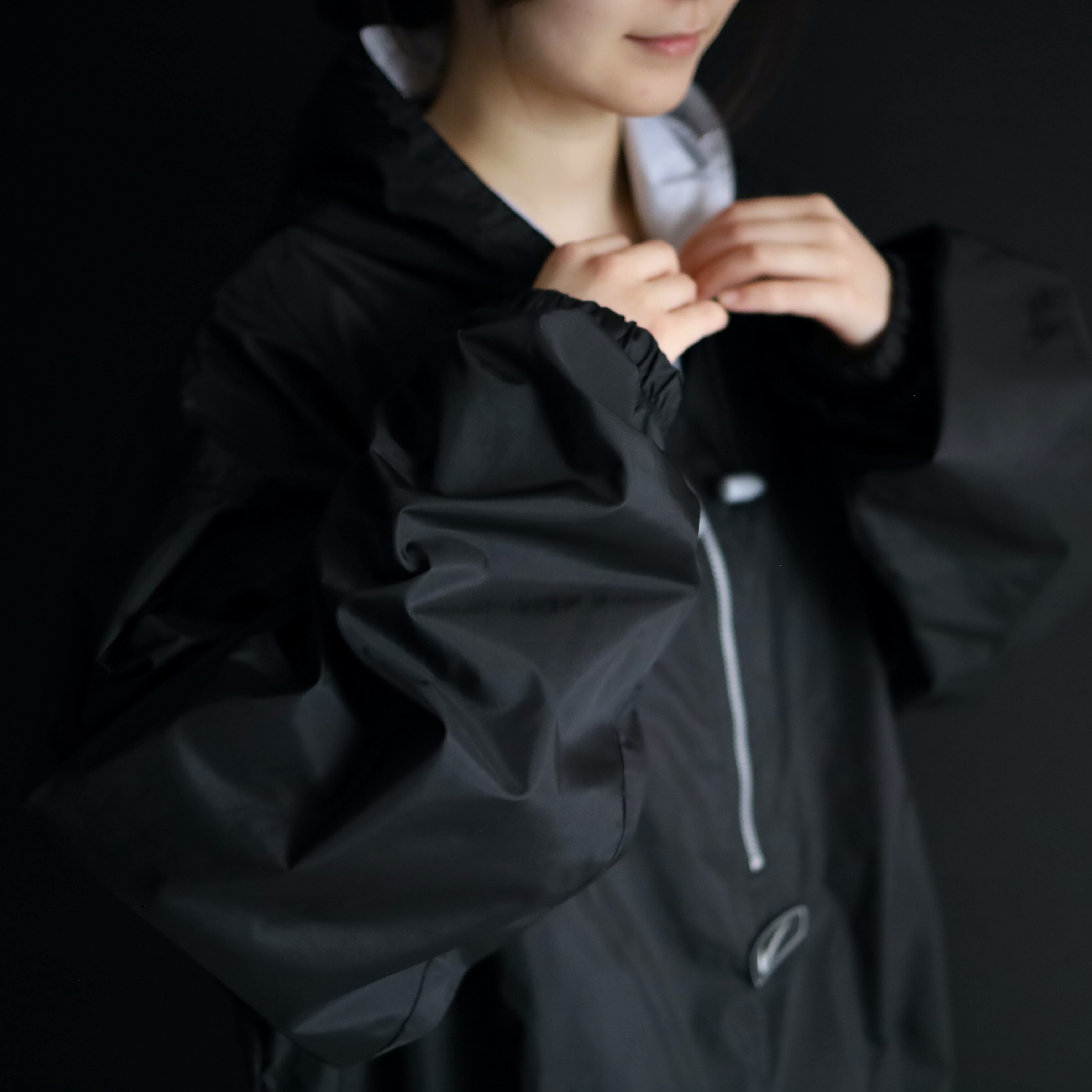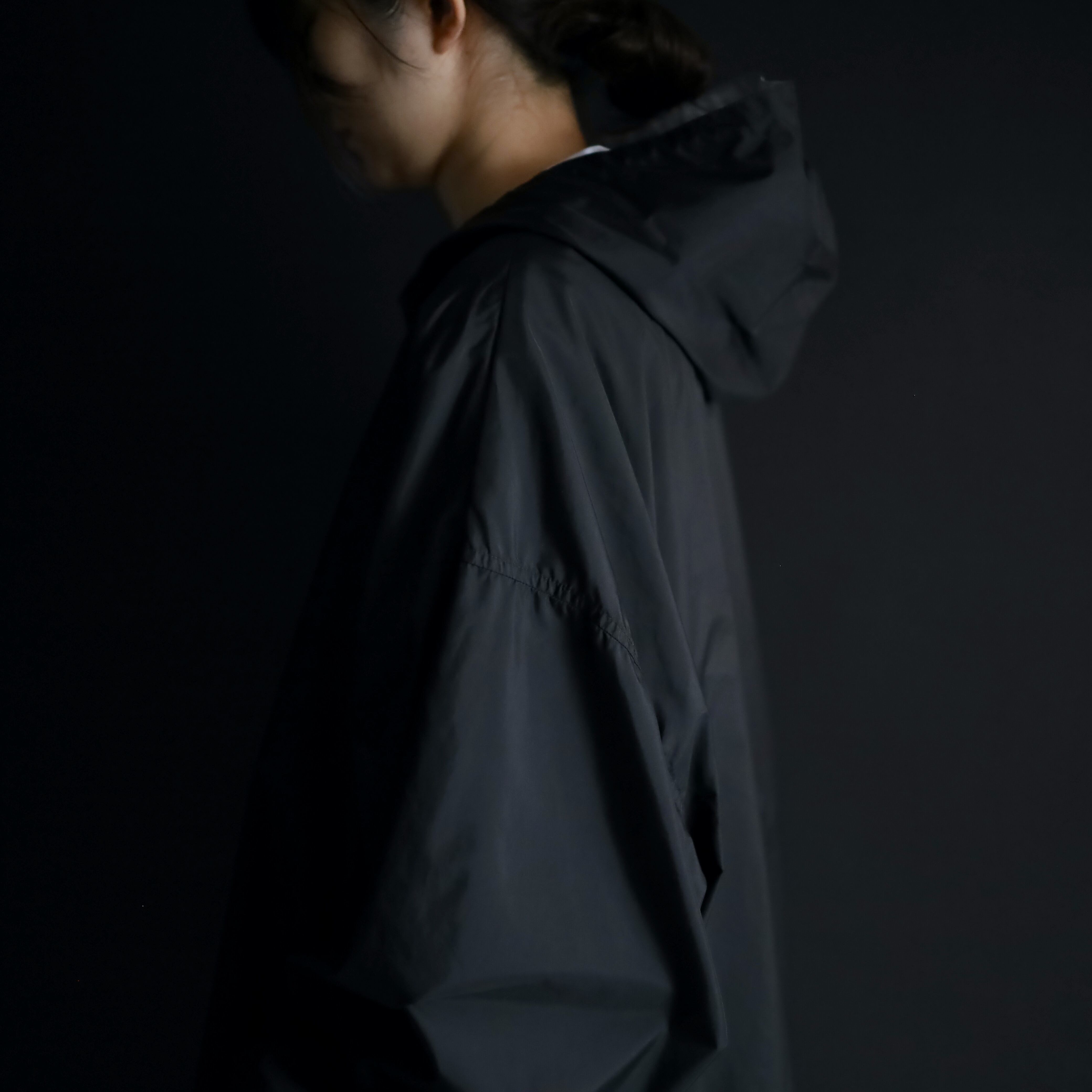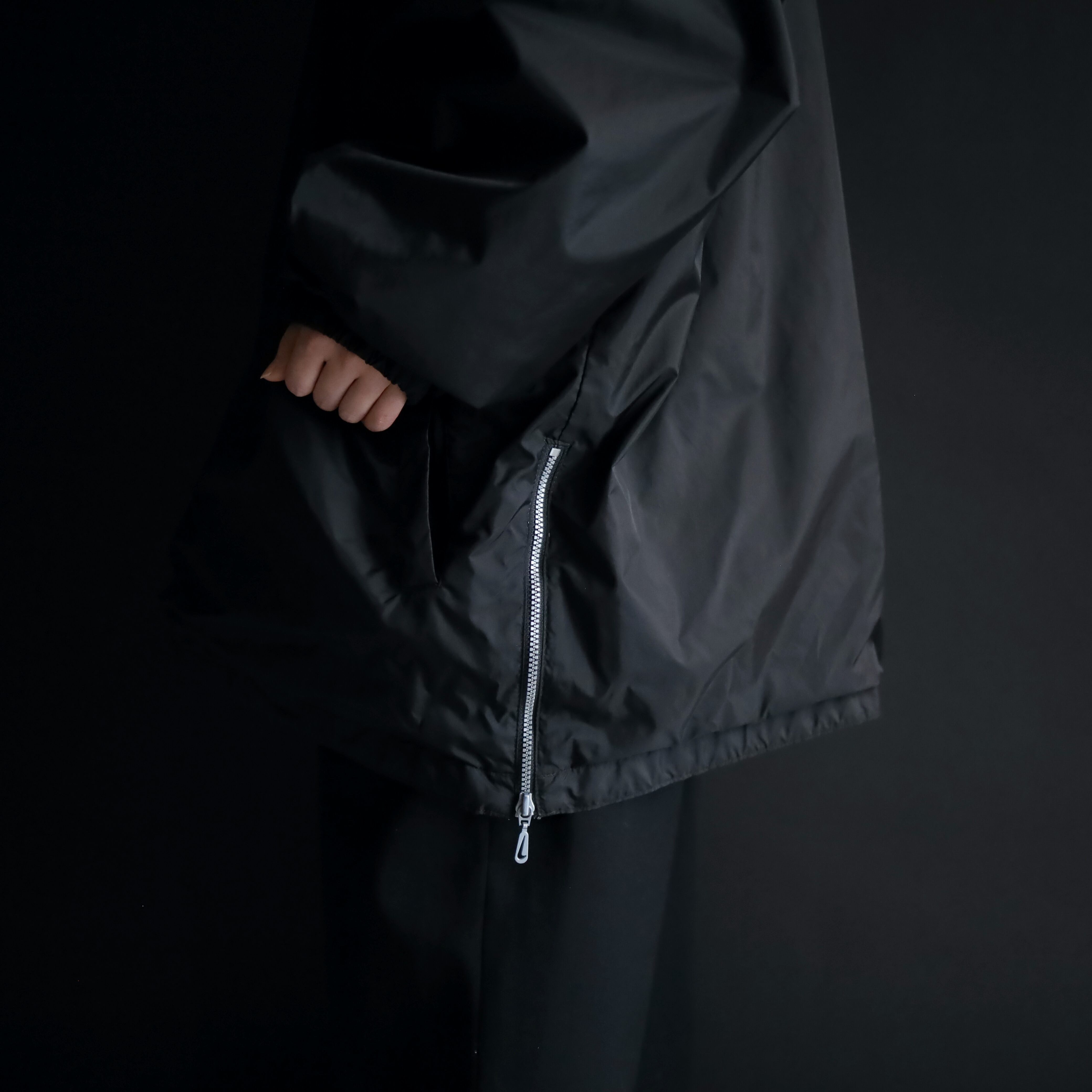 両裾サイドのジッパー,首下のハーフジップは無機質で,ブラックボディとのコントラストが◎