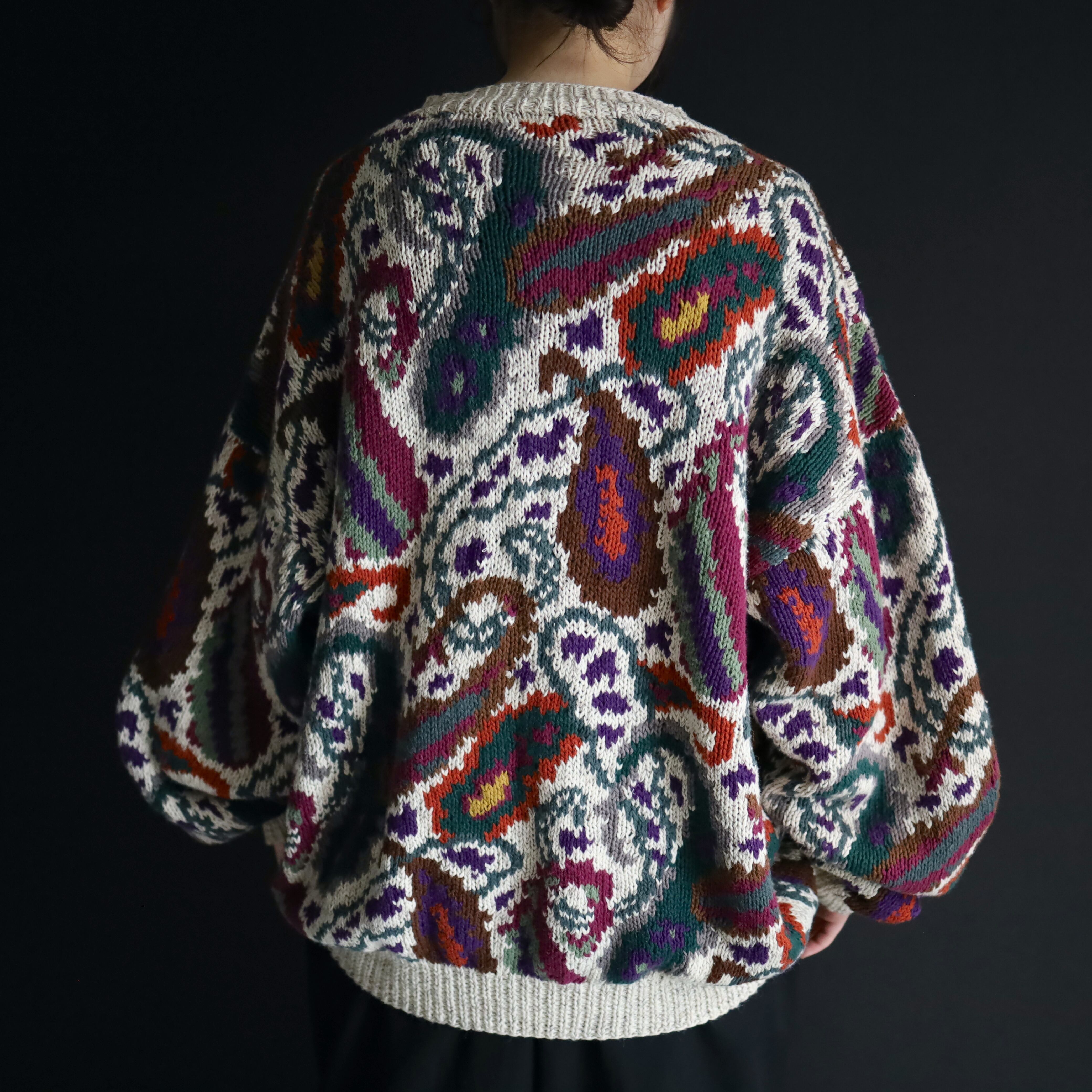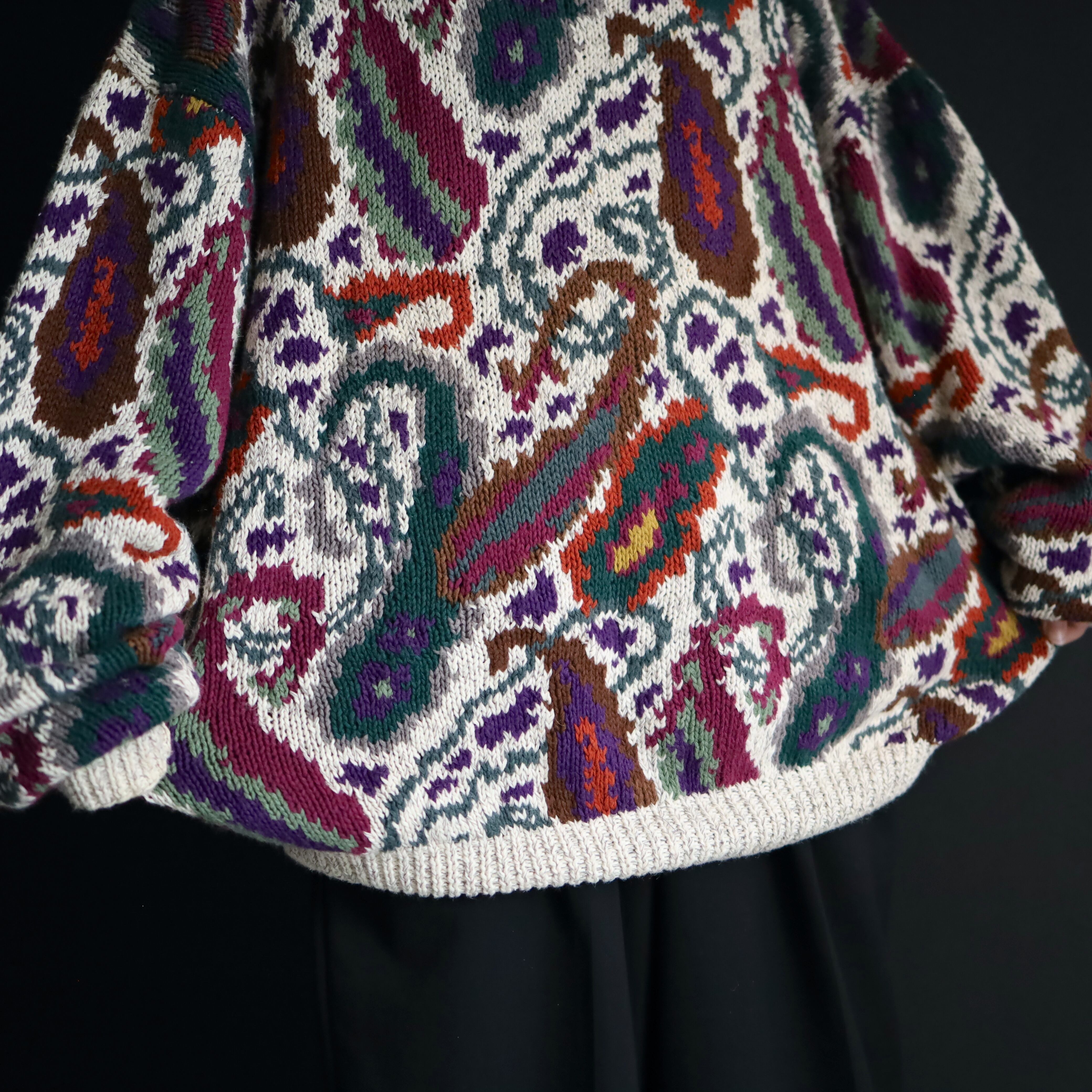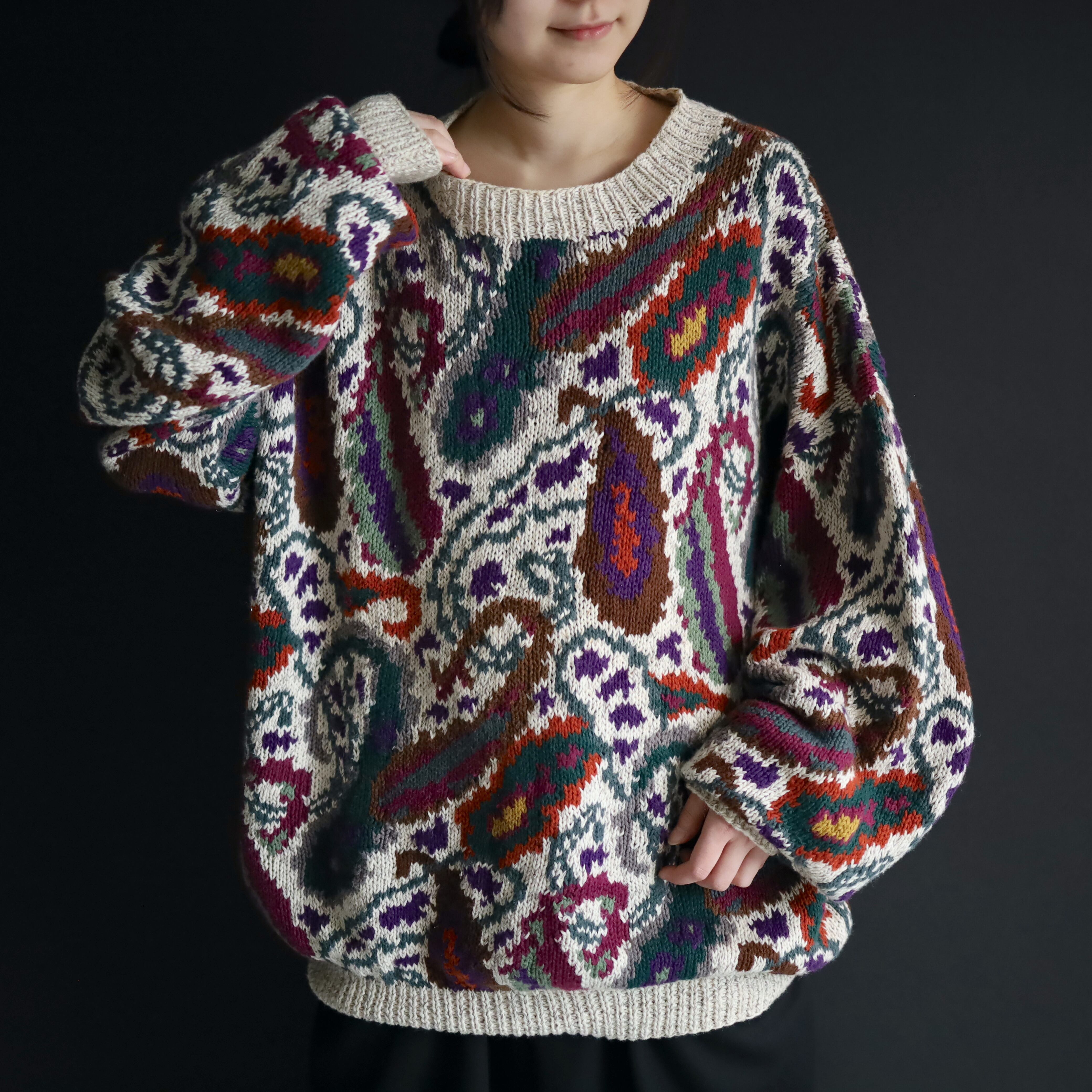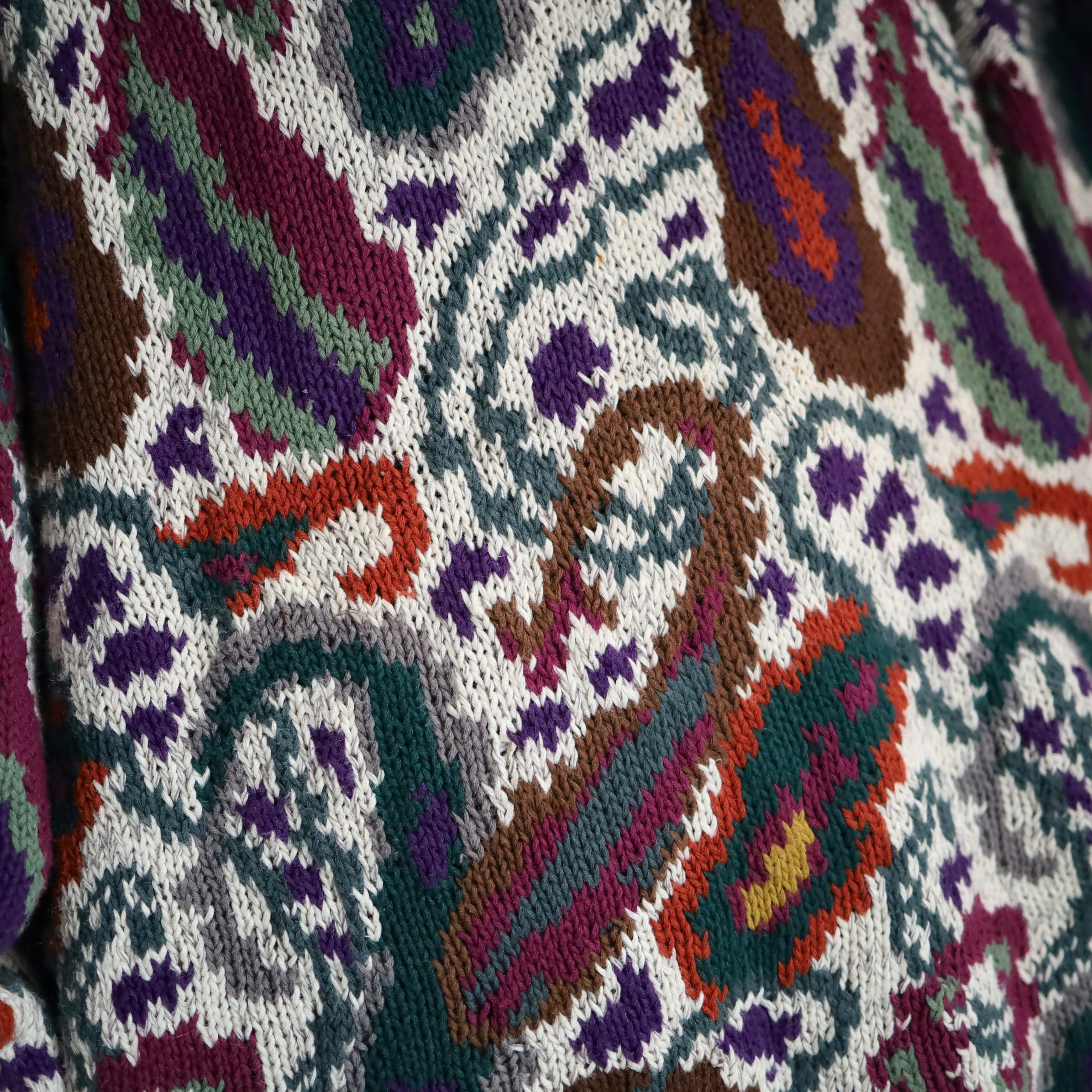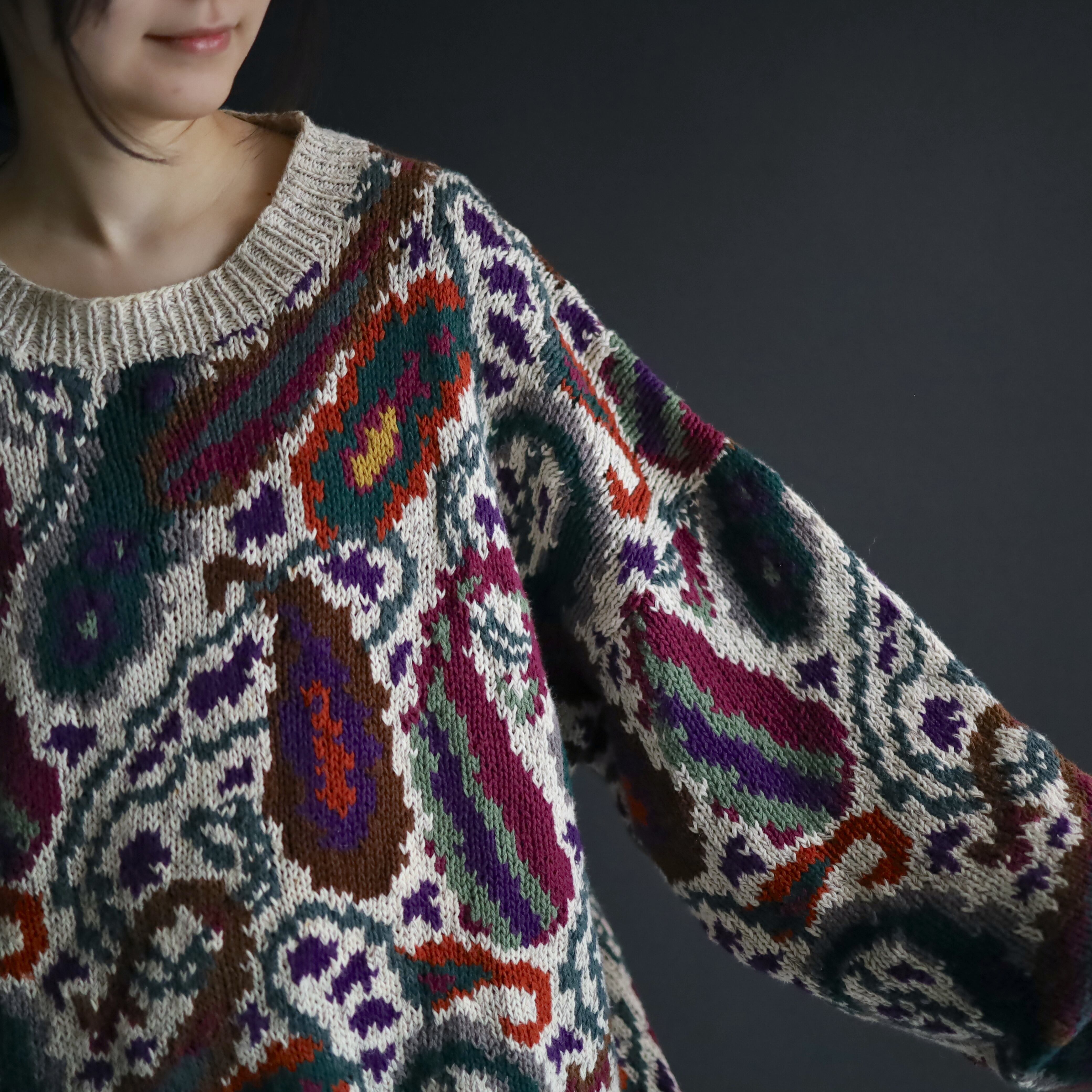 インドのカシミール地方の伝統文様として発展した,ペイズリー柄が全体にデザインされたニットセーター.