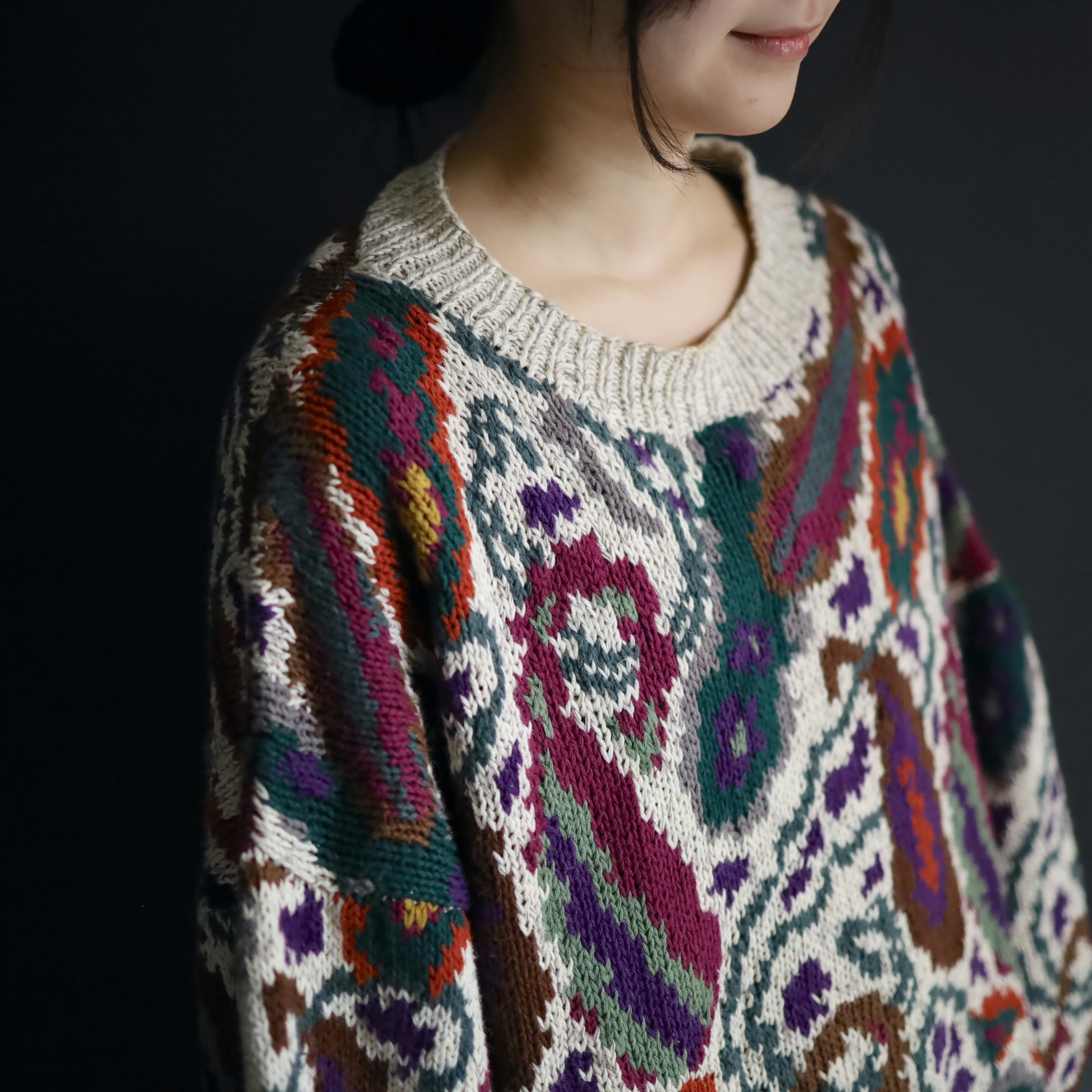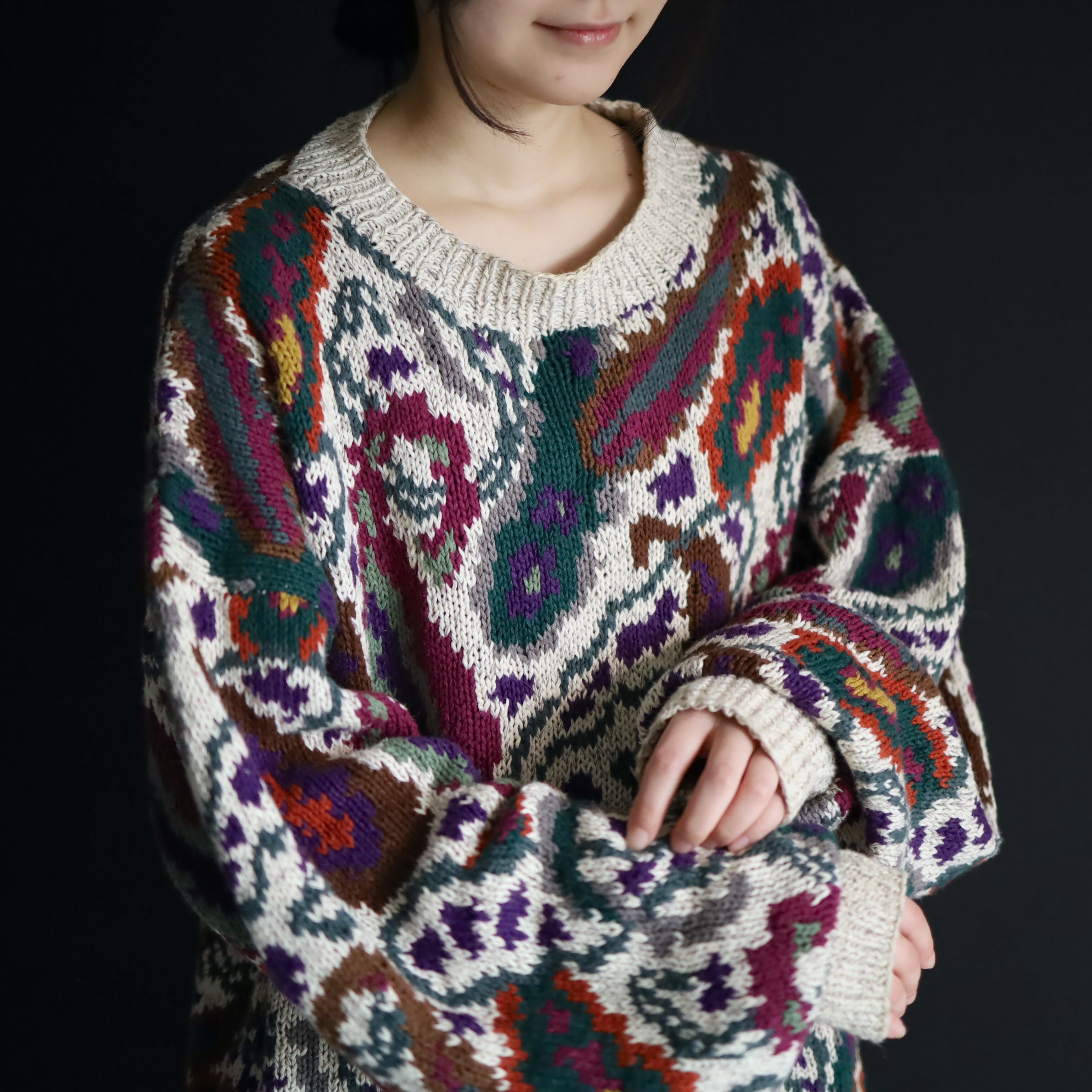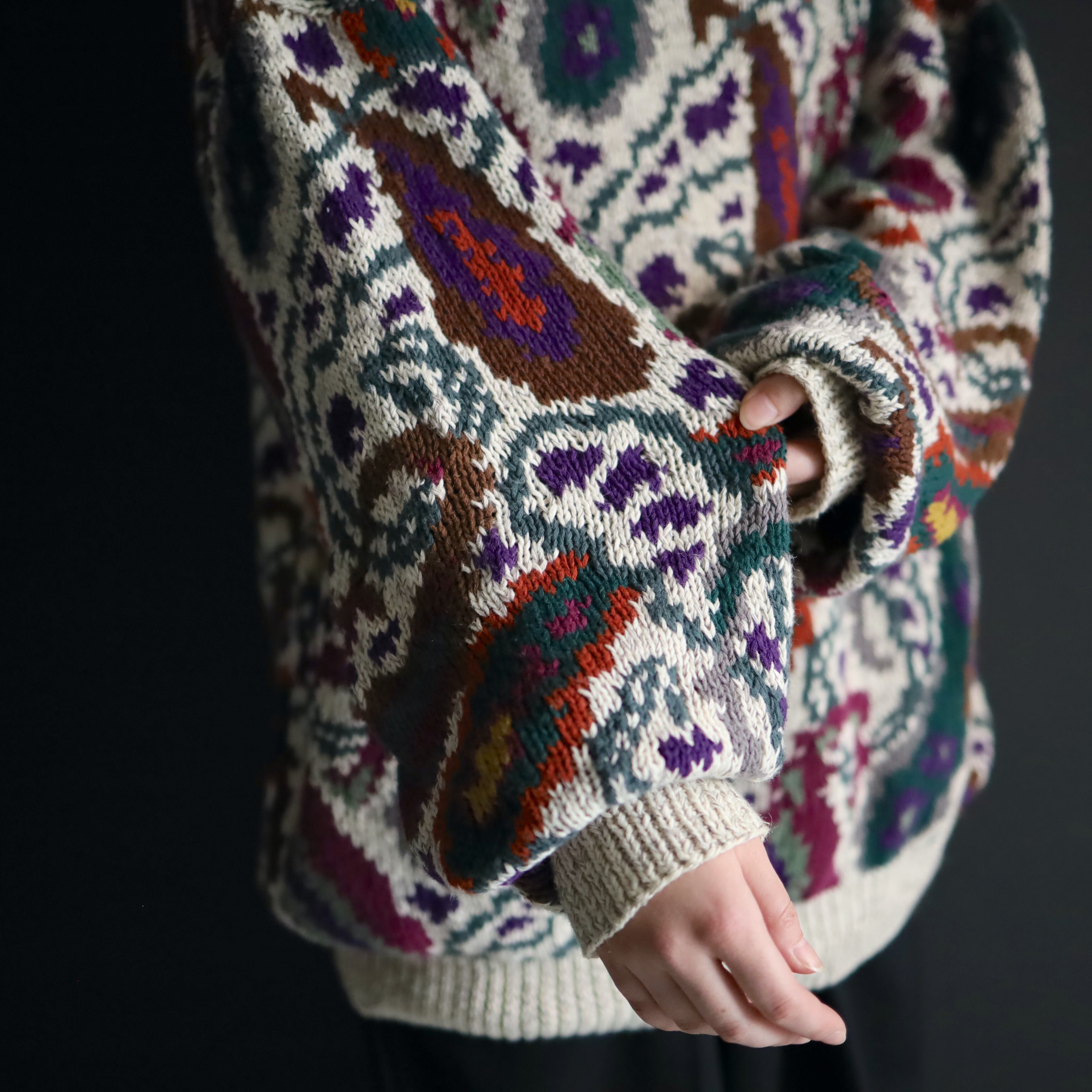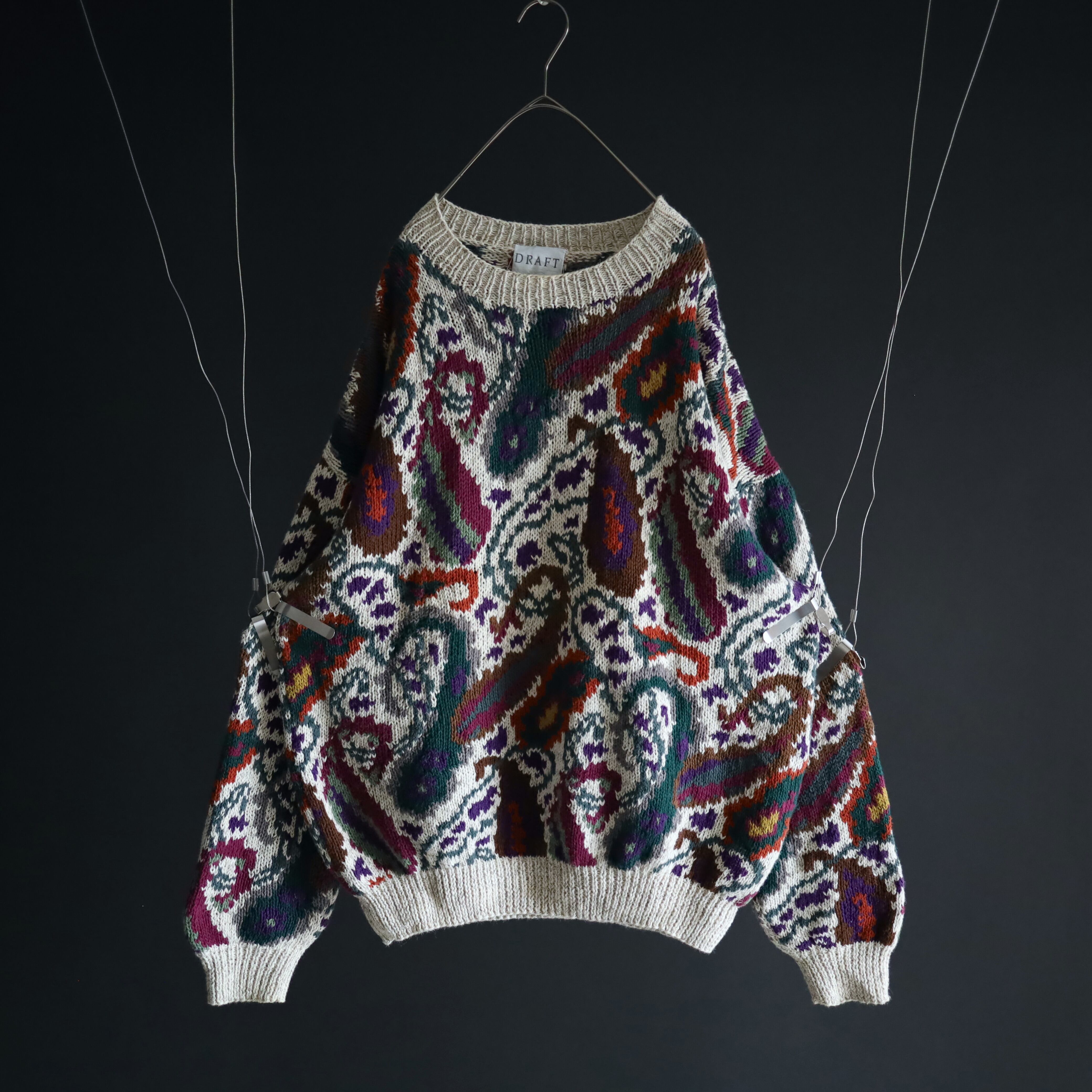 インドのカシミール地方の伝統文様として発展した,ペイズリー柄が全体にデザインされたニットセーター.