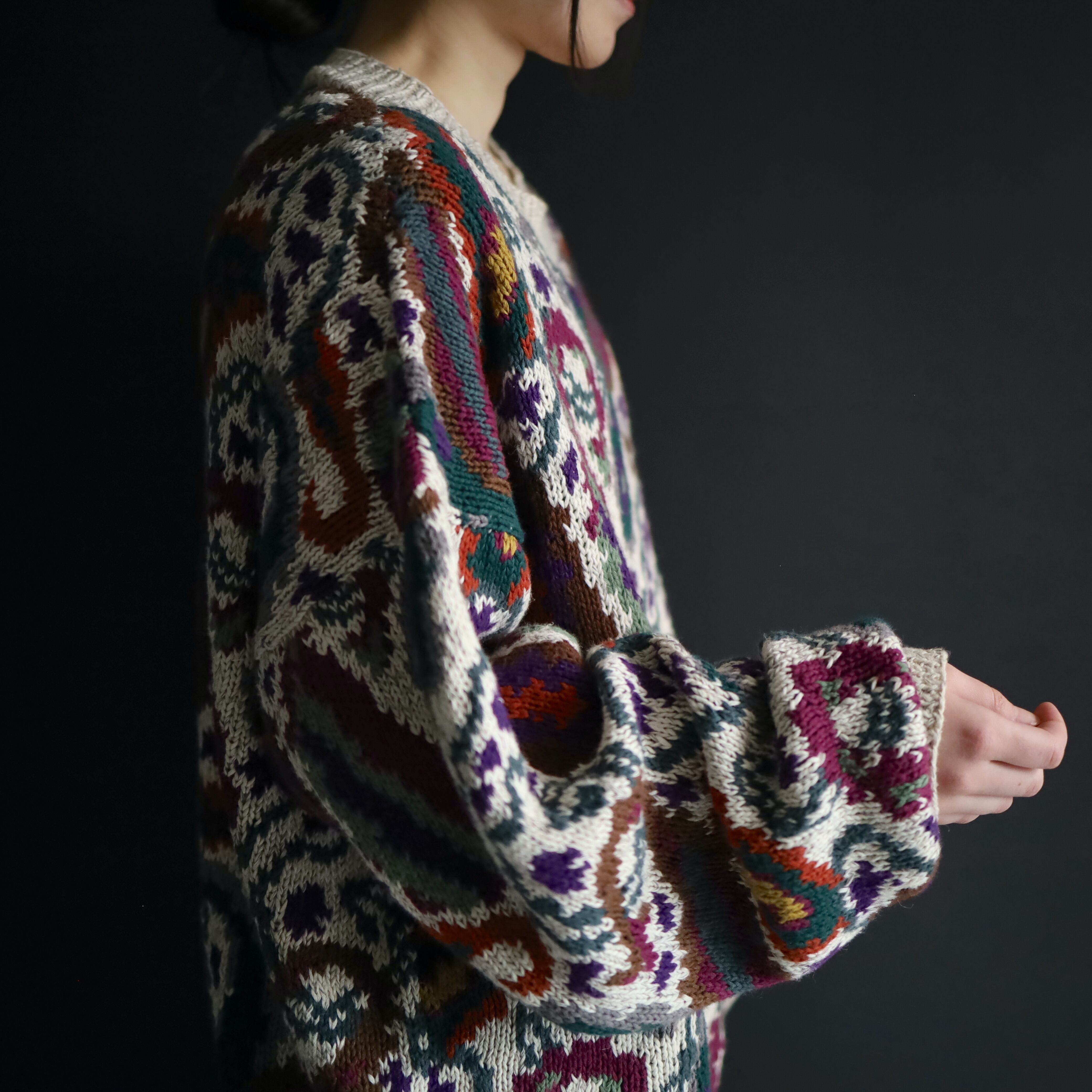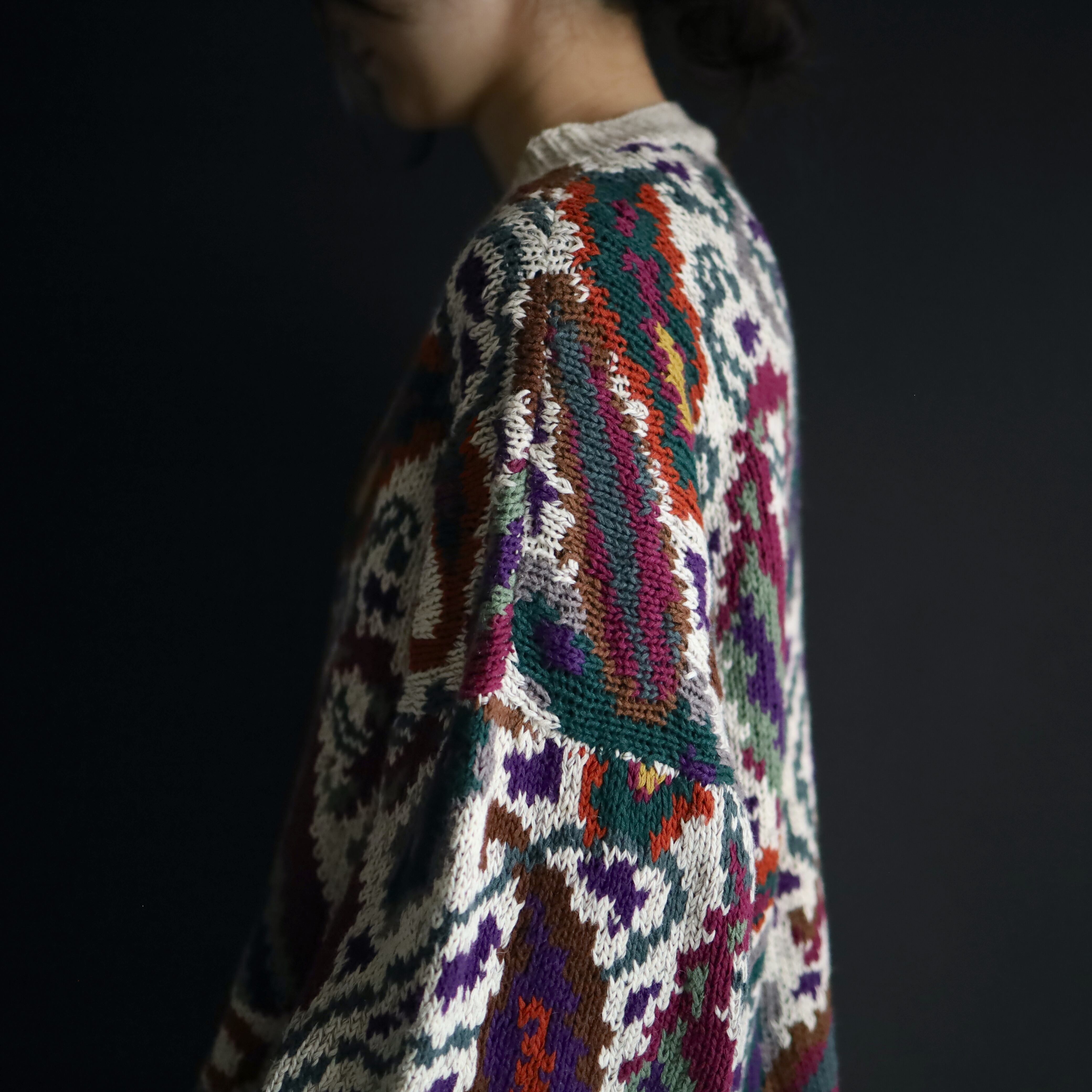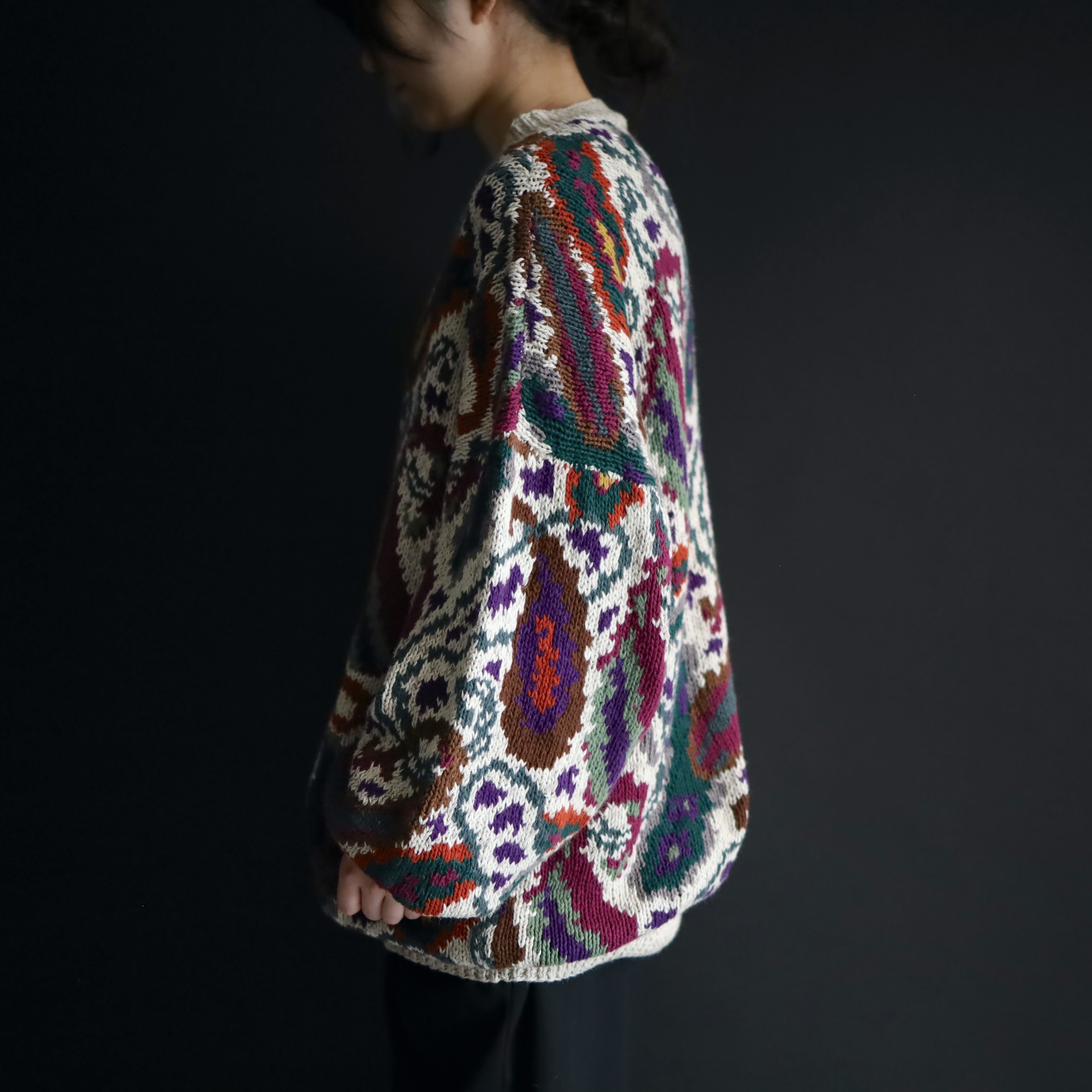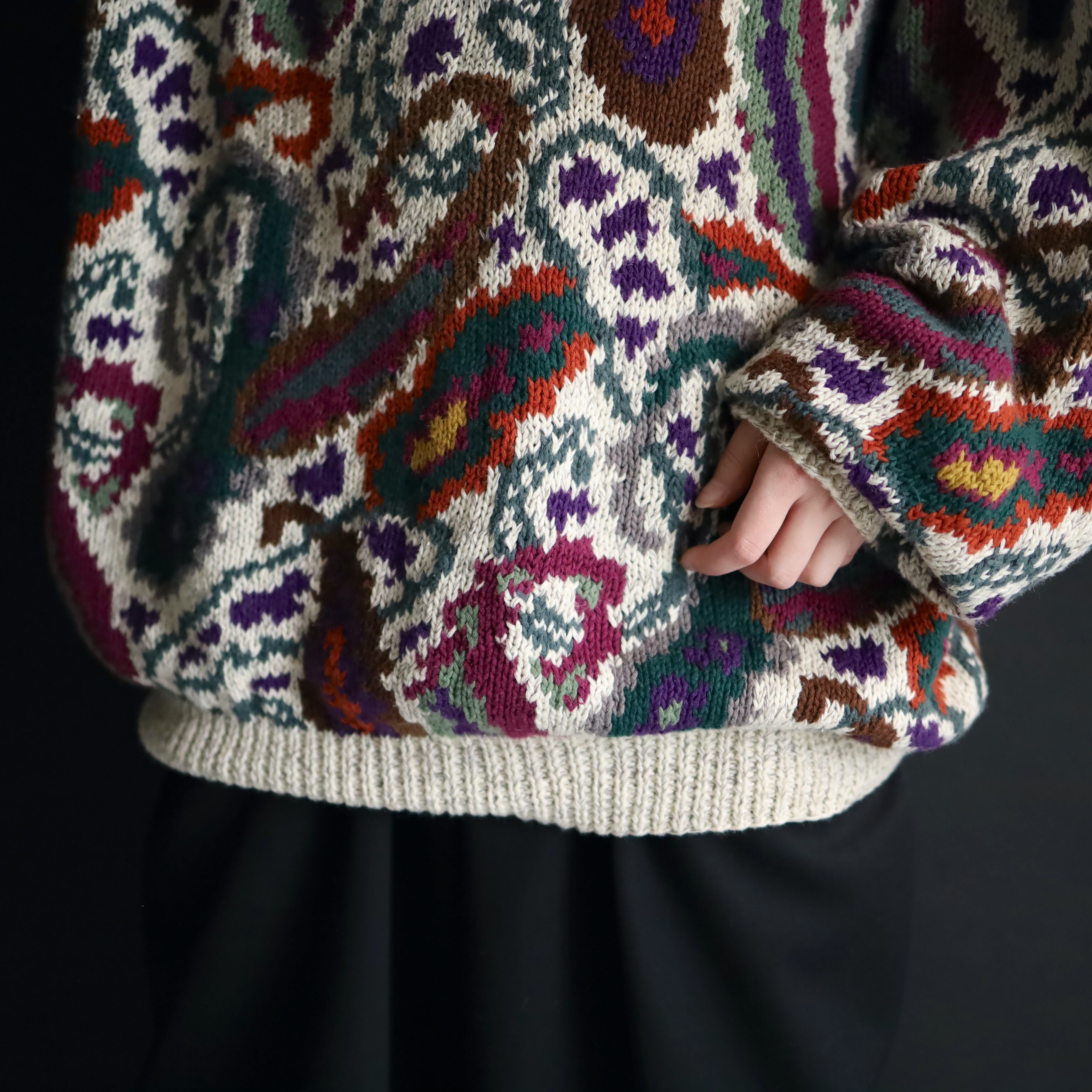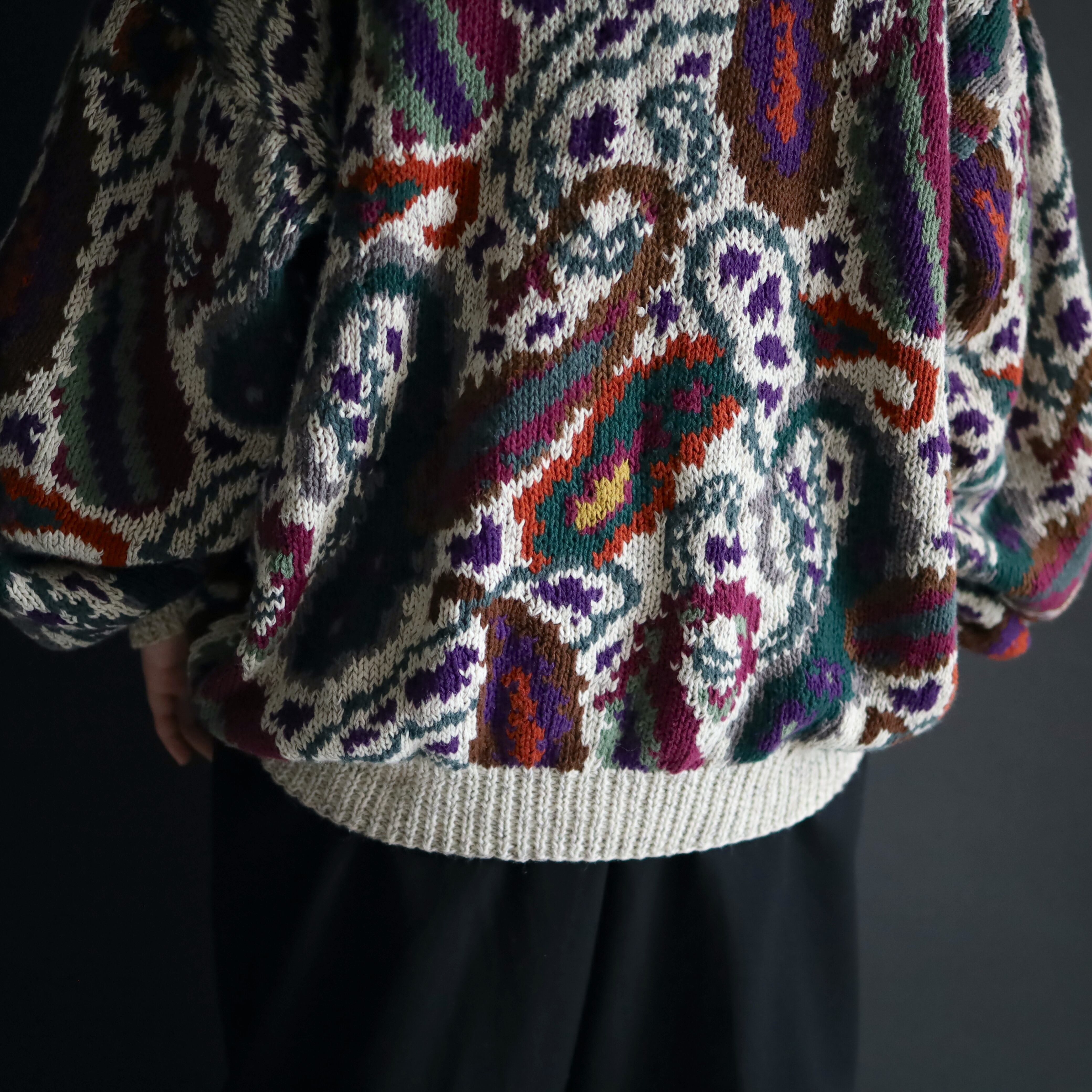 インドのカシミール地方の伝統文様として発展した,ペイズリー柄が全体にデザインされたニットセーター.