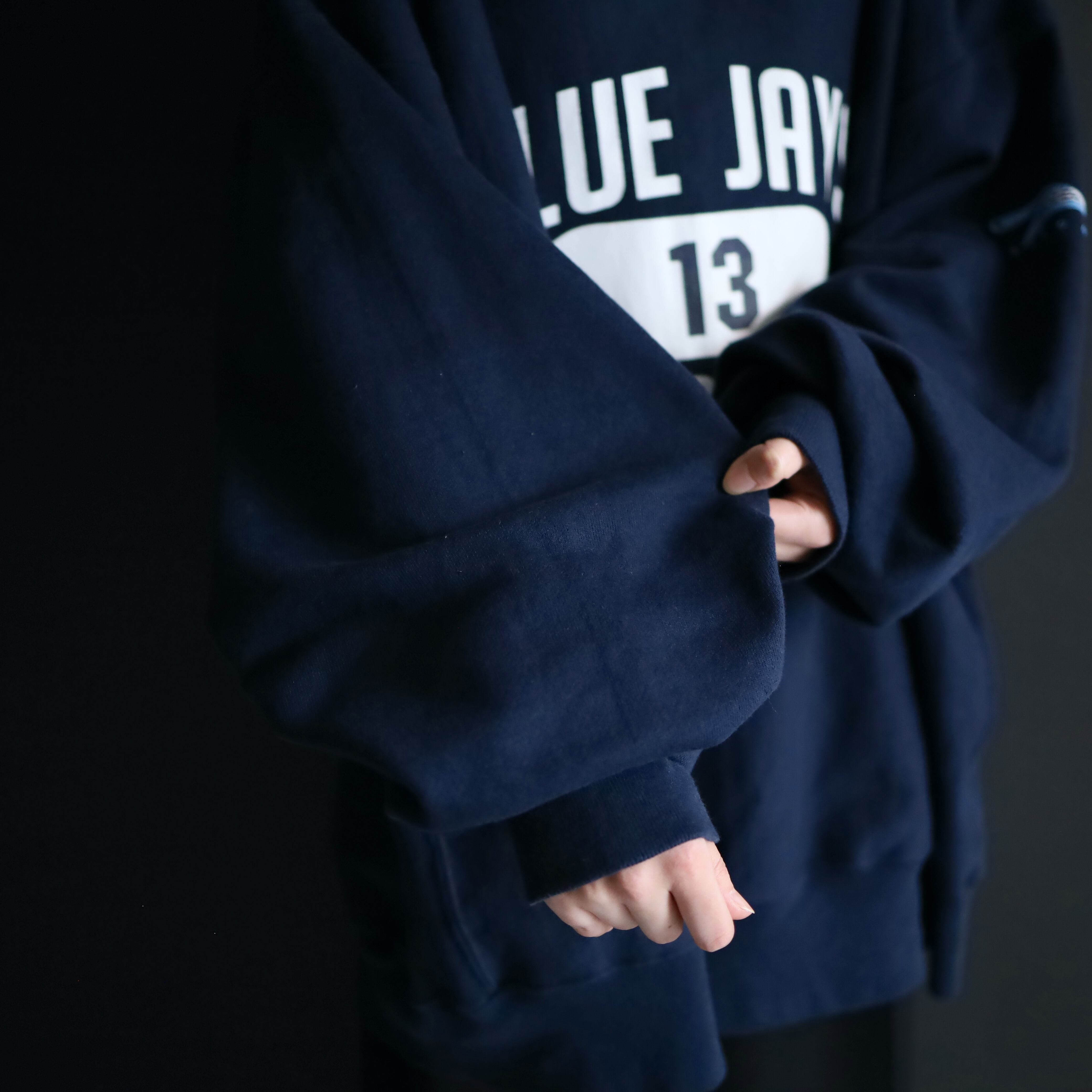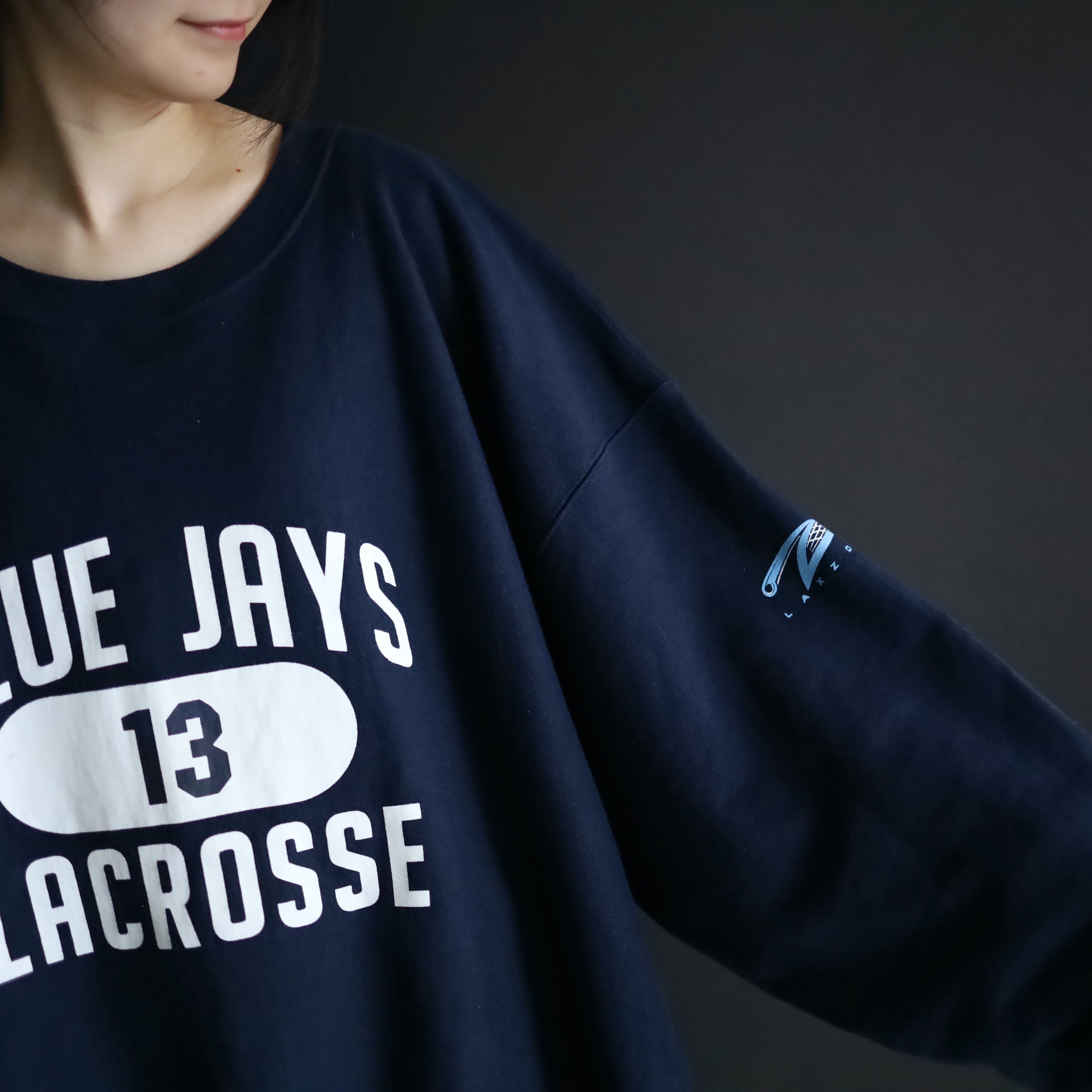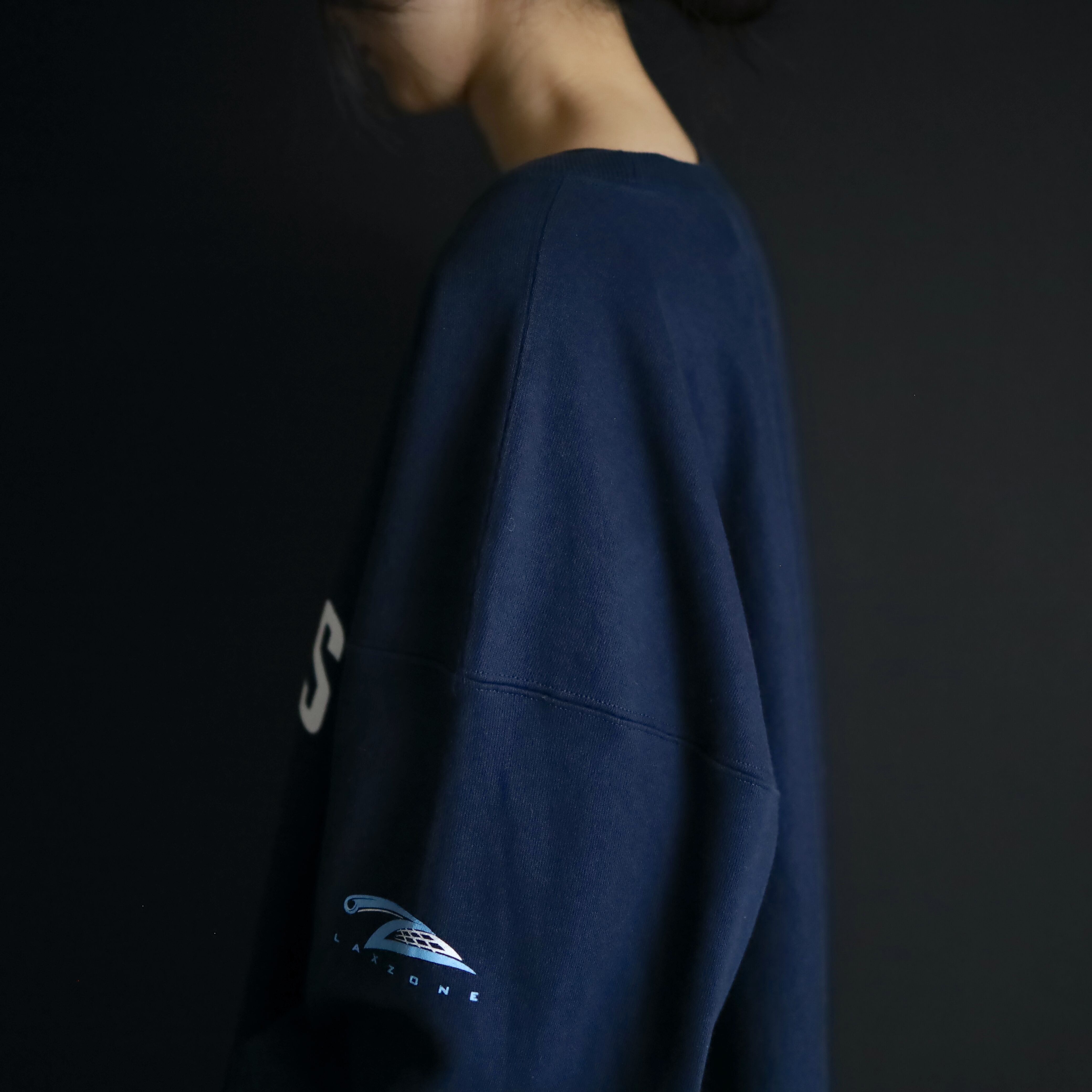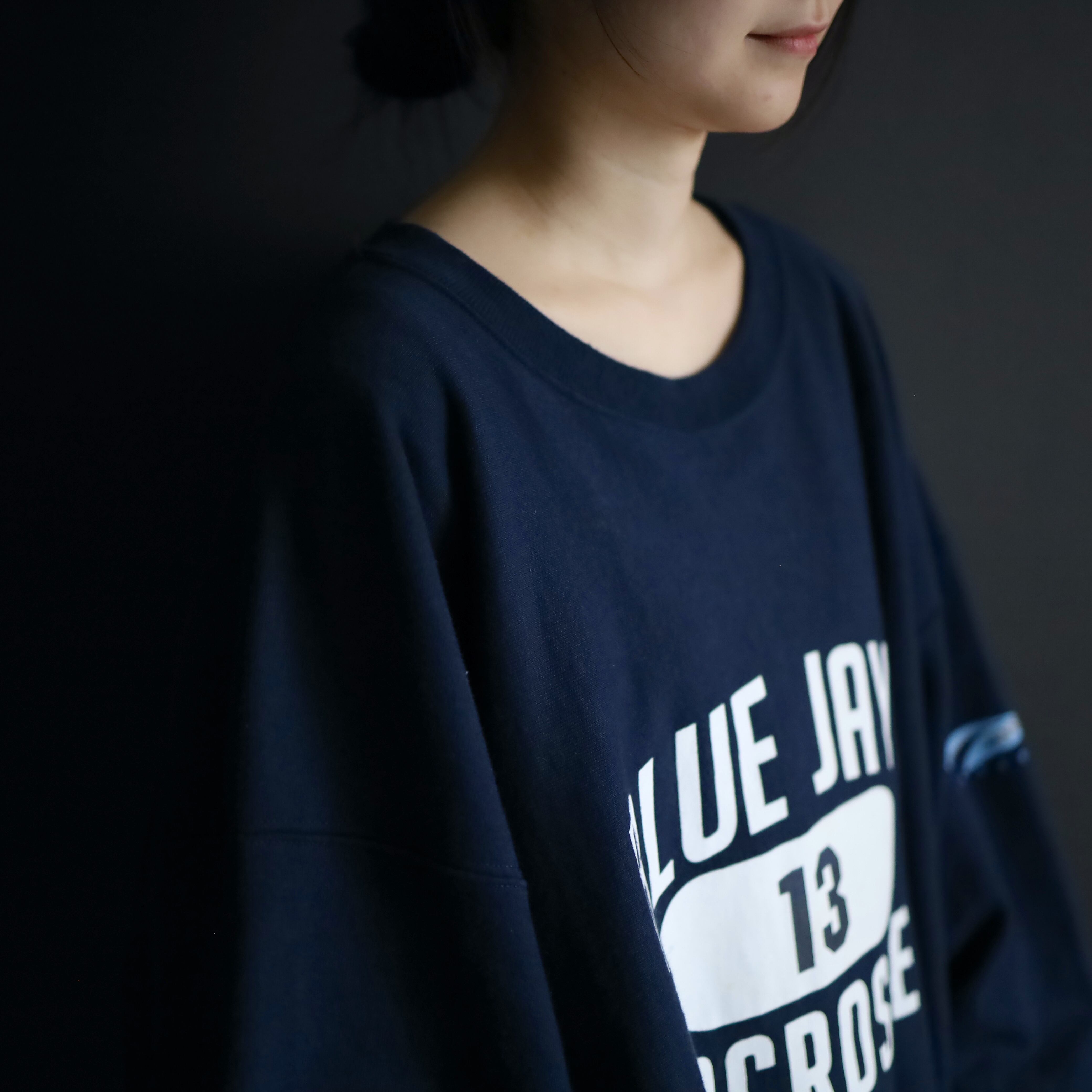 深めのネイビーカラーをベースに,フロントには3段のホワイトラバープリント.