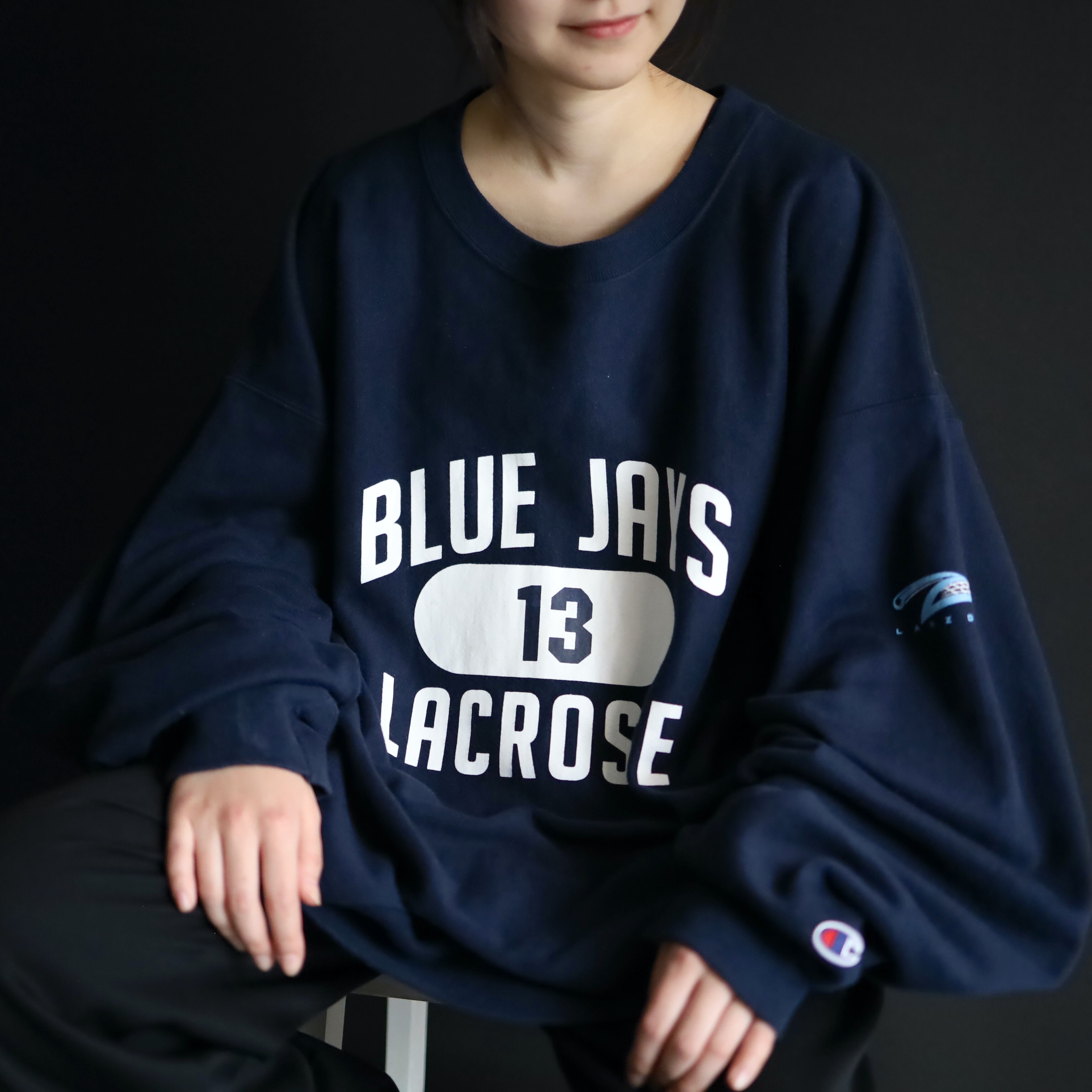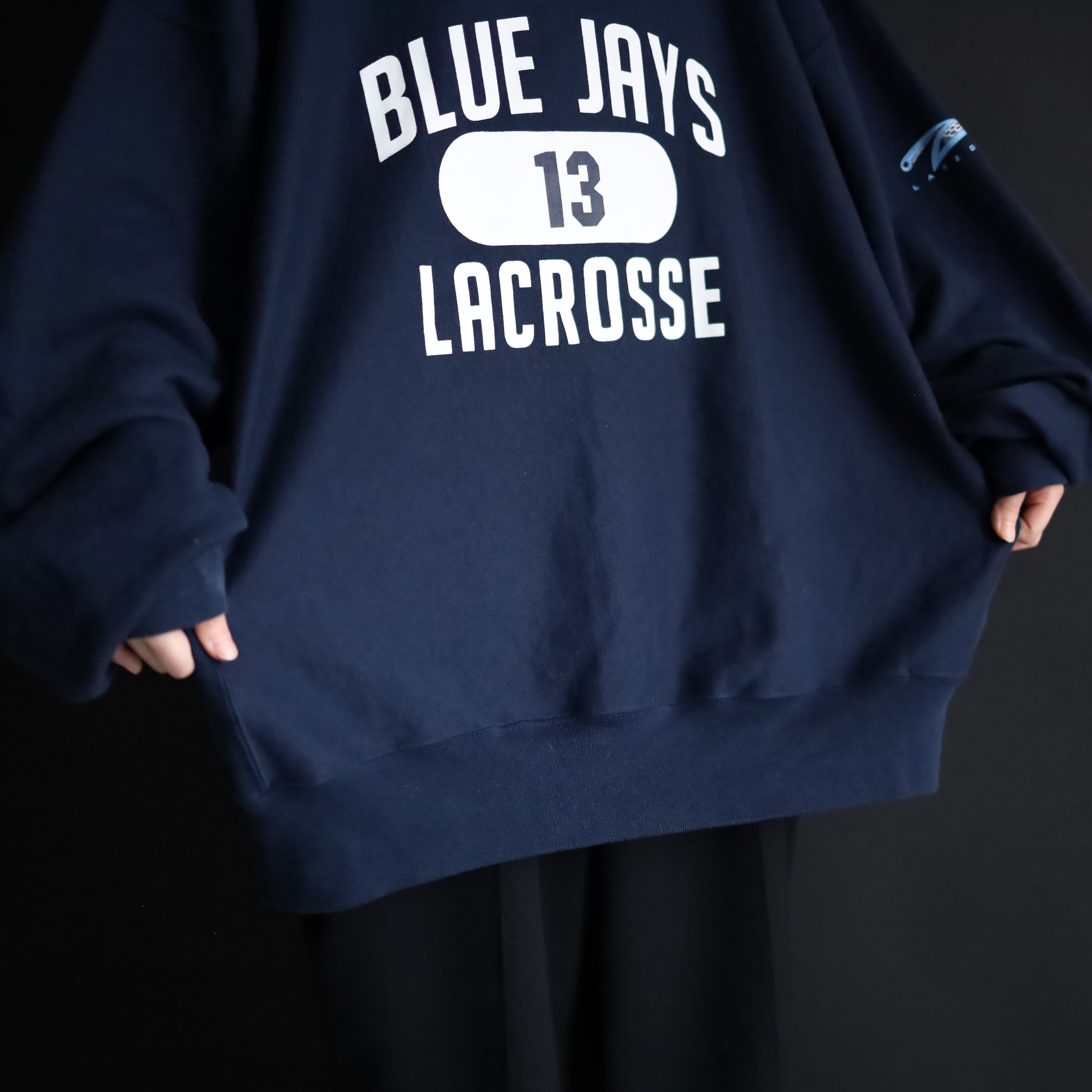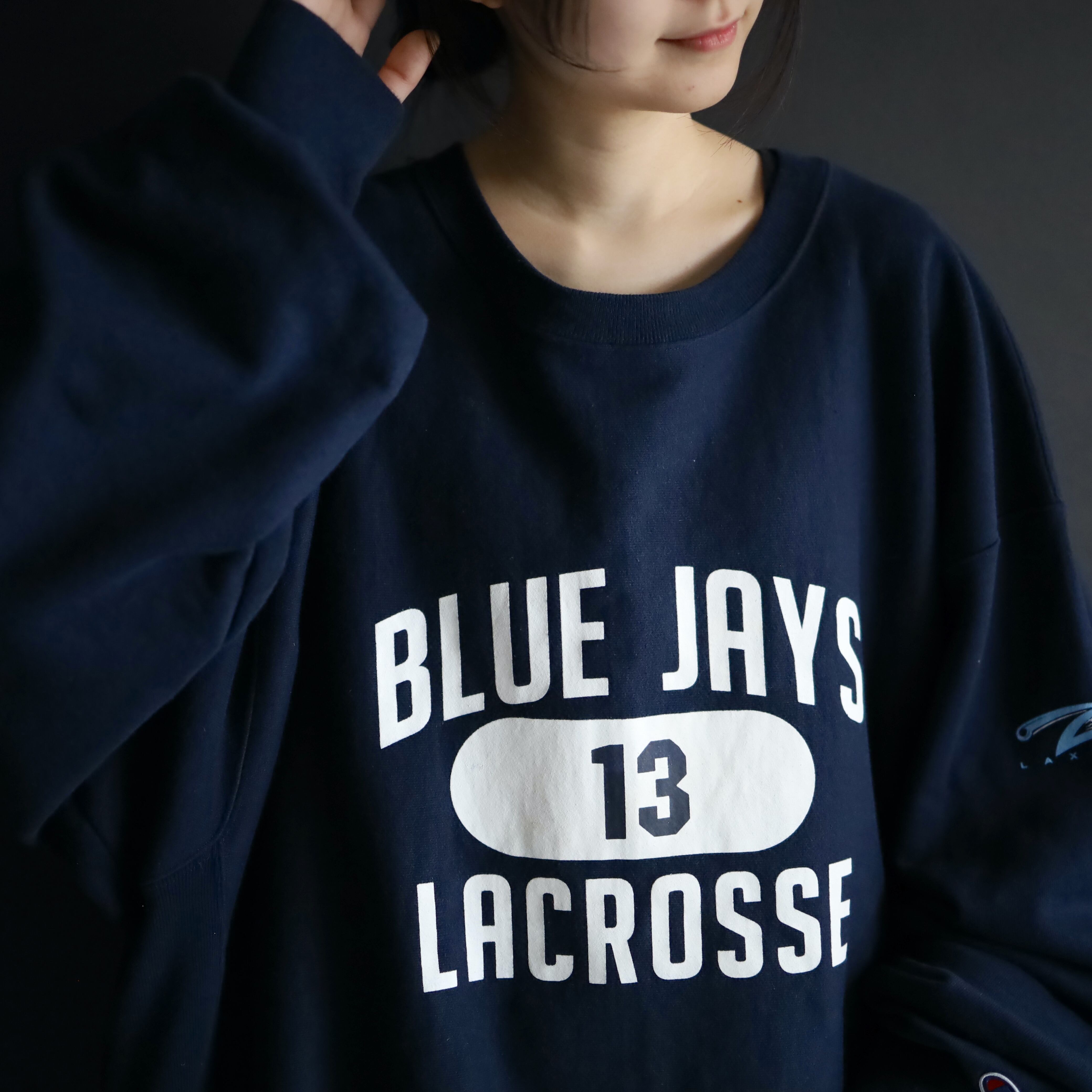 深めのネイビーカラーをベースに,フロントには3段のホワイトラバープリント.