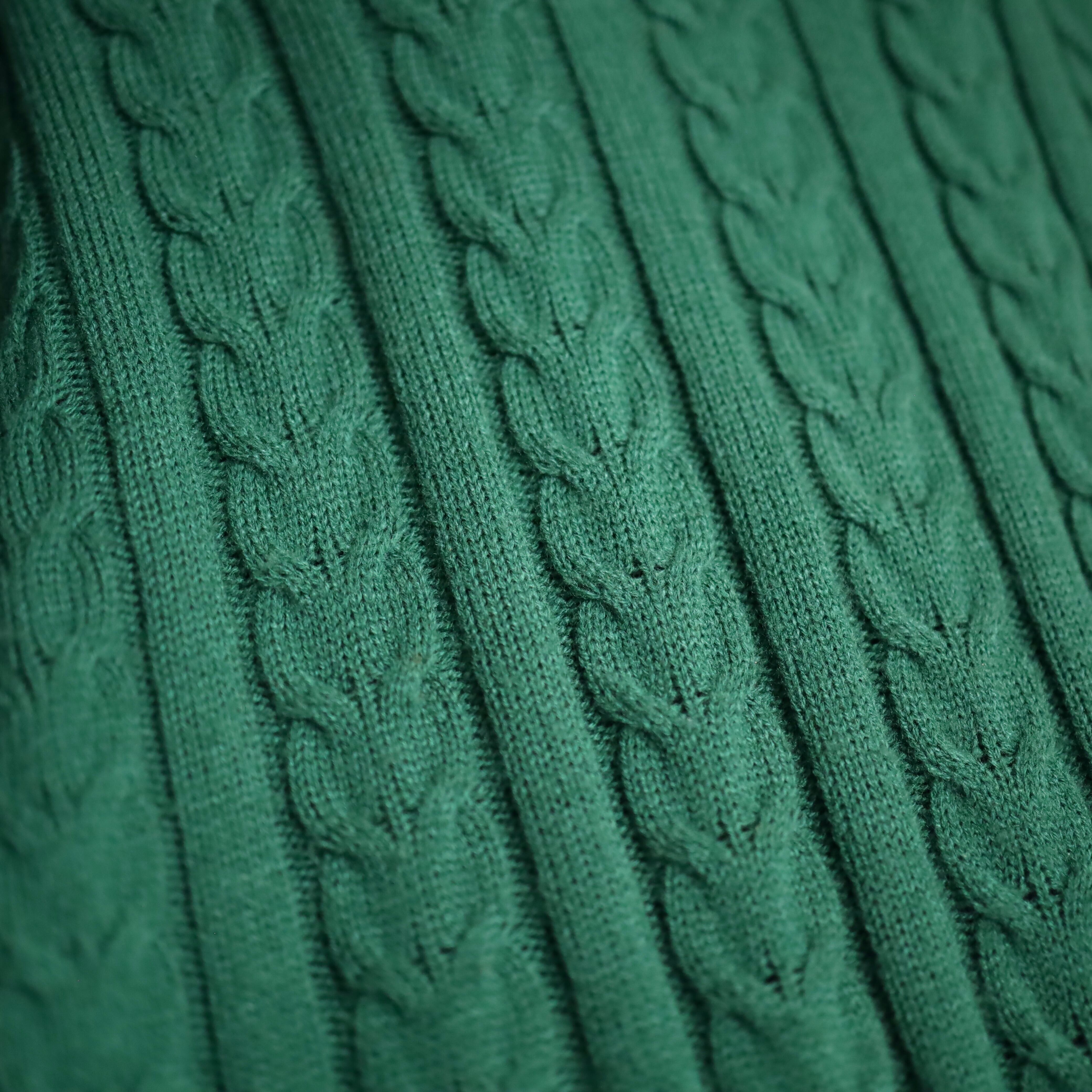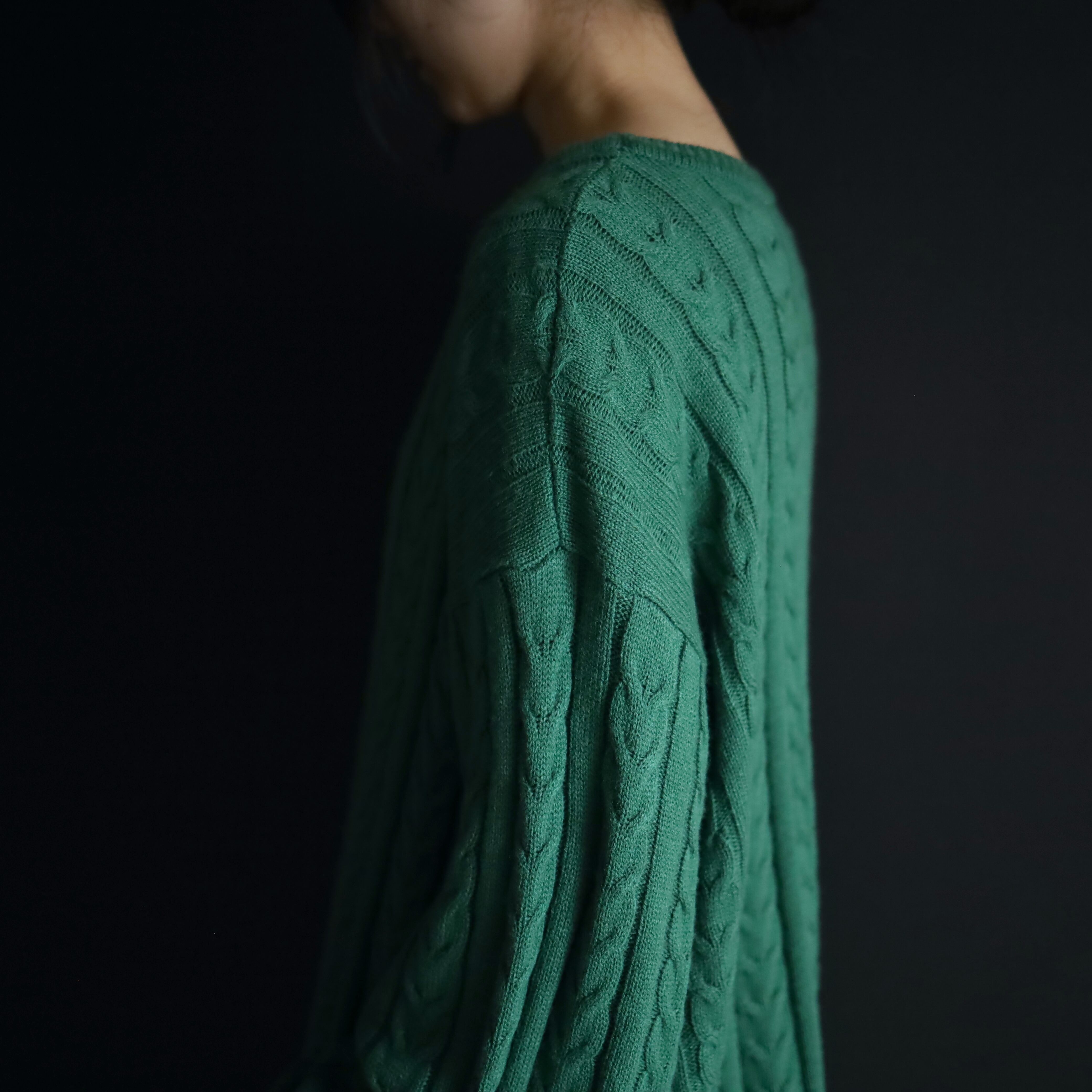 規則的に編み込まれたケーブル編みで,単色ながらしっかりメリハリ,立体感のある表情.