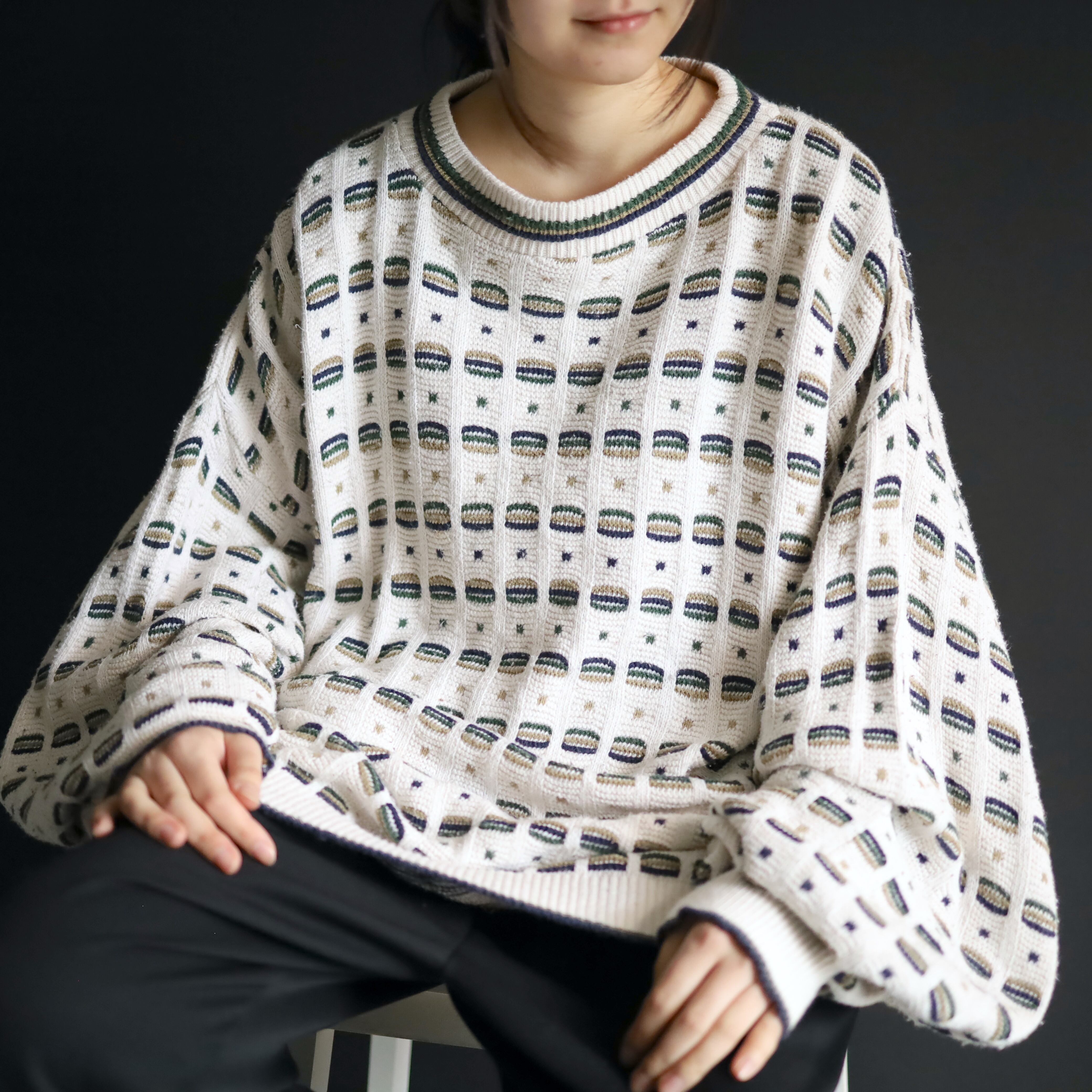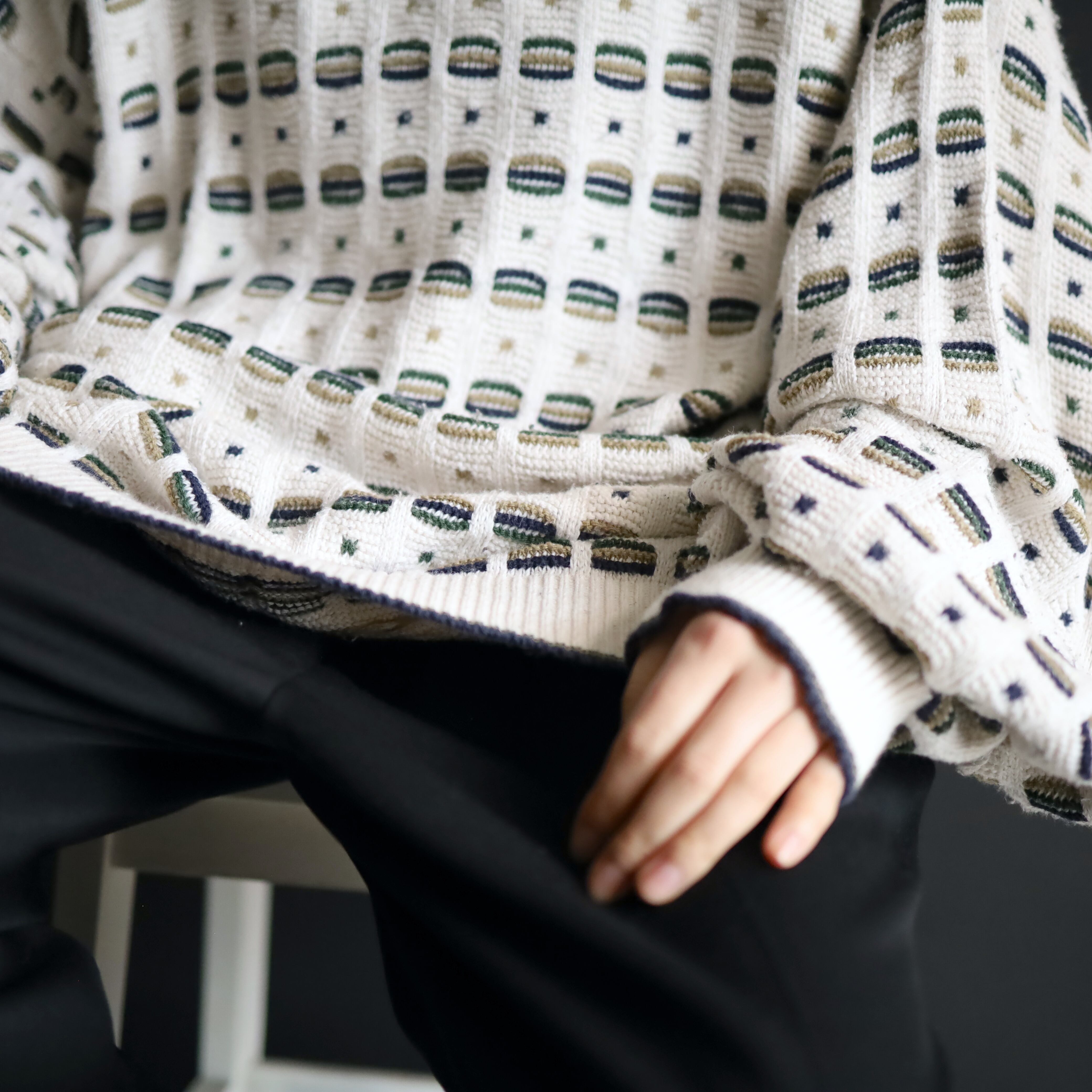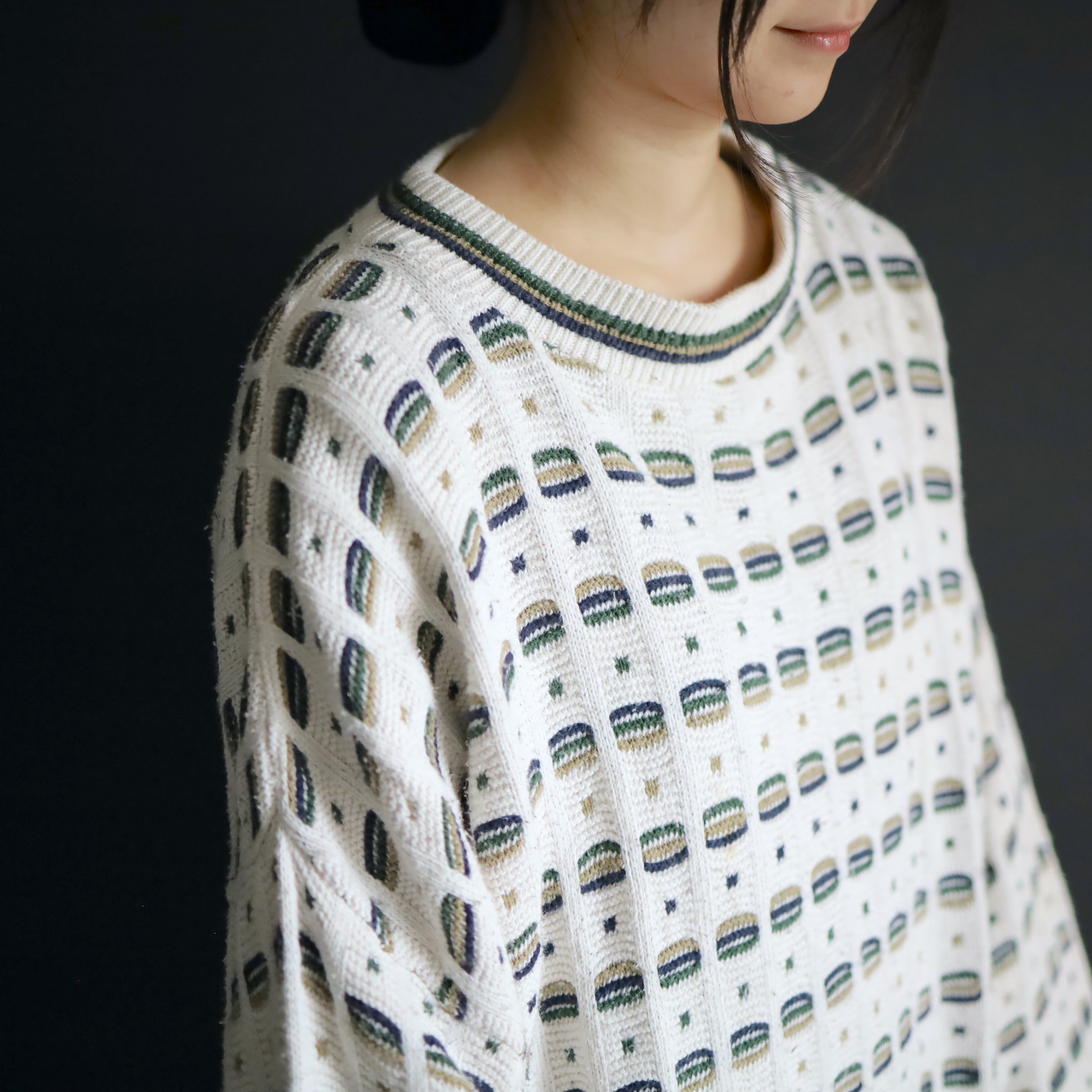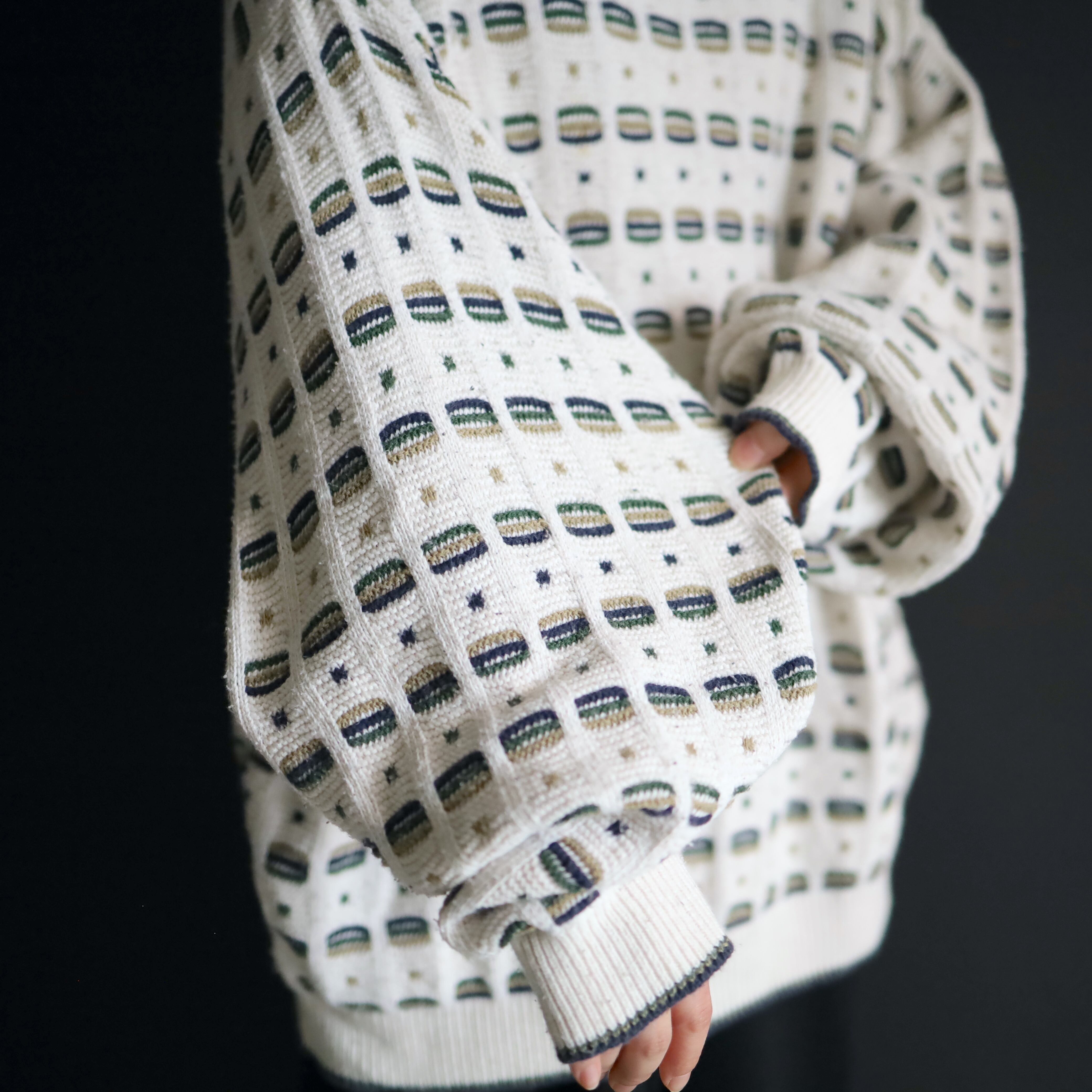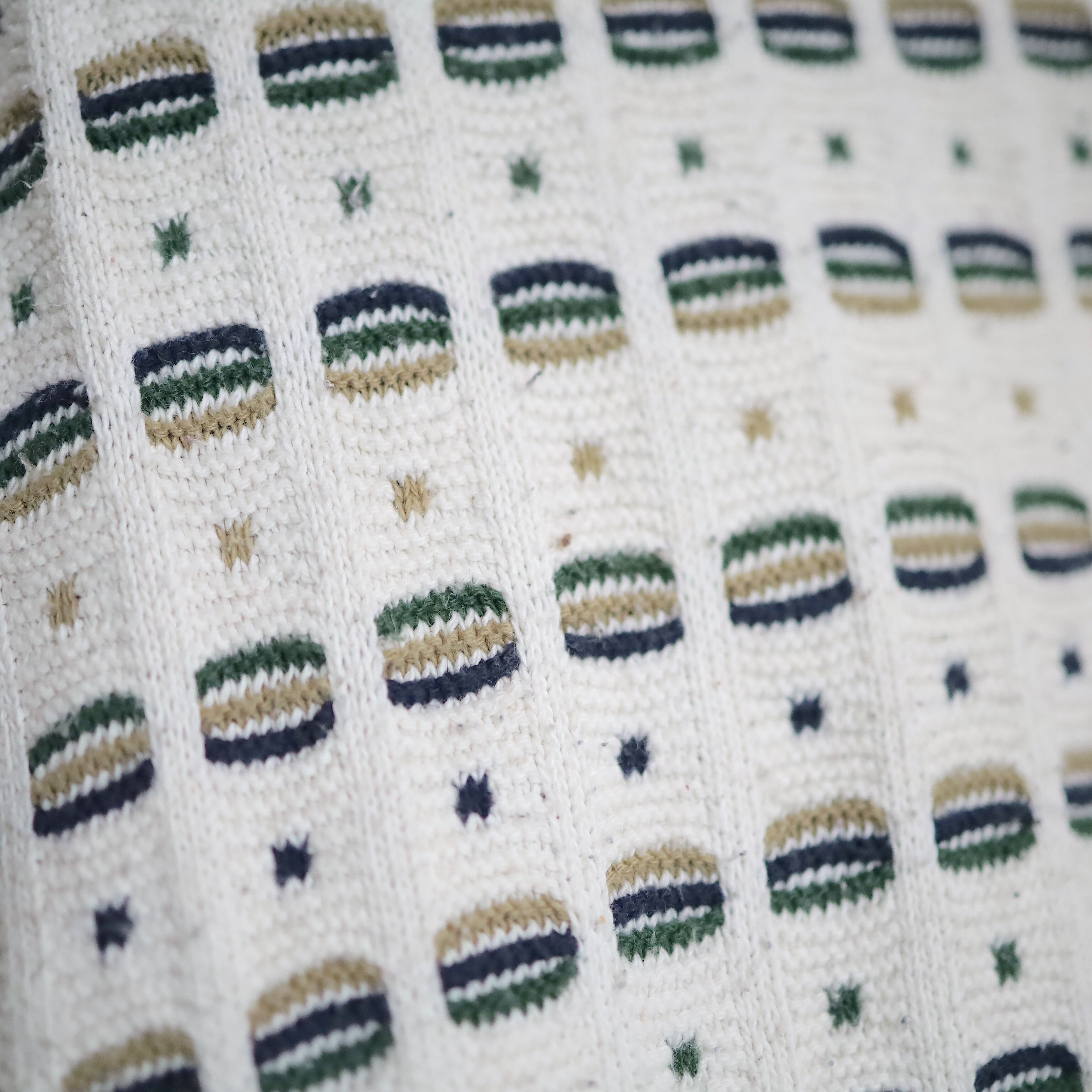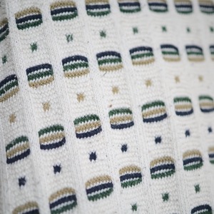 柔らかさのある風合いのホワイトカラーをベースに,規則的に編み込まれたカーキ,ネイビー,ベージュの柄.