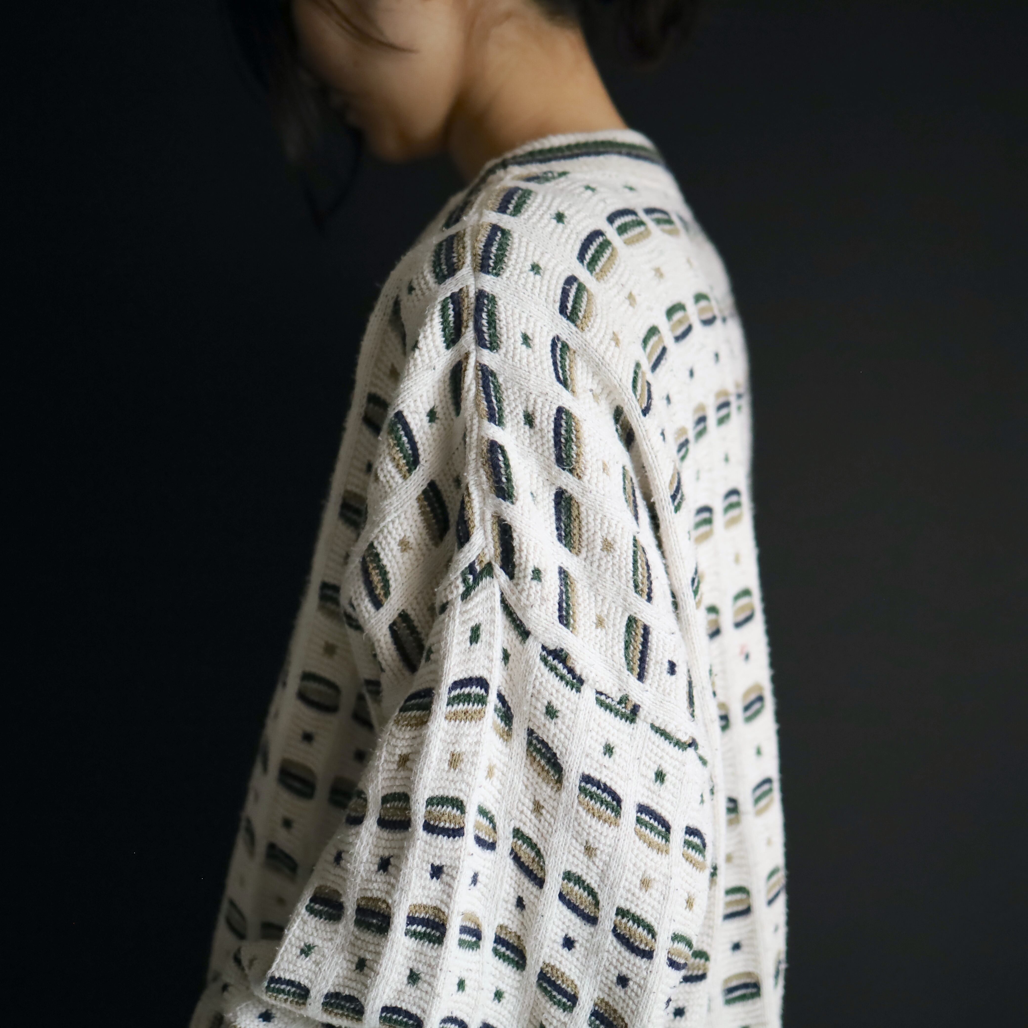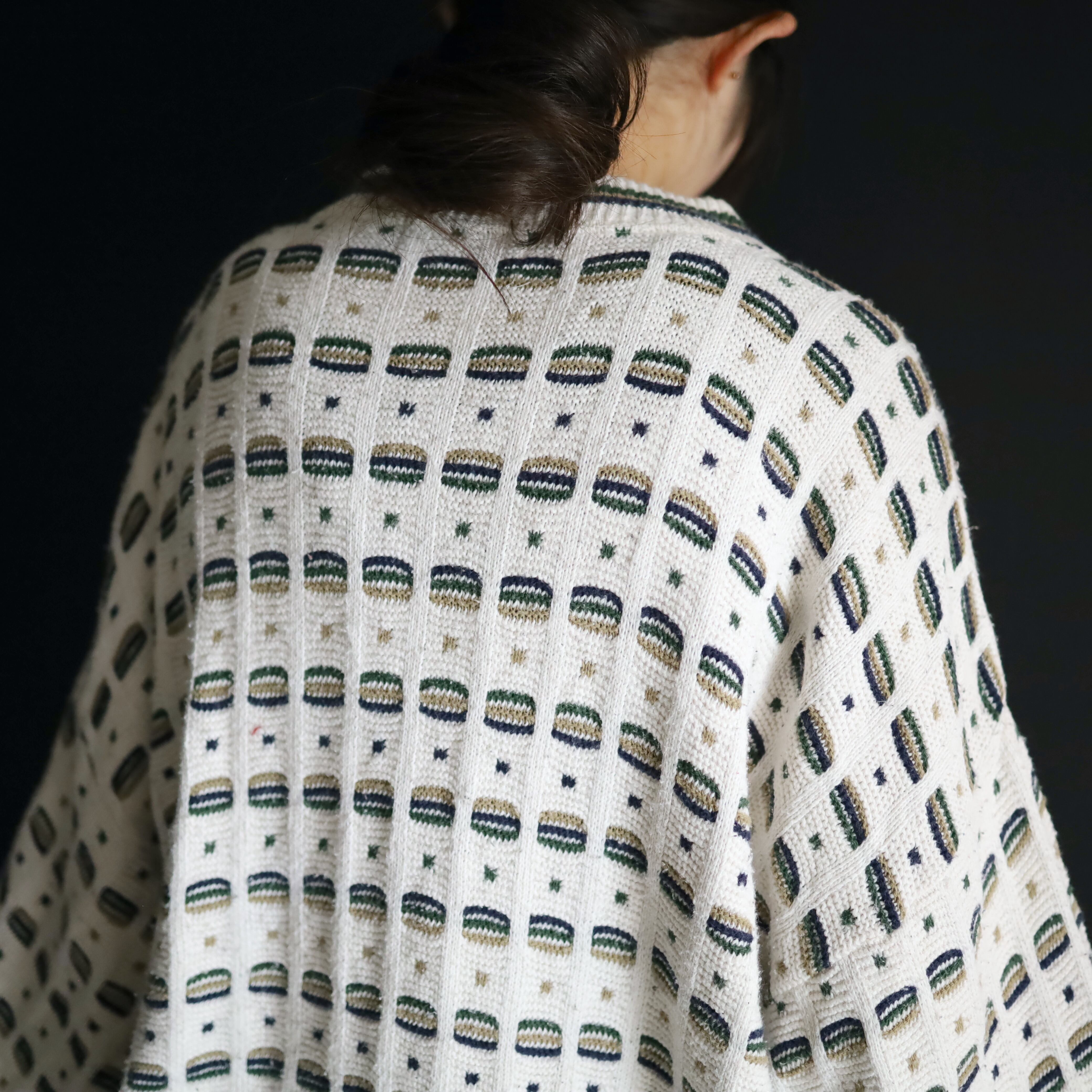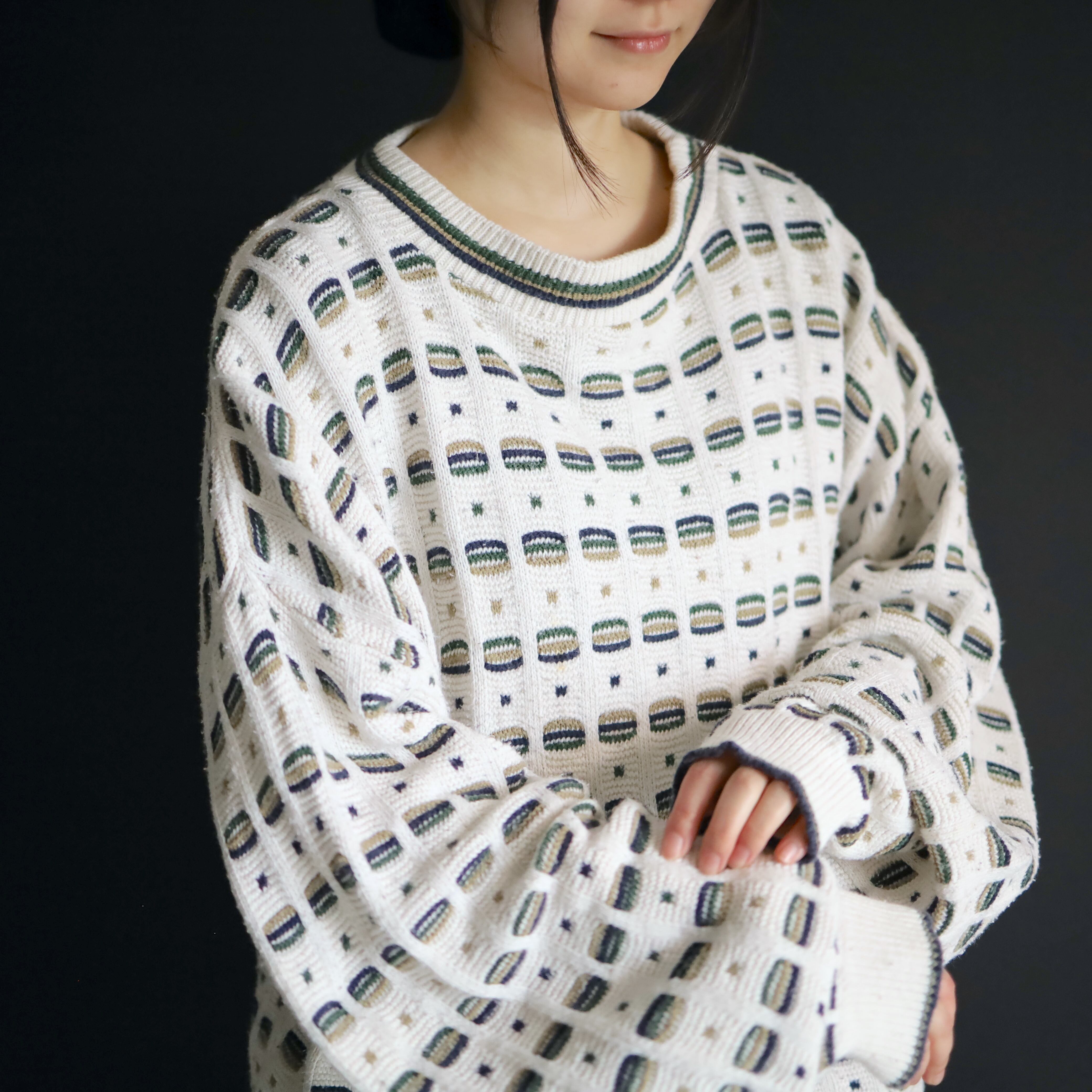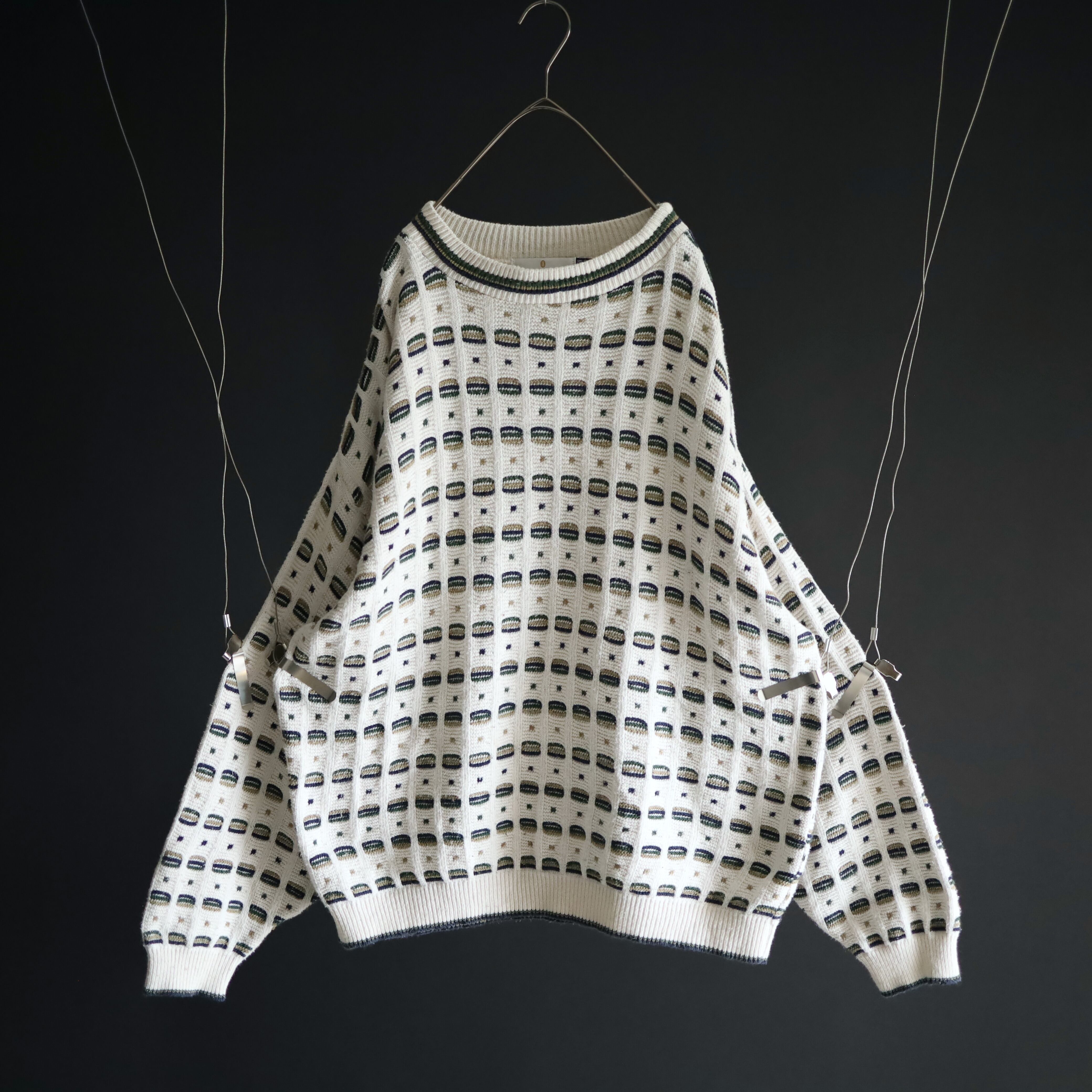 柔らかさのある風合いのホワイトカラーをベースに,規則的に編み込まれたカーキ,ネイビー,ベージュの柄.